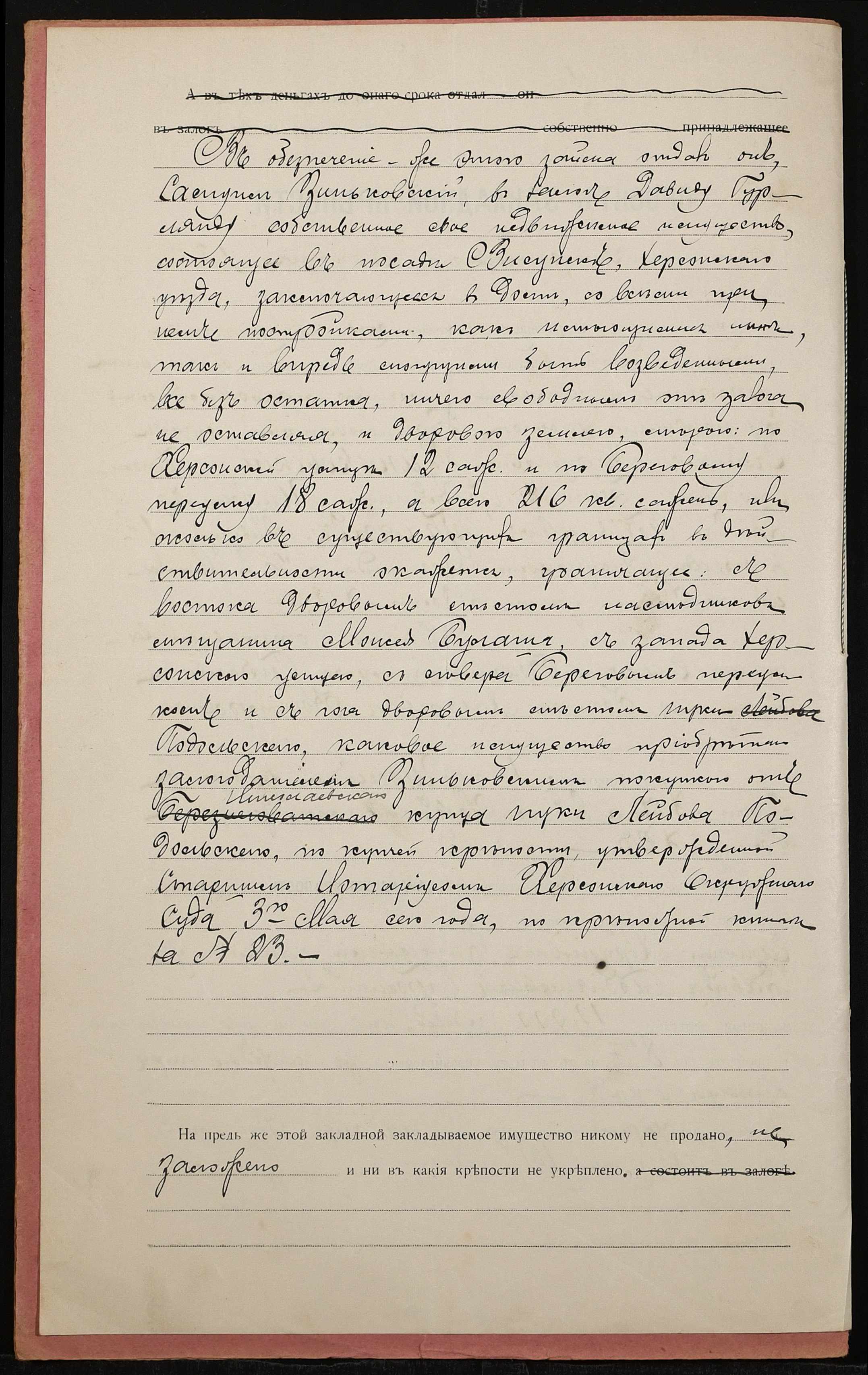 • • • • Справа № 1379 “Справа про вчинення заставної на нерухоме майно у посаді Висунськ Херсонського повіту, закладене Зінсковським Самуїлом Аврумовичем (Зинсковским Самуилом Аврумовичем) – Гурлянду Давиду Тобяшевичу (Гурлянду Давиду Тобяшевичу)”