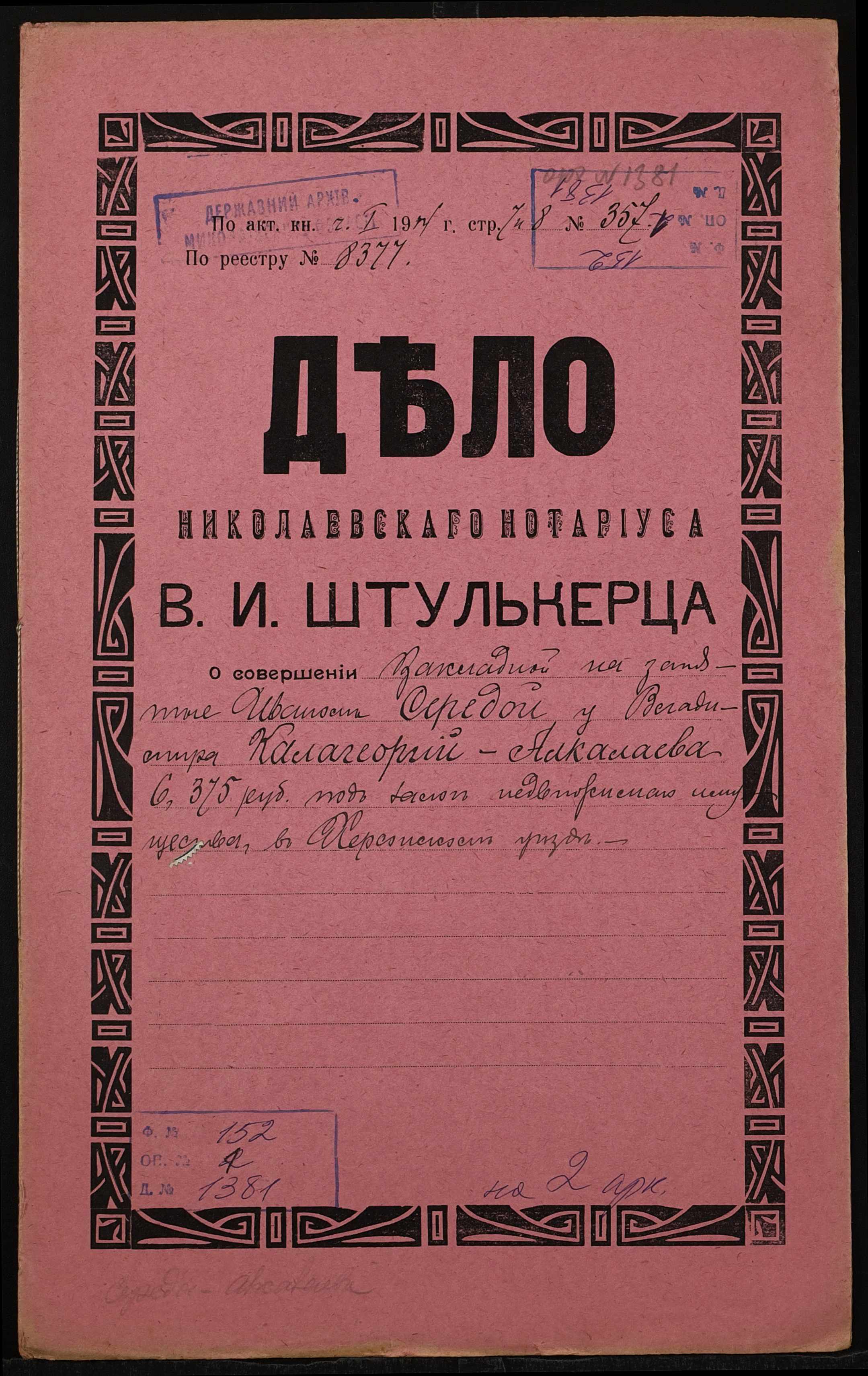 ◦ ◦ Фонд № 152 “Контора миколаївського нотаріуса Херсонського окружного суду Штулькерца Володимира Ісааковича”
