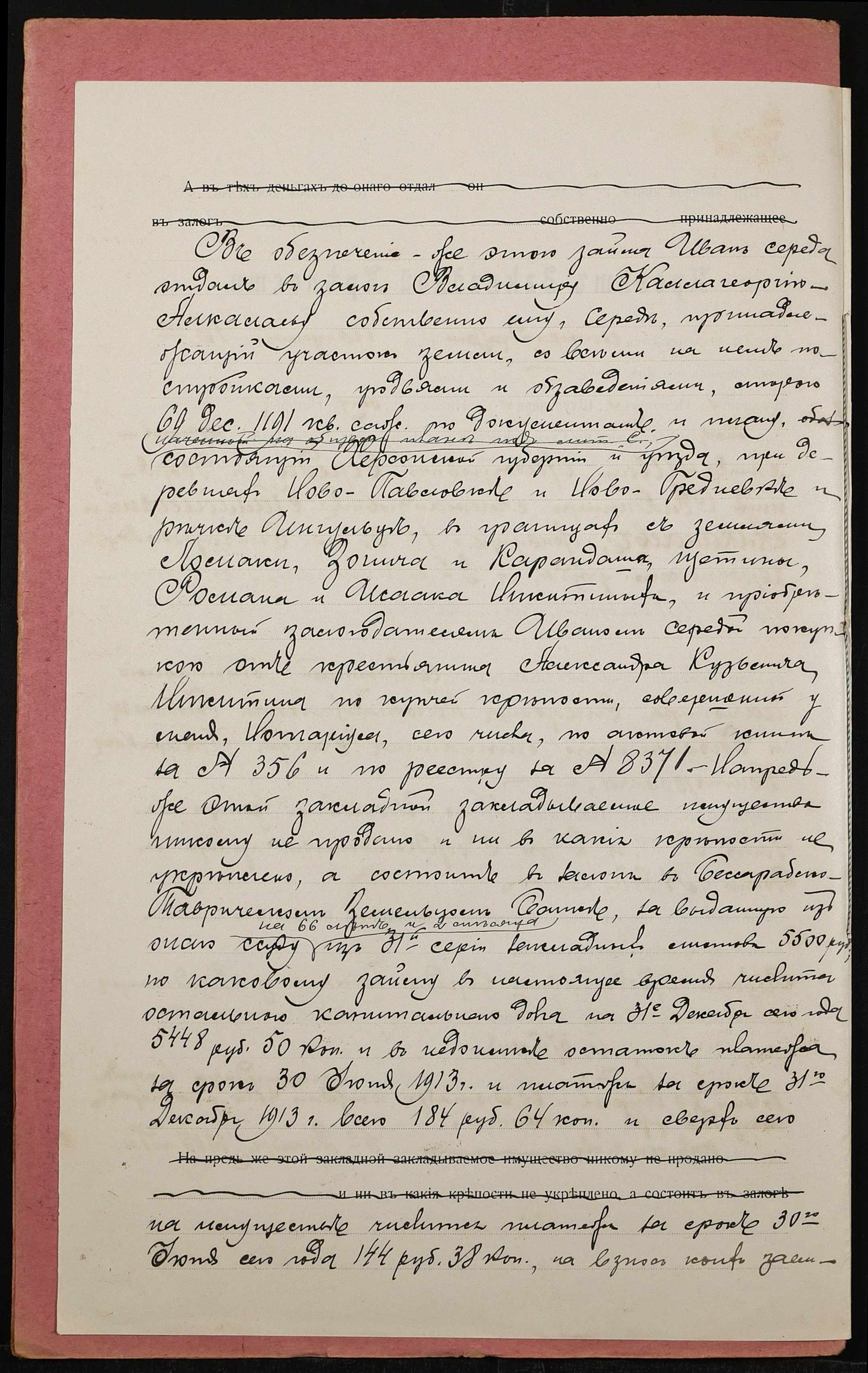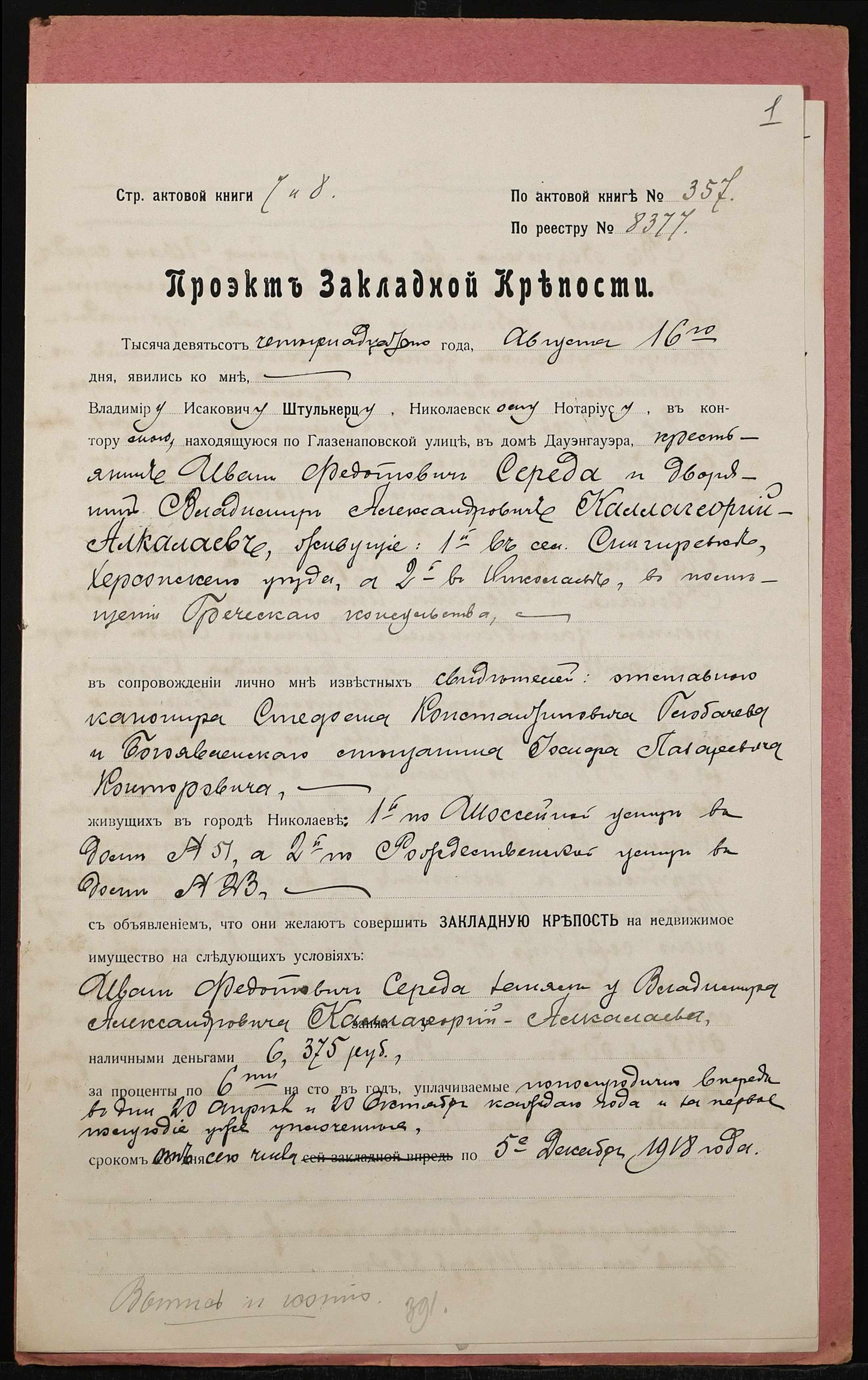 • • • • Справа № 1381 “Справа про вчинення заставної на нерухоме майно у Херсонському повіті, закладене Середою Іваном (Середой Иваном) – Калагеоргій-Алкалаєву Володимиру (Калагеоргий-Алкалаеву Владимиру)”