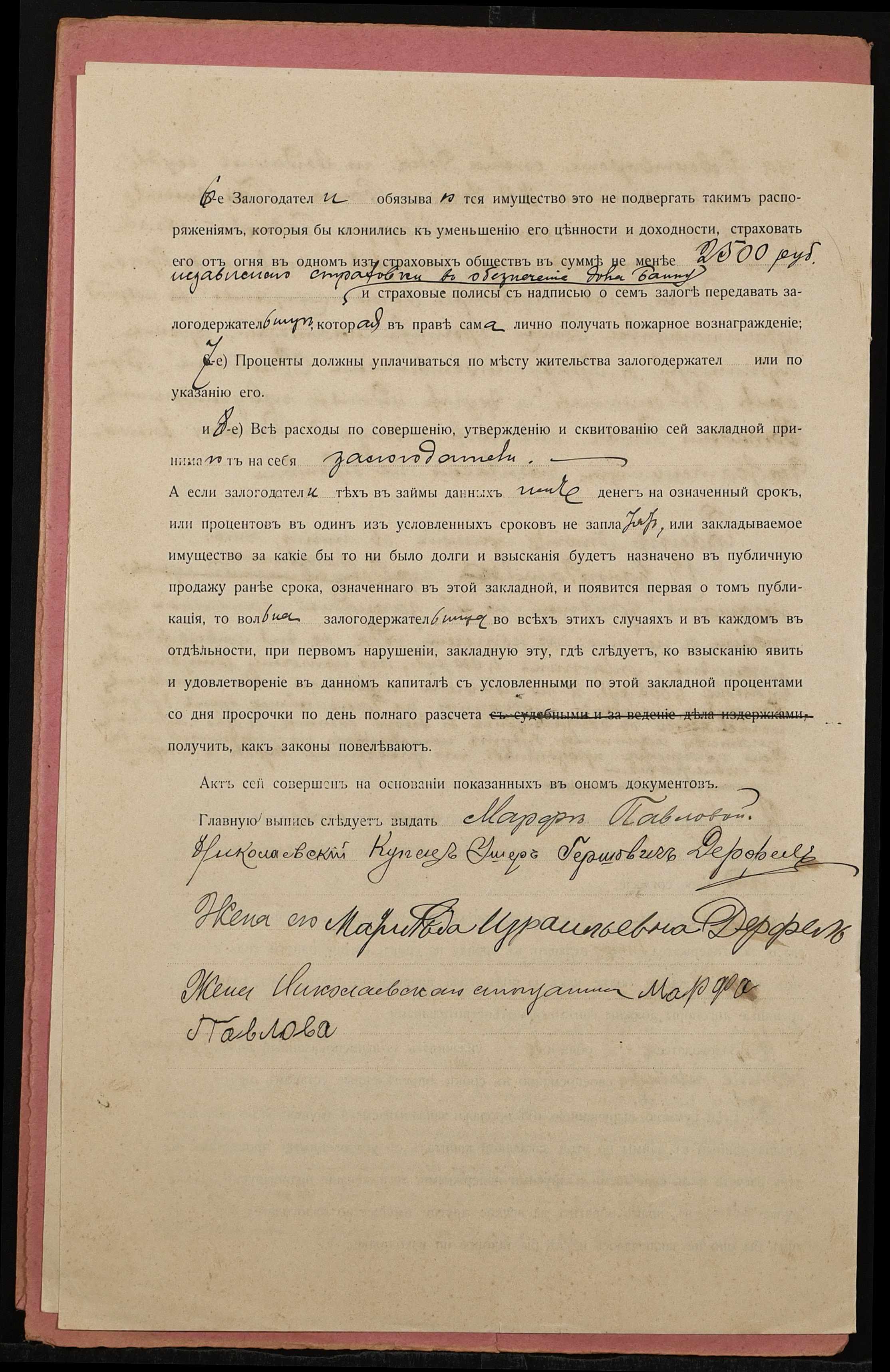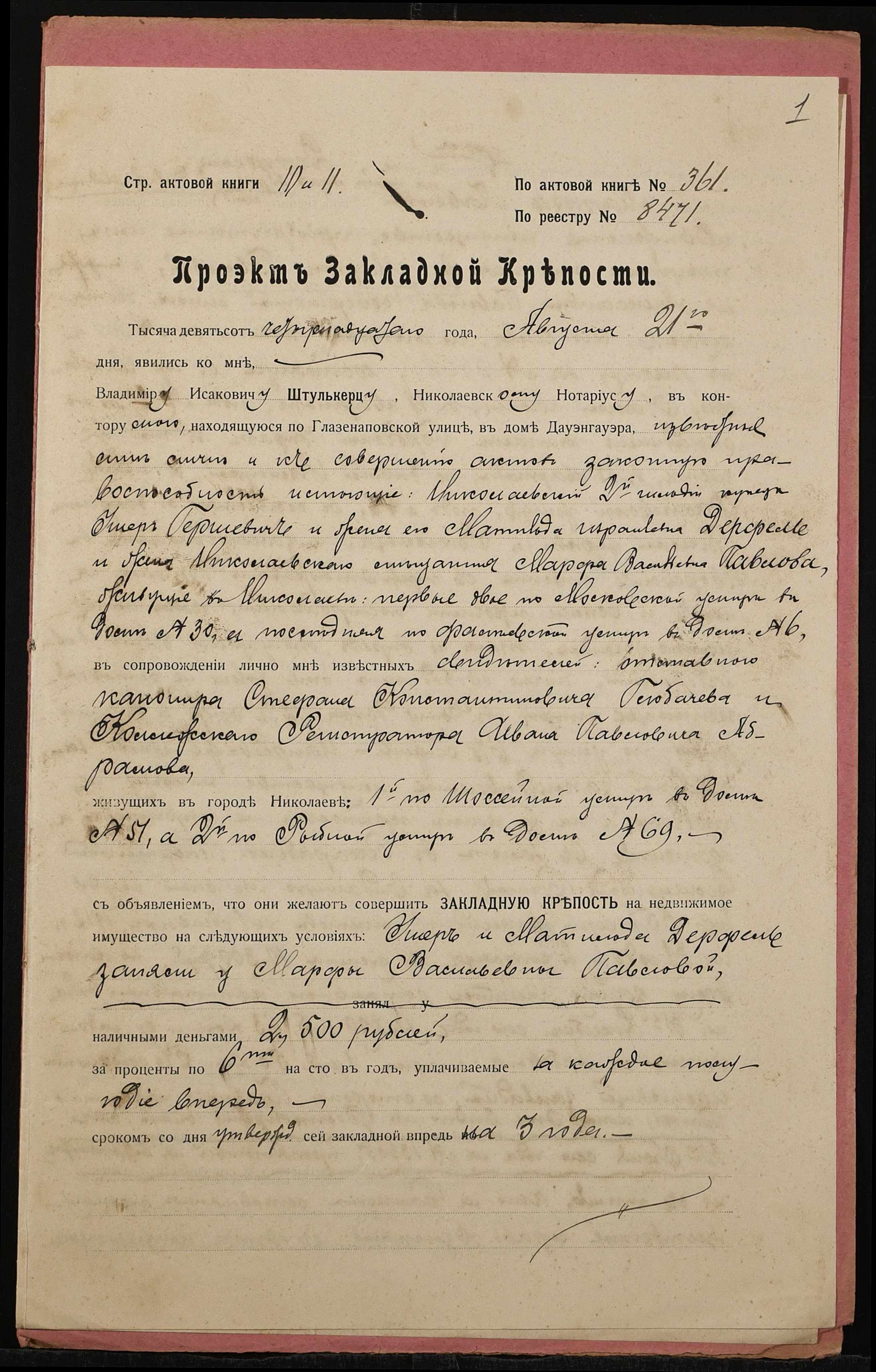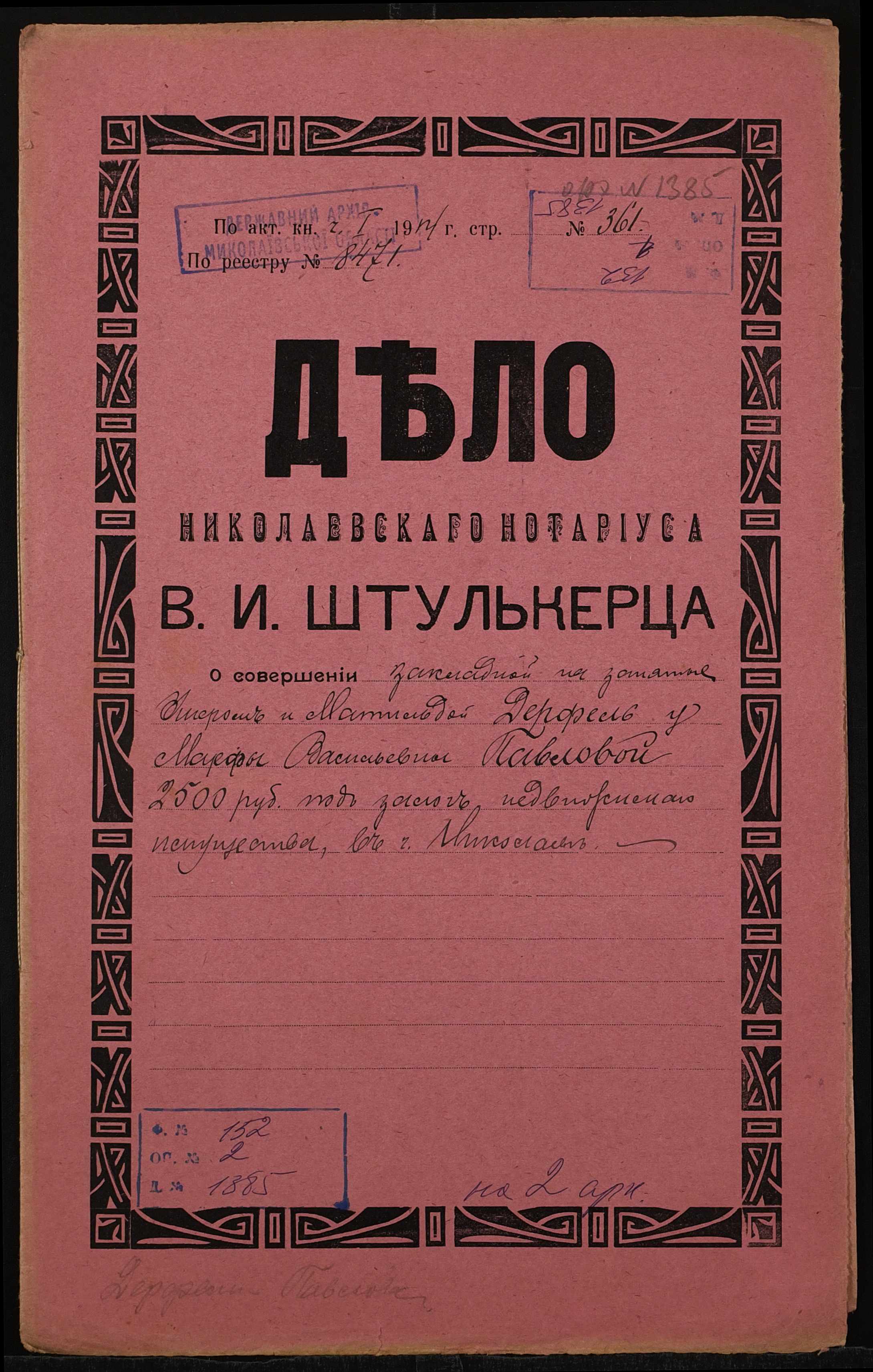 • • • • Справа № 1385 “Справа про вчинення заставної на нерухоме майно у м. Миколаїв, закладене Дерфель Ушером і Матильдою (Дерфель Ушером и Матильдой) – Павловій Марфі Василівні (Павловой Марфе Васильевне)”