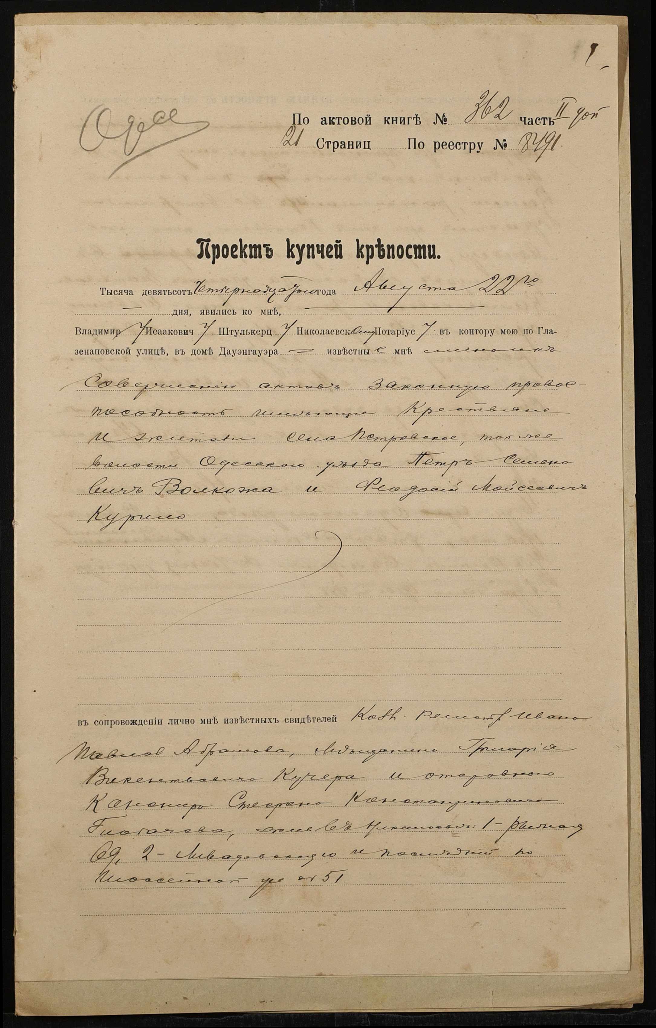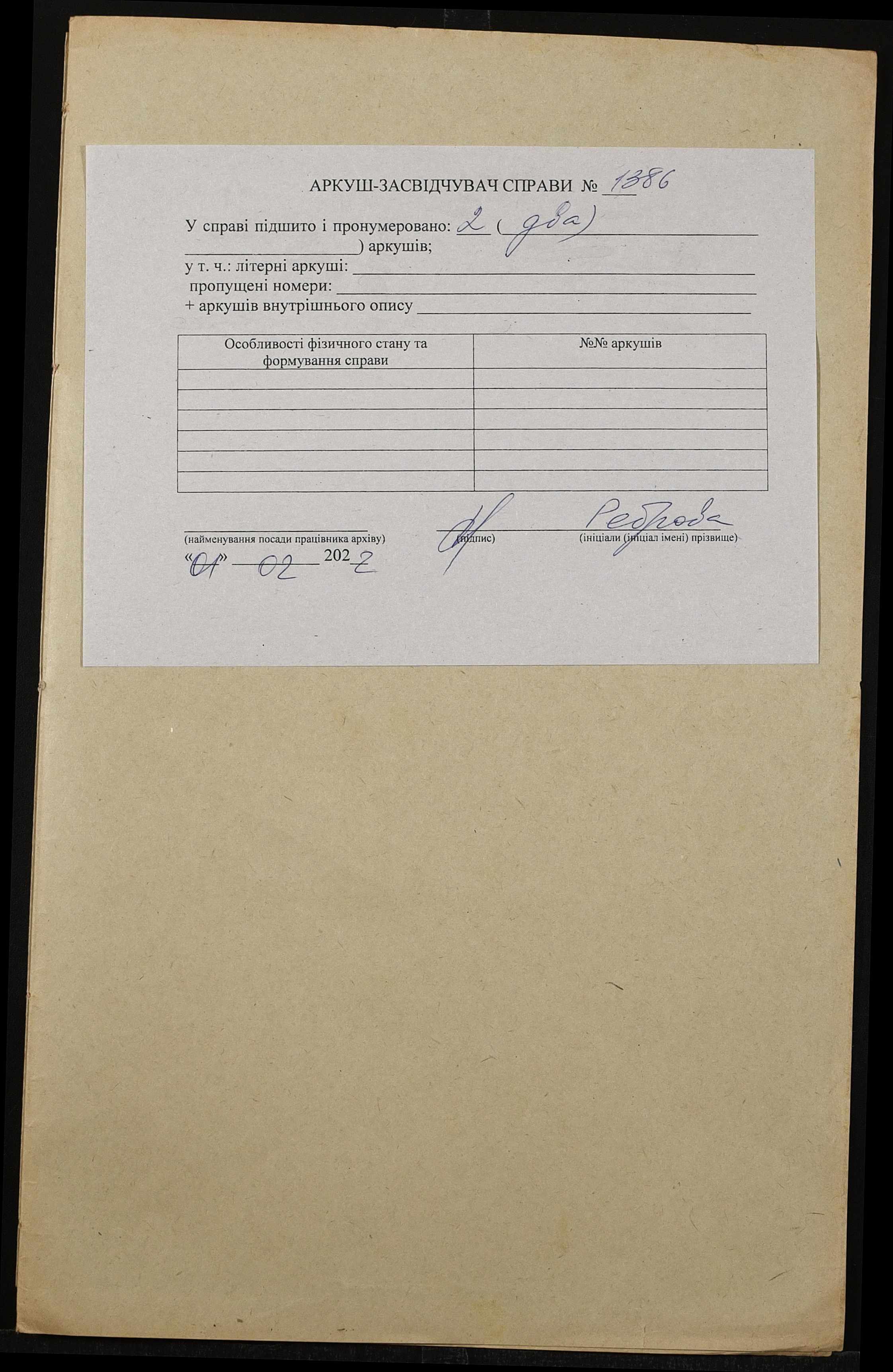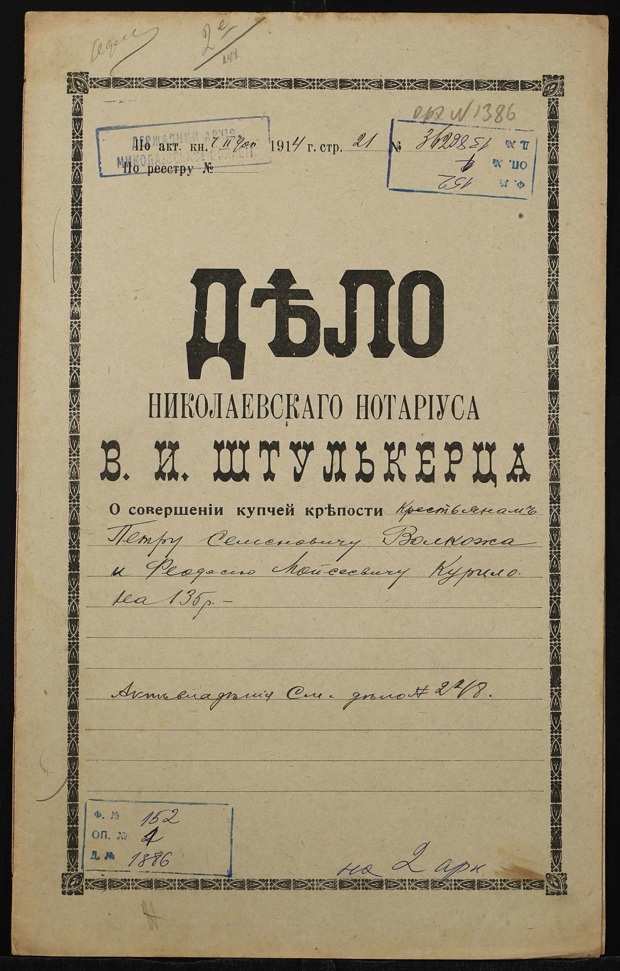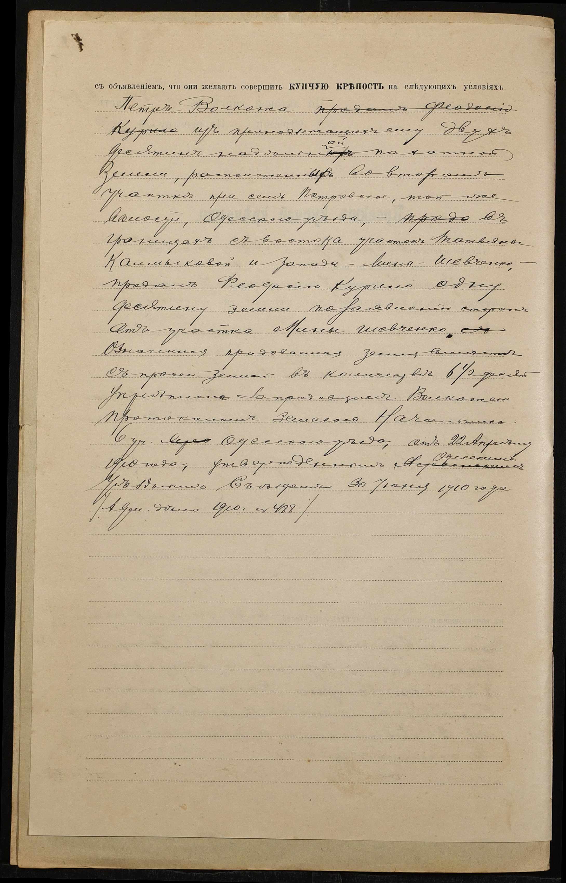 • • • • Справа № 1386 “Справа про вчинення купчої про продаж землі селянином Волкожем Петром Семеновичем (Волкожем Петром Семеновичем) на користь селянина Курила Феодосія Мойсейовича (Курило Феодосия Моисеевича)”