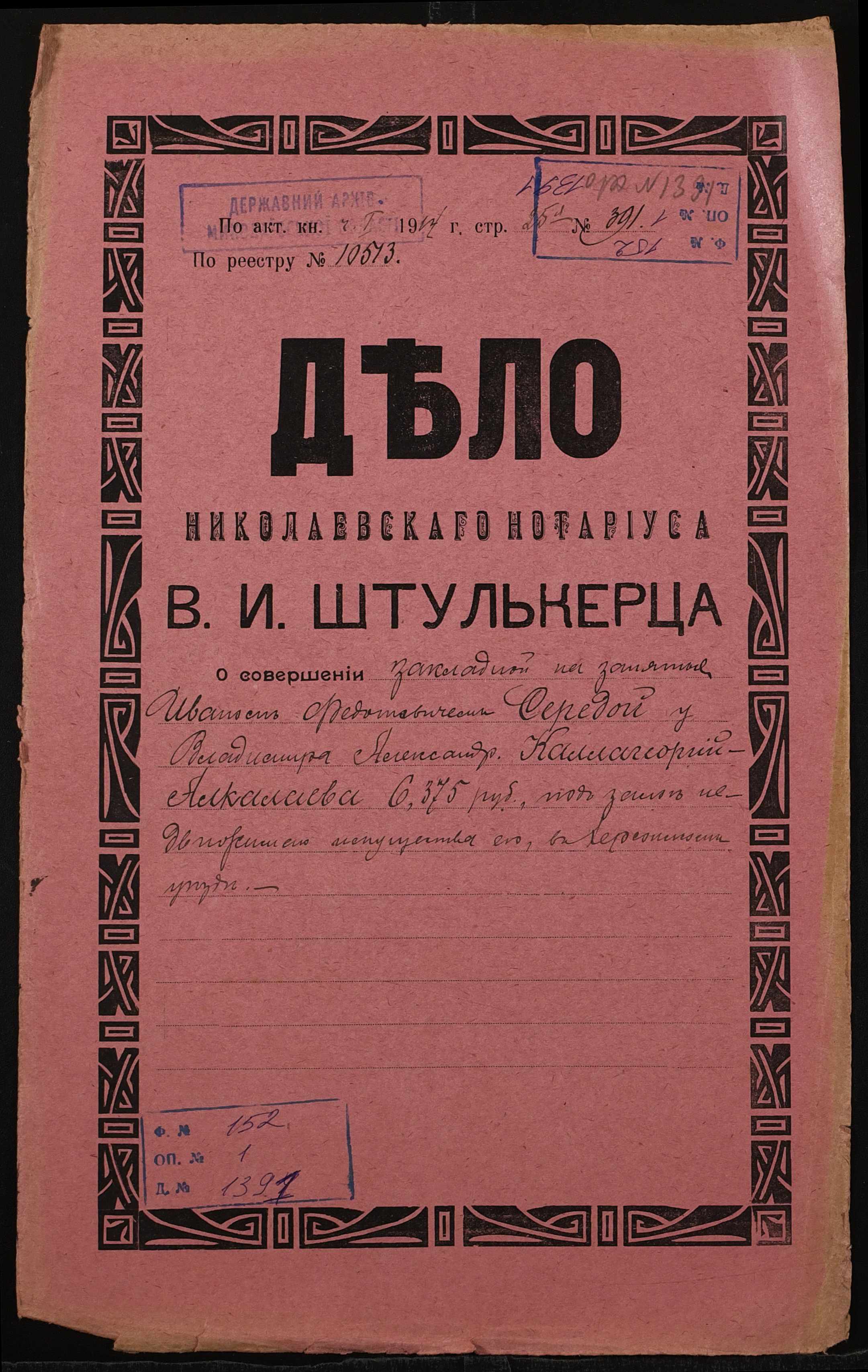 ◦ ◦ Фонд № 152 “Контора миколаївського нотаріуса Херсонського окружного суду Штулькерца Володимира Ісааковича”