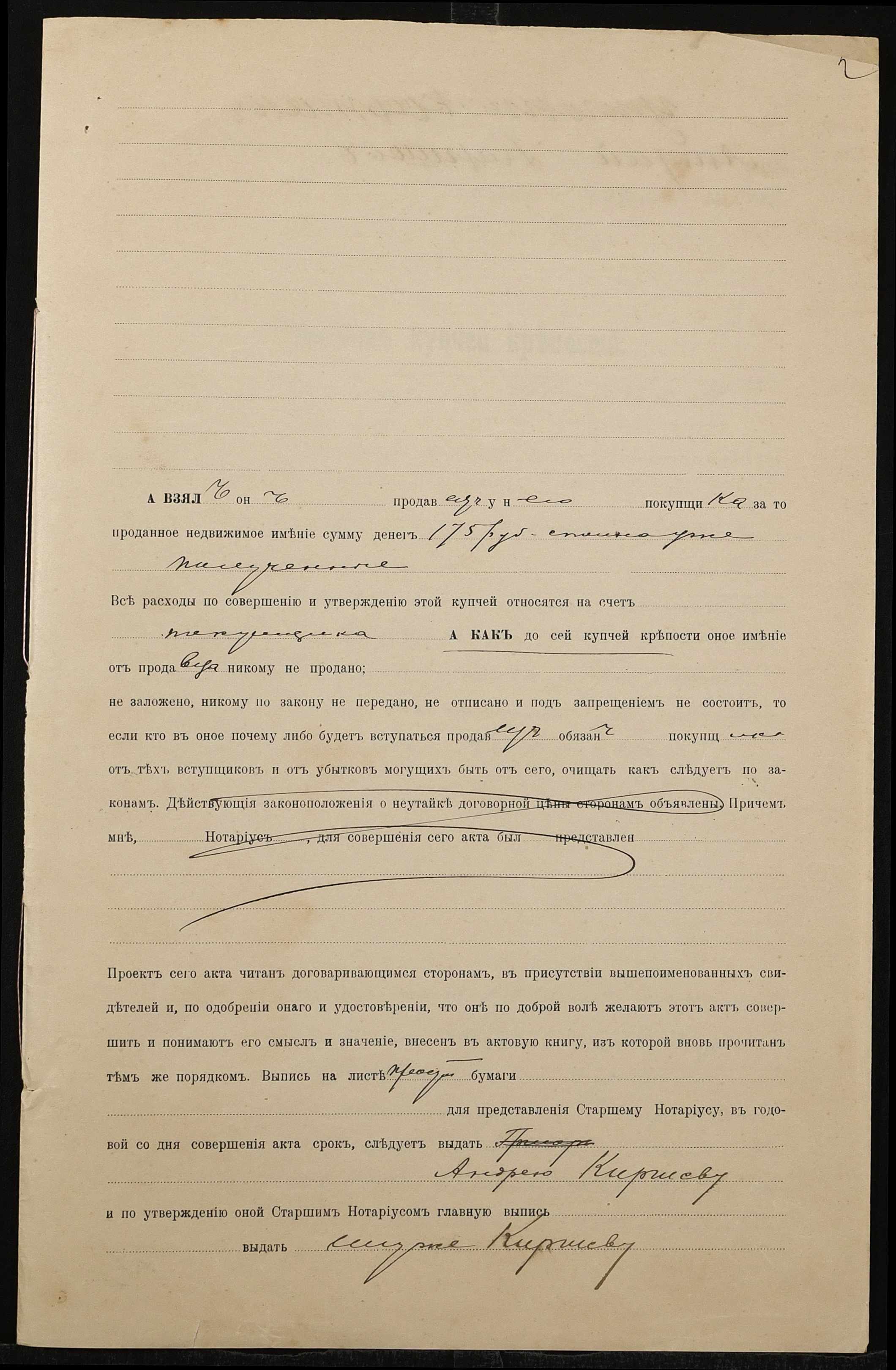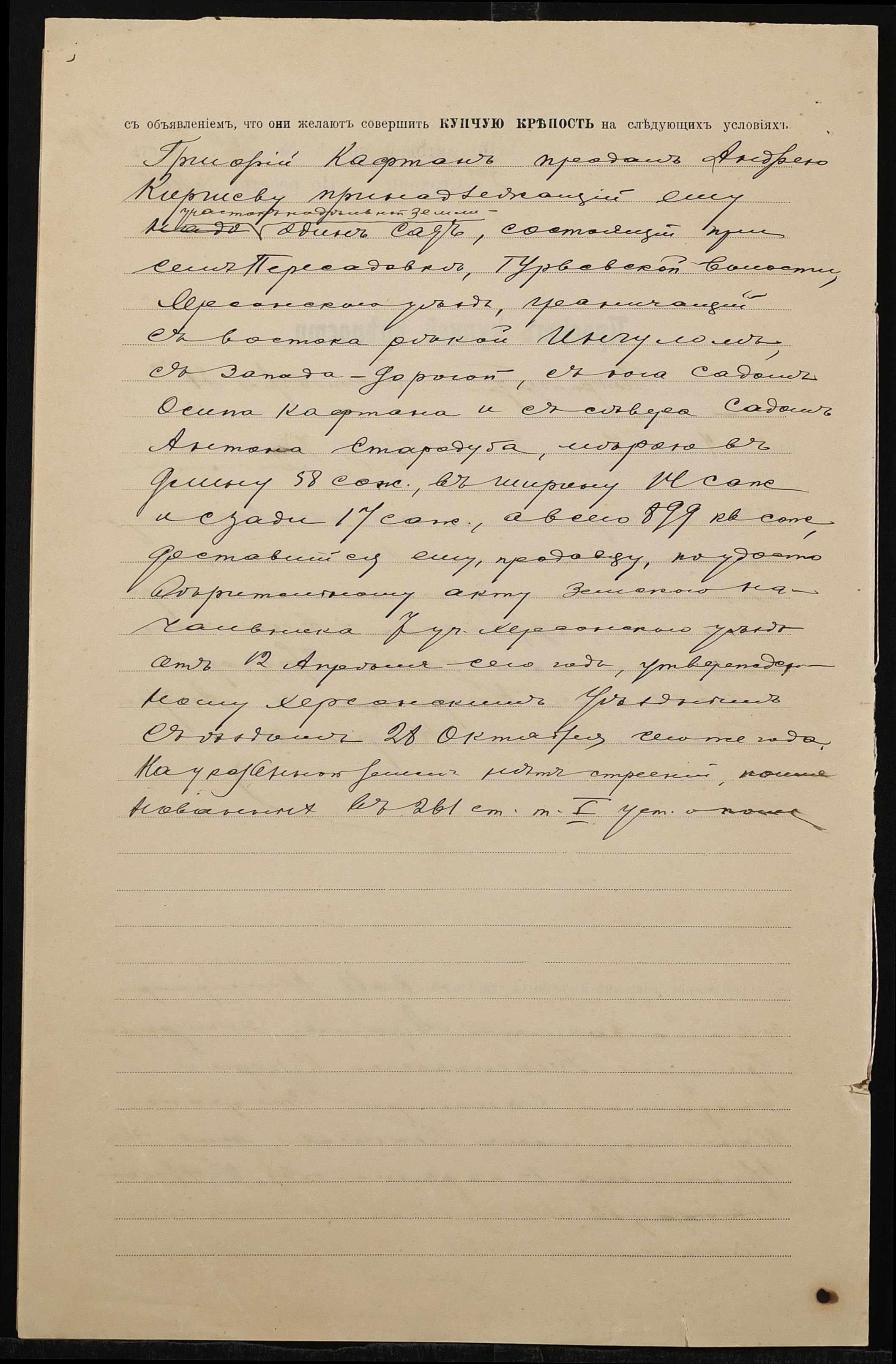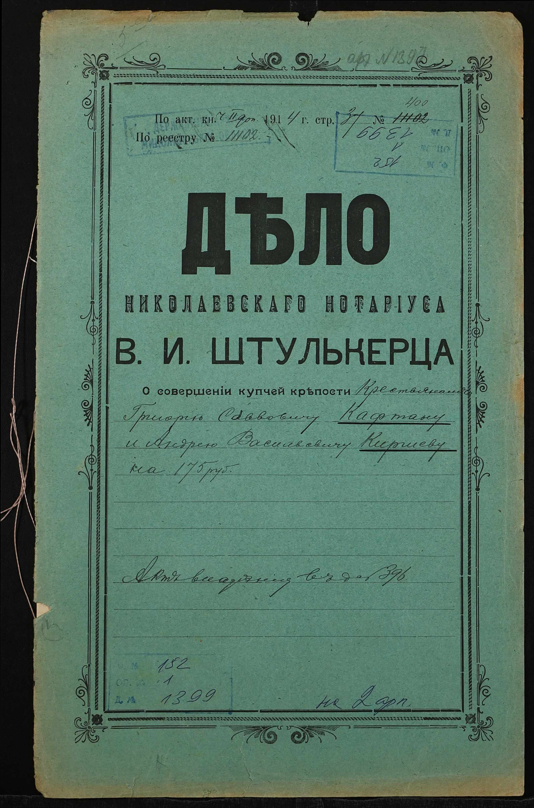 • • • • Справа № 1399 “Справа про вчинення купчої про продаж землі селянином Кафтаном Григорієм Савовичем (Кафтаном Григорием Саввовичем) на користь селянина Кіршева Андрія Васильовича (Киршева Андрея Васильевича)”