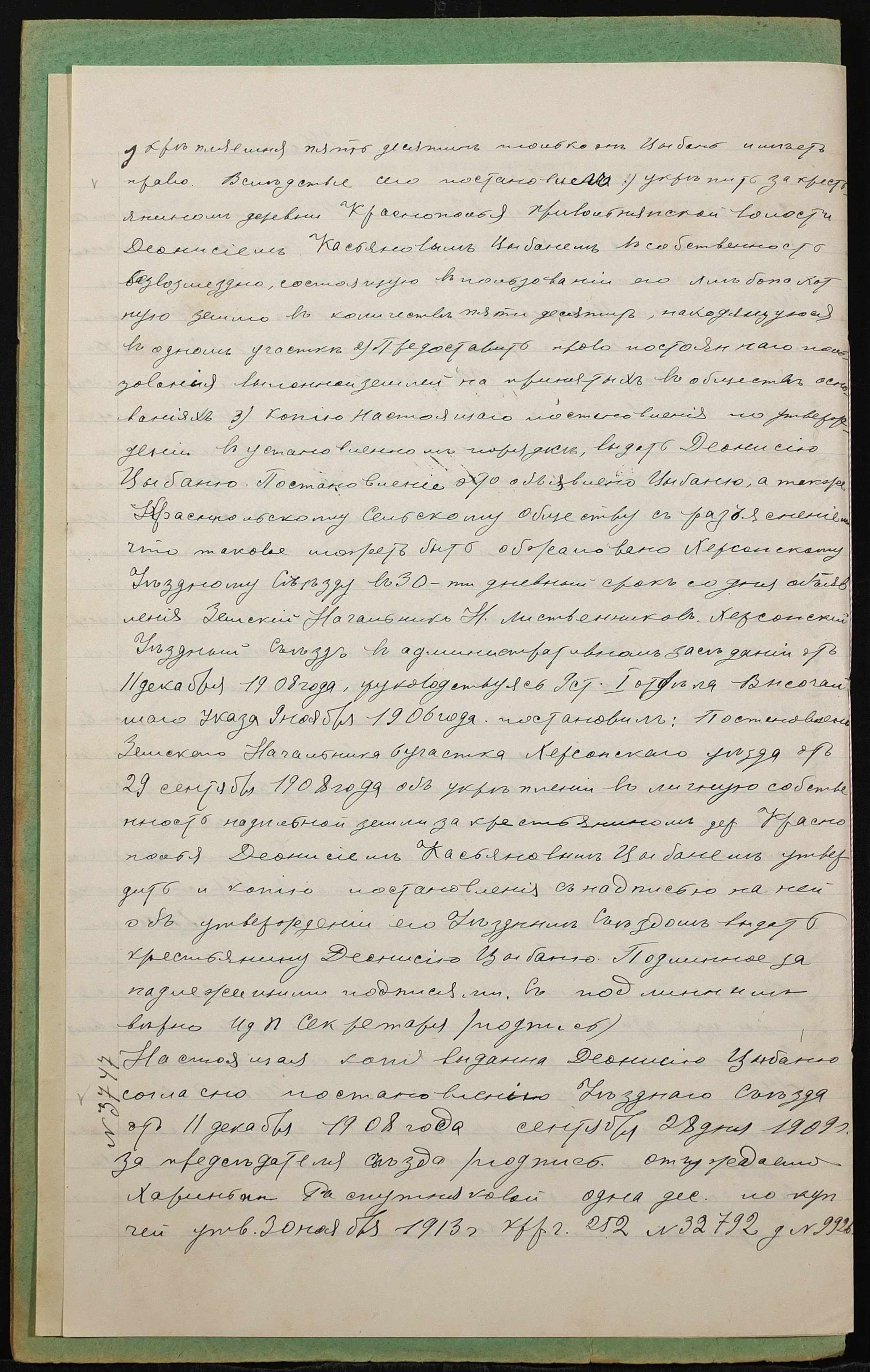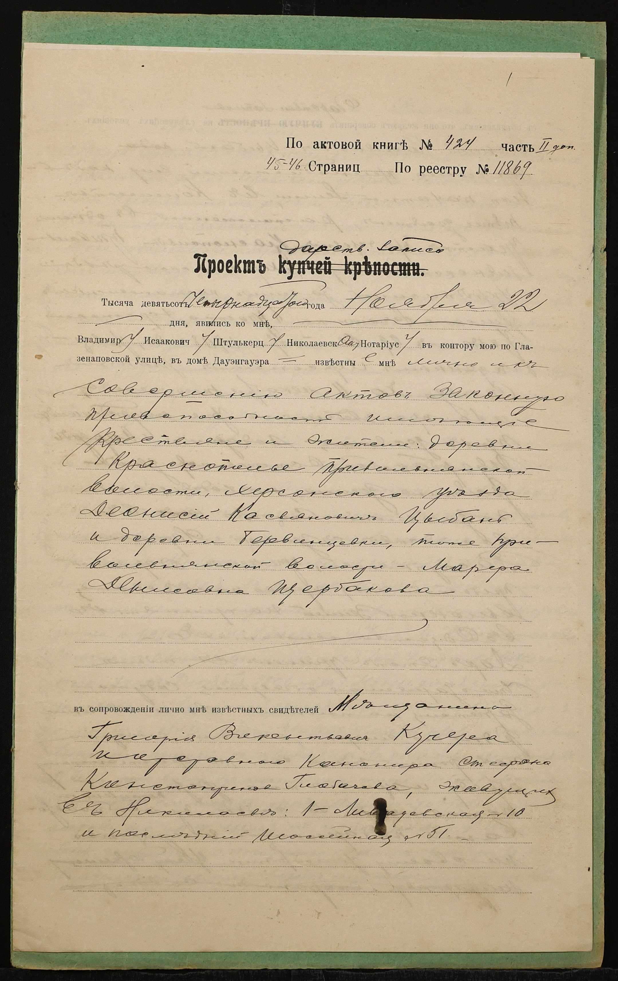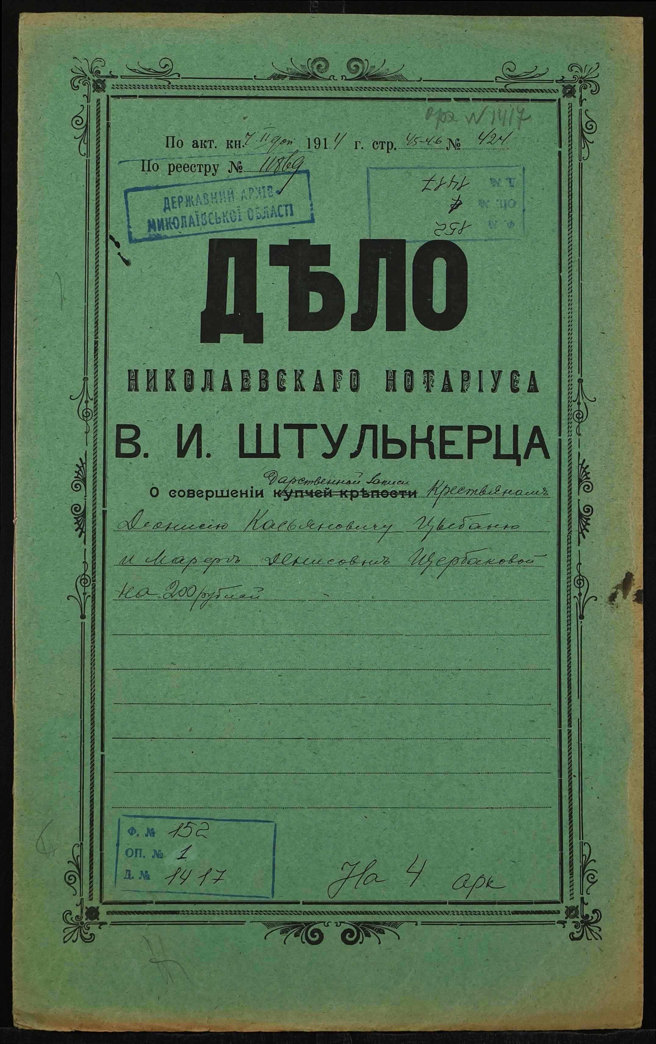 • • • • Справа № 1417 “Справа про вчинення дарчої на землю, передану селянином Цибанєм Деонісієм Касьяновичем (Цыбанем Деонисием Касьяновичем) у власність селянки Щербакової Марфи Денисівни (Щербаковой Марфы Денисовны)”