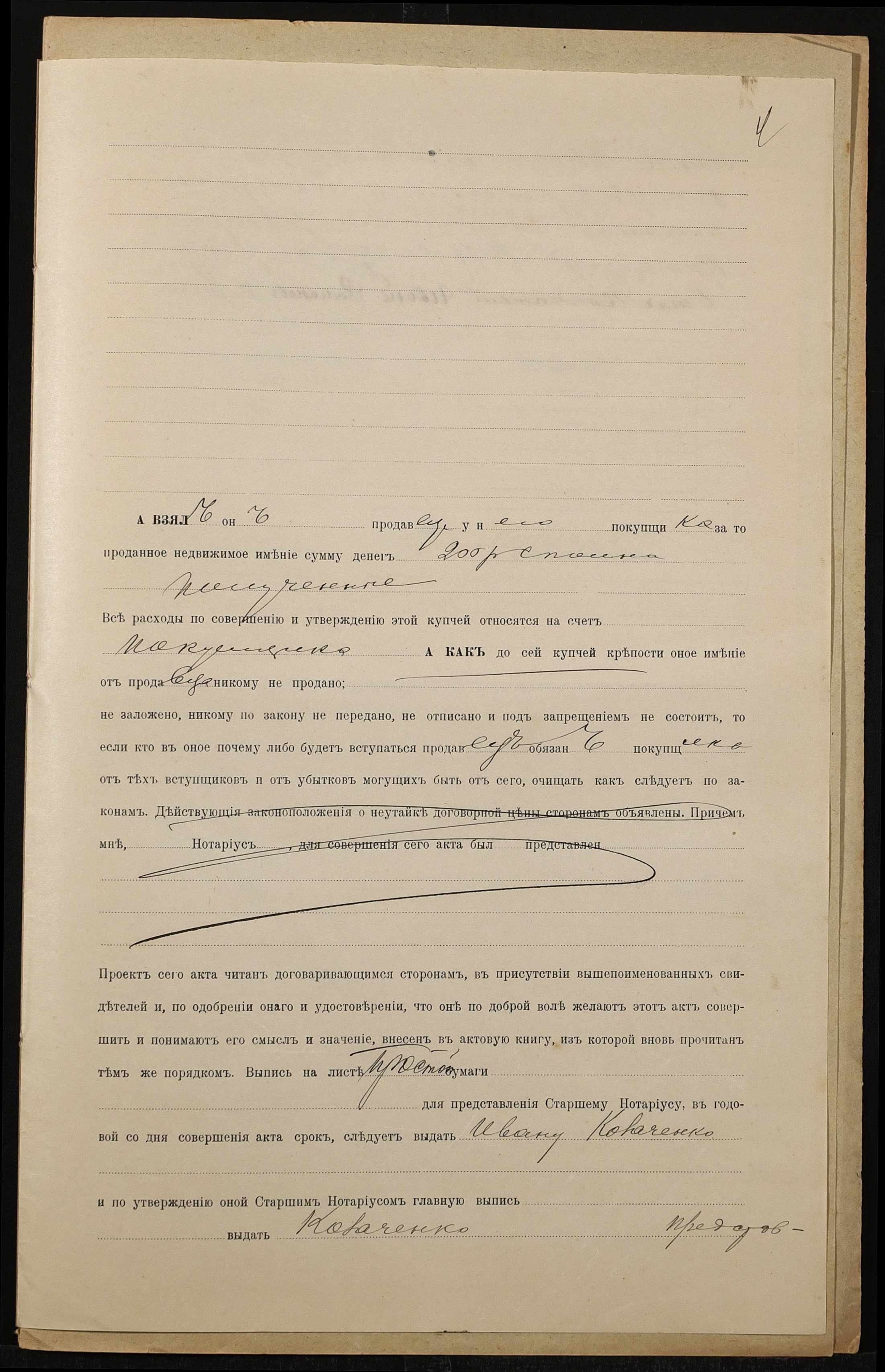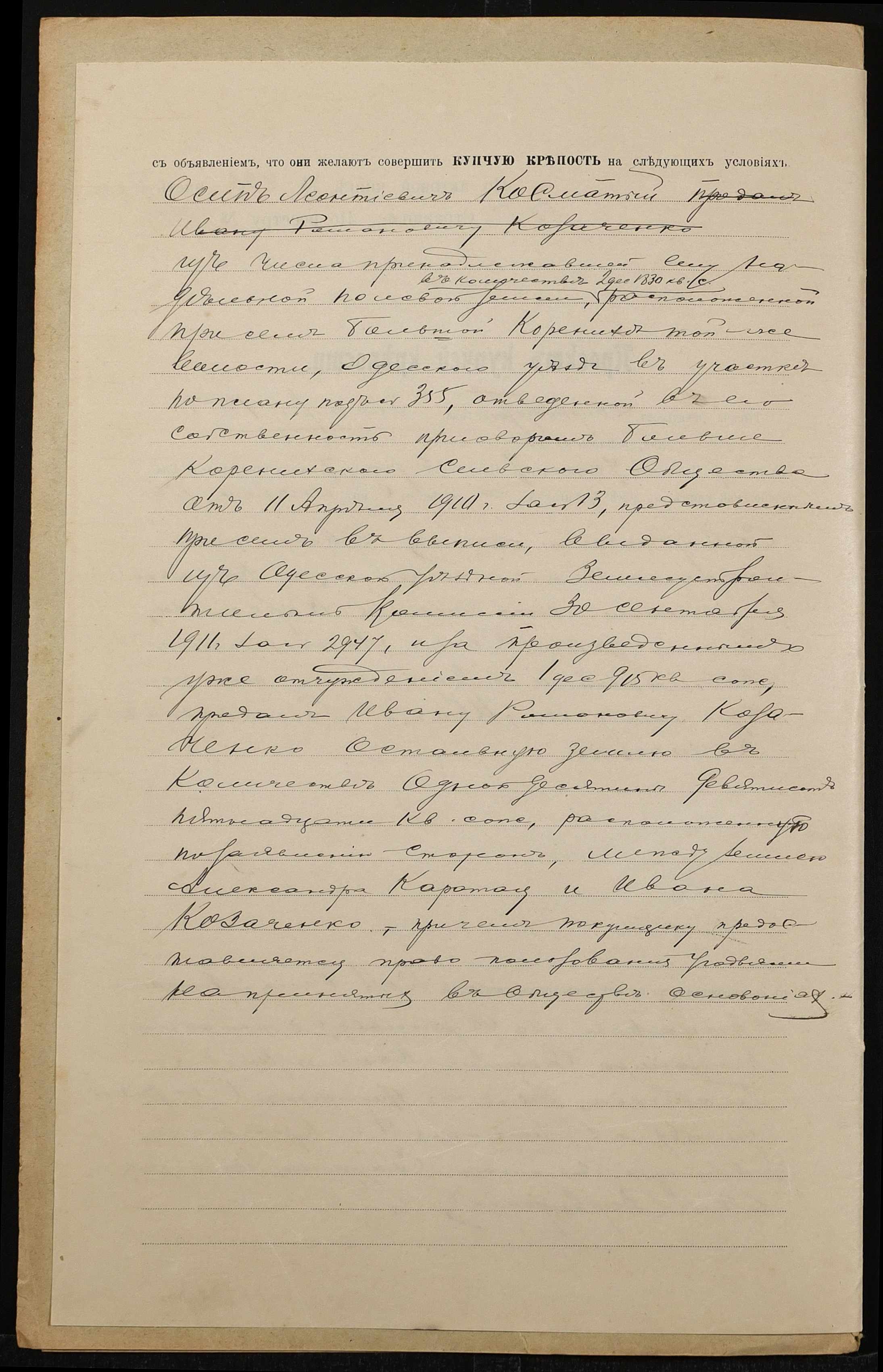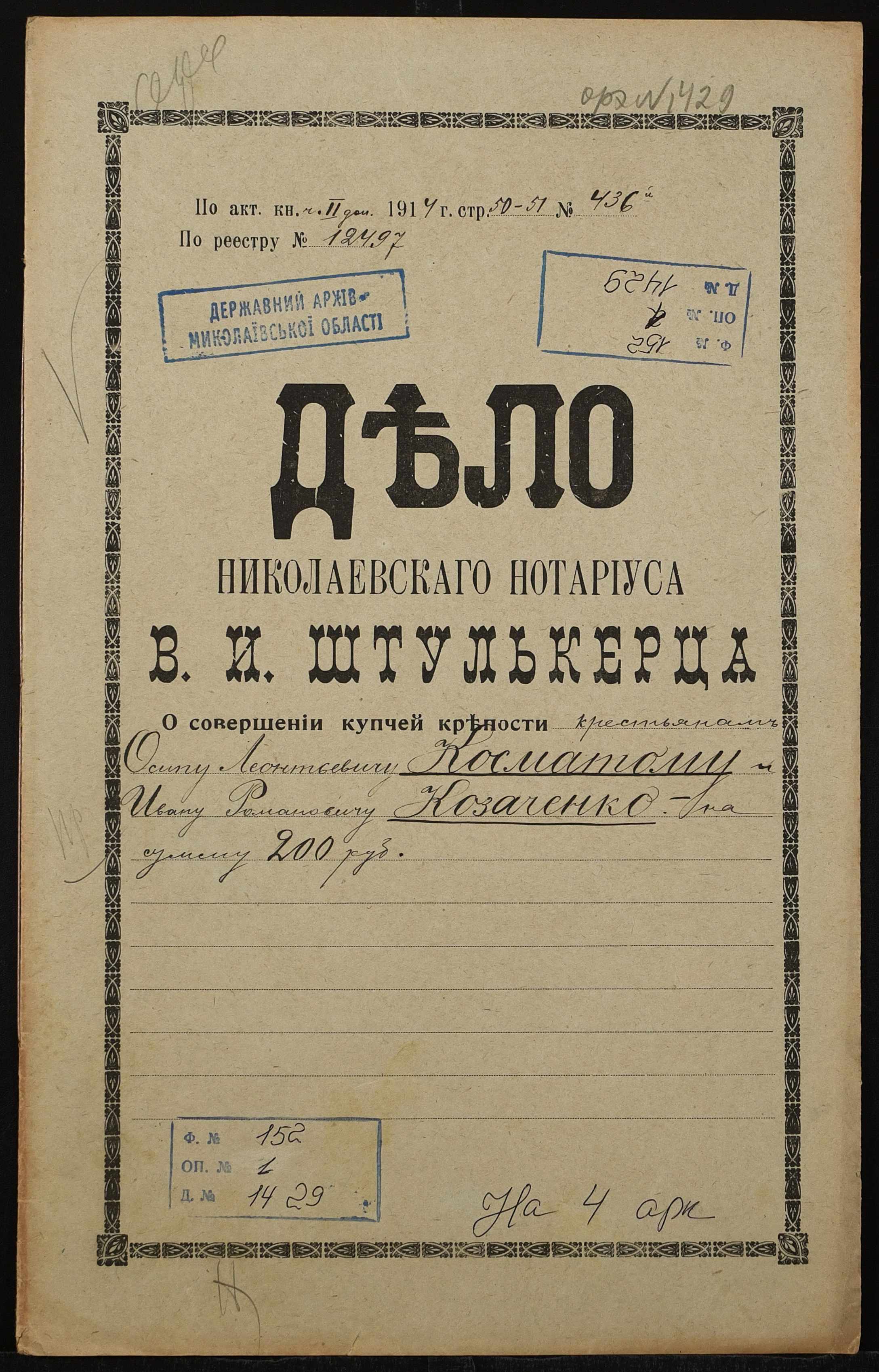• • • • Справа № 1429 “Справа про вчинення купчої про продаж землі селянином Косматим Осипом Леонтійовичем (Косматым Осипом Леонтьевичем) на користь селянина Козаченка Івана Романовича (Козаченко Ивана Романовича)”