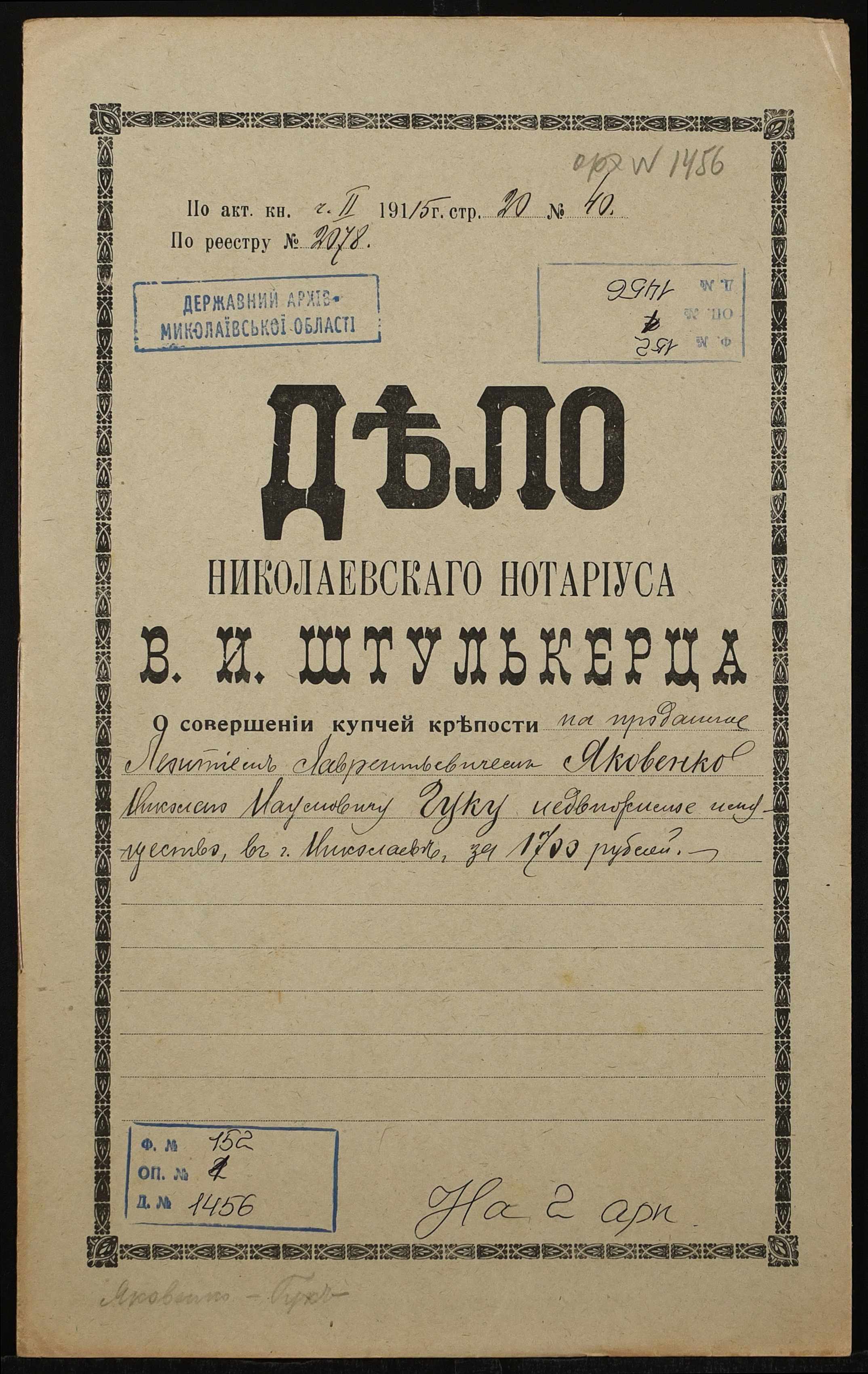 Фонд 152 / Опис 1 / Справа 1456