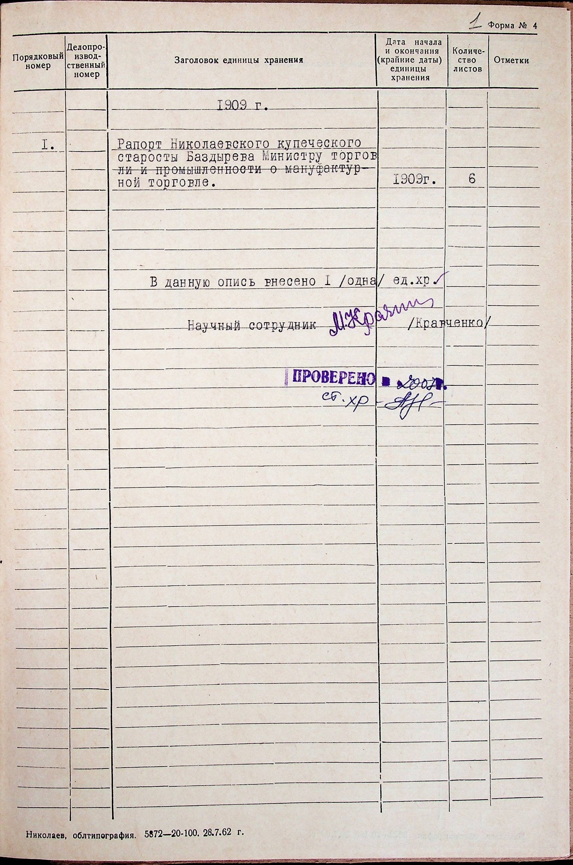 ◦ ◦ ◦ Опис № 1 справ постійного зберігання за 1909 рік
