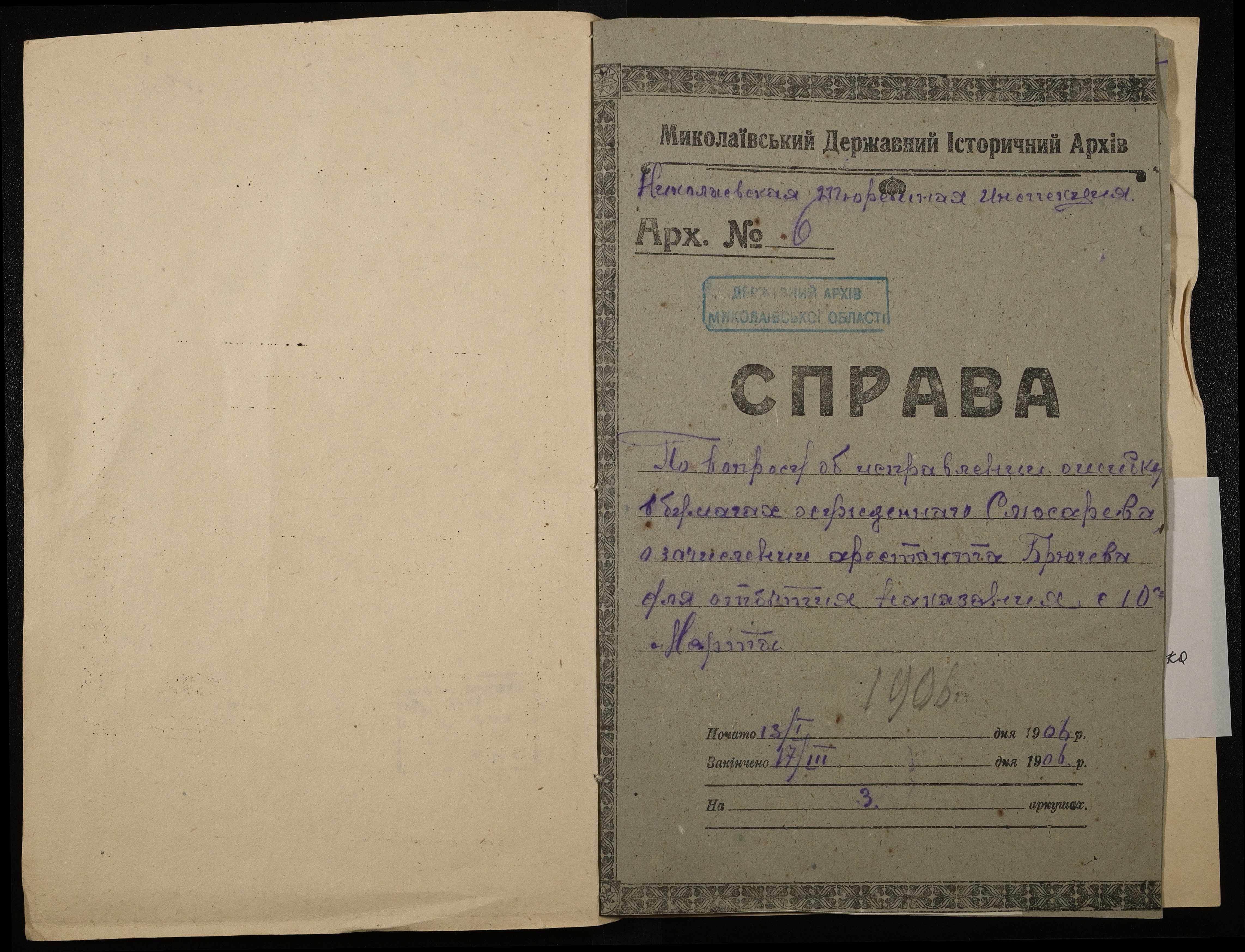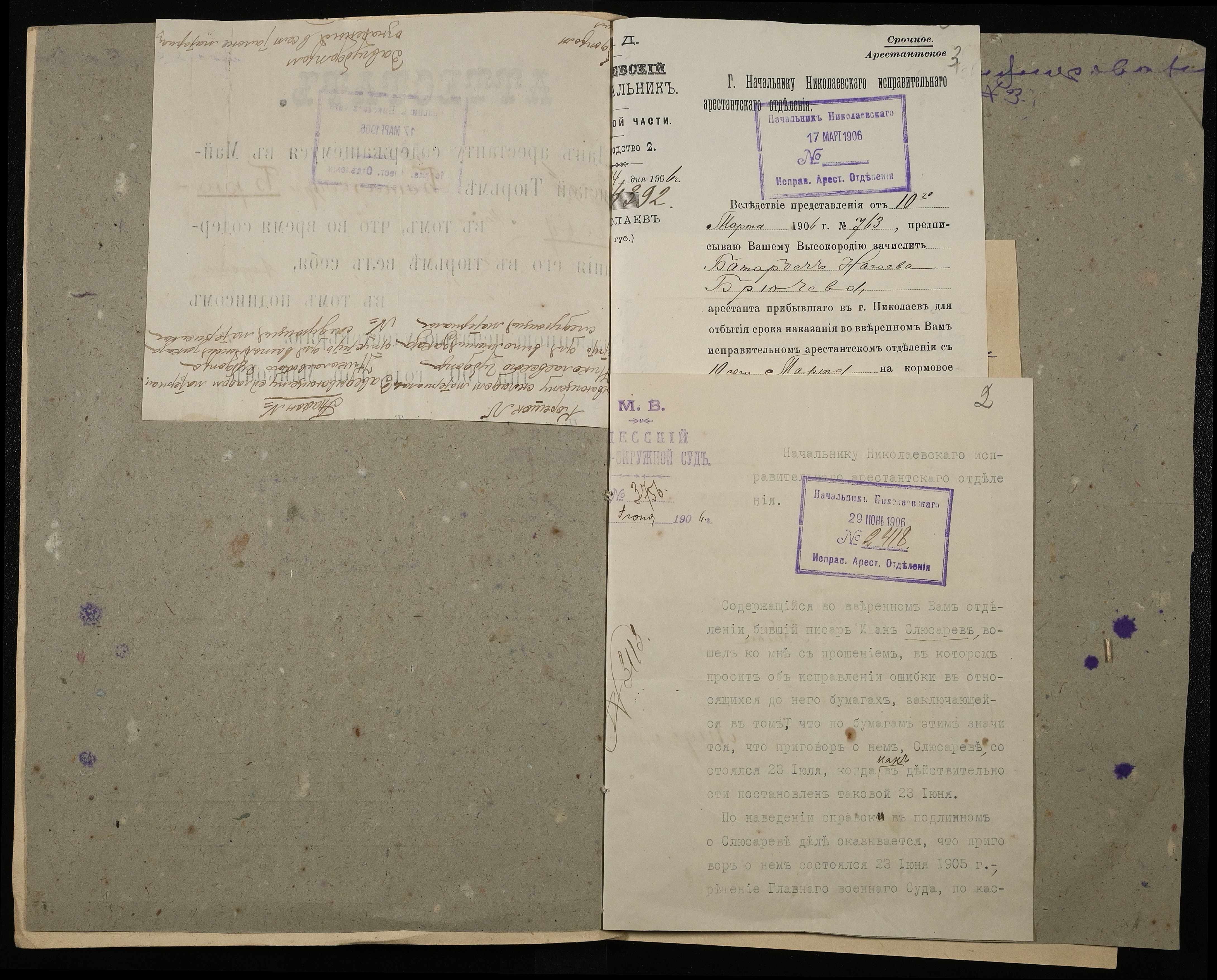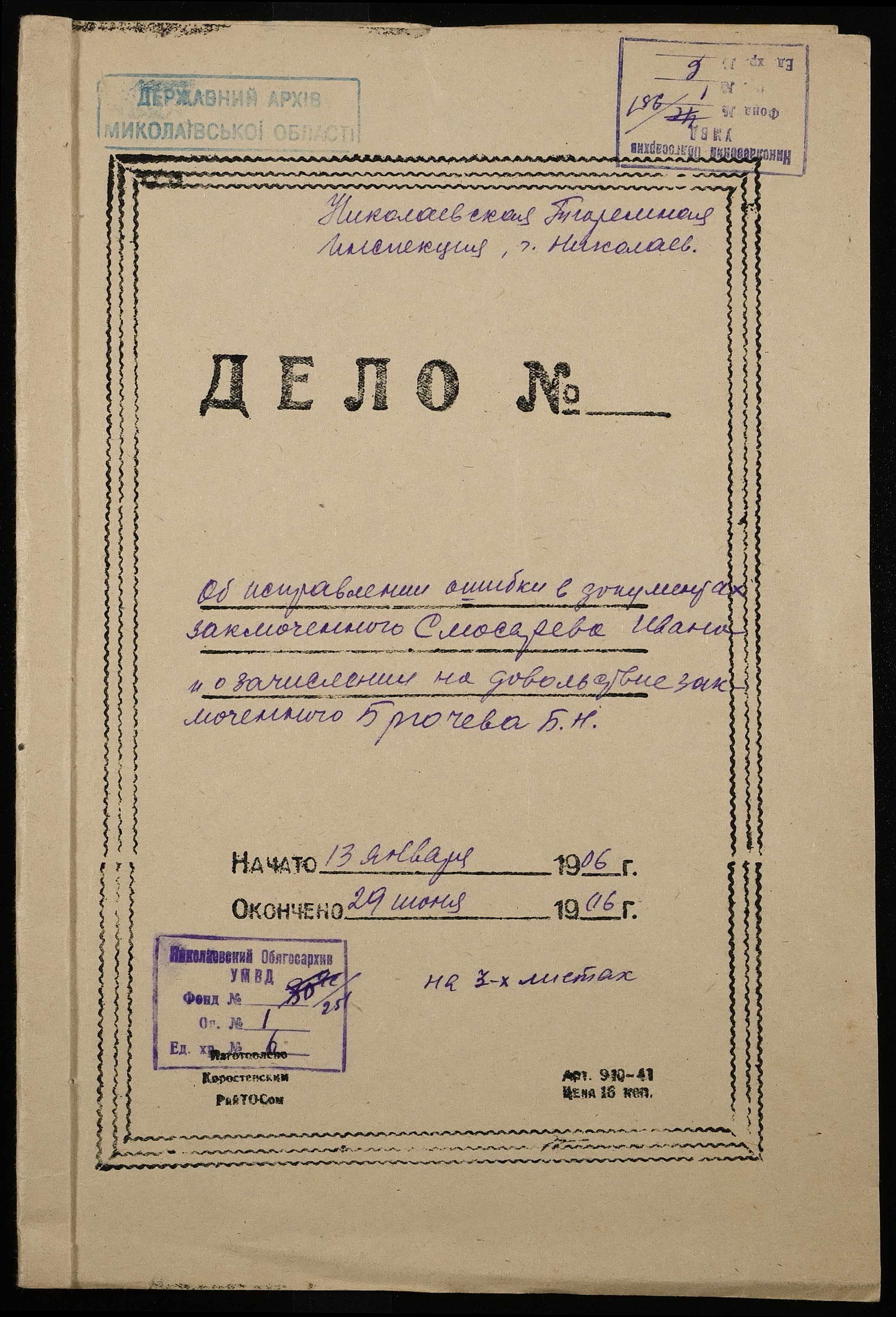 • • • • Справа № 6 Листування Одеського окружного суду з Миколаївським виправним арештанським відділенням про виправлення помилки в документах ув’язненого Слюсарєва І., зарахування на продовольче забезпечення арештанта Брючева Б.Н.