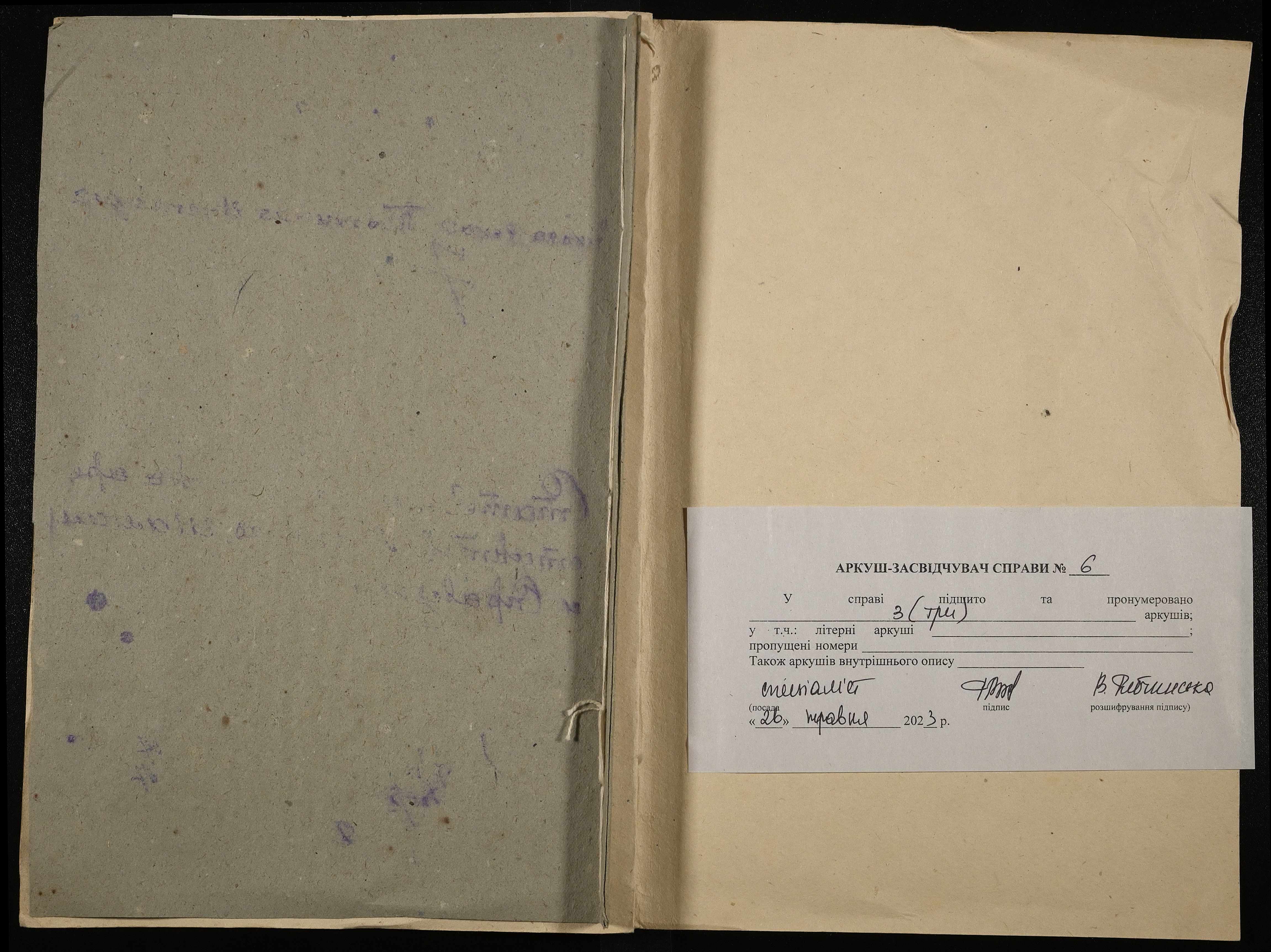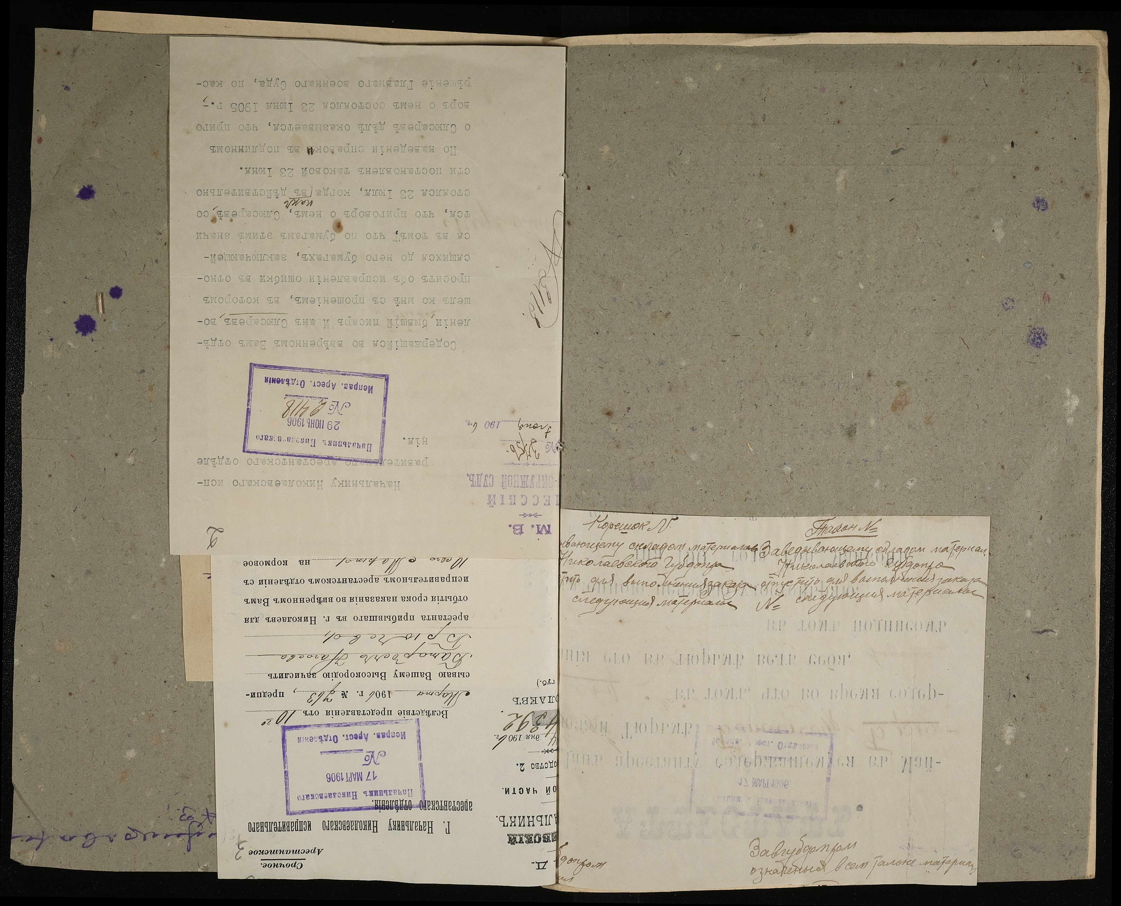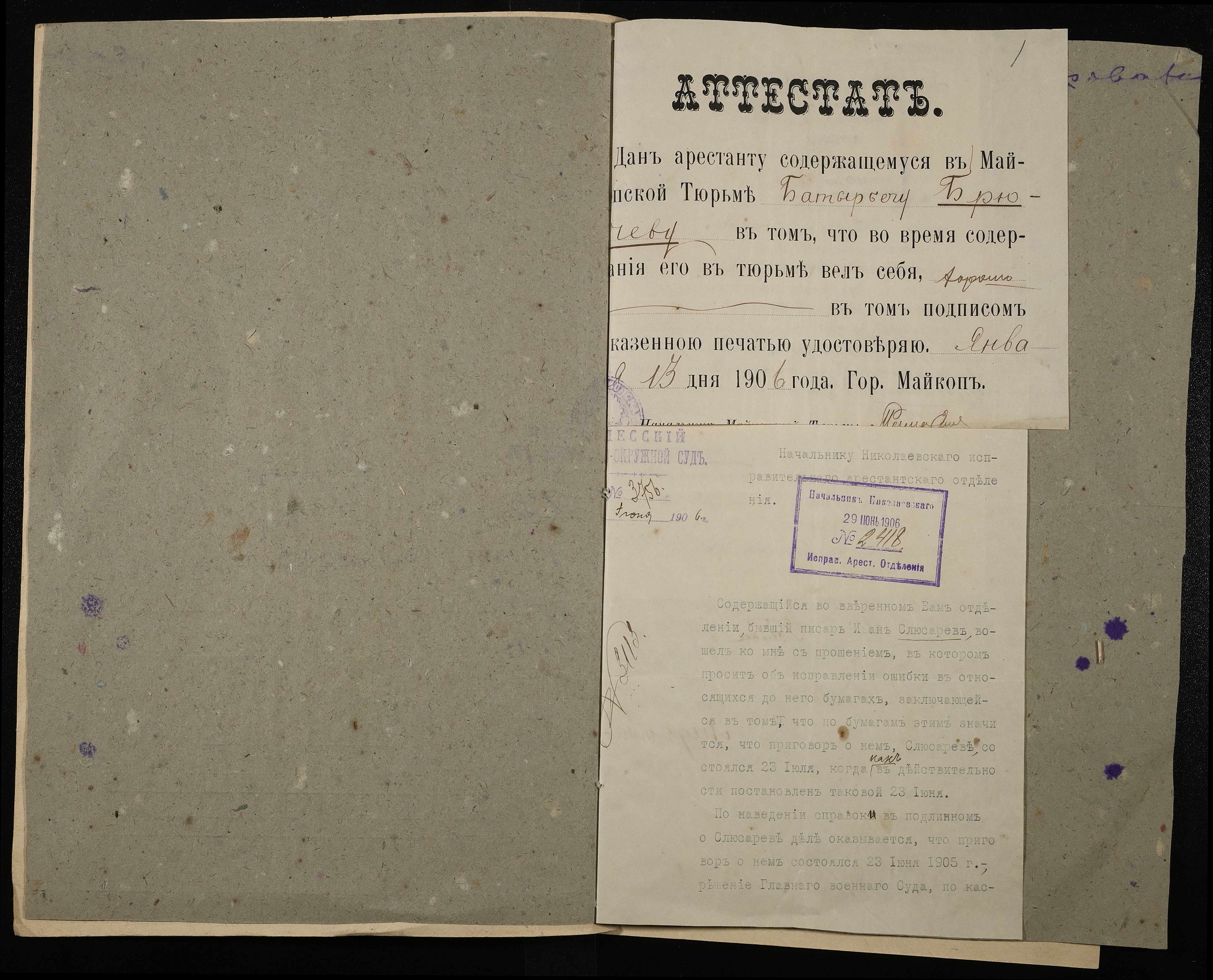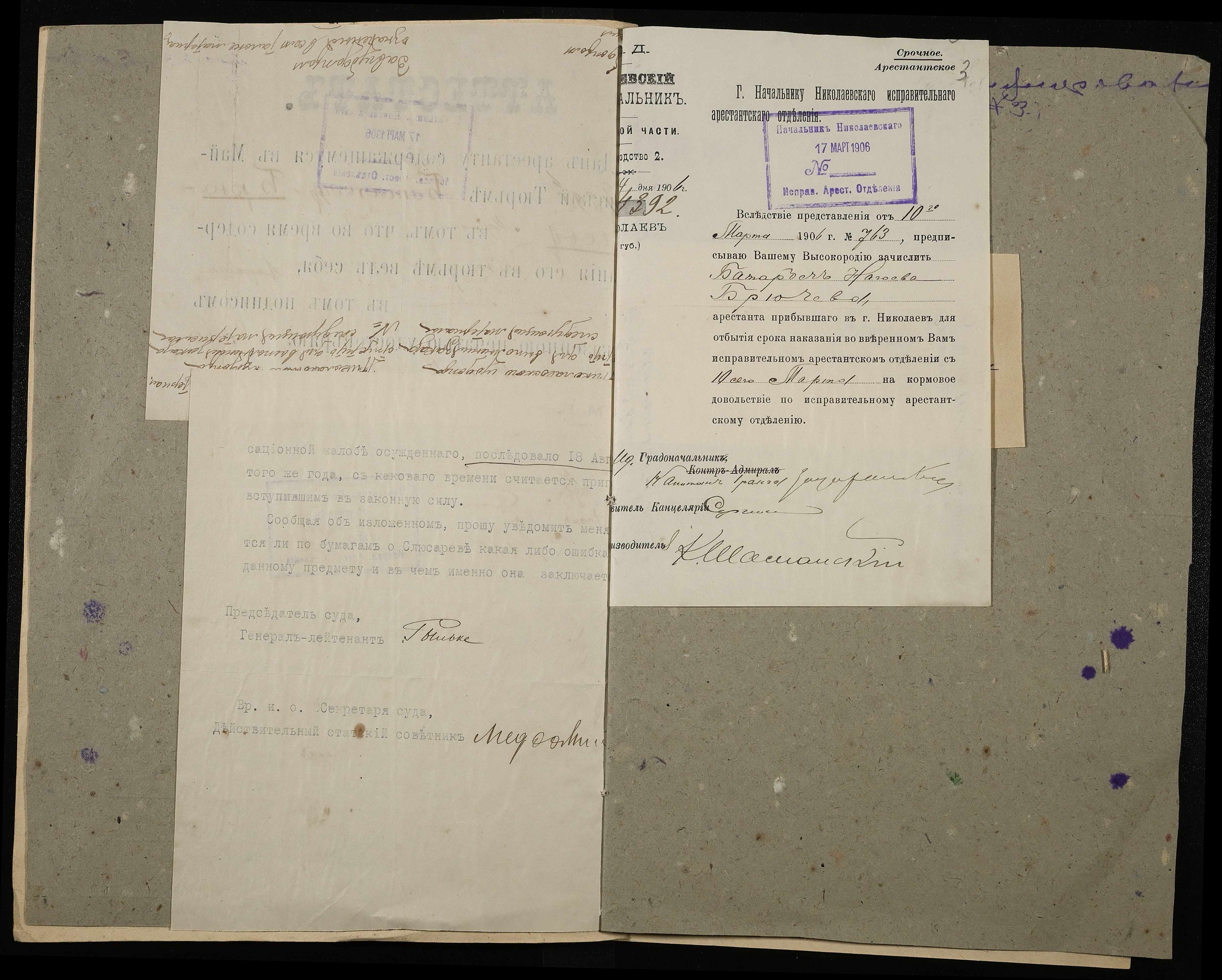 • • • • Справа № 6 Листування Одеського окружного суду з Миколаївським виправним арештанським відділенням про виправлення помилки в документах ув’язненого Слюсарєва І., зарахування на продовольче забезпечення арештанта Брючева Б.Н.