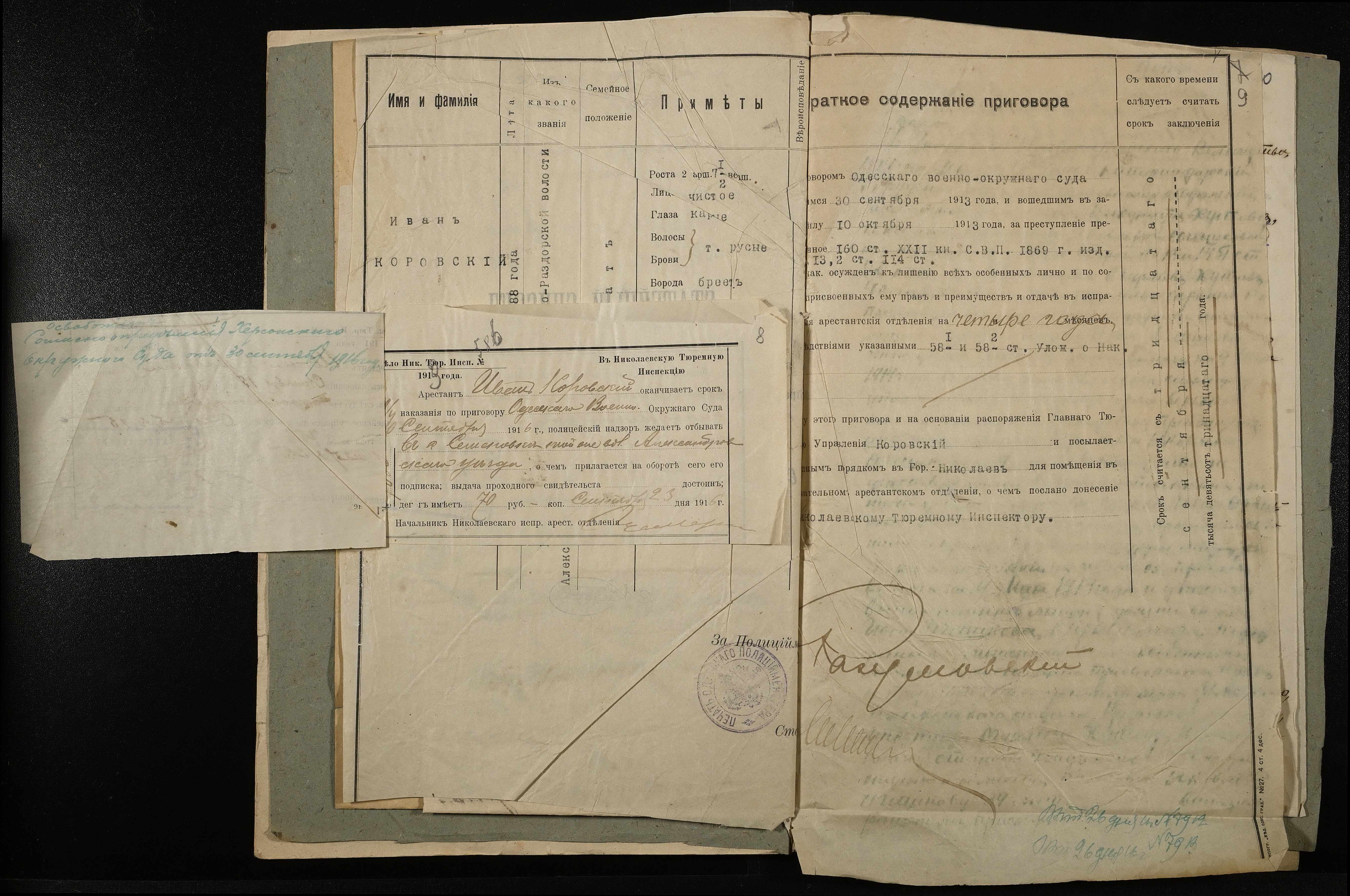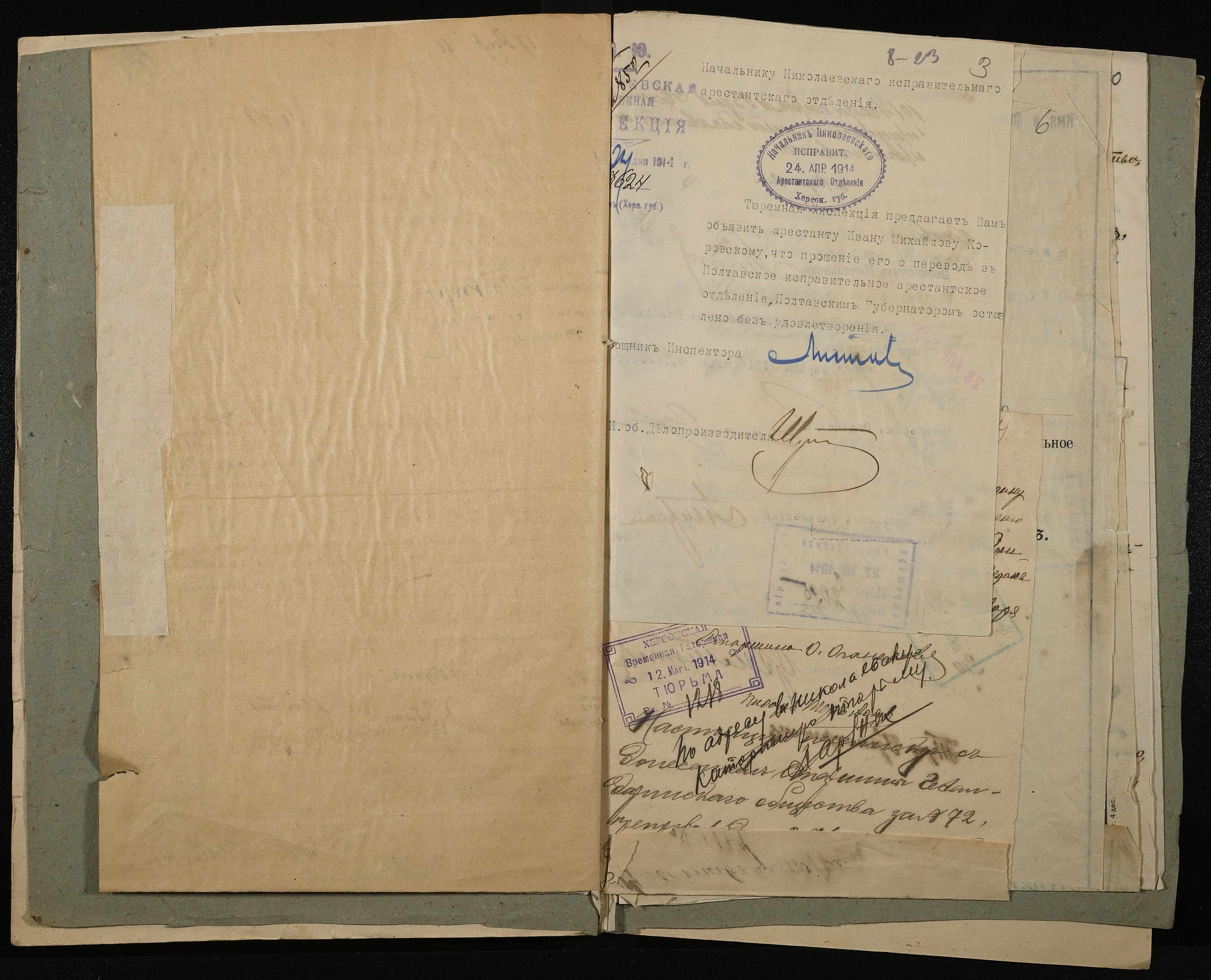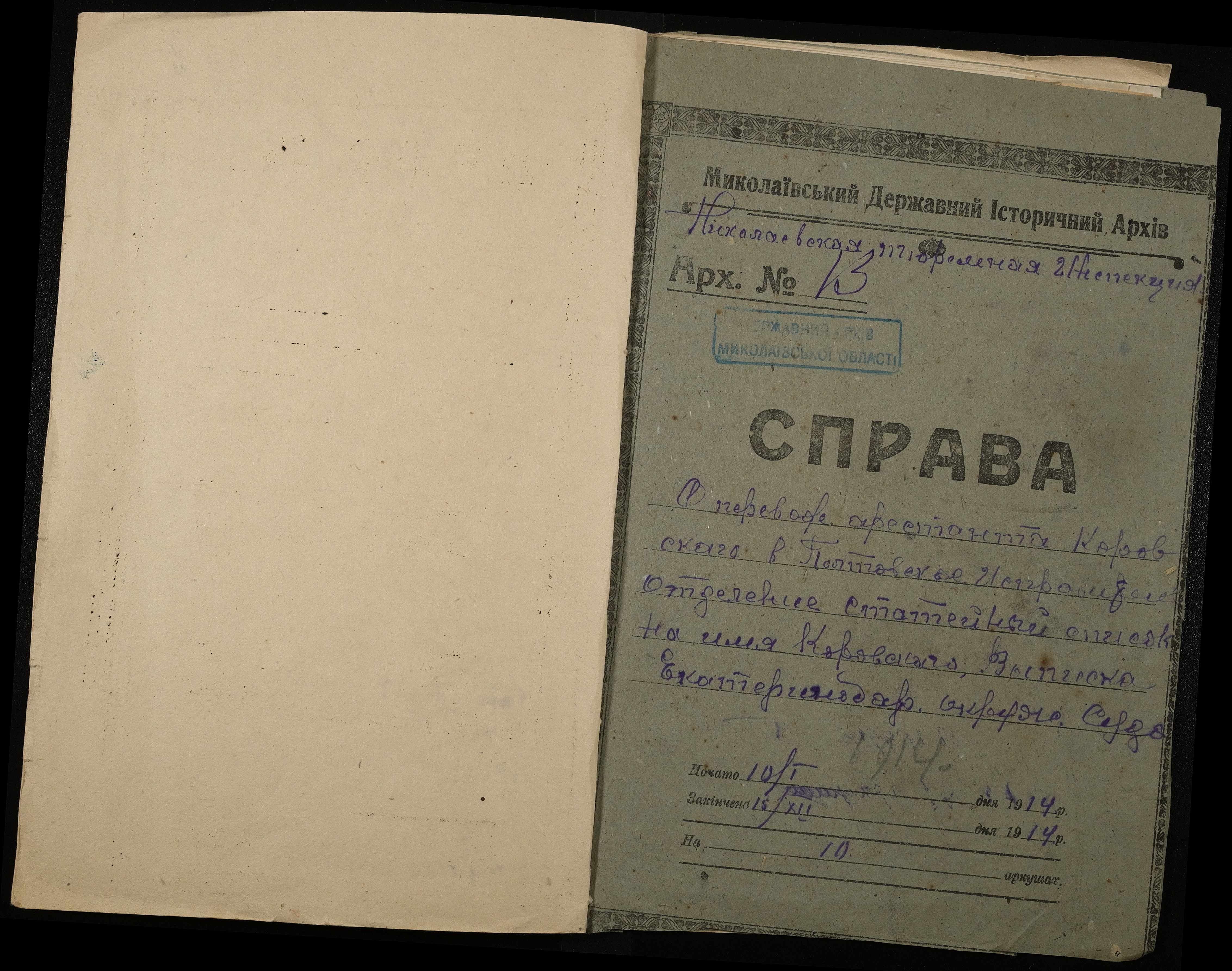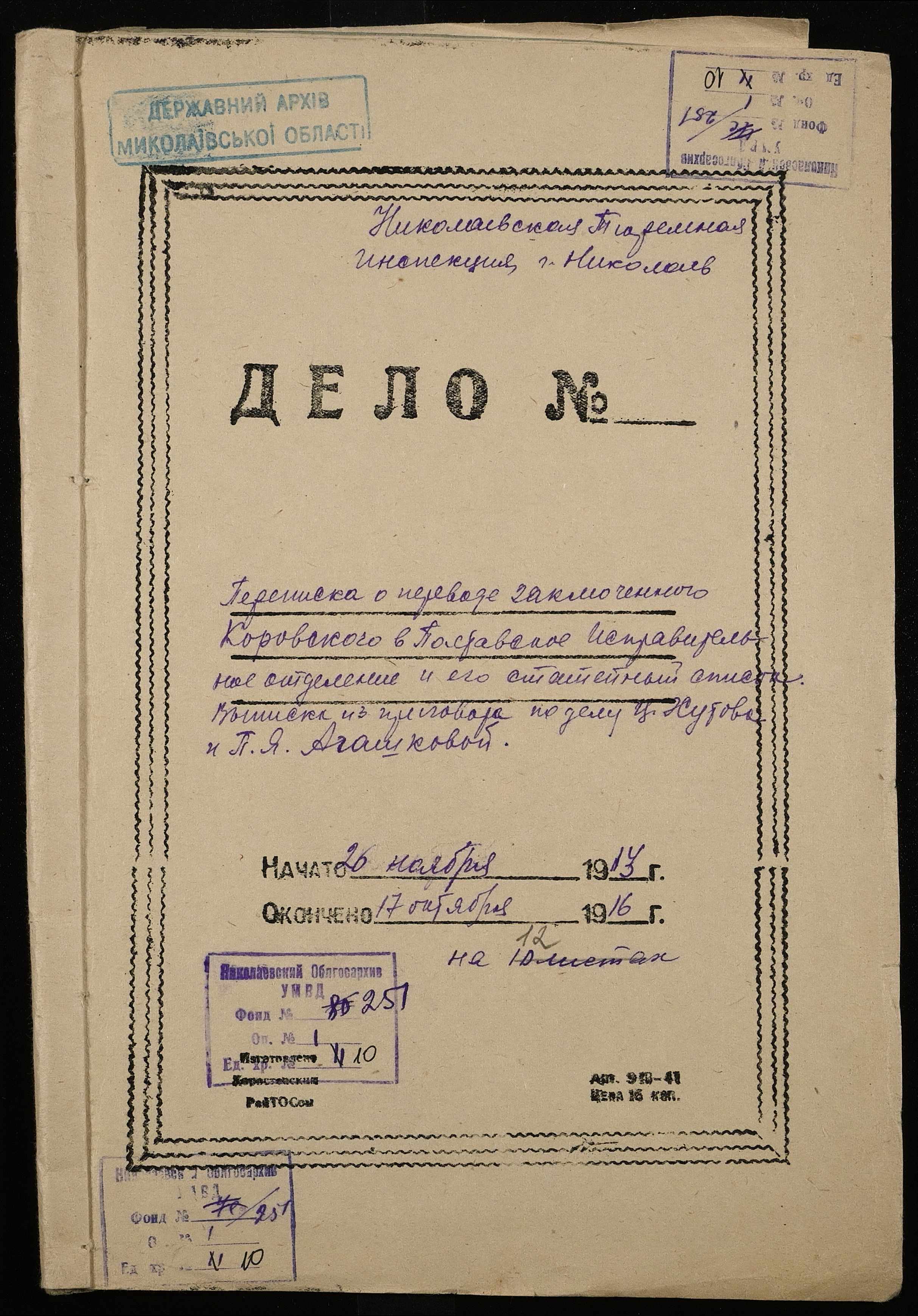 • • • • Справа № 10 Листування з начальником Миколаївського виправного арештантського відділення про переведення арештанта Коровського І.М. до Полтавського виправного відділення та його статейний список; копія витягу із вироку у справі Хутова Ц. і Агашкової В.Я.; відкритий лист на арештанта Петрова Т.