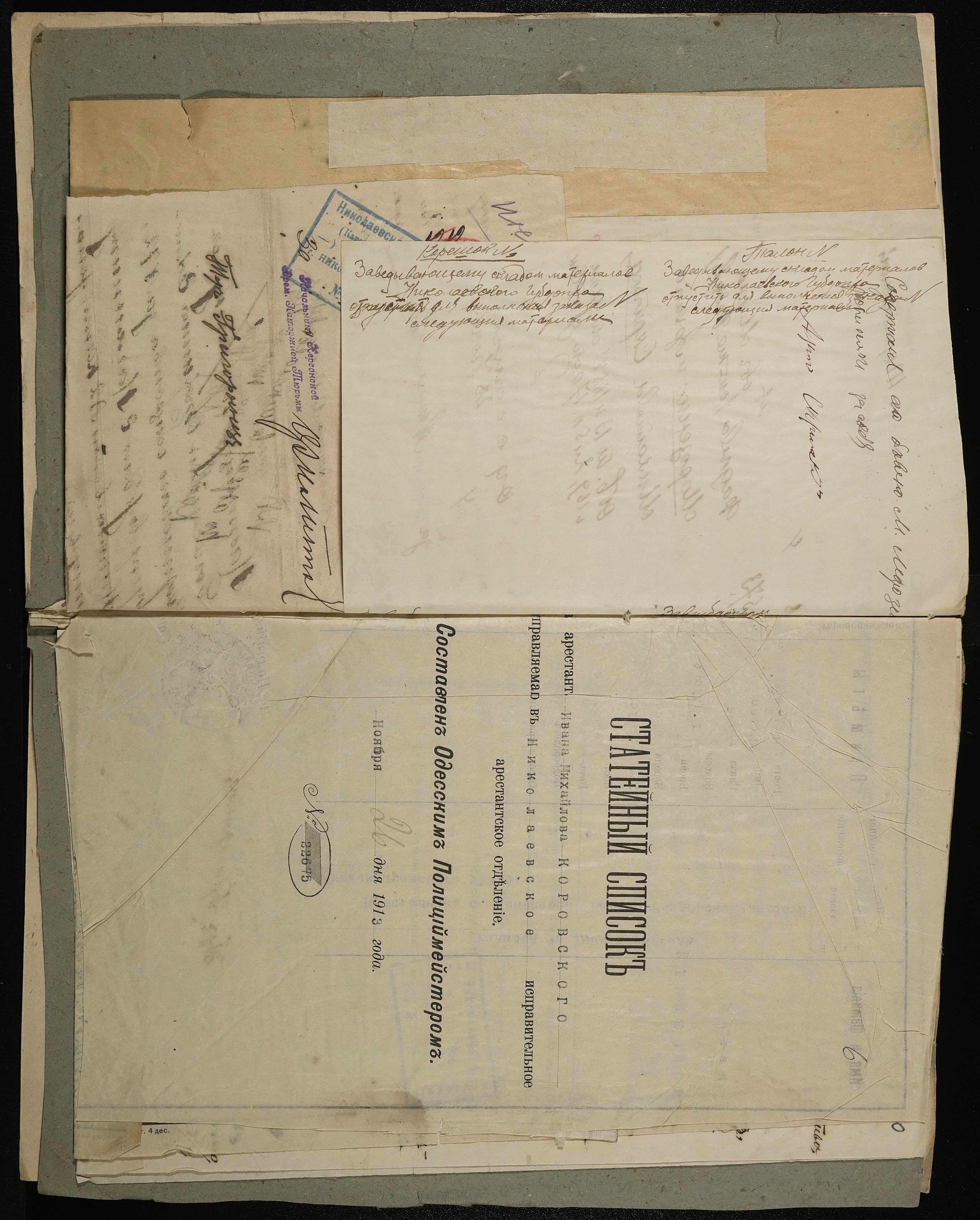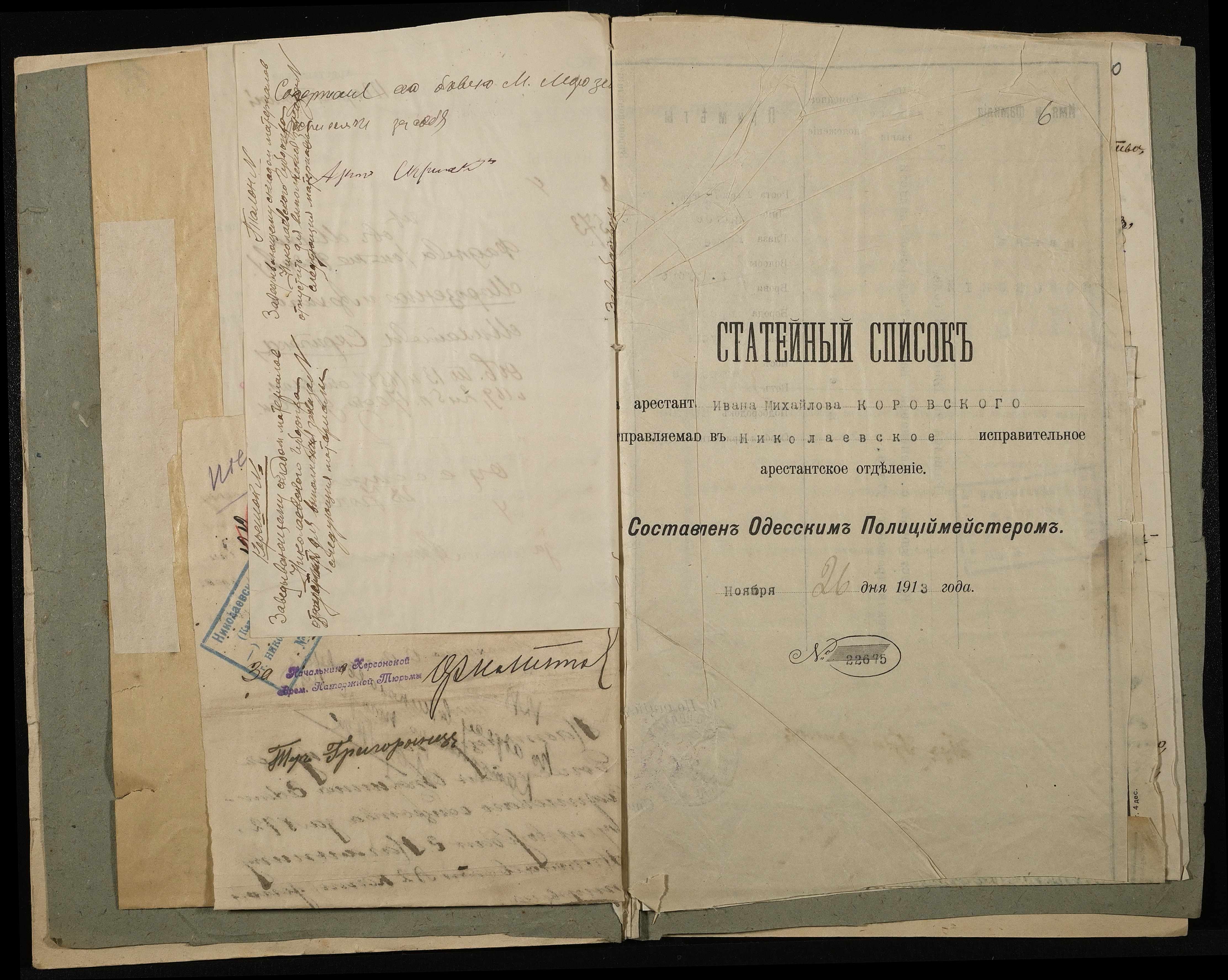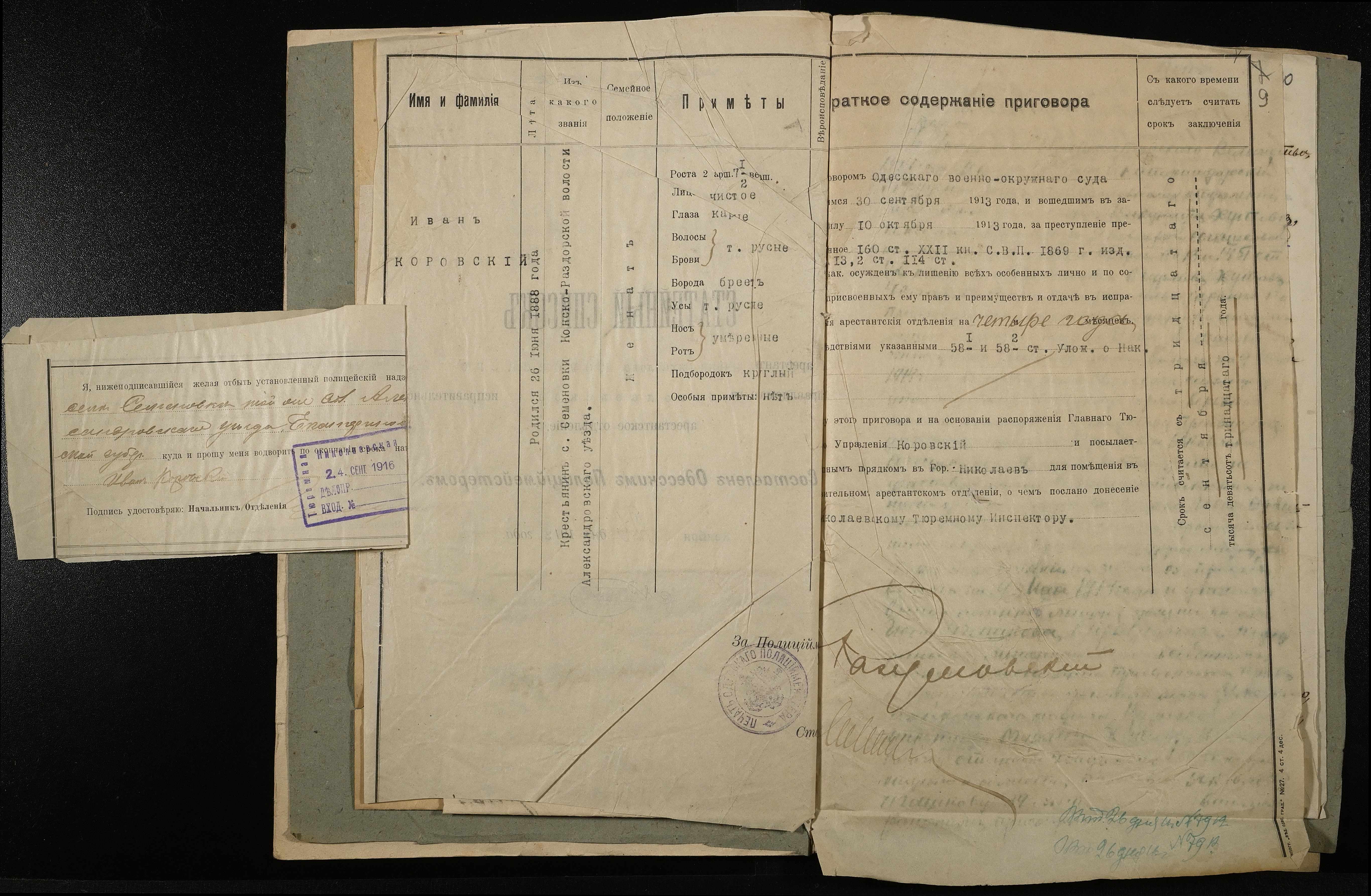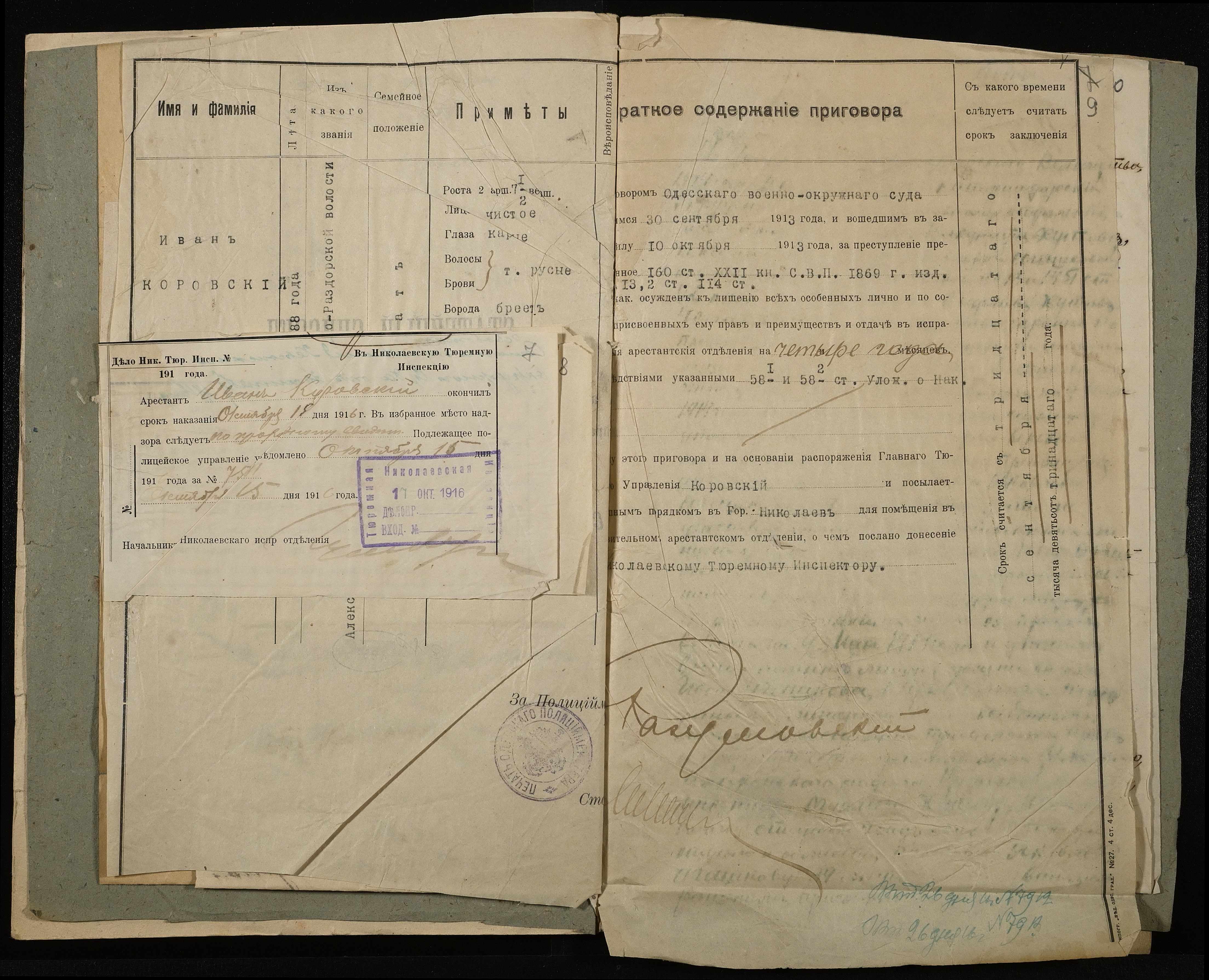 • • • • Справа № 10 Листування з начальником Миколаївського виправного арештантського відділення про переведення арештанта Коровського І.М. до Полтавського виправного відділення та його статейний список; копія витягу із вироку у справі Хутова Ц. і Агашкової В.Я.; відкритий лист на арештанта Петрова Т.