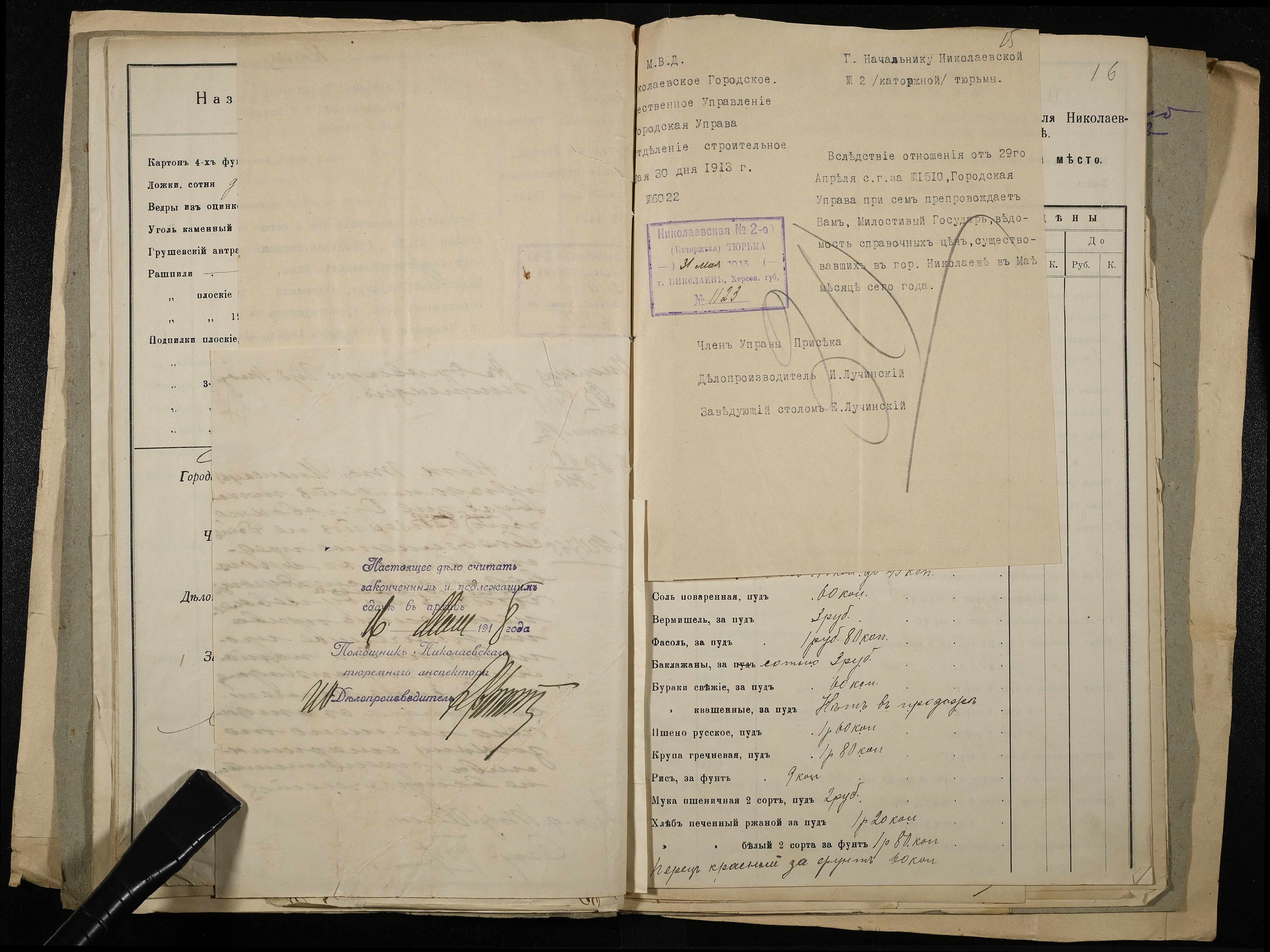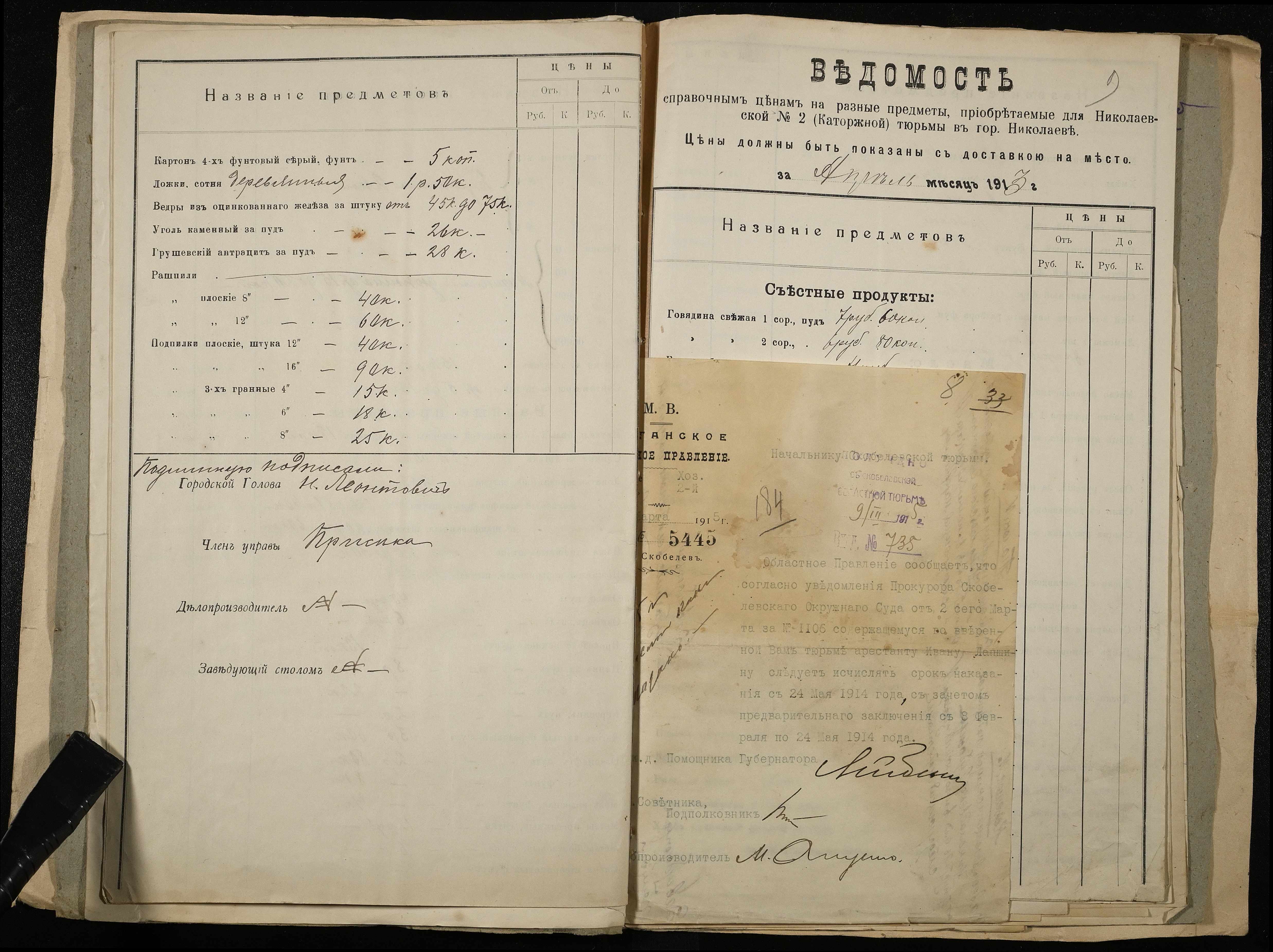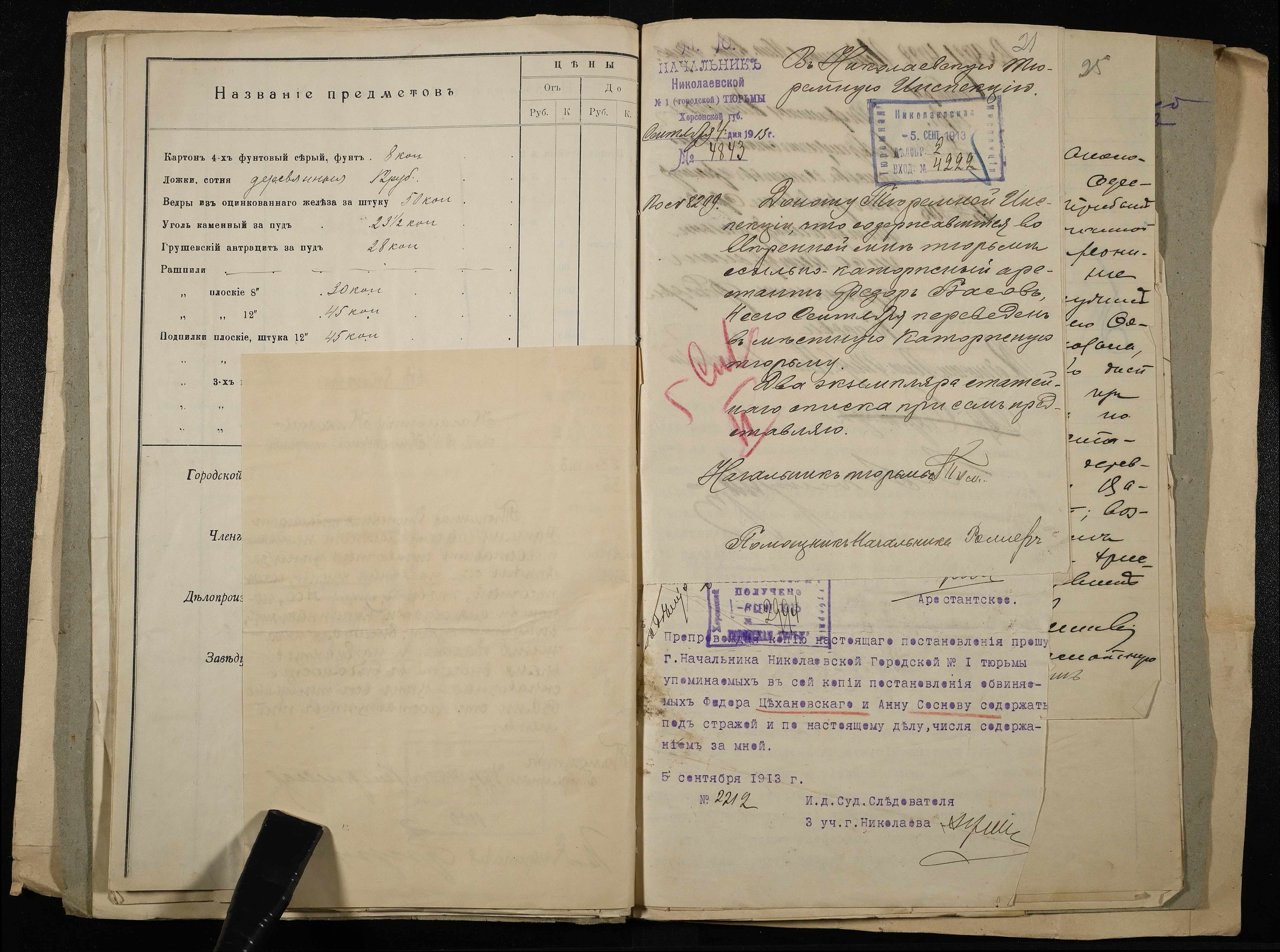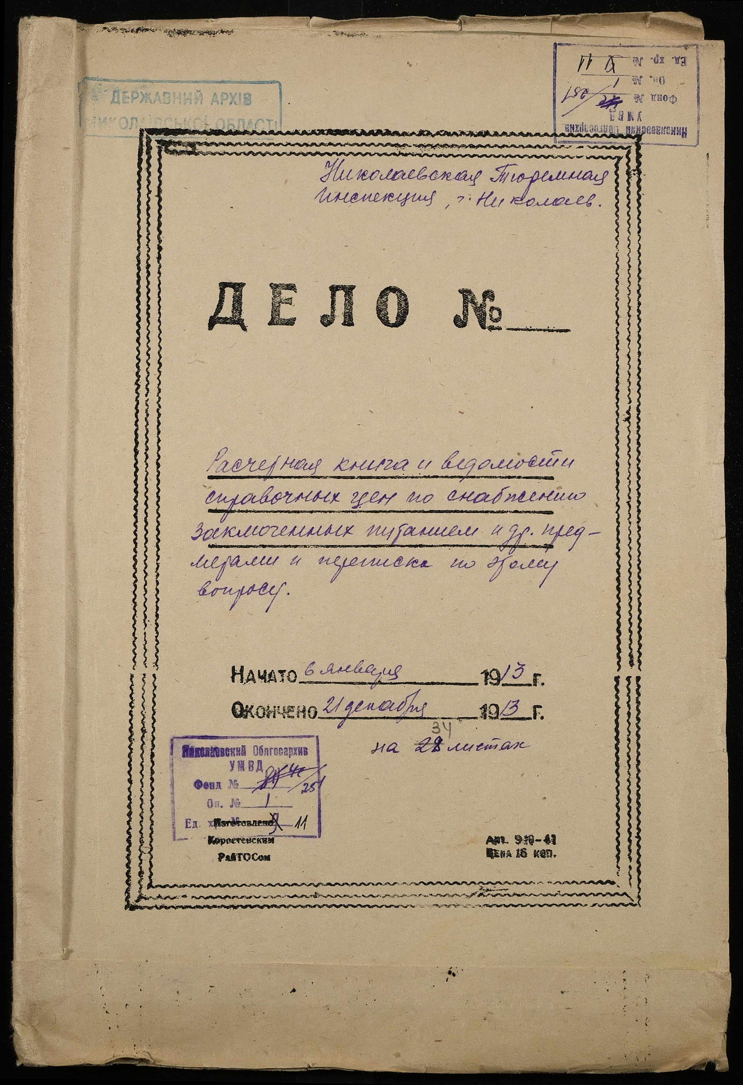 • • • • Справа № 11 Розрахункова книга та відомості довідкових цін щодо забезпечення висланців продуктами харчування, харчові табелі; листування з начальниками миколаївських тюрем про довідкові ціни на продукти харчування; з Херсонською духовною консисторією про розірвання шлюбу засудженого та ін.
