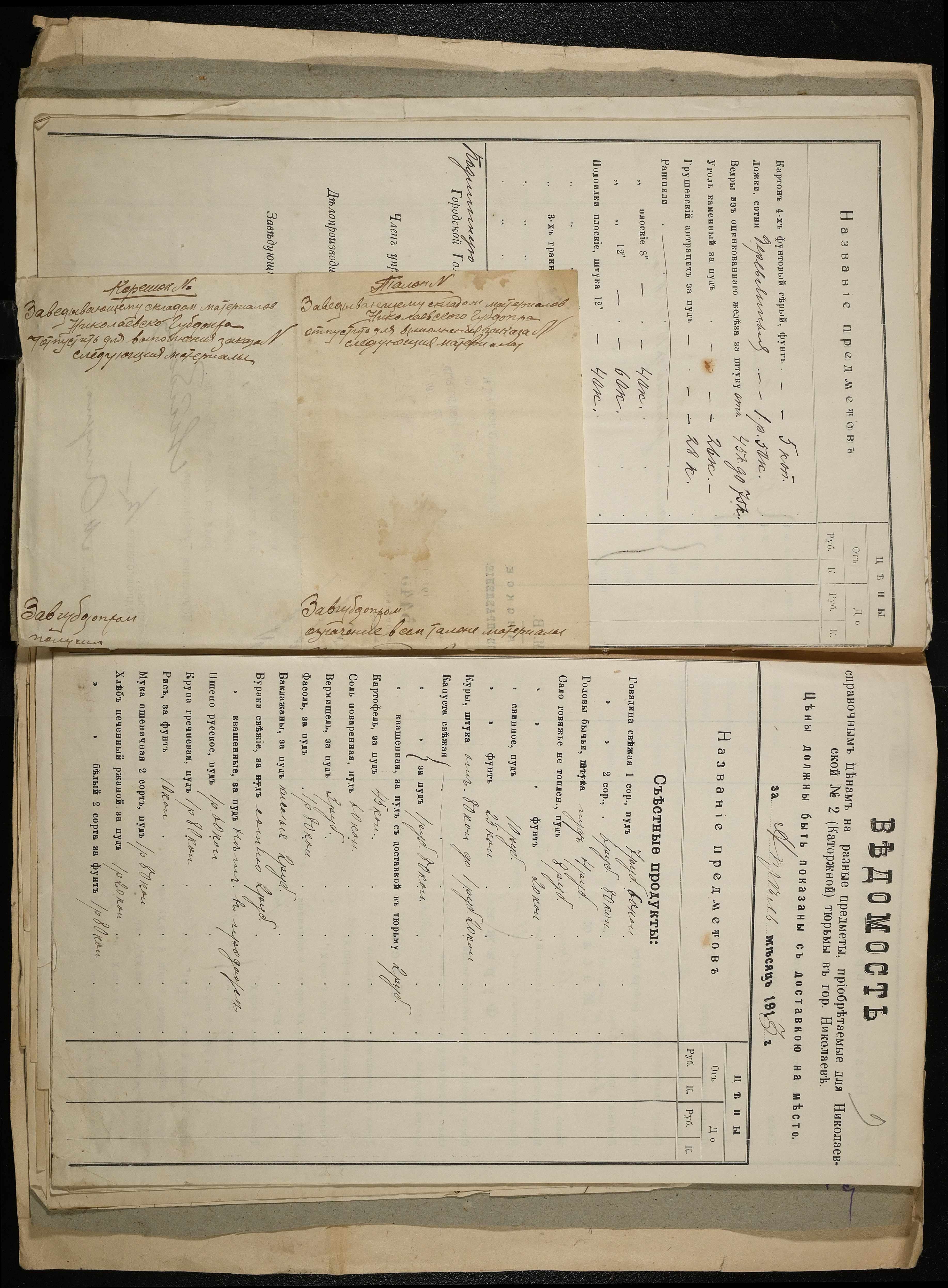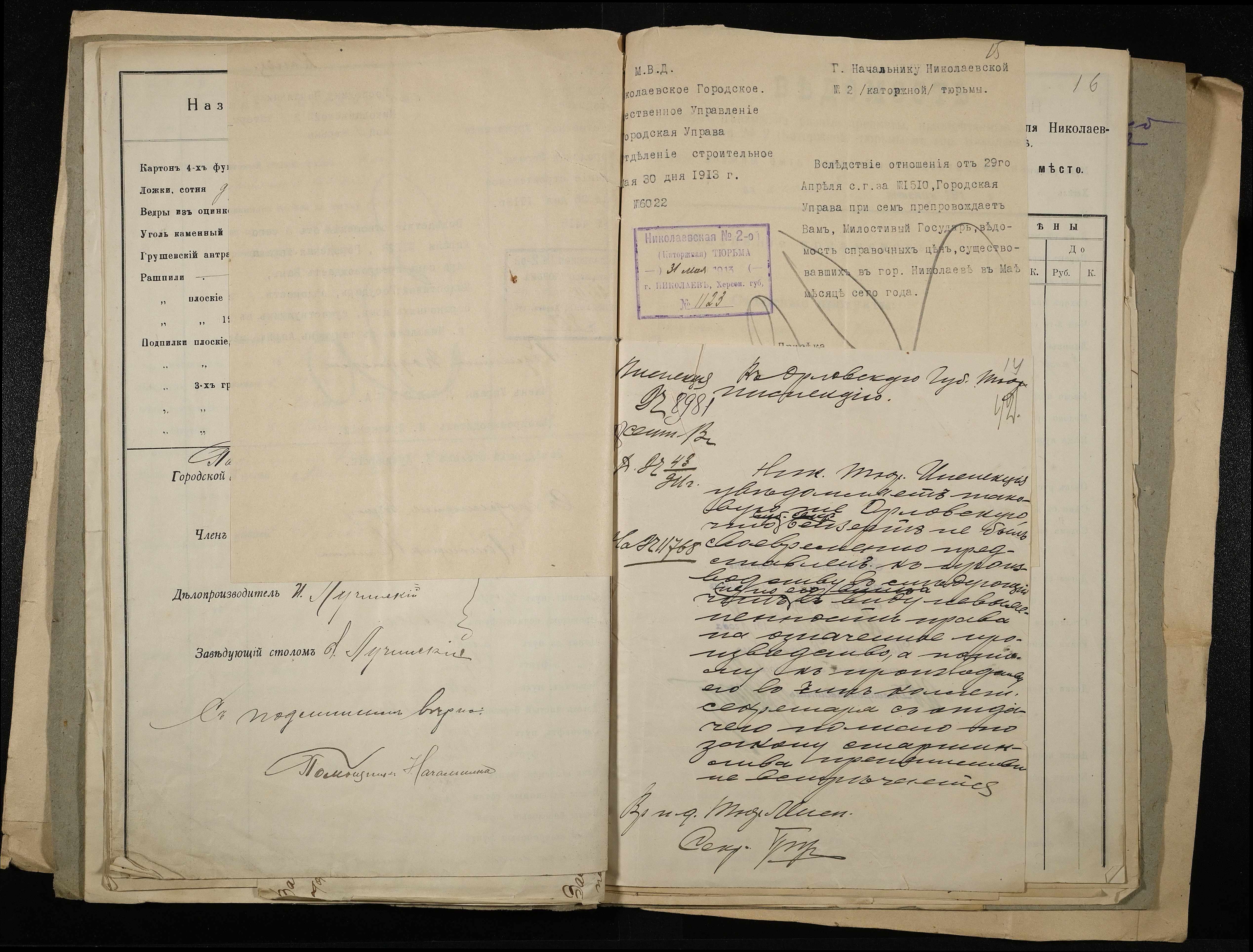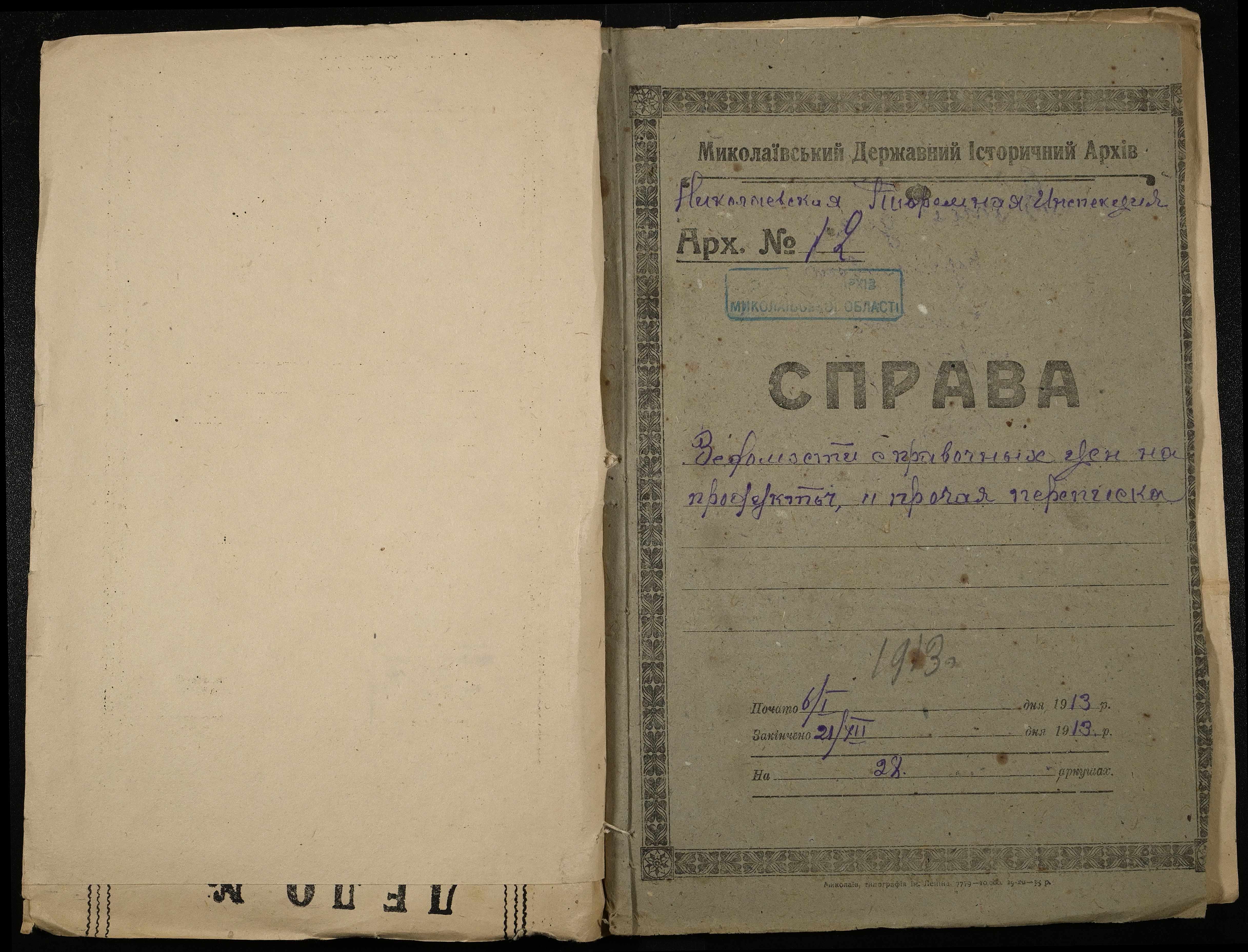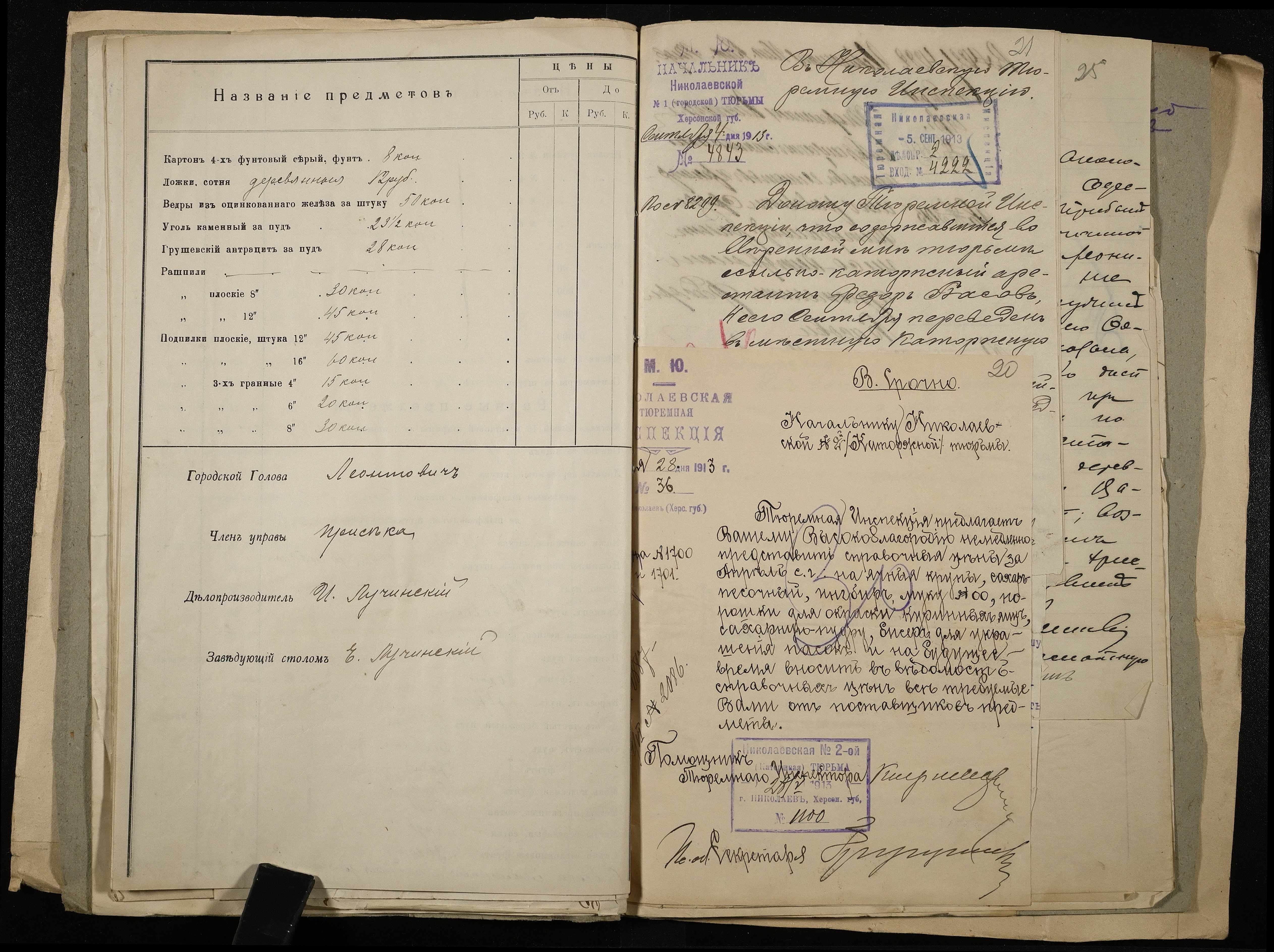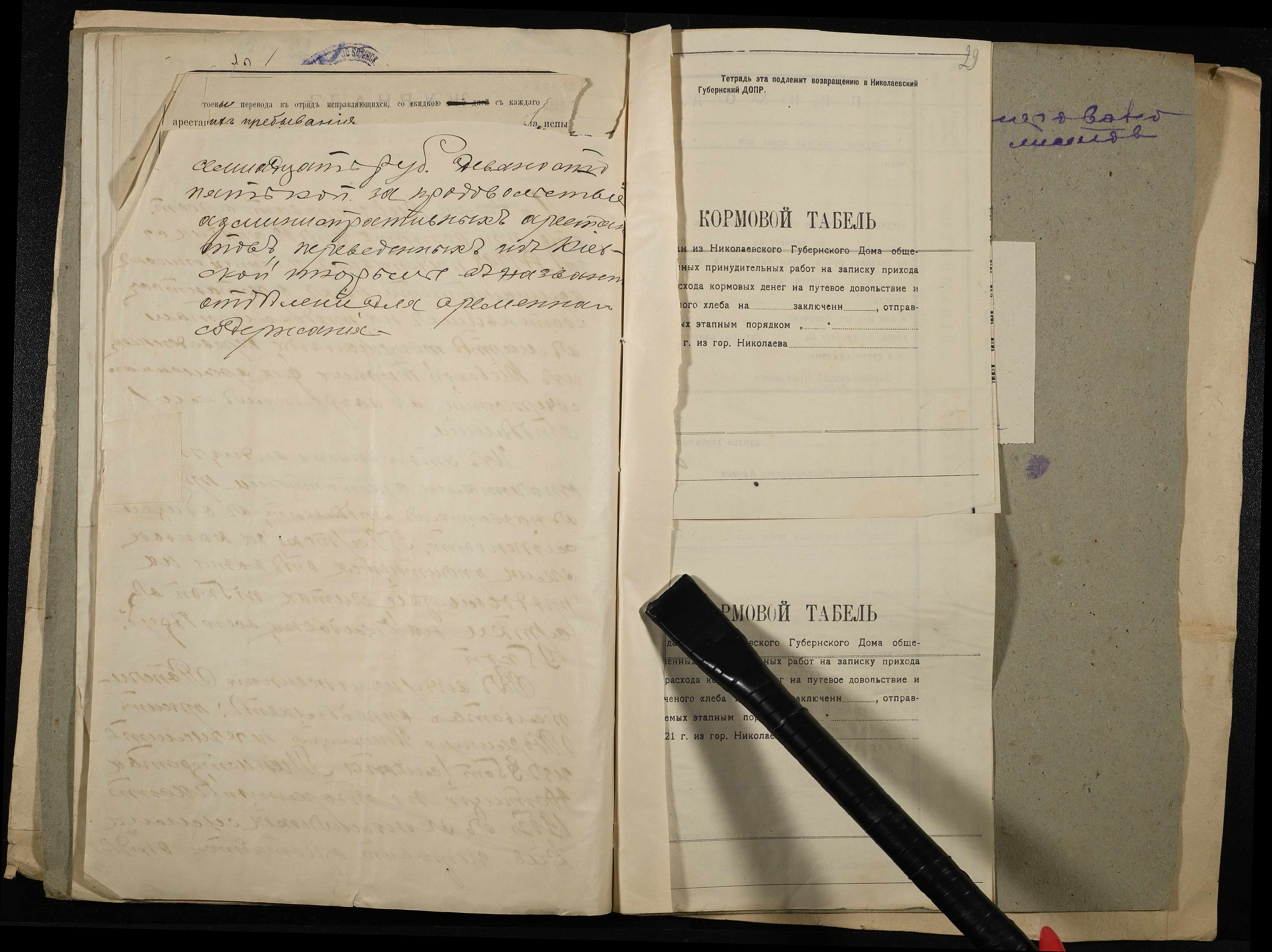 • • • • Справа № 11 Розрахункова книга та відомості довідкових цін щодо забезпечення висланців продуктами харчування, харчові табелі; листування з начальниками миколаївських тюрем про довідкові ціни на продукти харчування; з Херсонською духовною консисторією про розірвання шлюбу засудженого та ін.