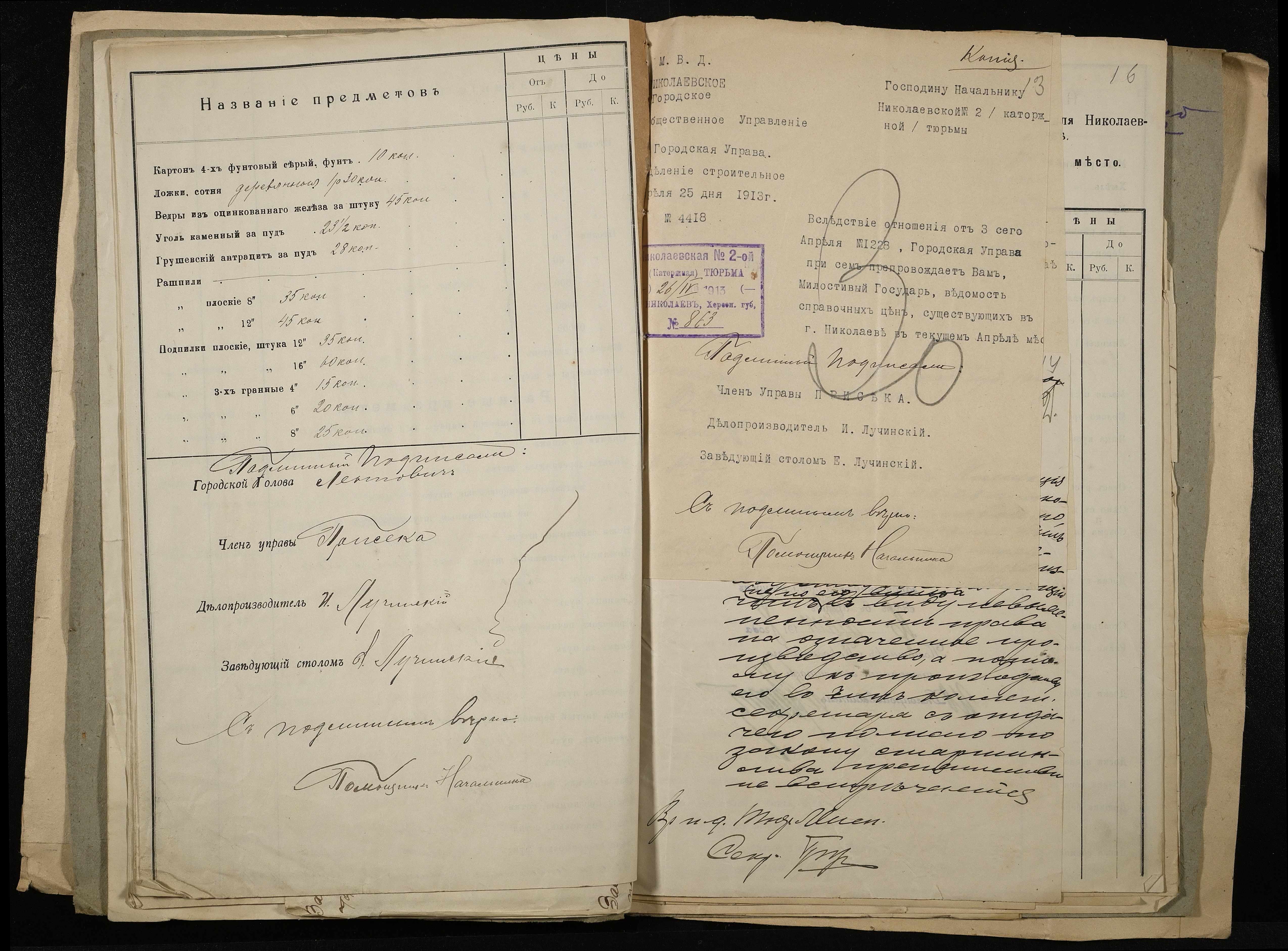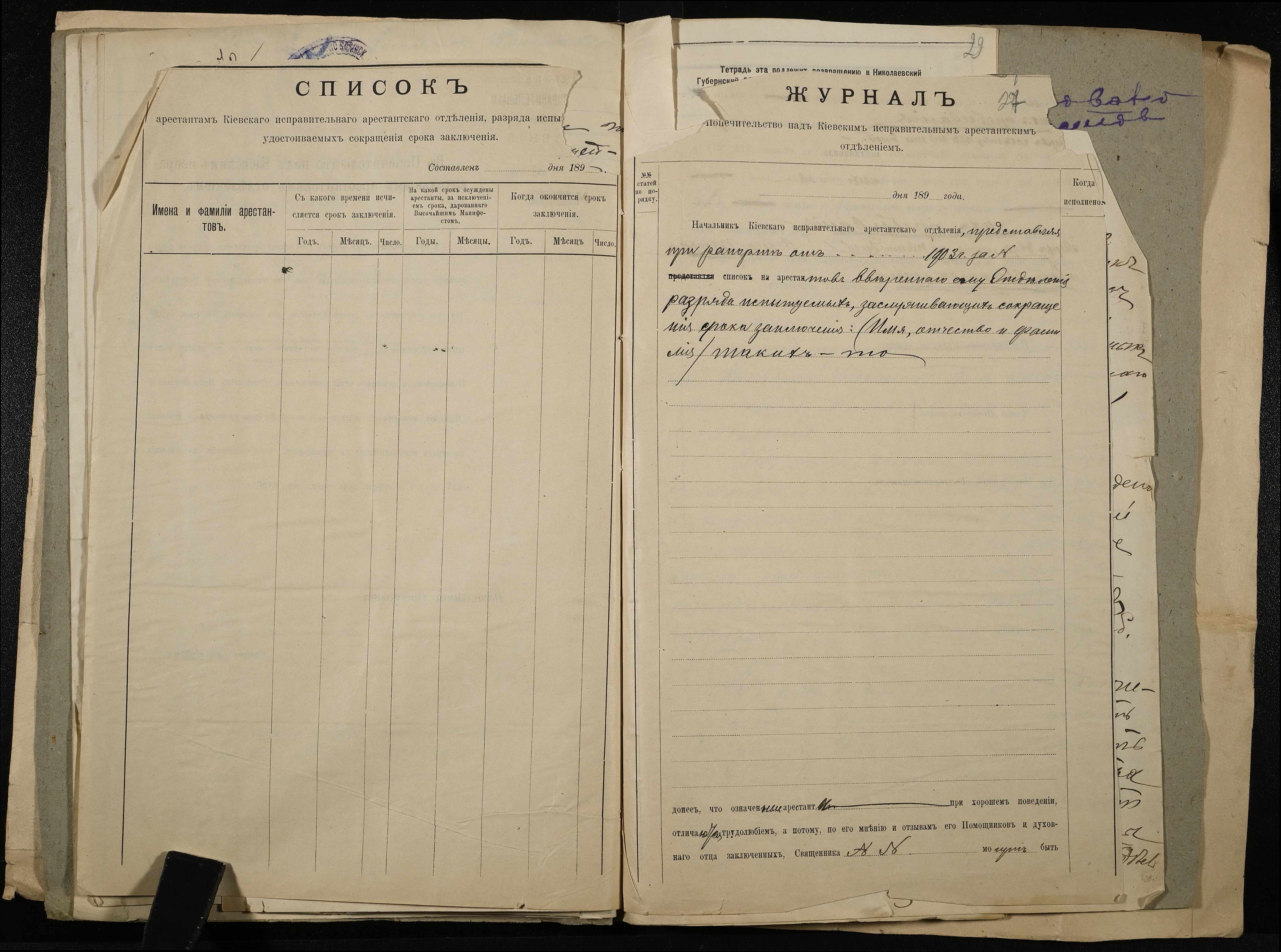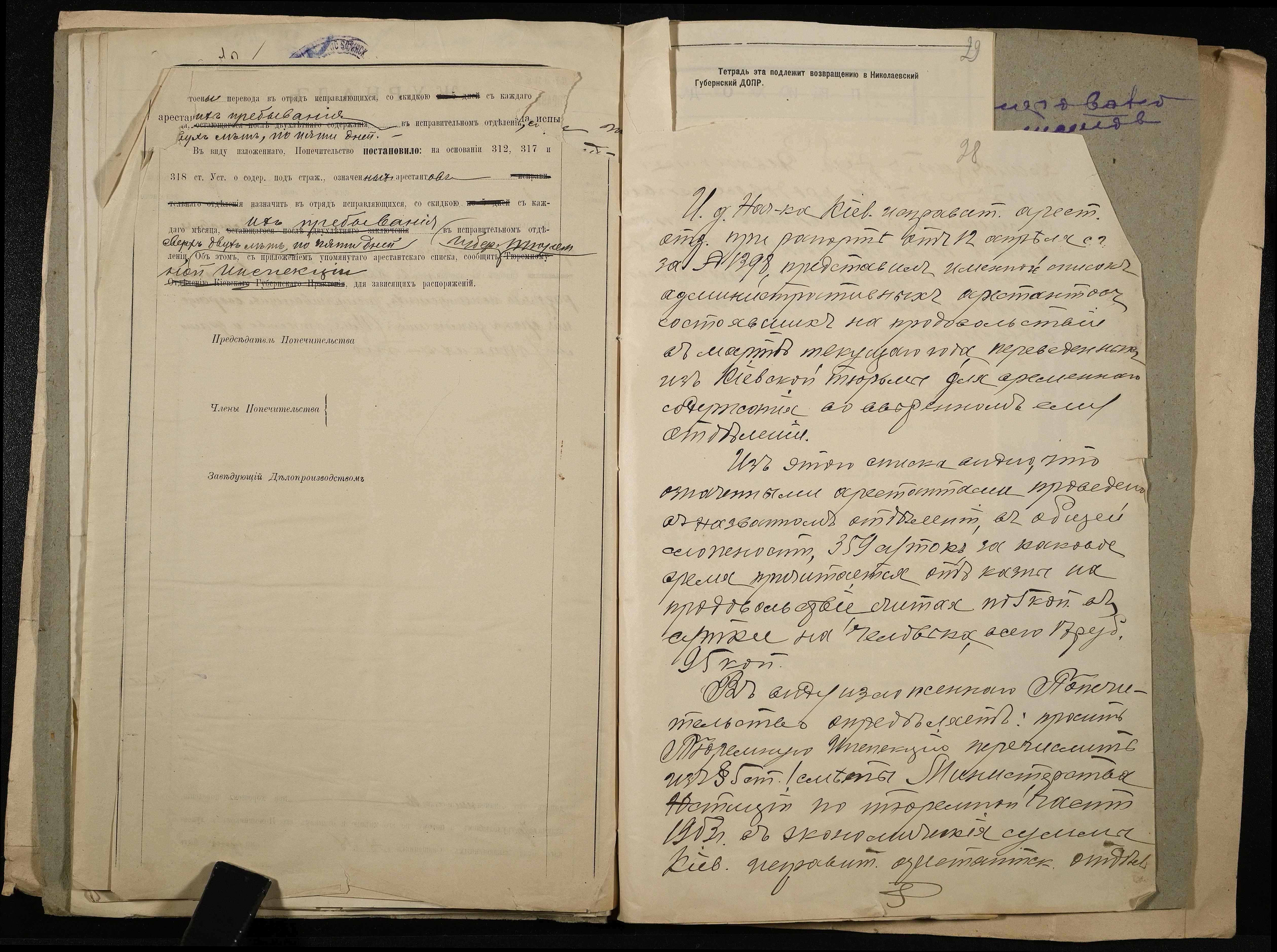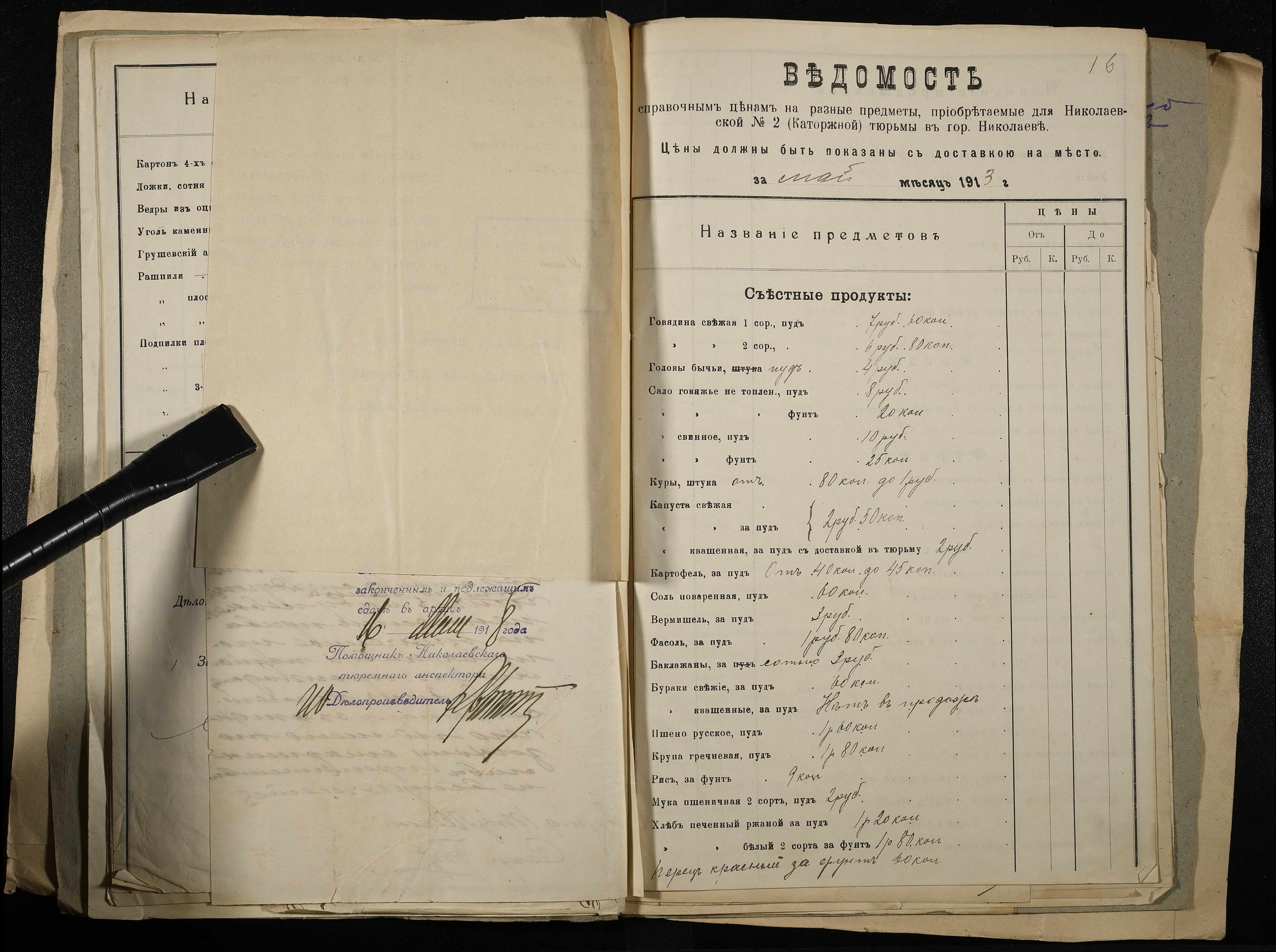 • • • • Справа № 11 Розрахункова книга та відомості довідкових цін щодо забезпечення висланців продуктами харчування, харчові табелі; листування з начальниками миколаївських тюрем про довідкові ціни на продукти харчування; з Херсонською духовною консисторією про розірвання шлюбу засудженого та ін.