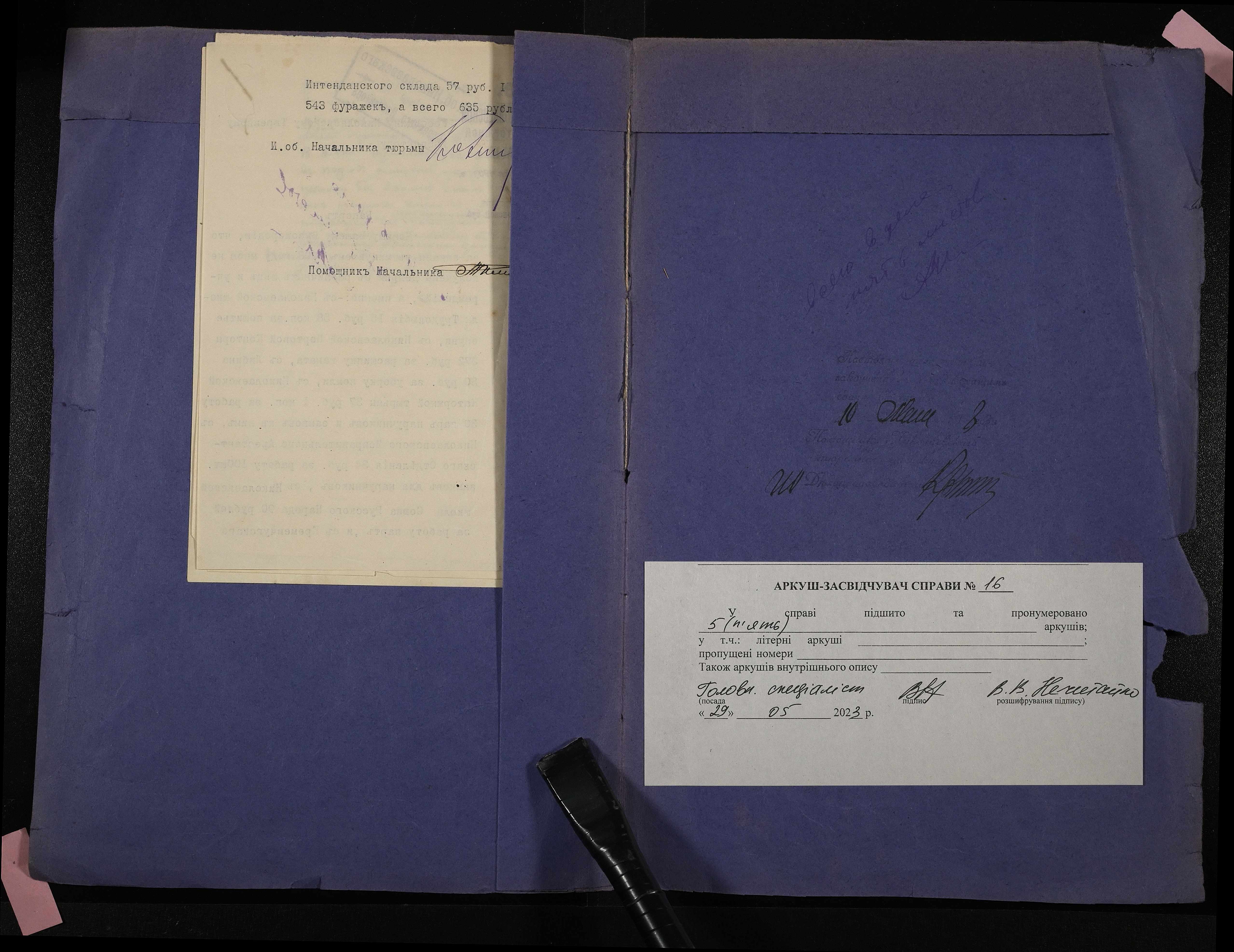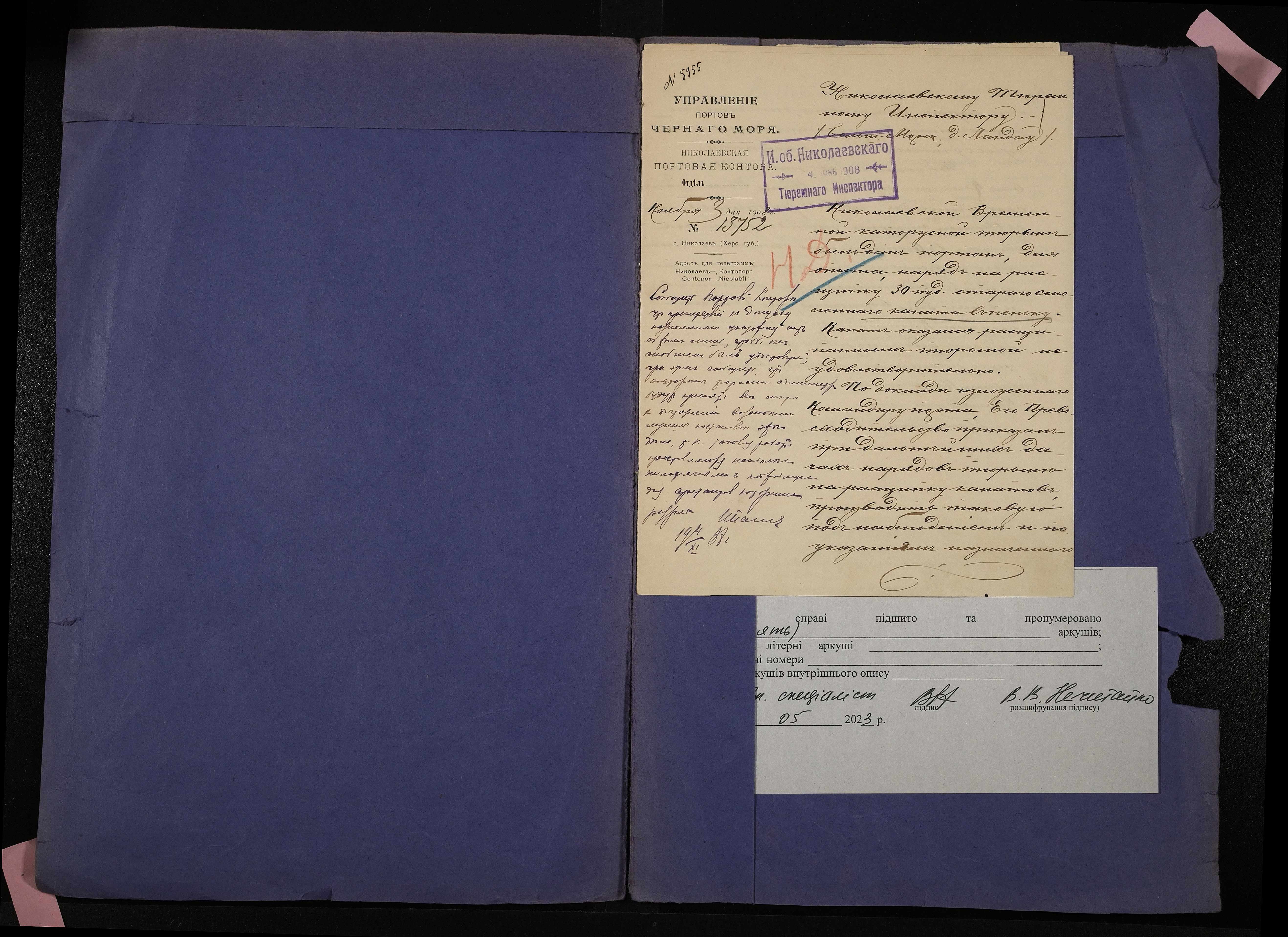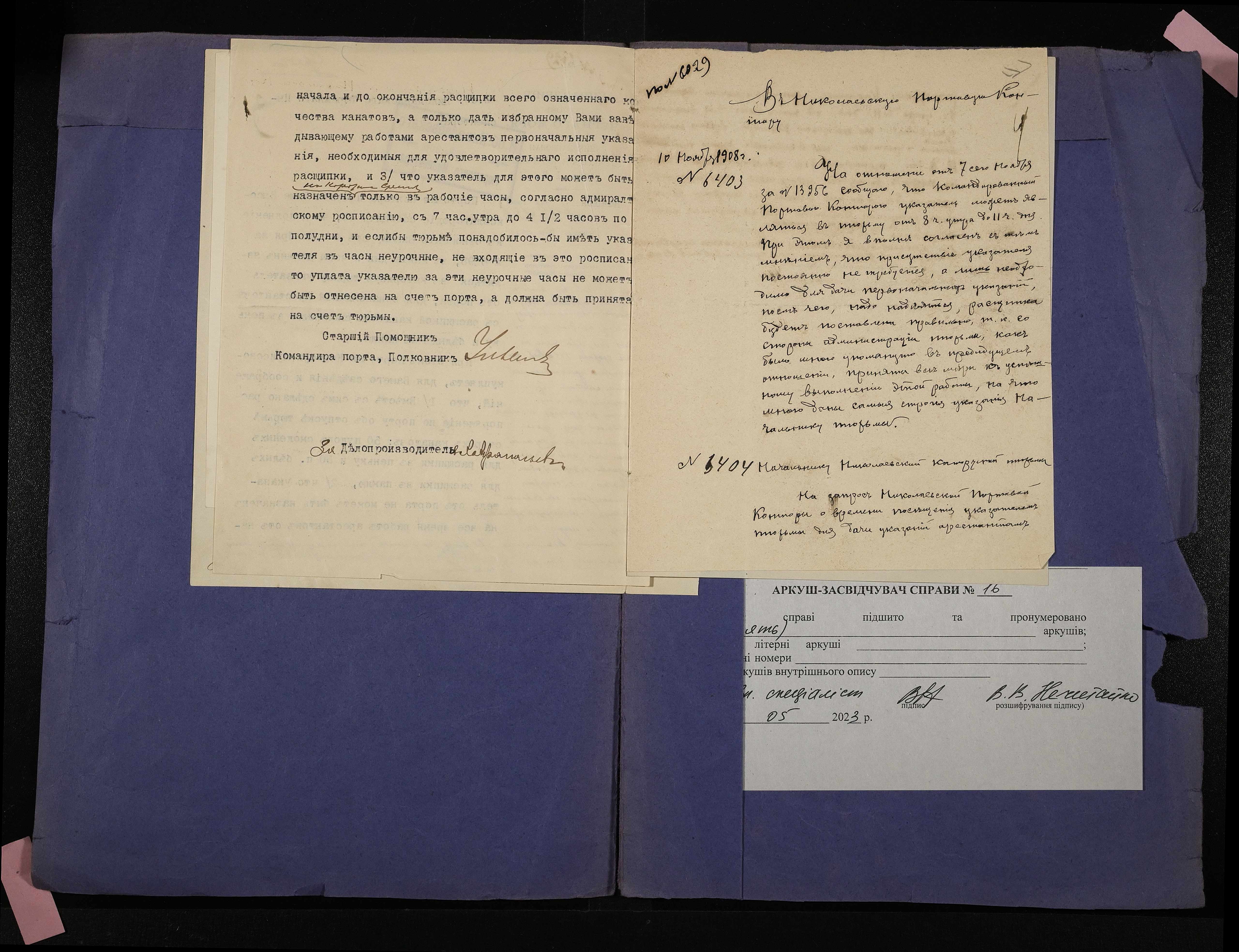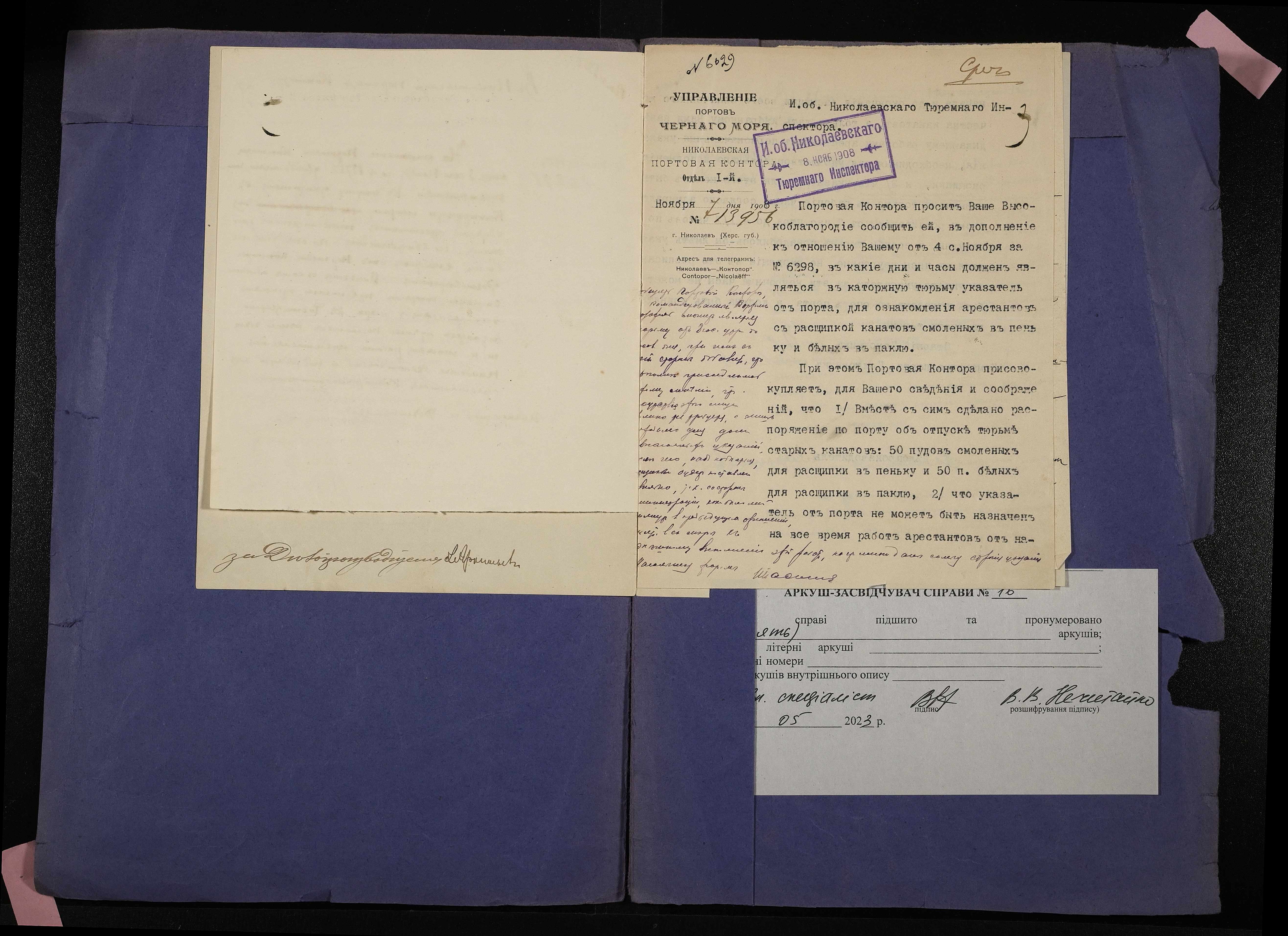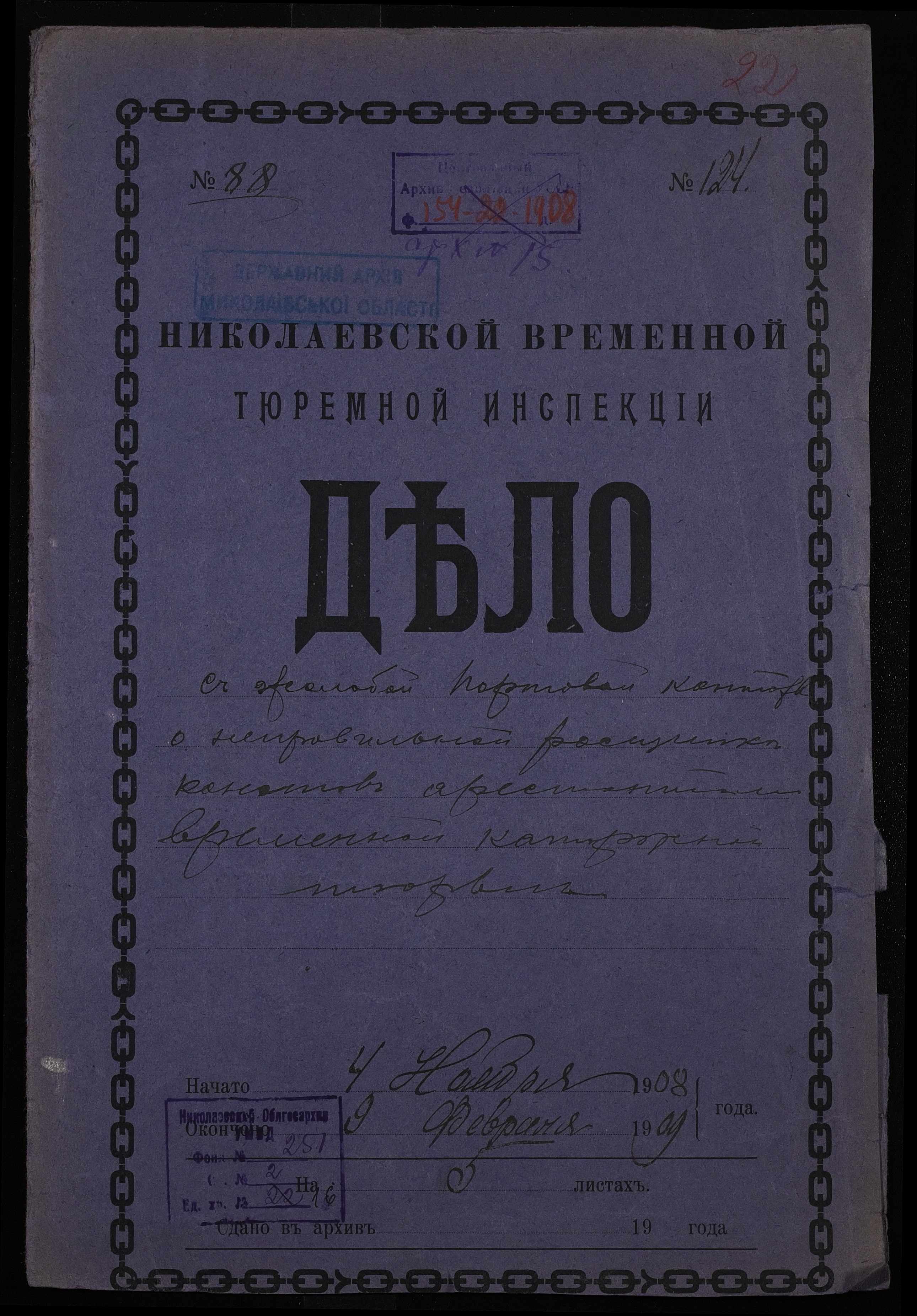 • • • • Справа № 16 Листування з Миколаївською портовою конторою про ознайомлення арештантів Миколаївської тимчасової каторжної тюрми з розщипкою канатів та навчання їх такелажним роботам; рапорт начальника тюрми про кошти, отримані у 1908 році з різних установ за виконані роботи