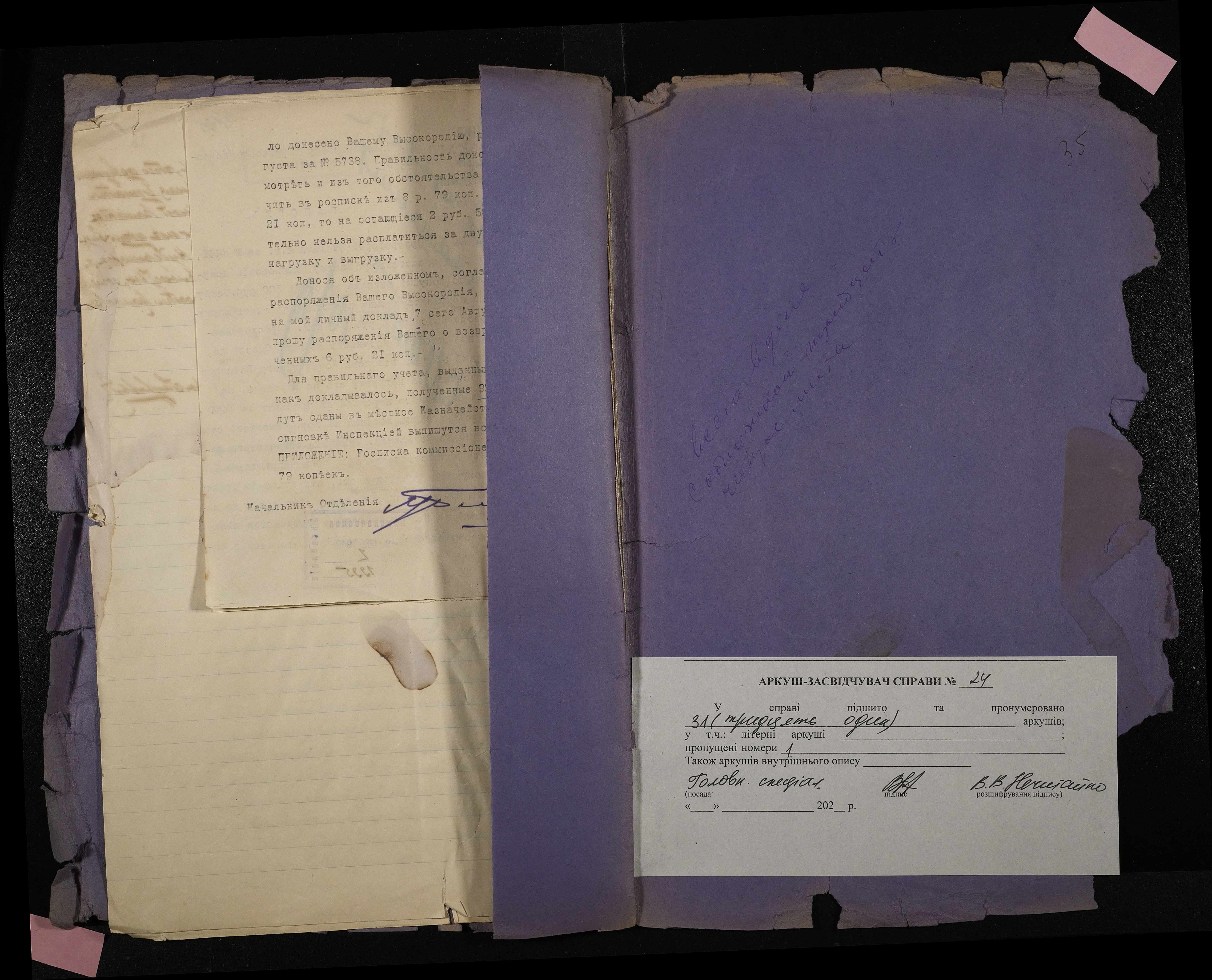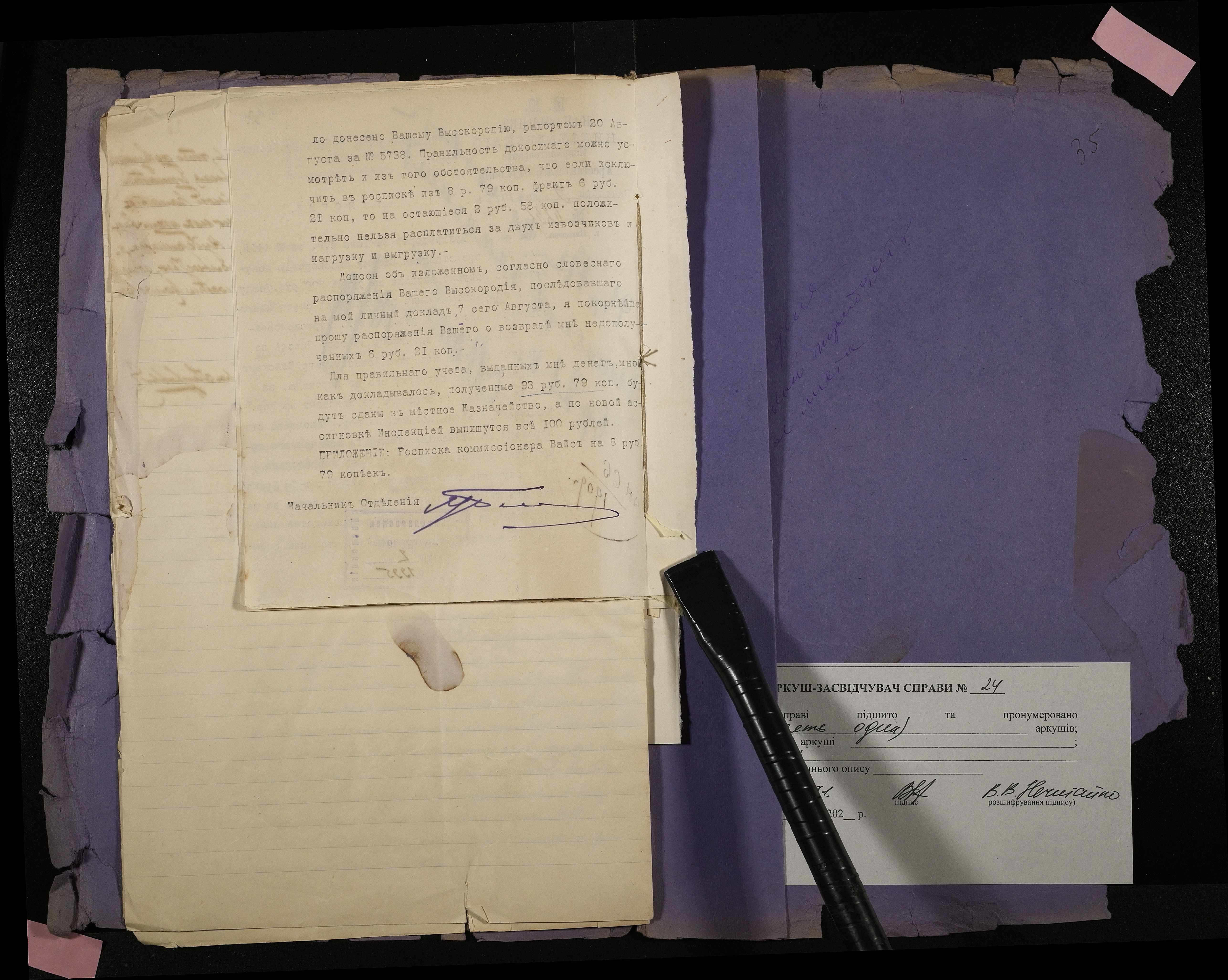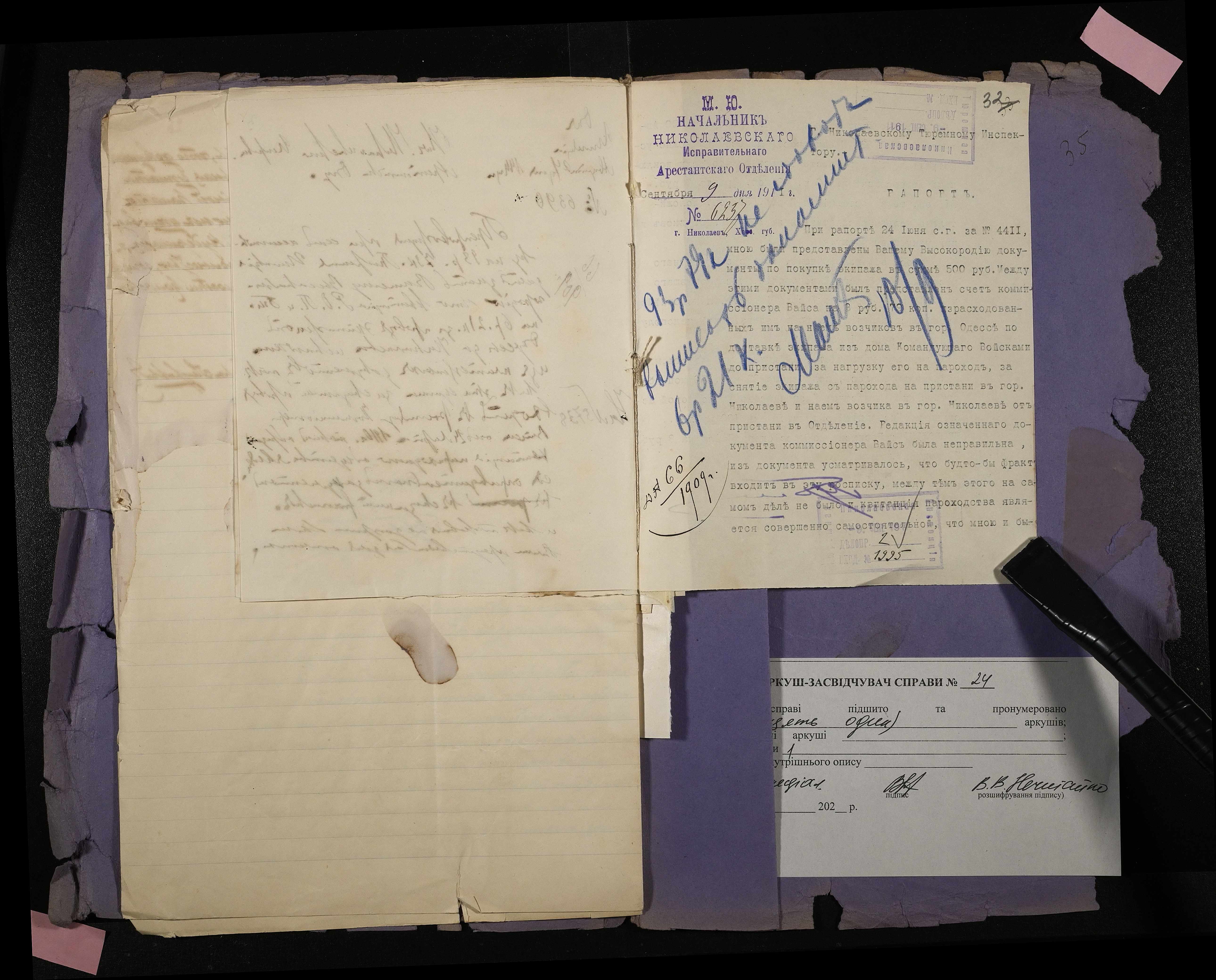 • • • • Справа № 24 Листування з Головним тюремним управлінням, начальником Миколаївського виправного арештантського відділення про виділення коштів на придбання екіпажу начальнику відділення для поїздок у справах; рапорт про використані кошти, рахунок