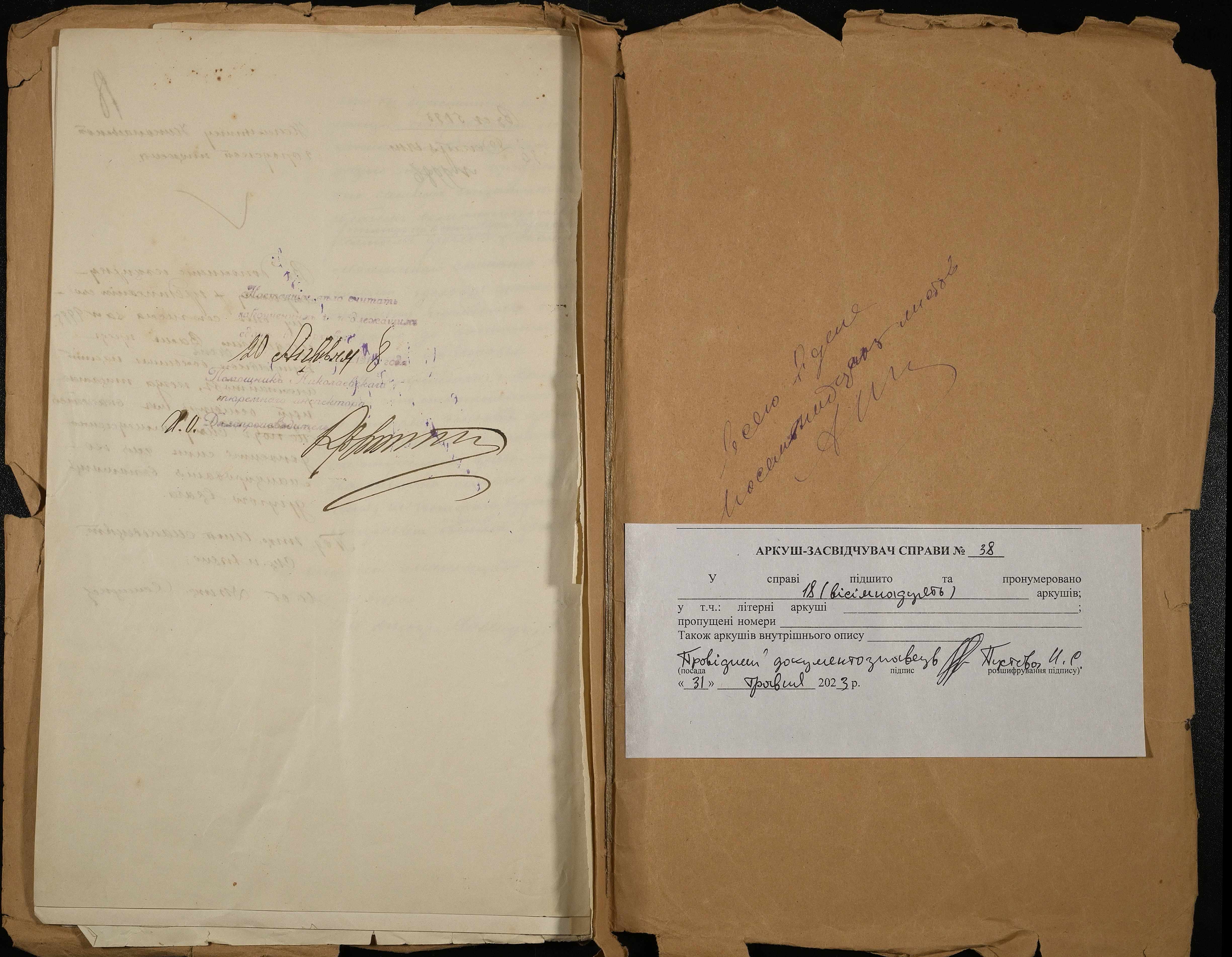 • • • • Справа № 38 Обіжники Головного тюремного управління, листування з начальником Миколаївського виправного арештантського відділення про недоцільність переведення арештантів, засуджених на короткі строки ув’язнення, заборону переведення хворих арештантів, неприпустимі випадки утримання військових арештантів разом з арештантами цивільного відомства та кримінальними елементами; про недоліки і порушення щодо обліку арештантських коштів та ін.