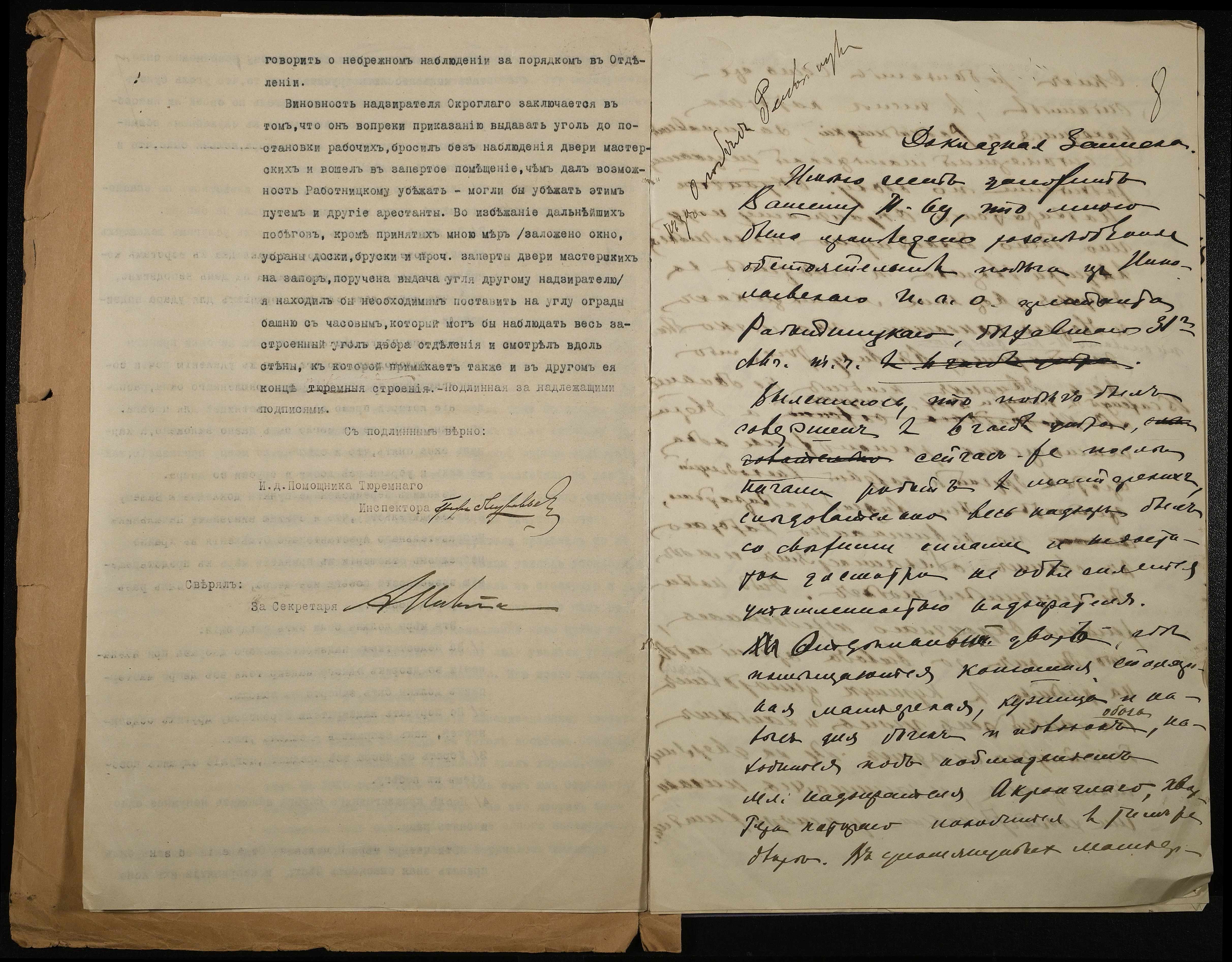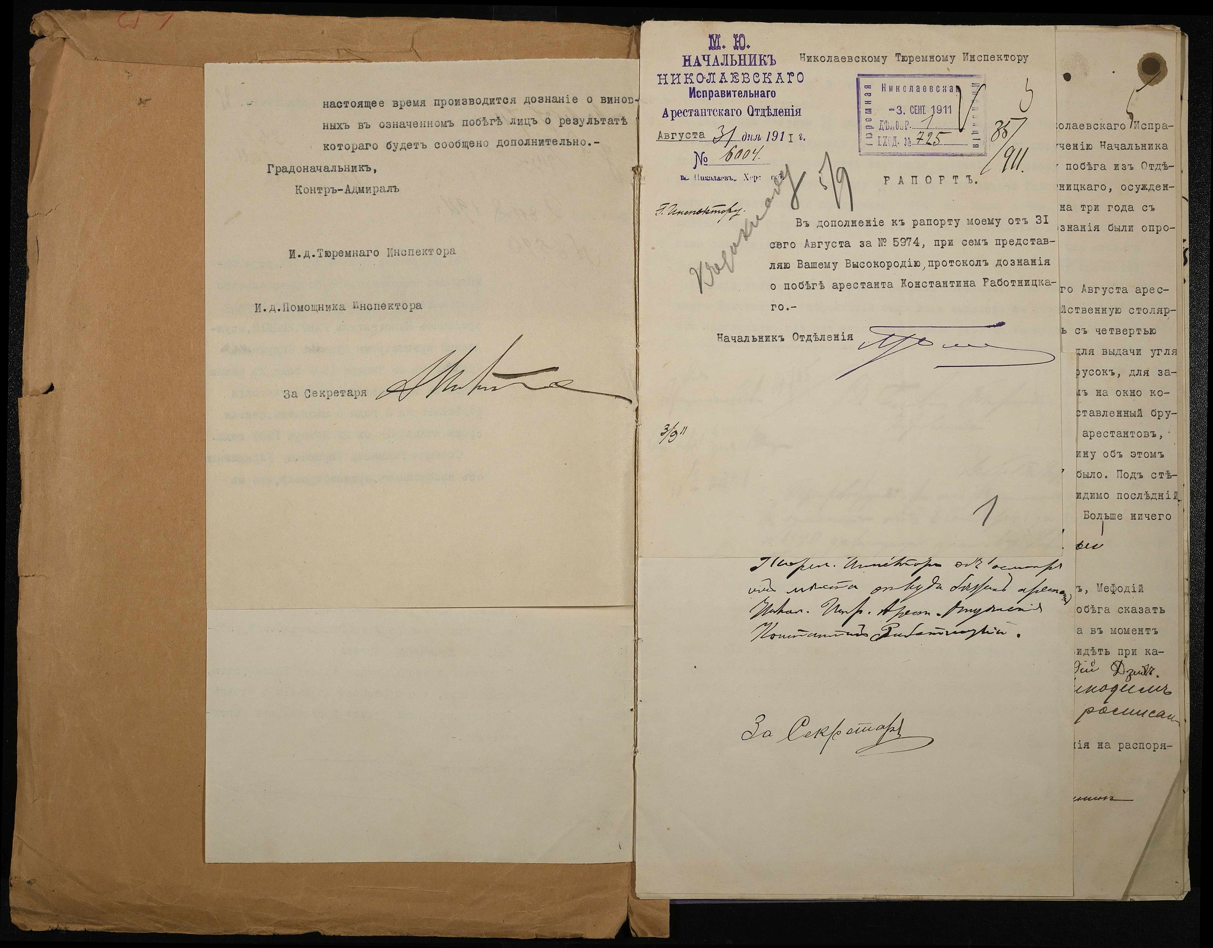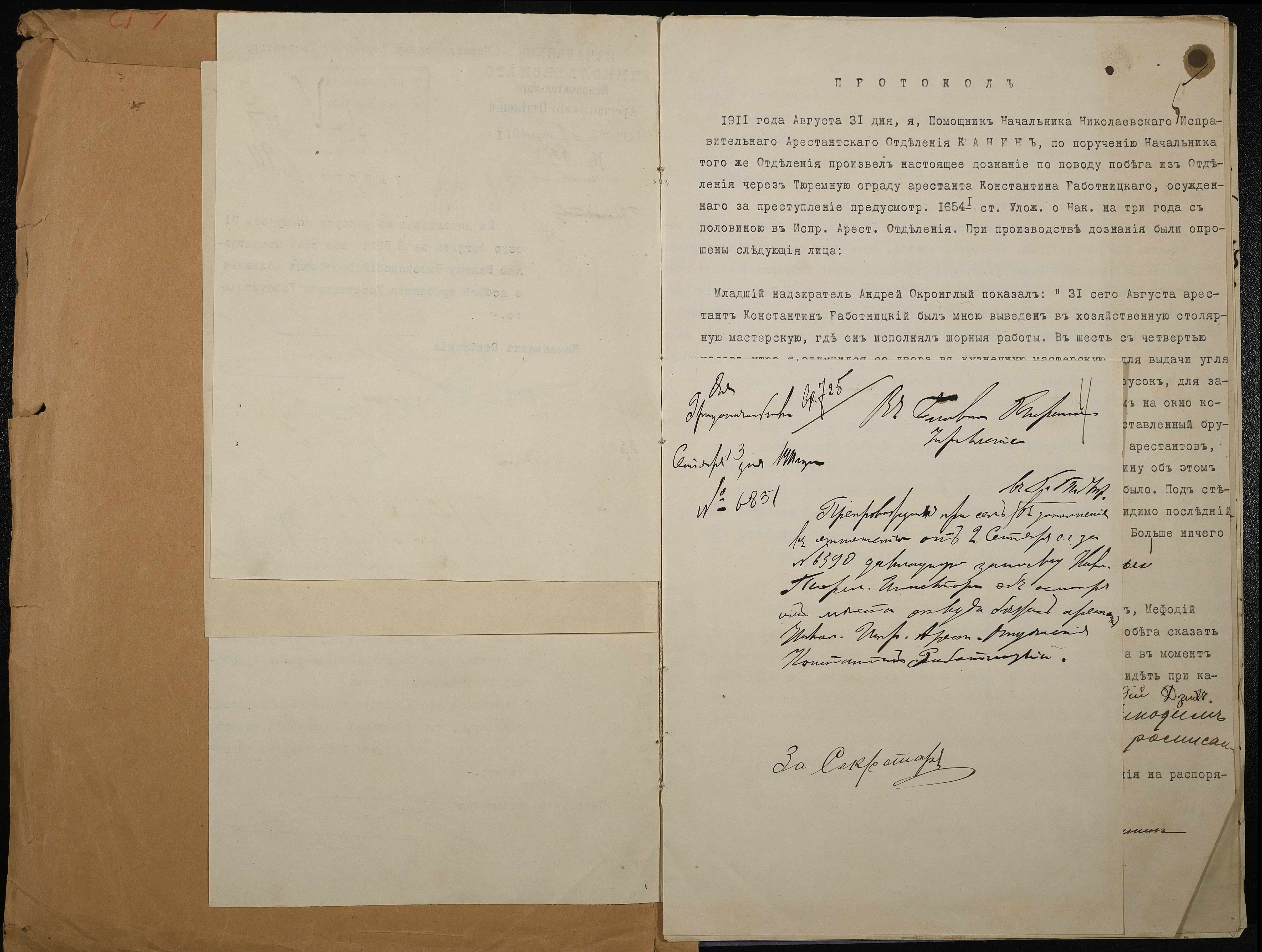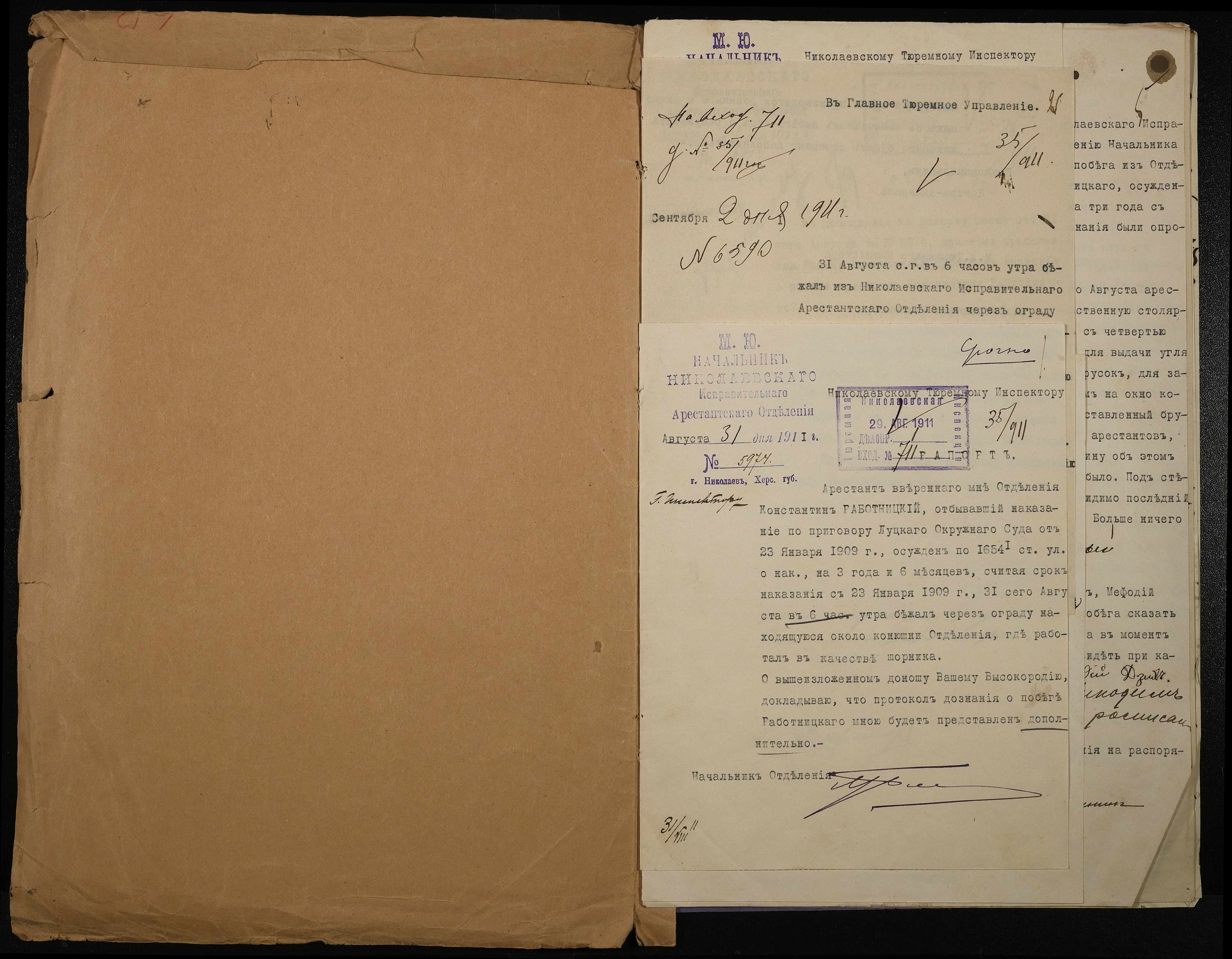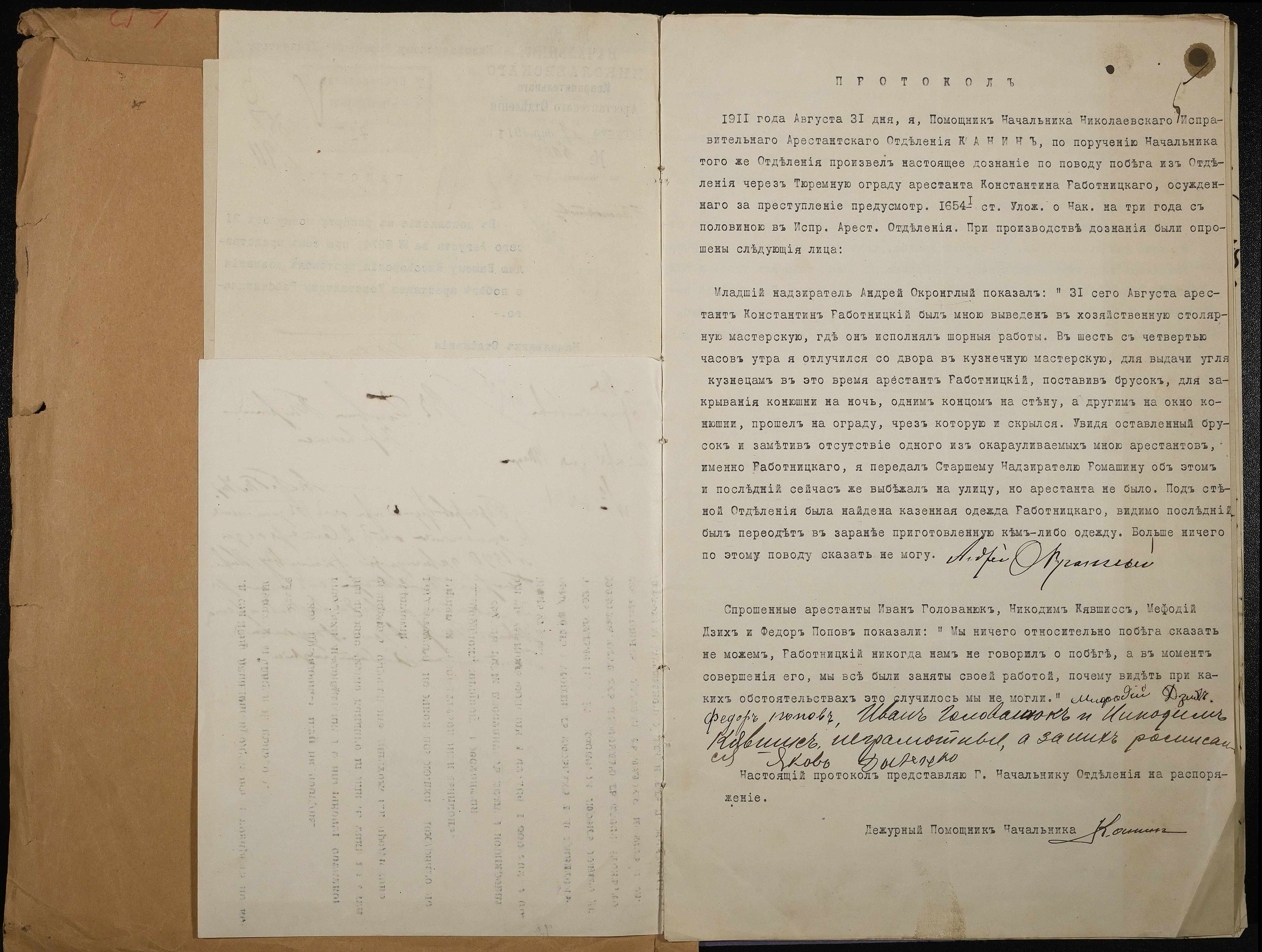 • • • • Справа № 55 Документи про утечу із Миколаївського виправного арештантського відділення арештанта Работницького Костянтина (протокол, рапорти, доповідна записка)