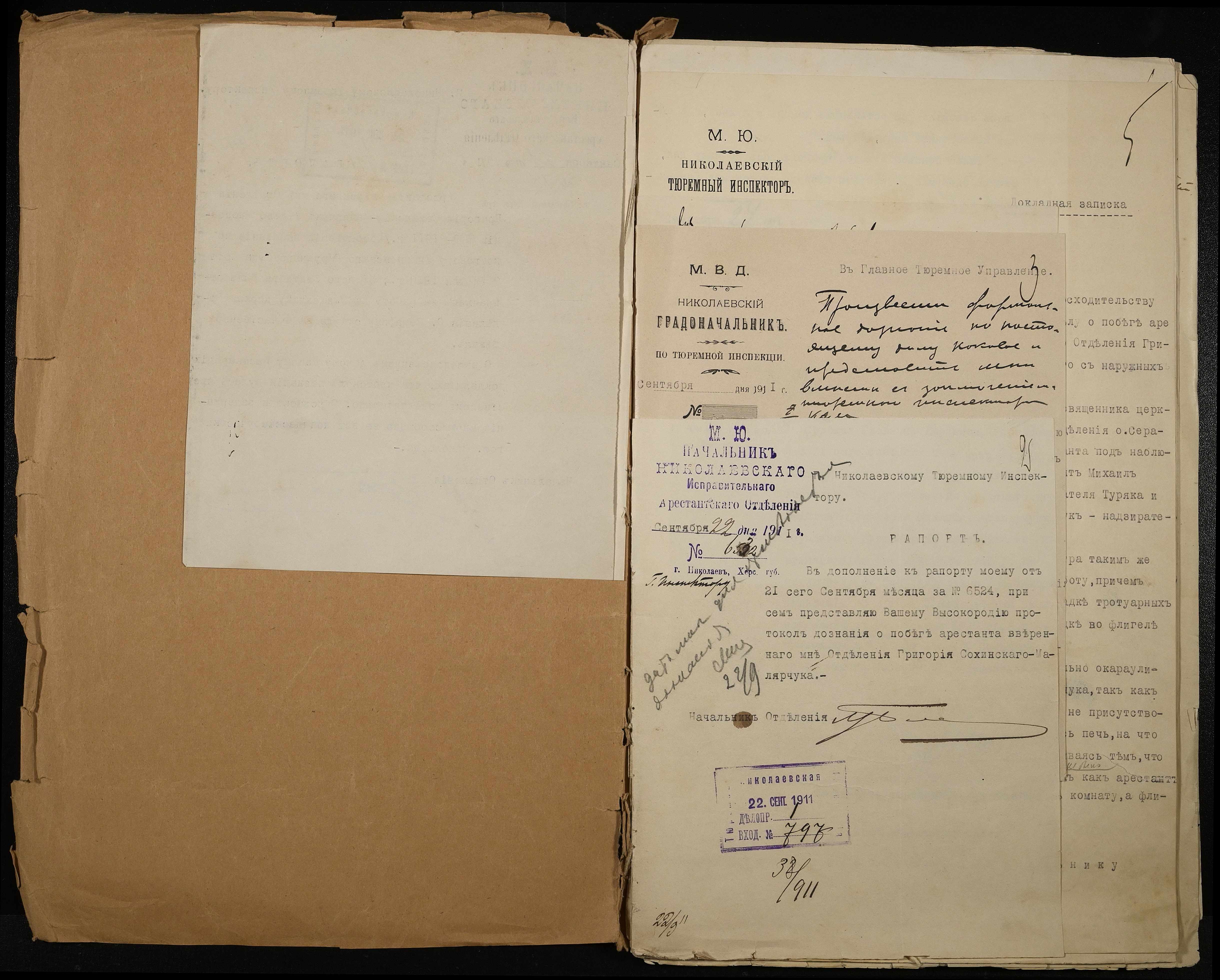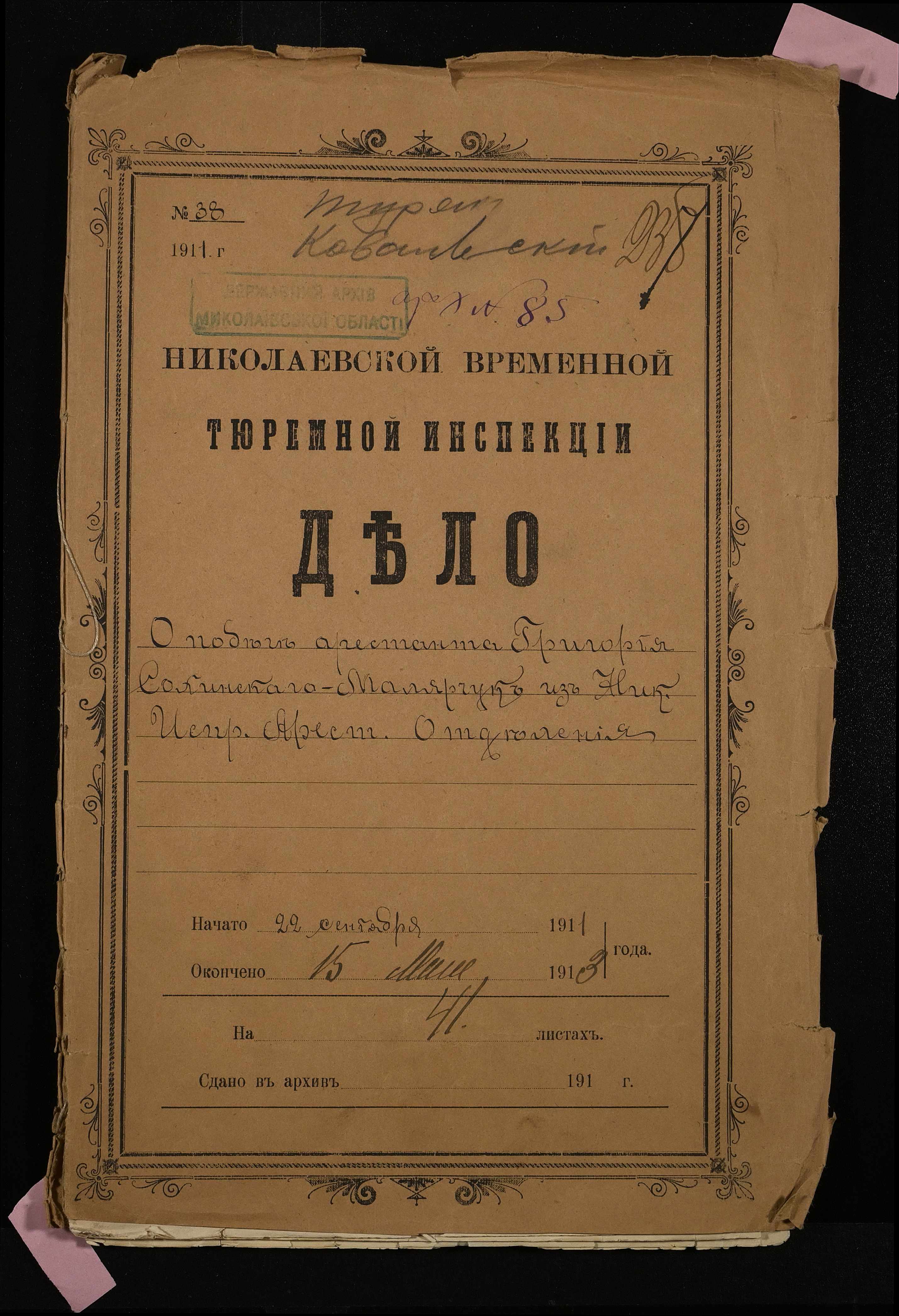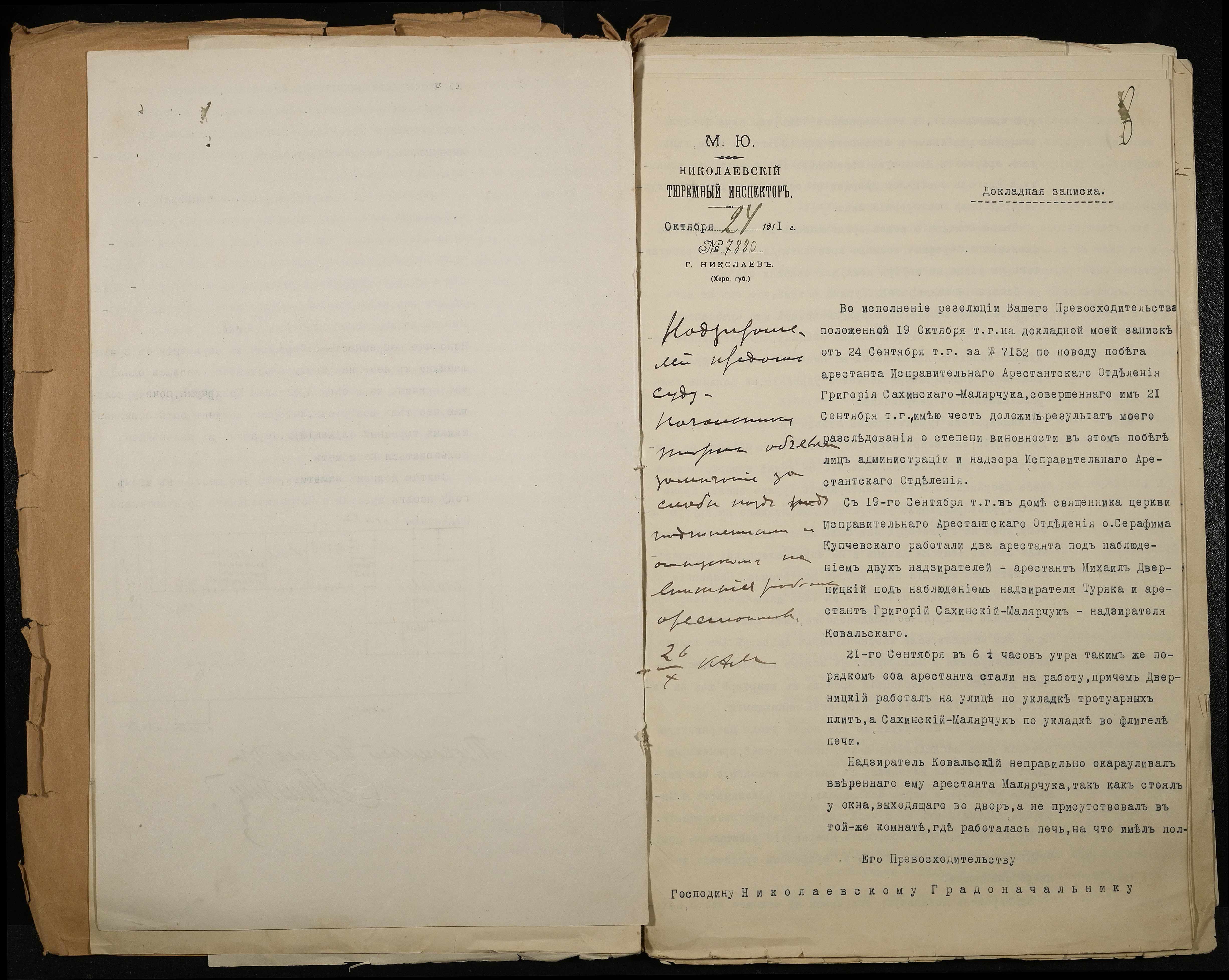 • • • • Справа № 58 Документи про утечу із Миколаївського виправного арештантського відділення арештанта Сохінського-Малярчука Григорія (рапорти, доповідні записки, опитування, листування)