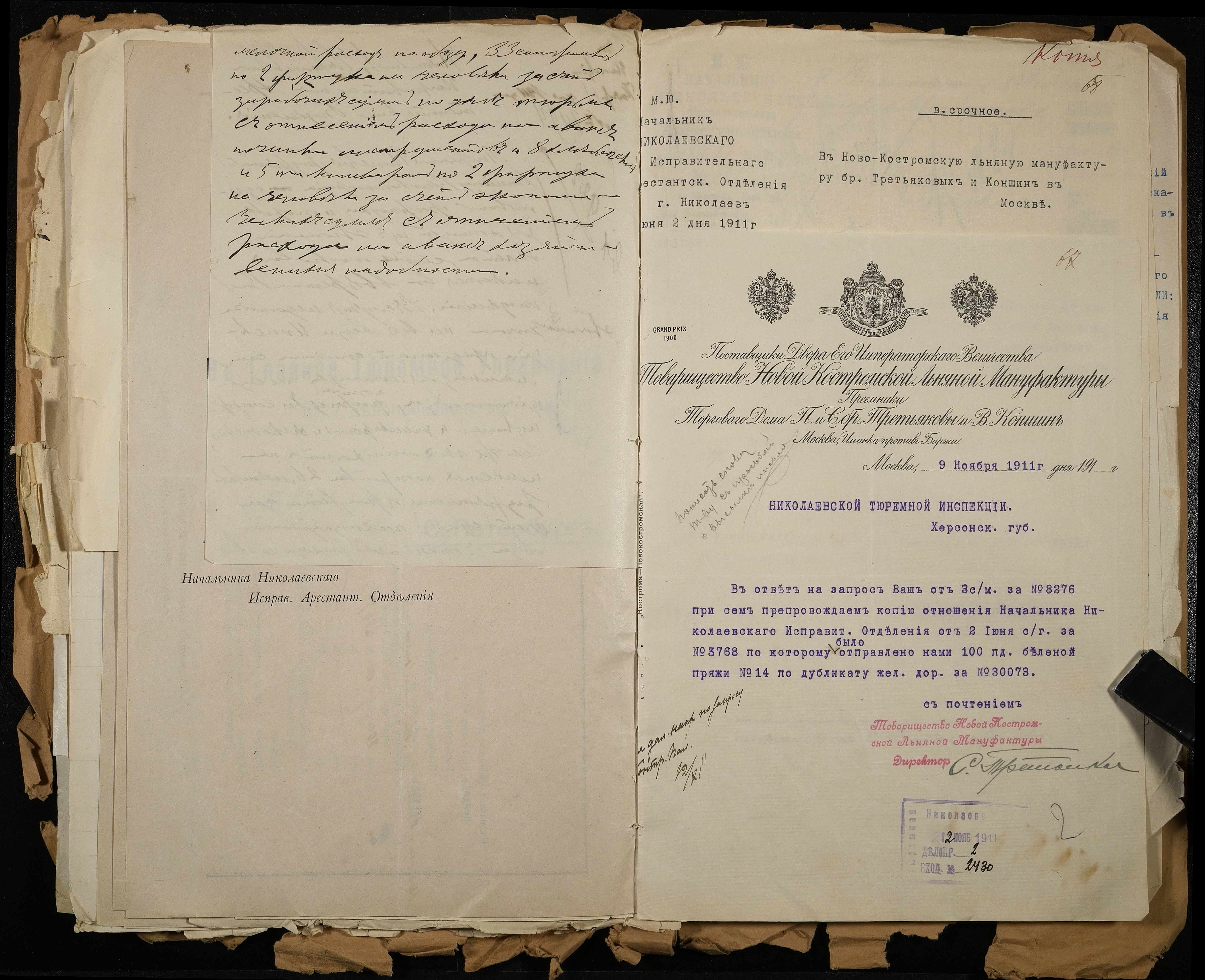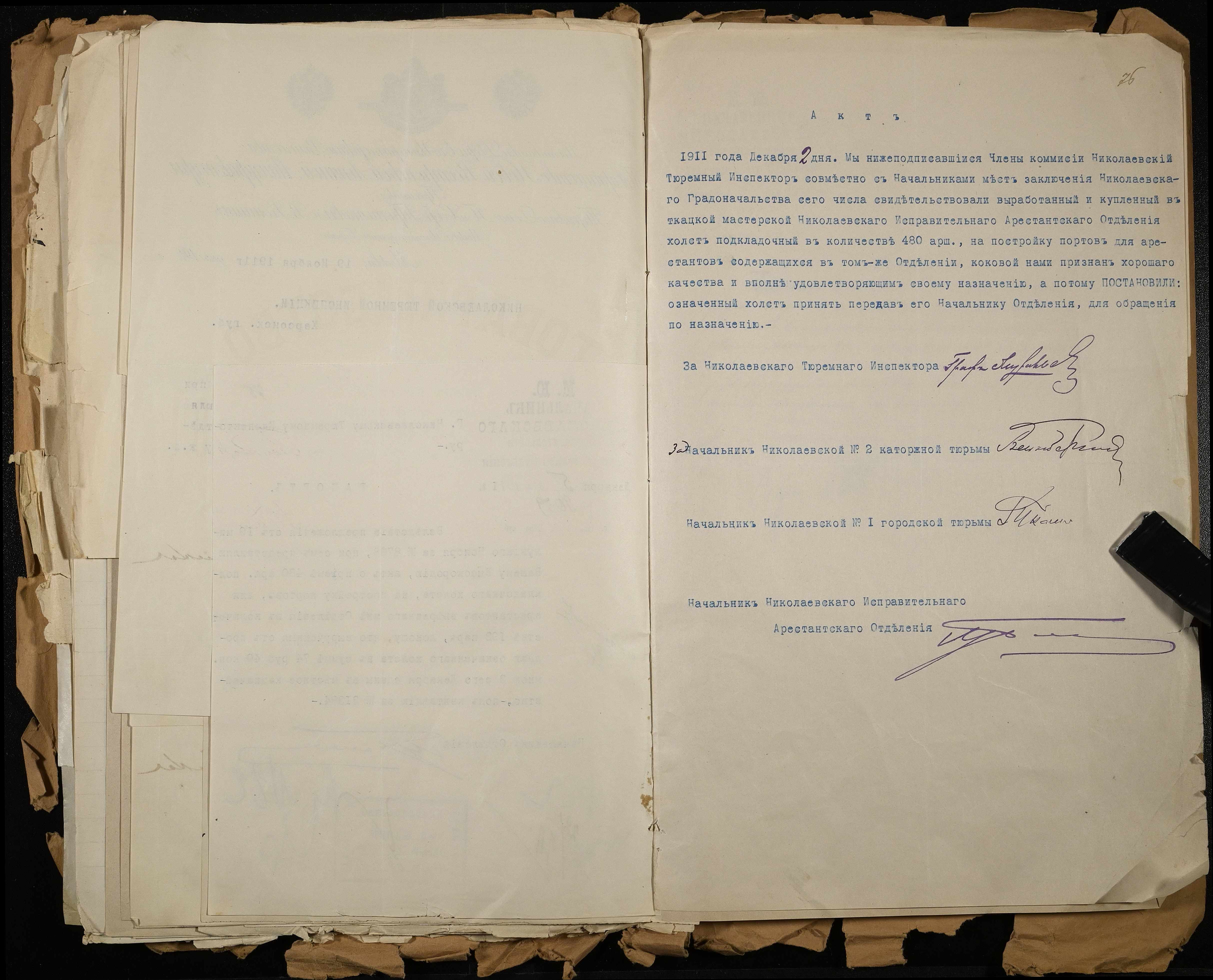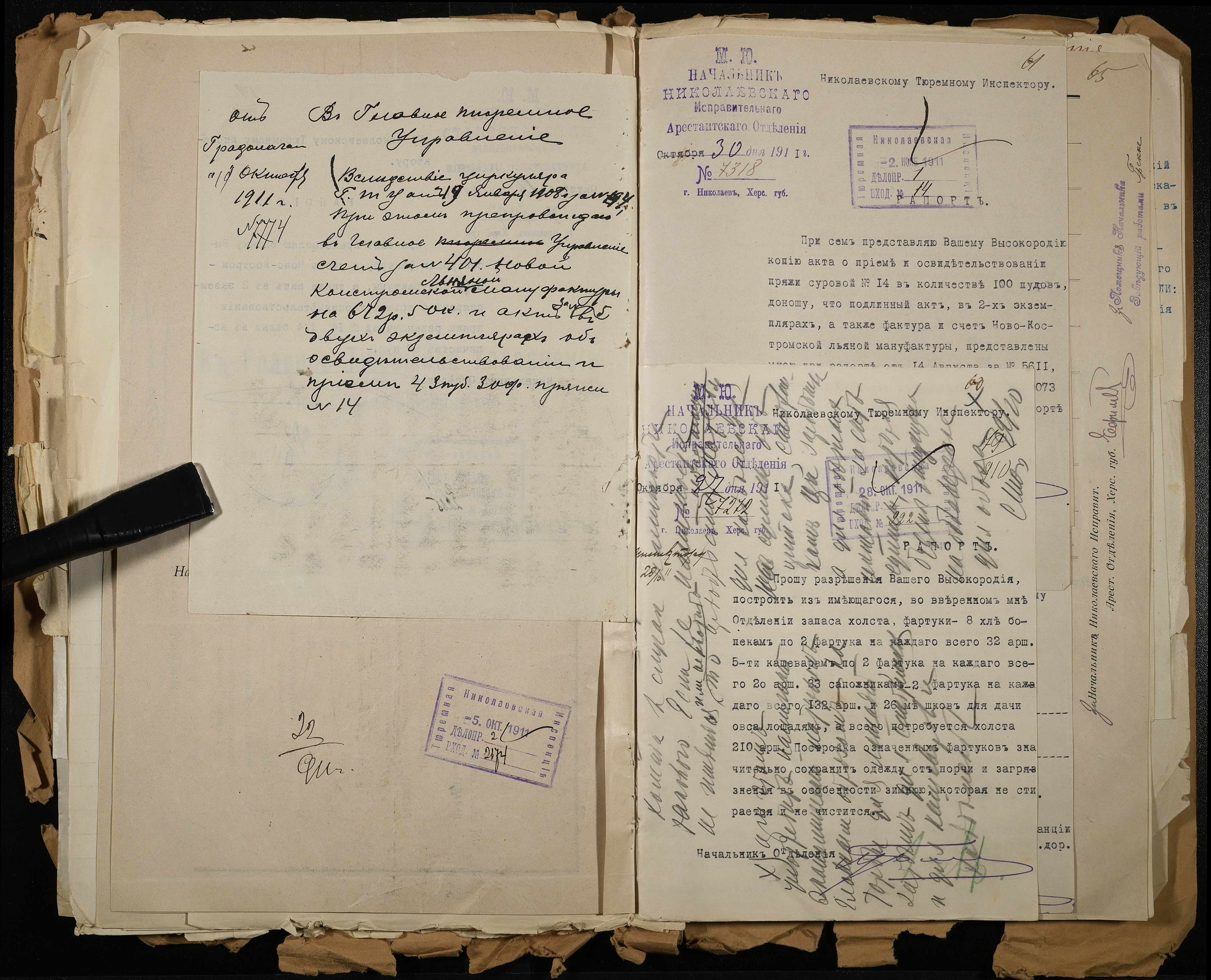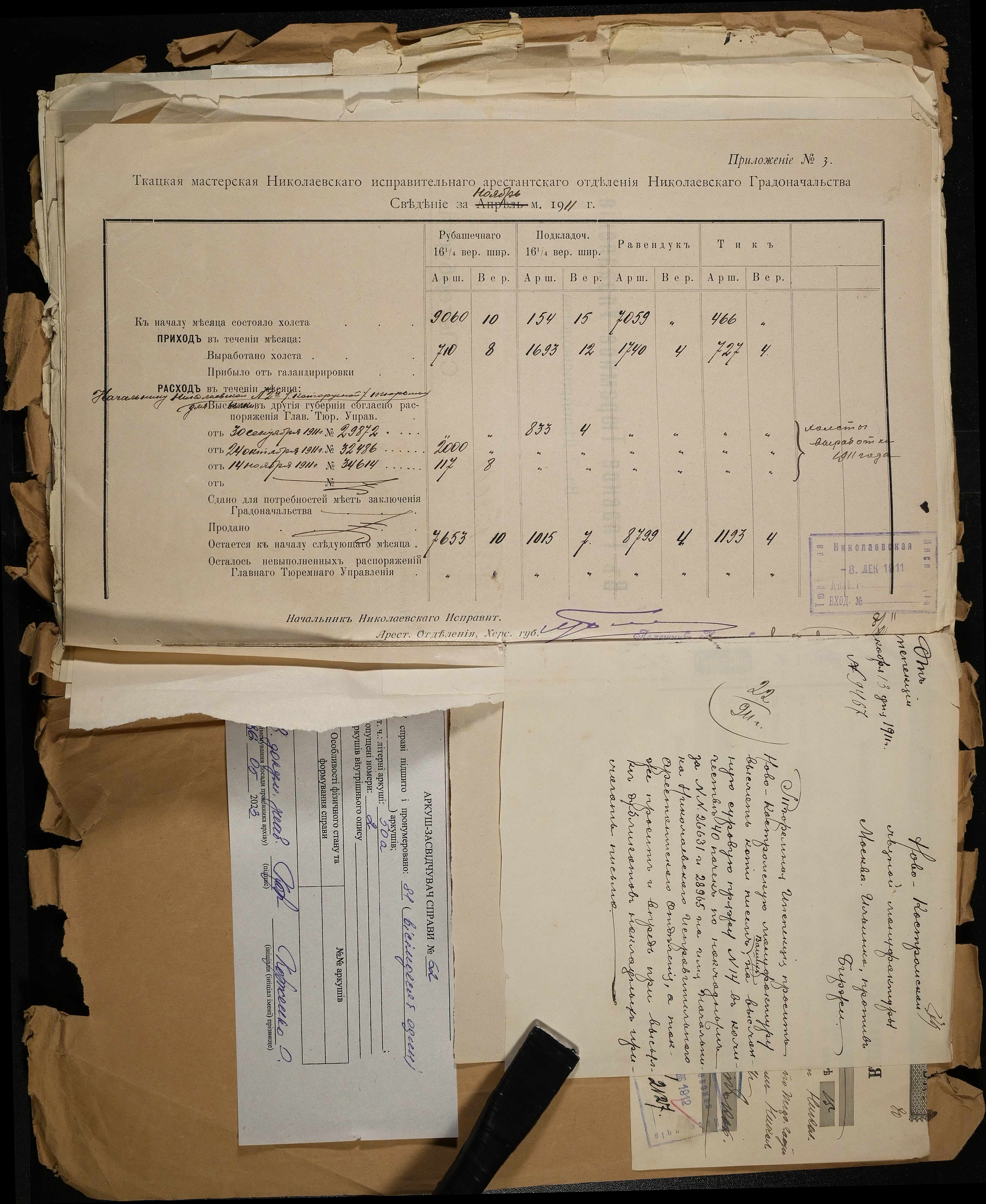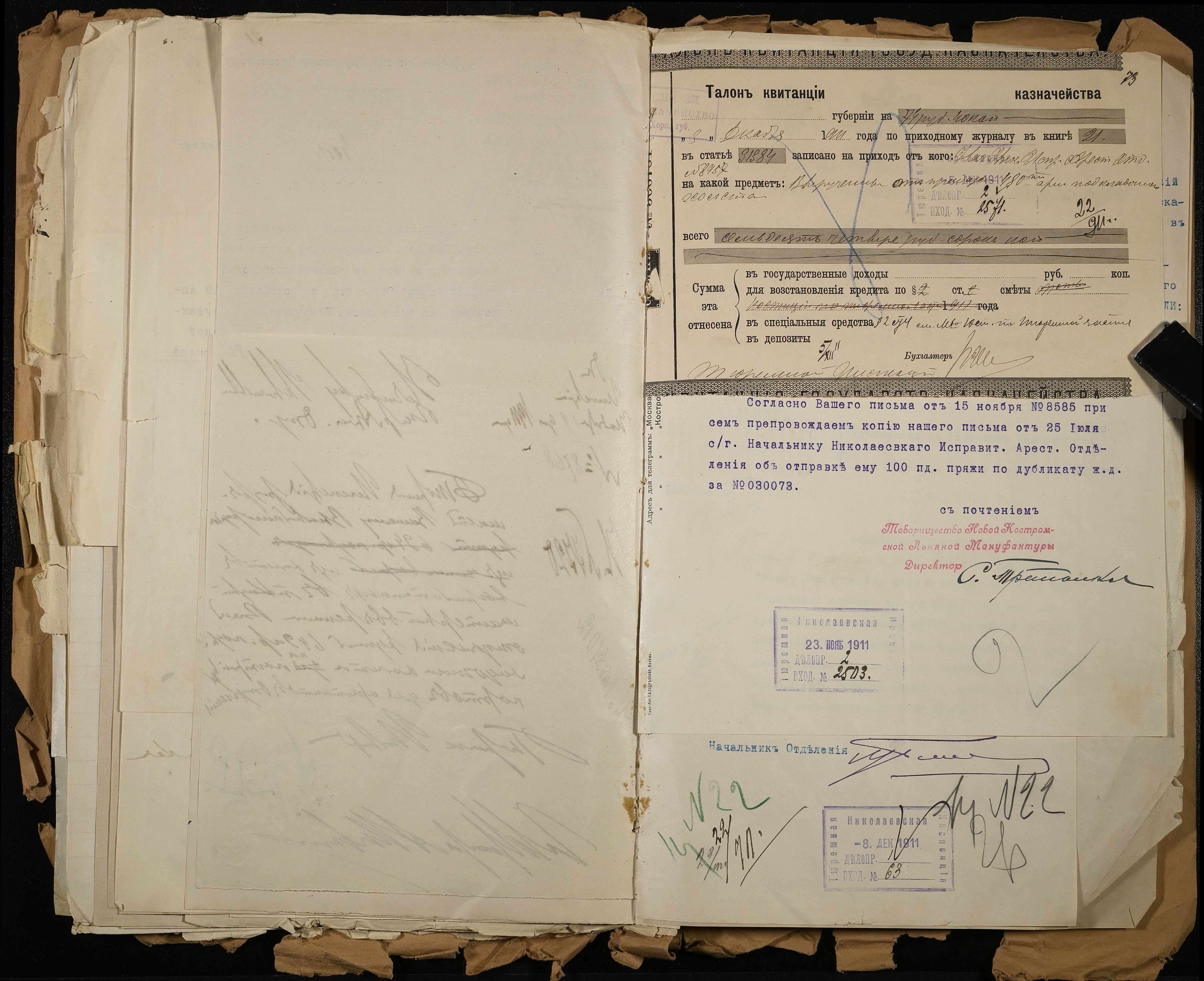 • • • • Справа № 62 Листування з Головним тюремним управлінням, Херсонською казенною палатою, начальником Миколаївского виправного арештантського відділення про порядок постачання пряжі для тюремних ткацьких майстерень та розрахунків за виконані роботи, надання відомостей щодо виробництва полотна та його якість, порядок надання звітності та ін.