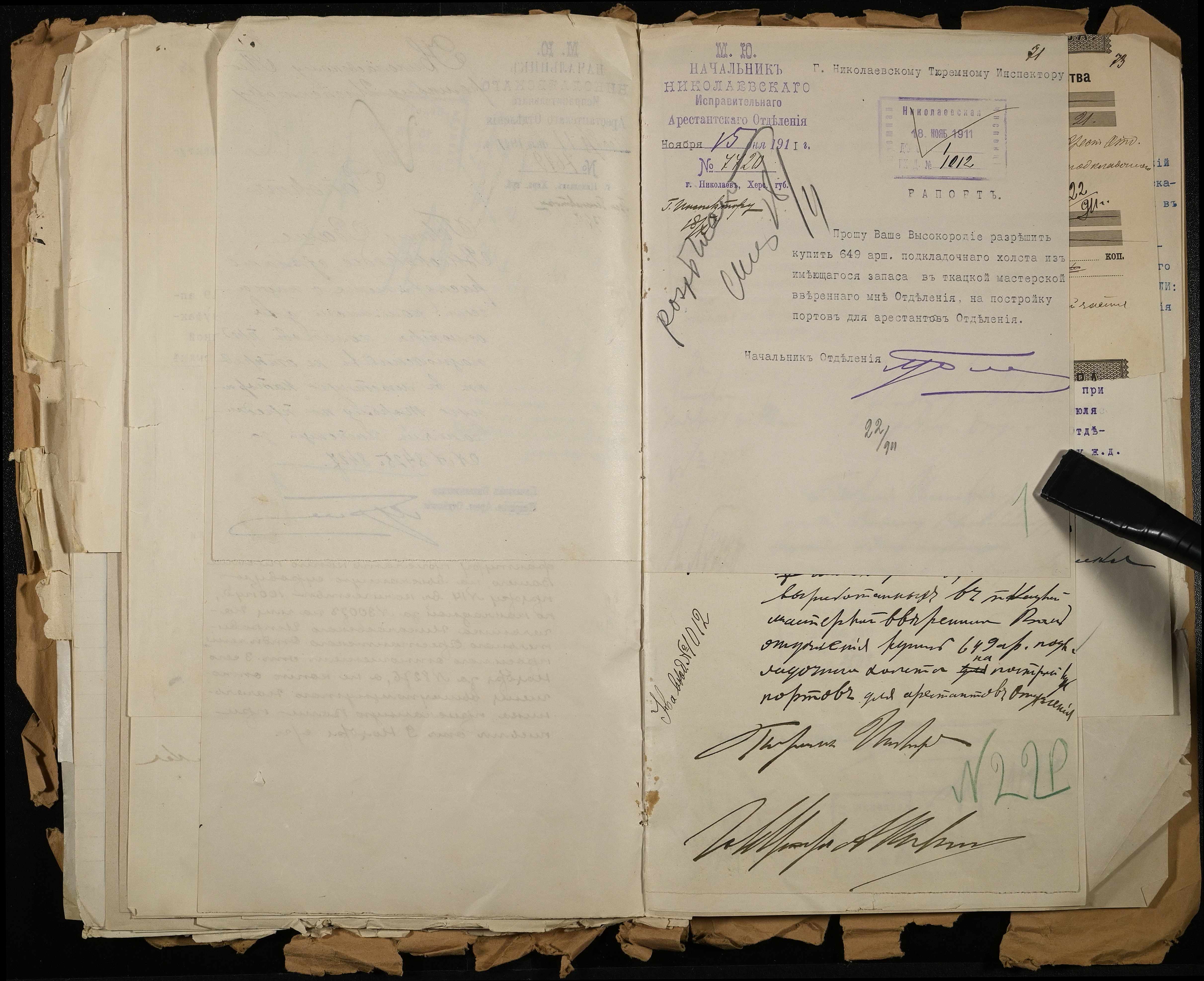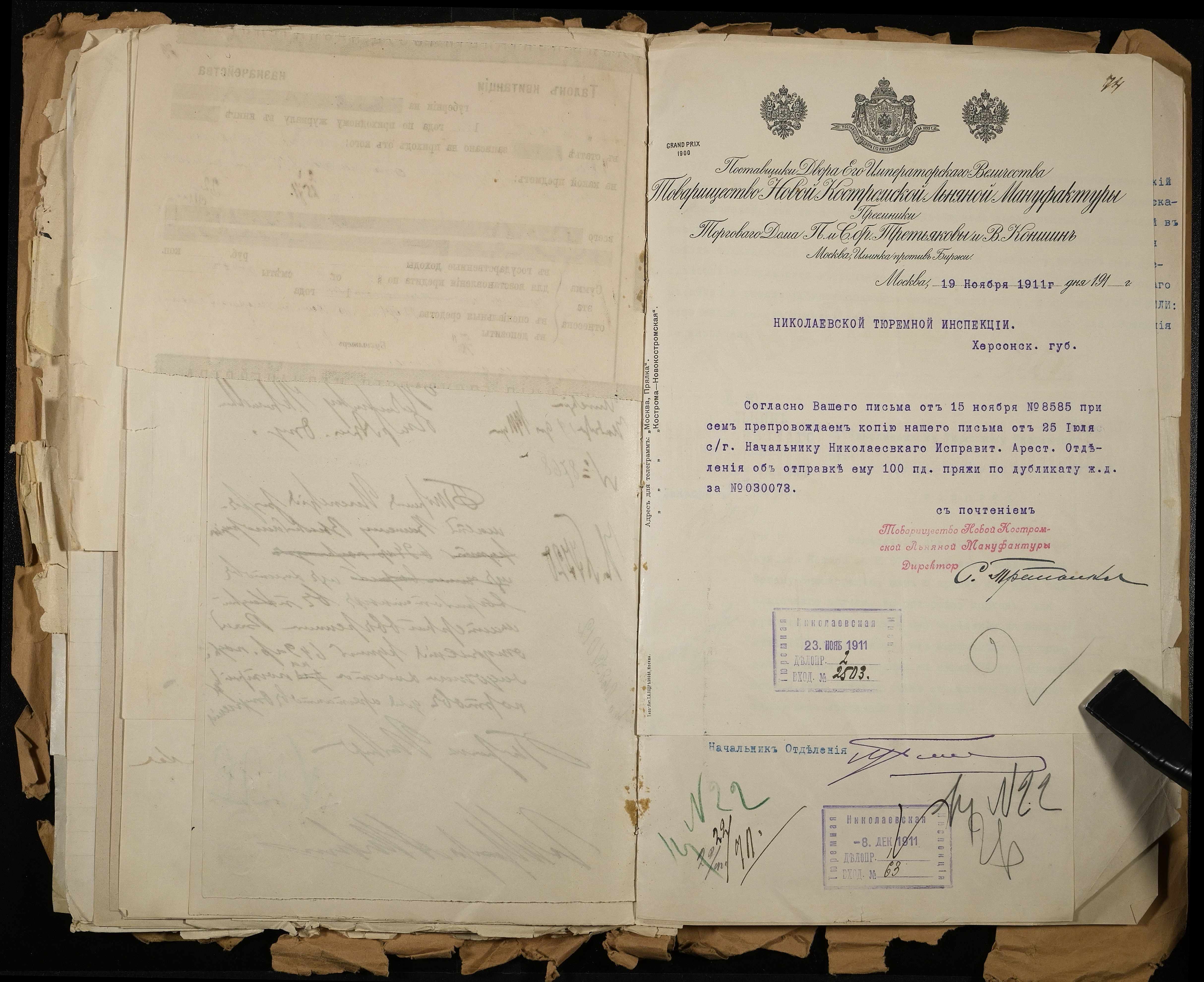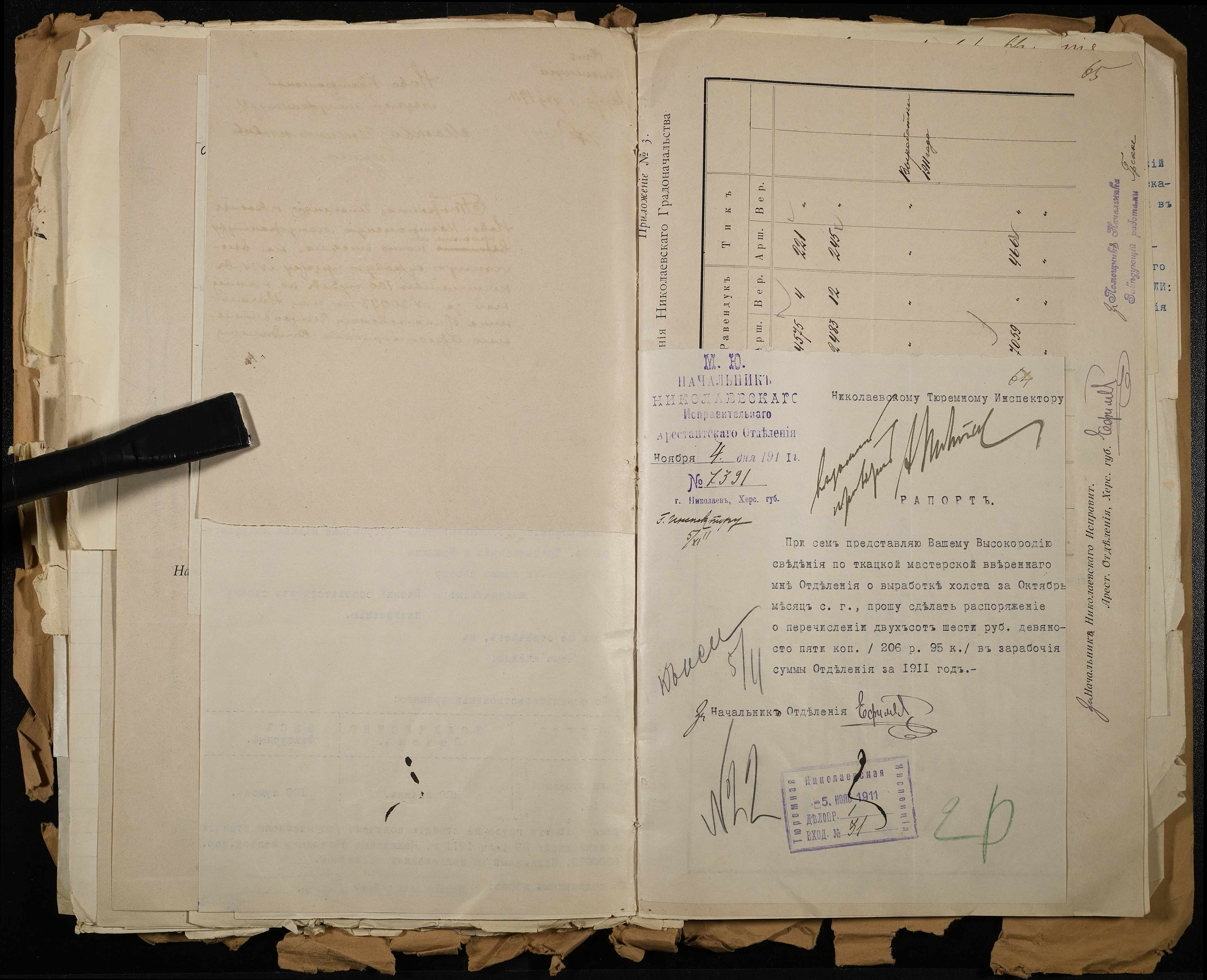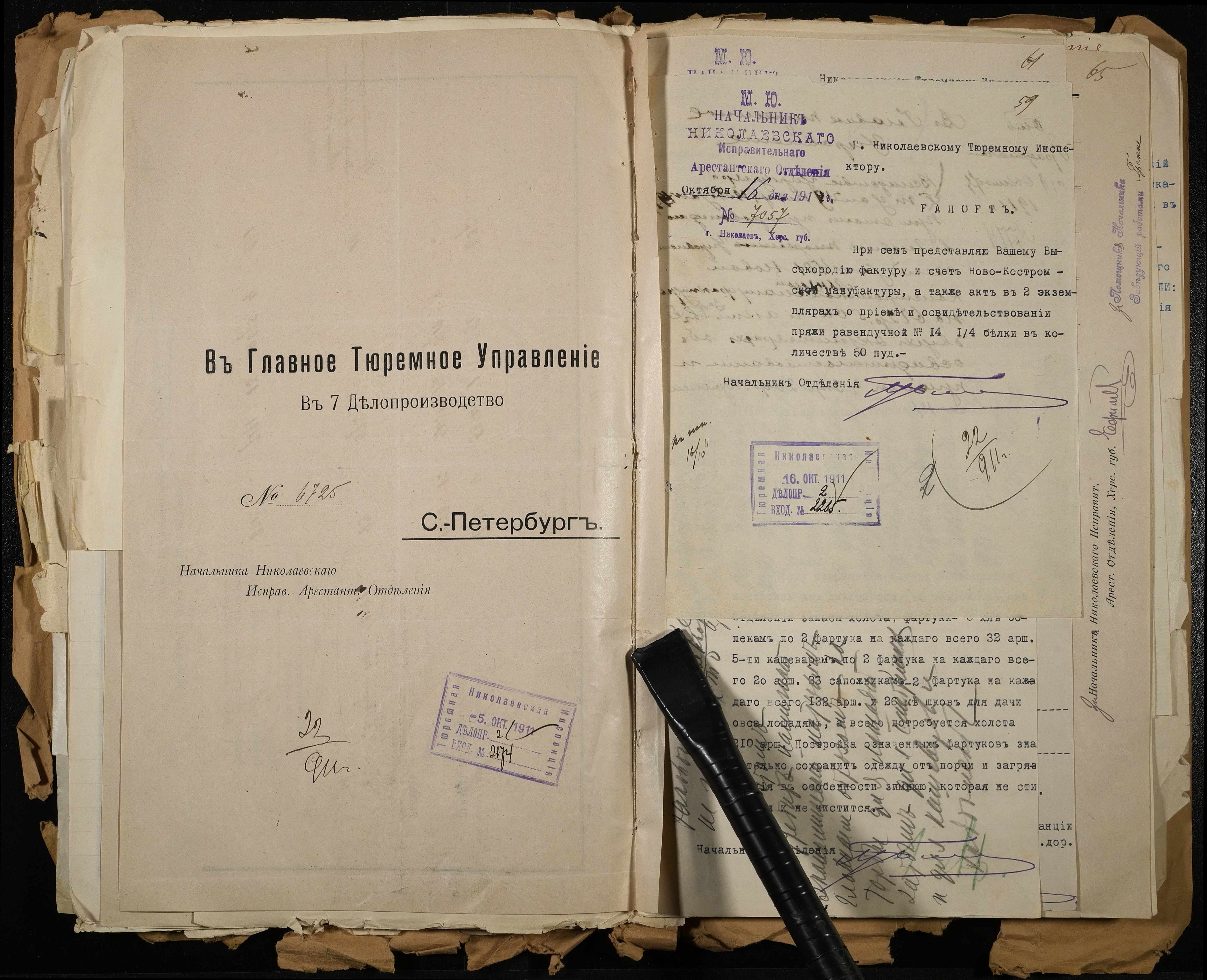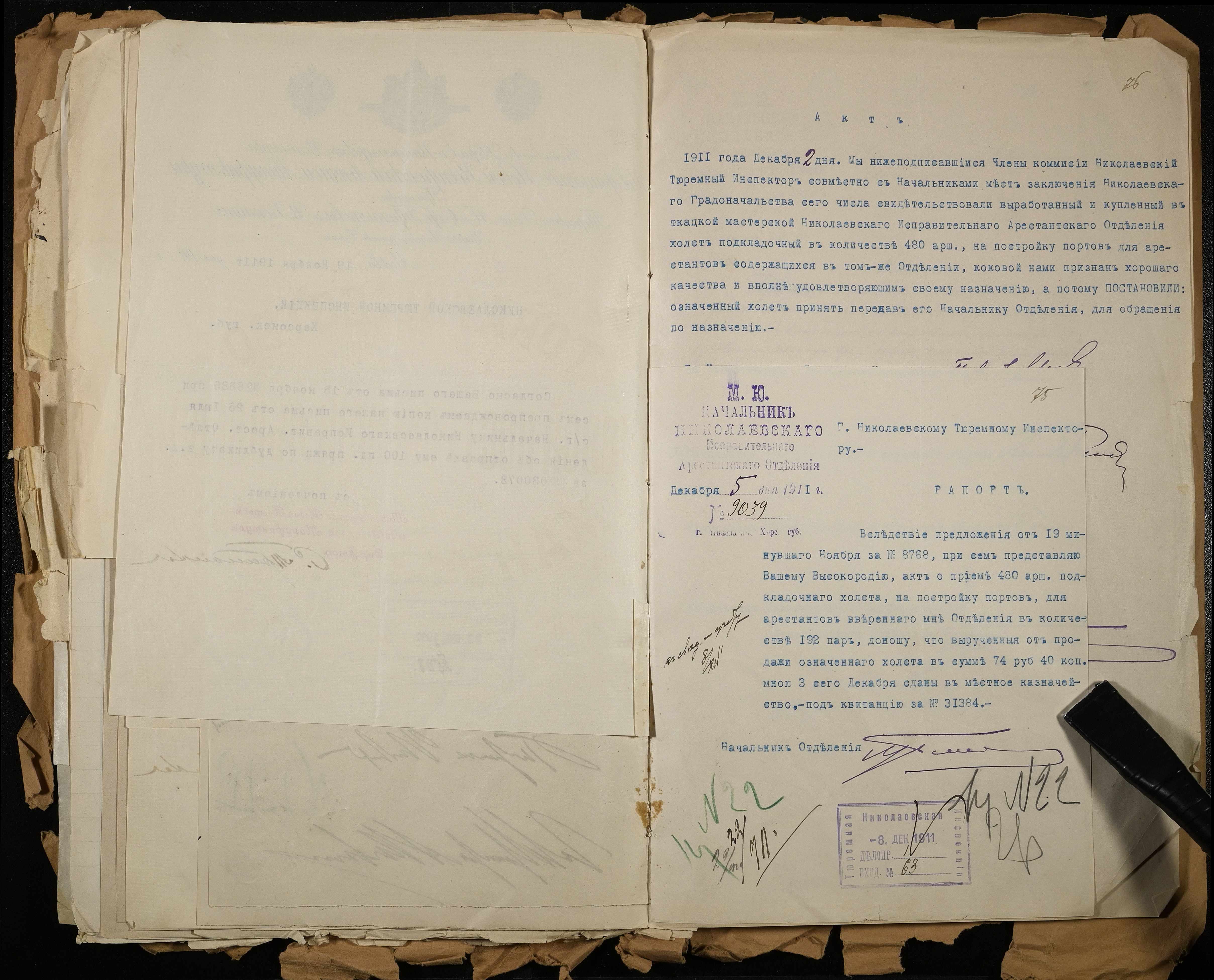 • • • • Справа № 62 Листування з Головним тюремним управлінням, Херсонською казенною палатою, начальником Миколаївского виправного арештантського відділення про порядок постачання пряжі для тюремних ткацьких майстерень та розрахунків за виконані роботи, надання відомостей щодо виробництва полотна та його якість, порядок надання звітності та ін.