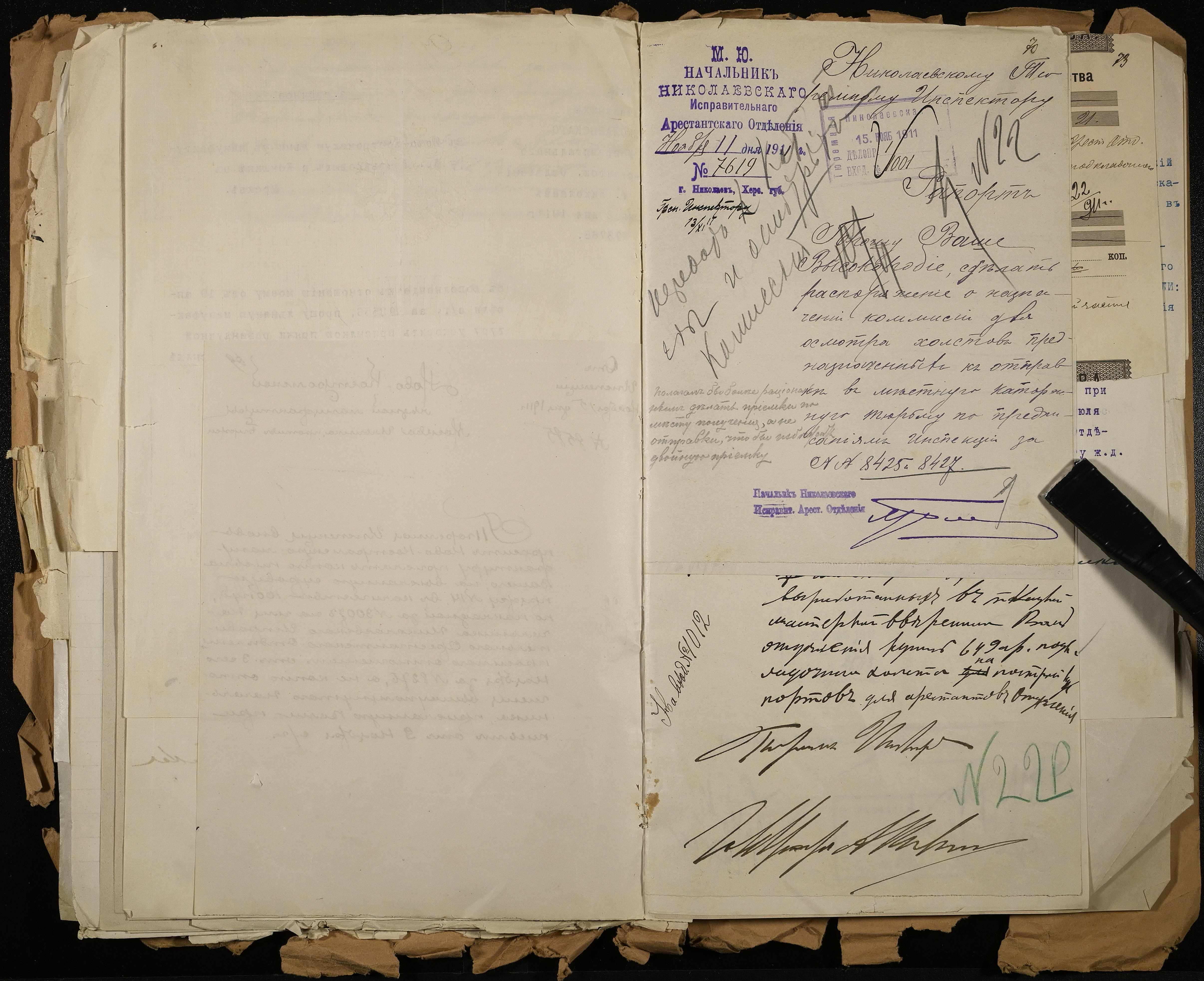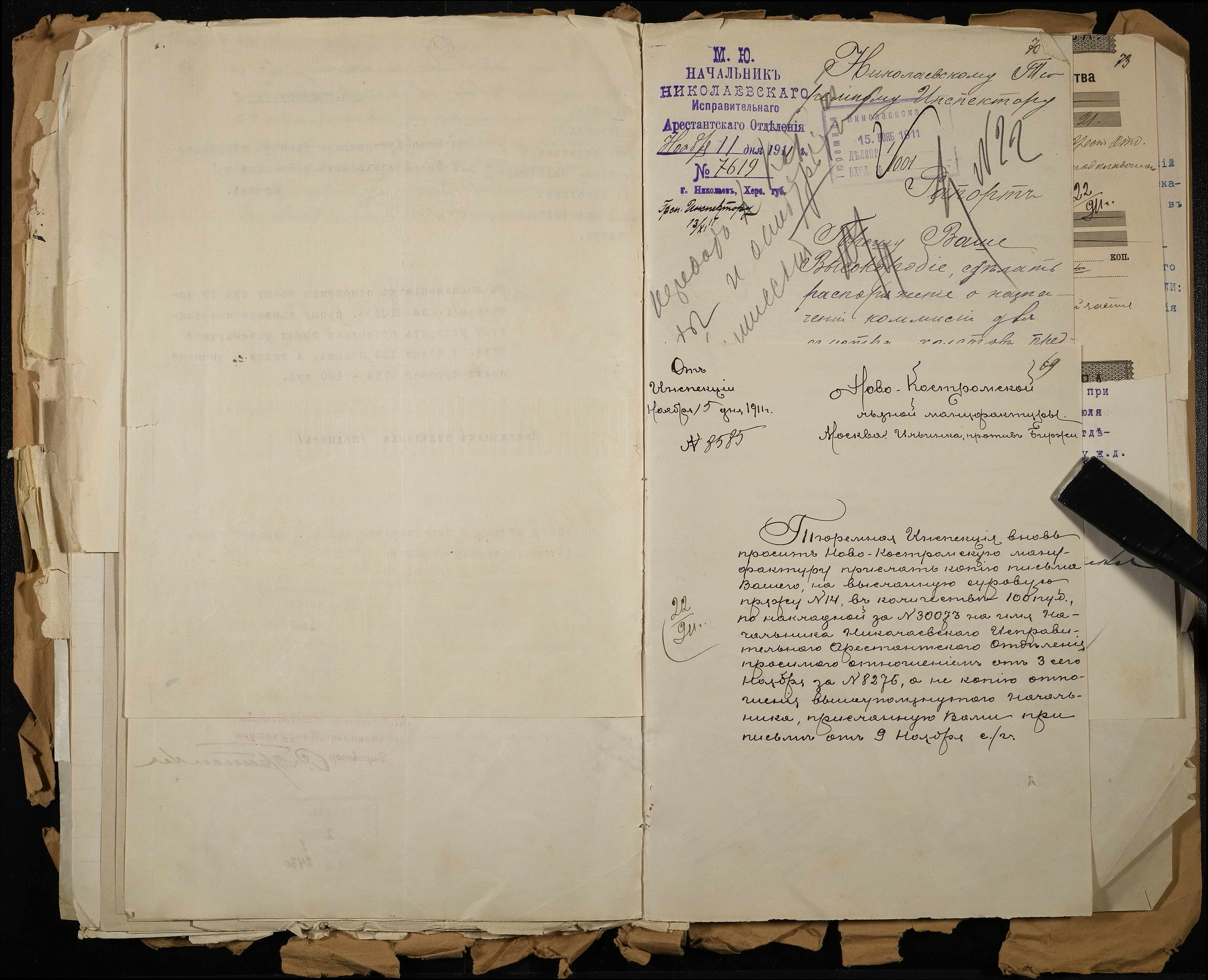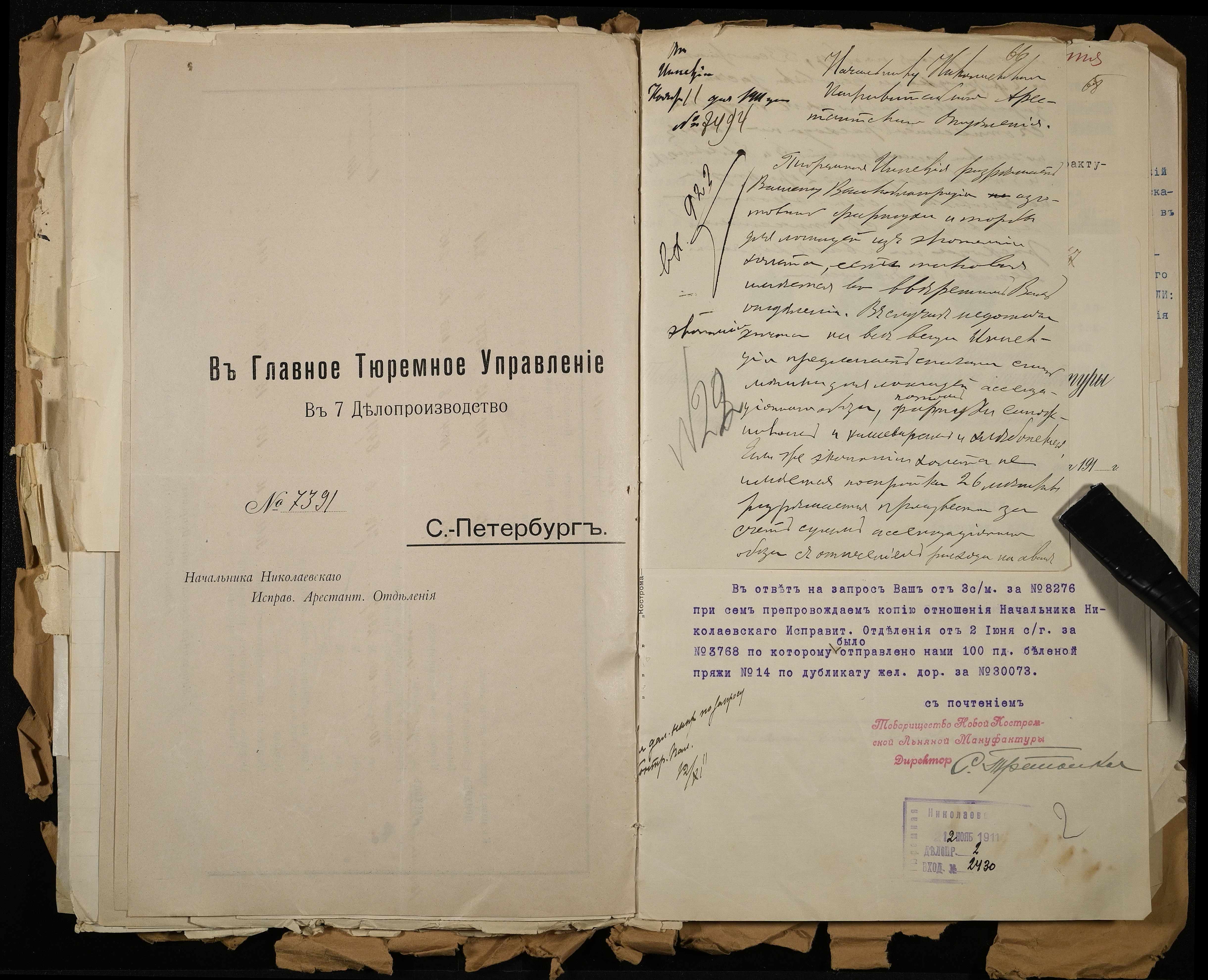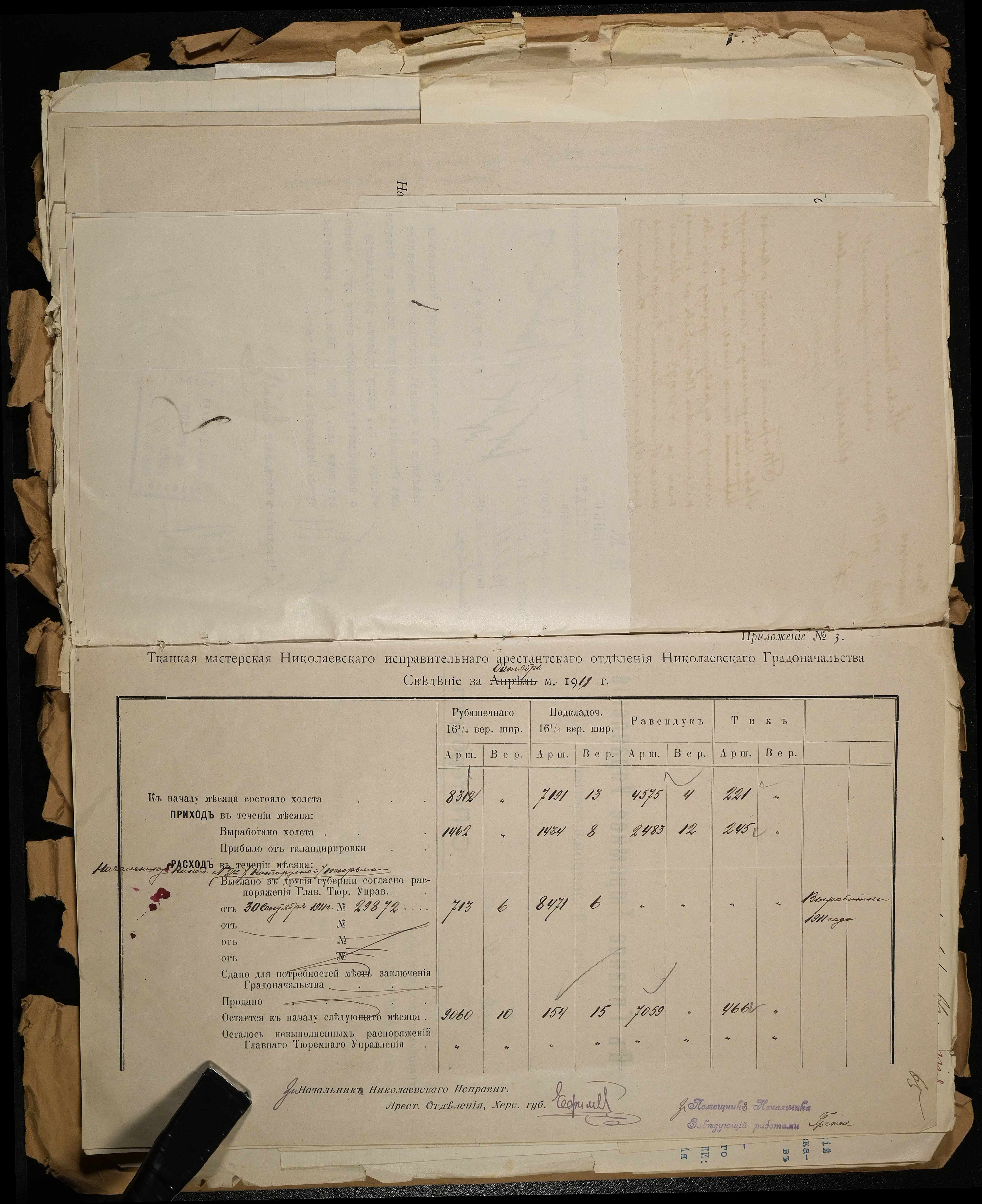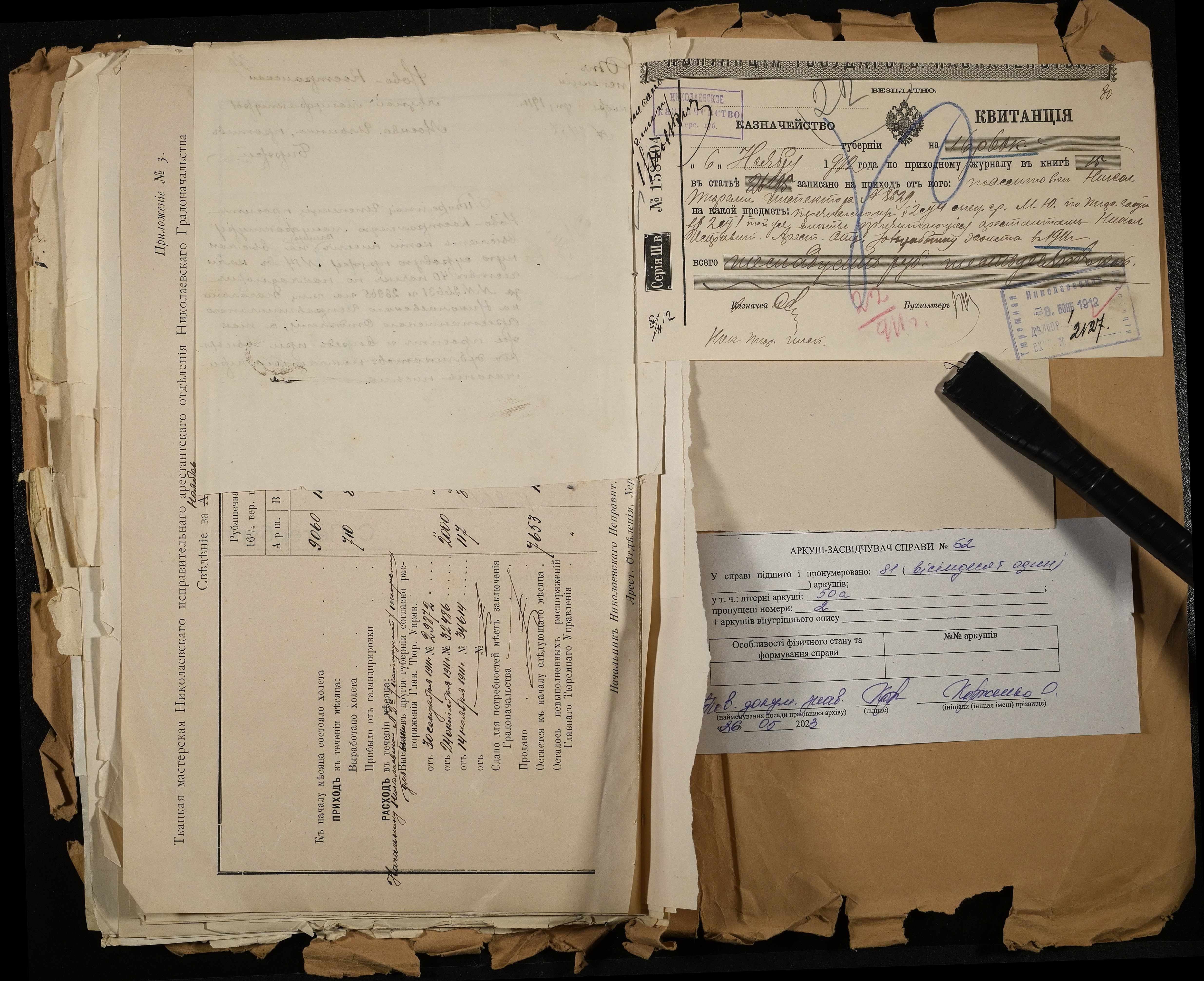 • • • • Справа № 62 Листування з Головним тюремним управлінням, Херсонською казенною палатою, начальником Миколаївского виправного арештантського відділення про порядок постачання пряжі для тюремних ткацьких майстерень та розрахунків за виконані роботи, надання відомостей щодо виробництва полотна та його якість, порядок надання звітності та ін.
