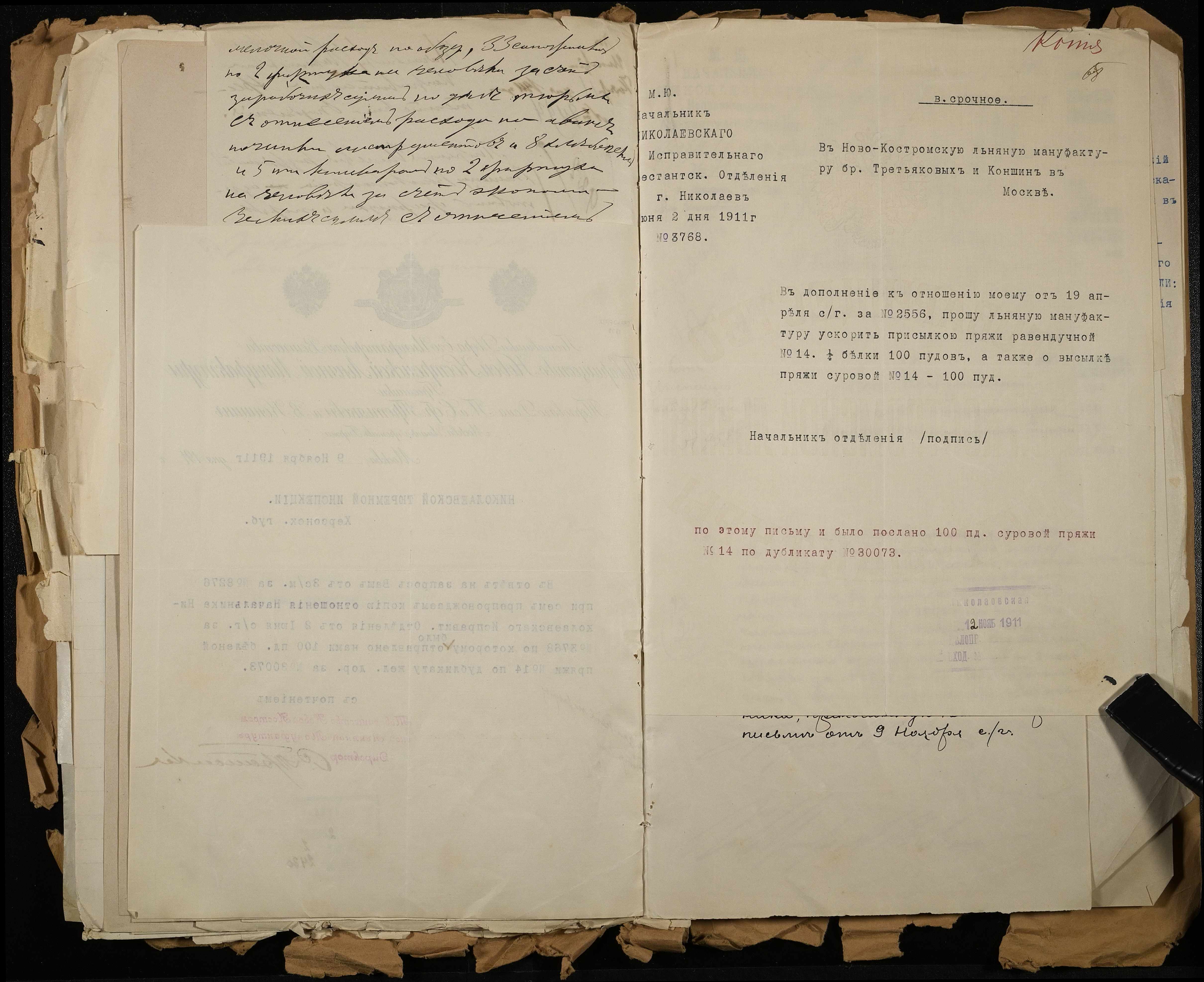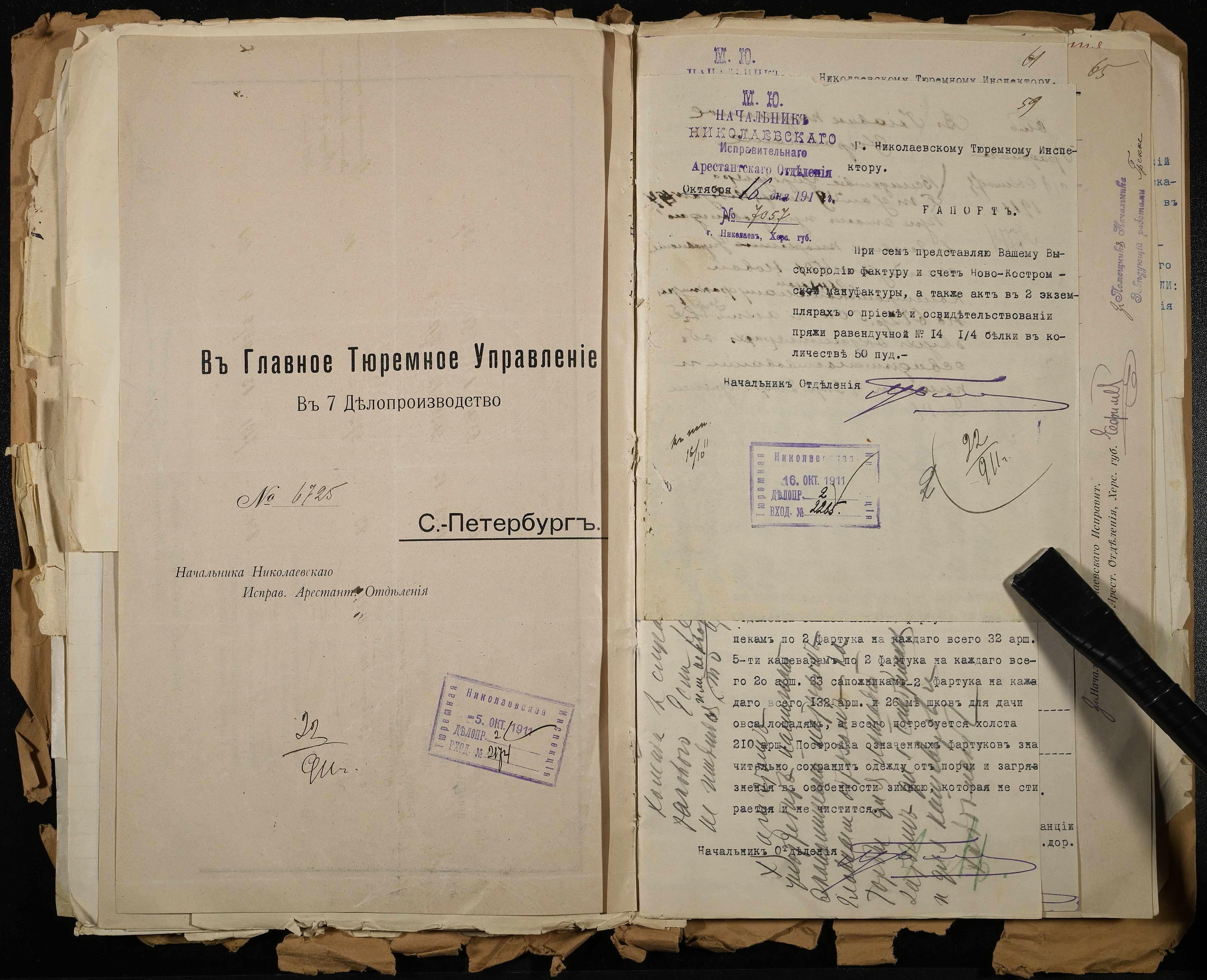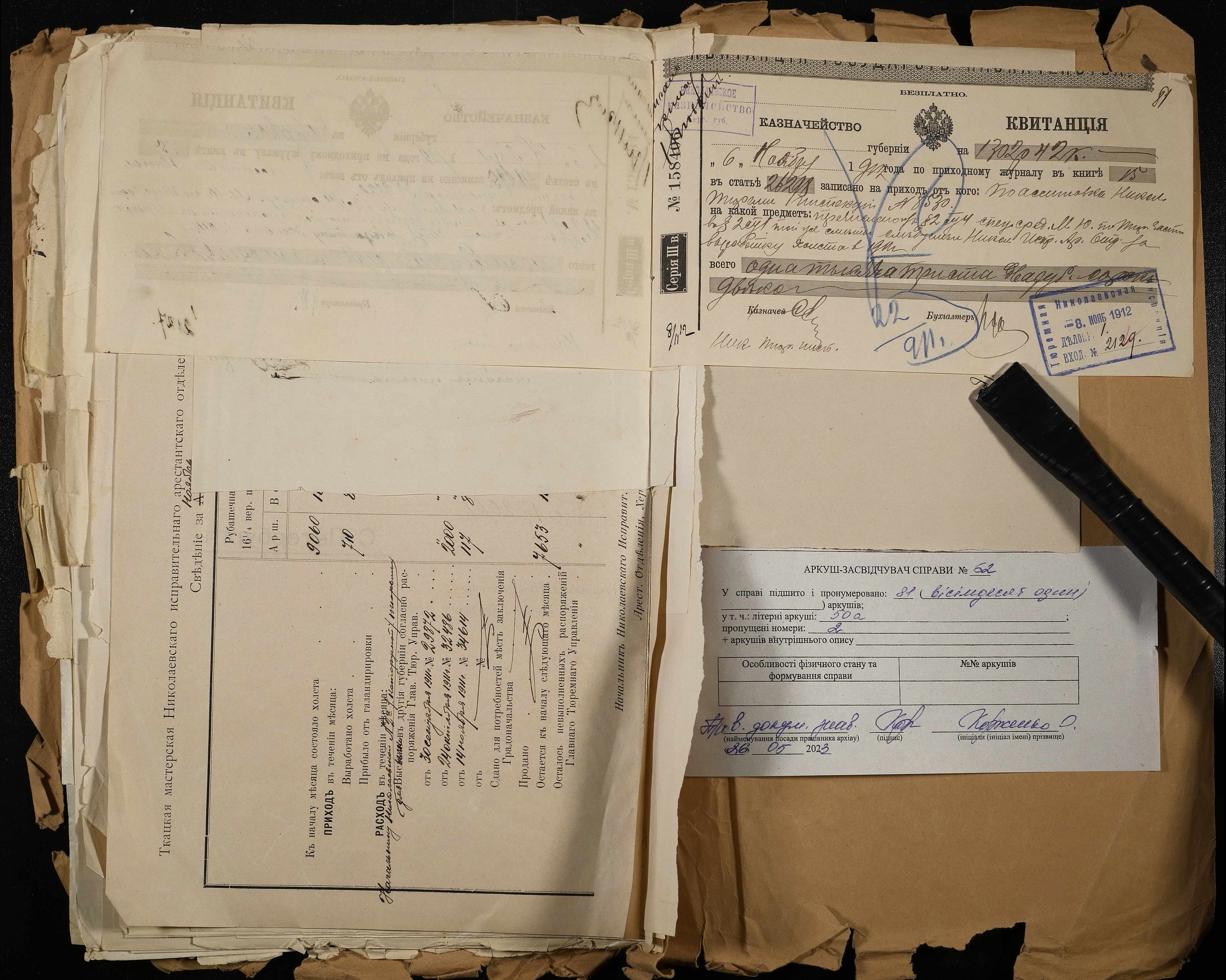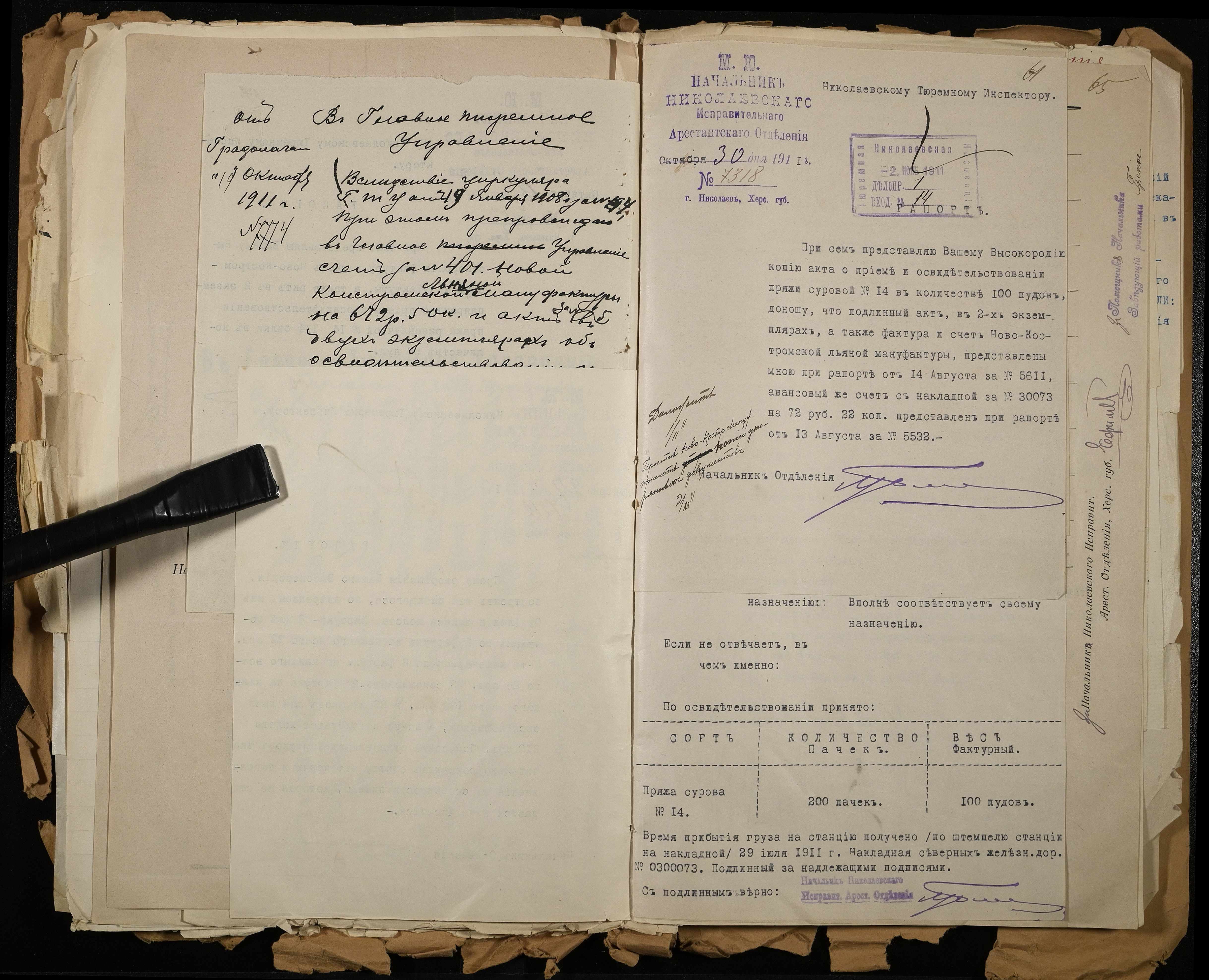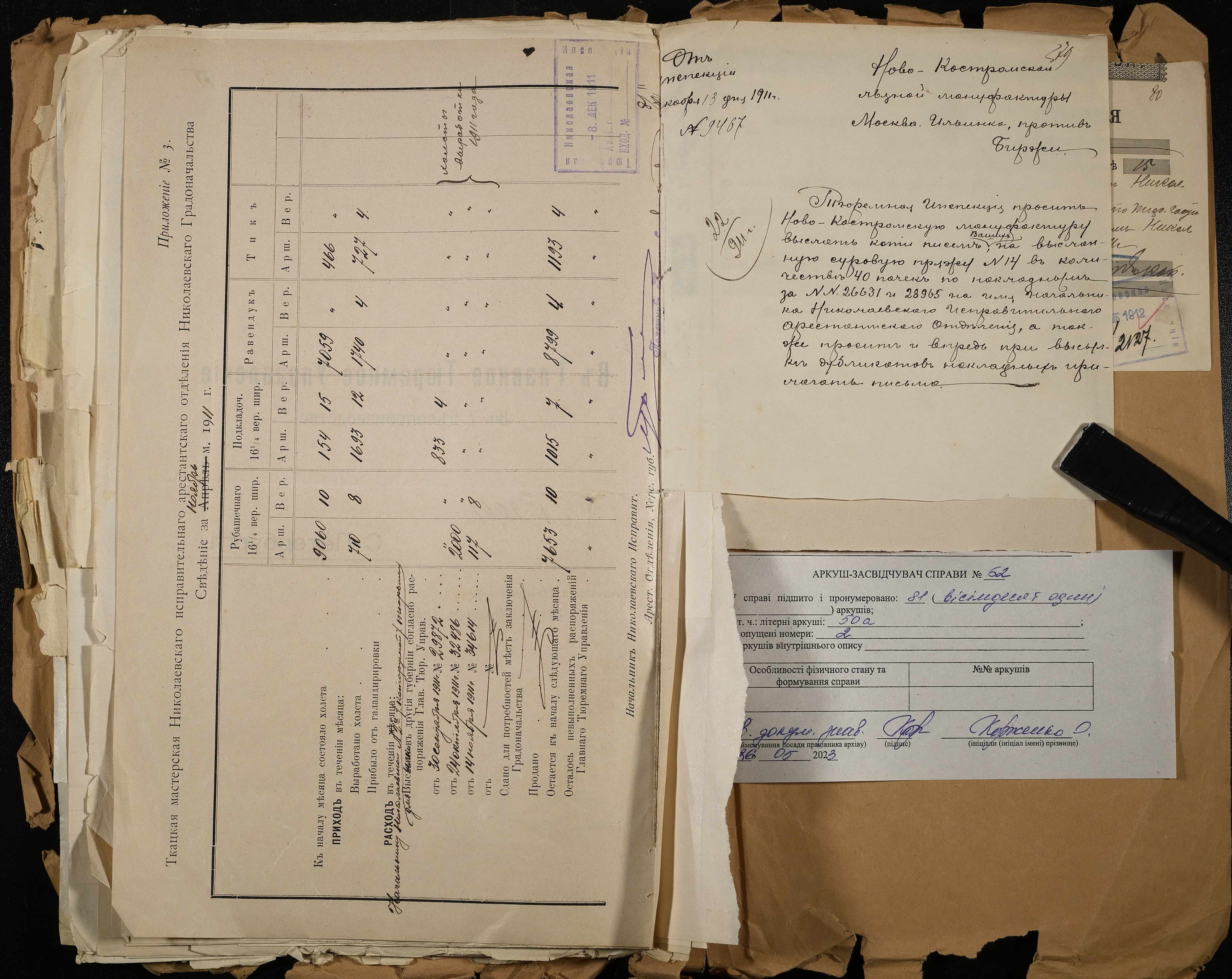• • • • Справа № 62 Листування з Головним тюремним управлінням, Херсонською казенною палатою, начальником Миколаївского виправного арештантського відділення про порядок постачання пряжі для тюремних ткацьких майстерень та розрахунків за виконані роботи, надання відомостей щодо виробництва полотна та його якість, порядок надання звітності та ін.