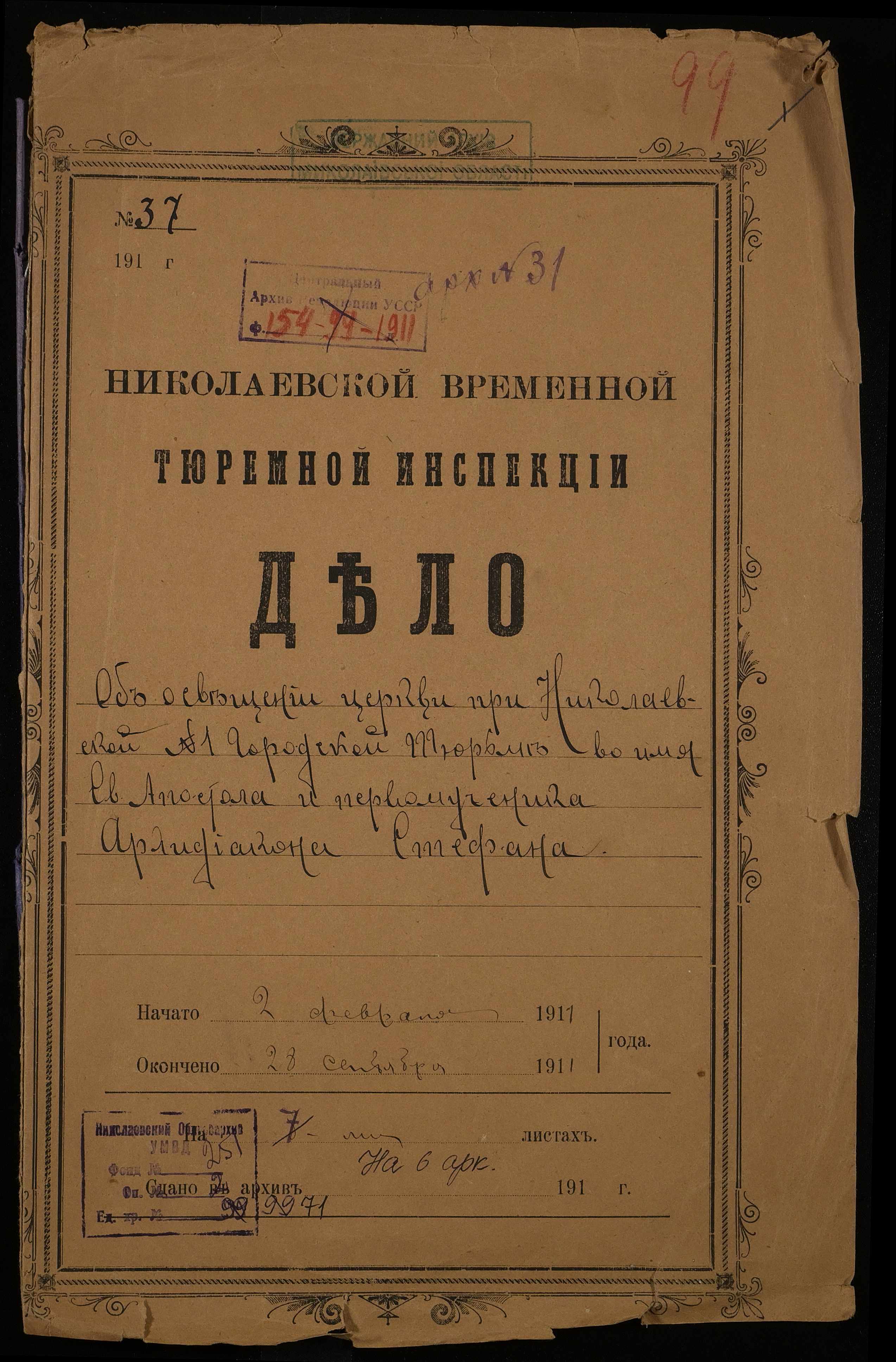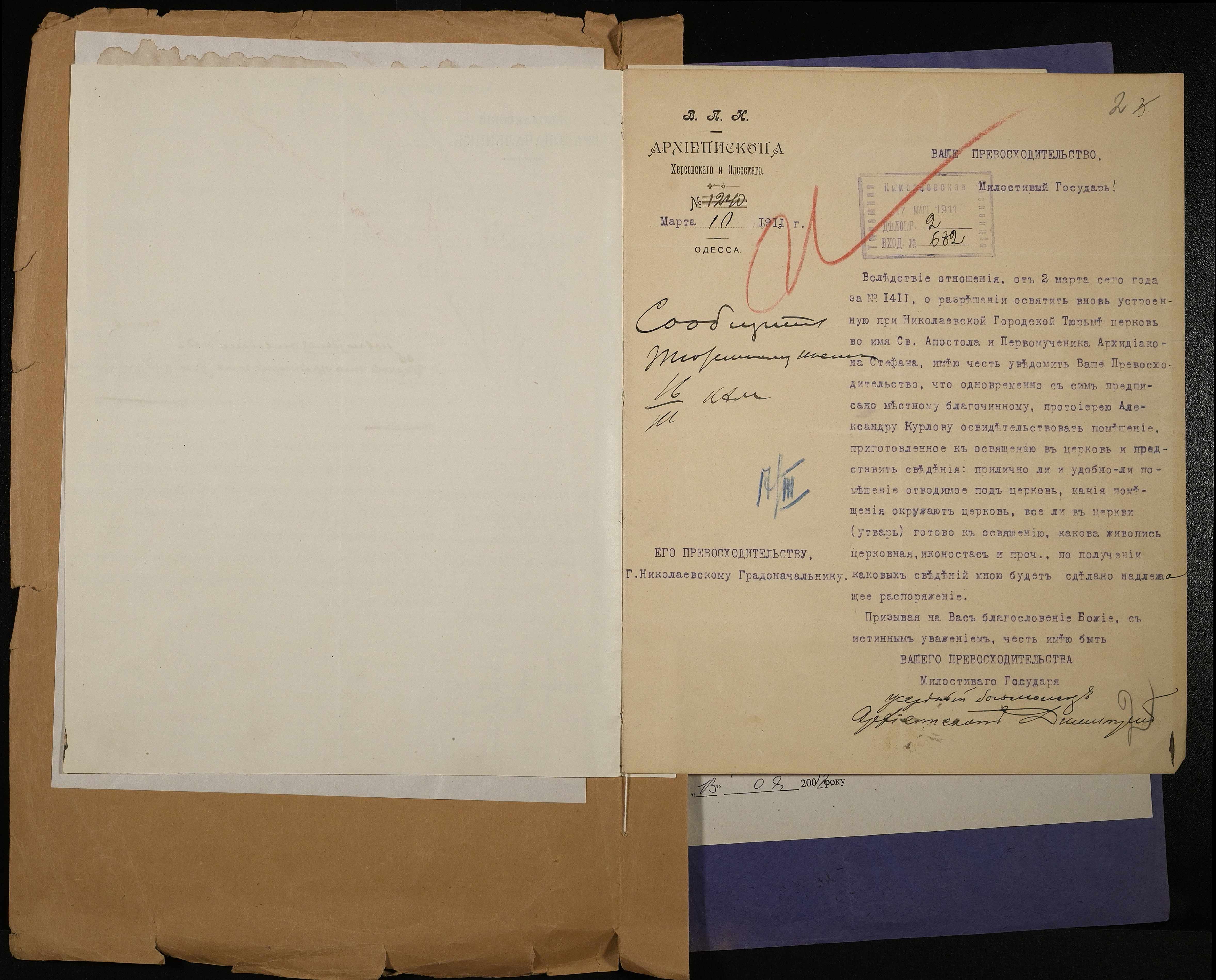 • • • • Справа № 71 Листування з Архієпископом Херсонським і Одеським, Миколаївським градоначальником про проведення відкритого богослужіння і освячення збудованої церкви на території 1-ої міської тюрми