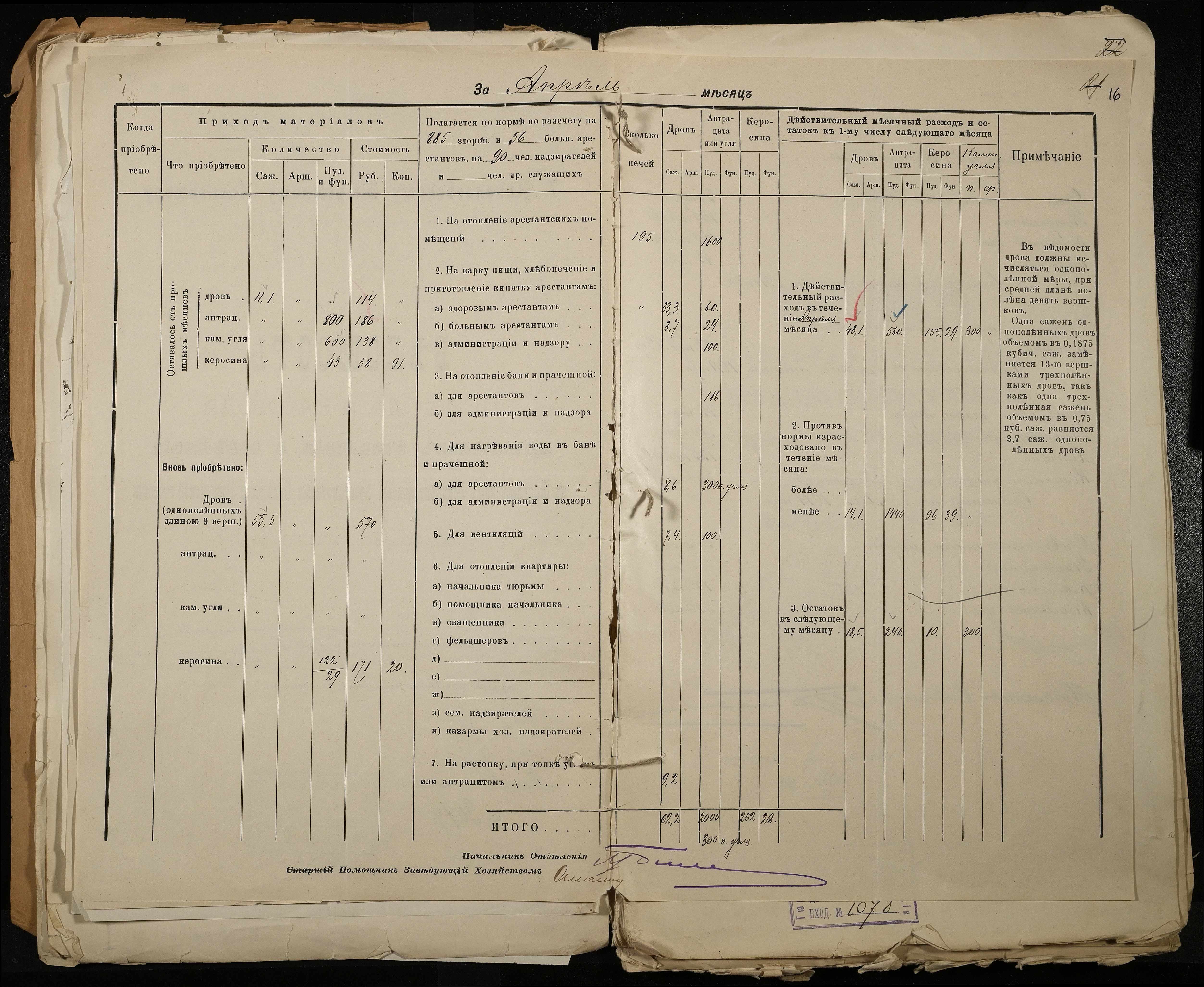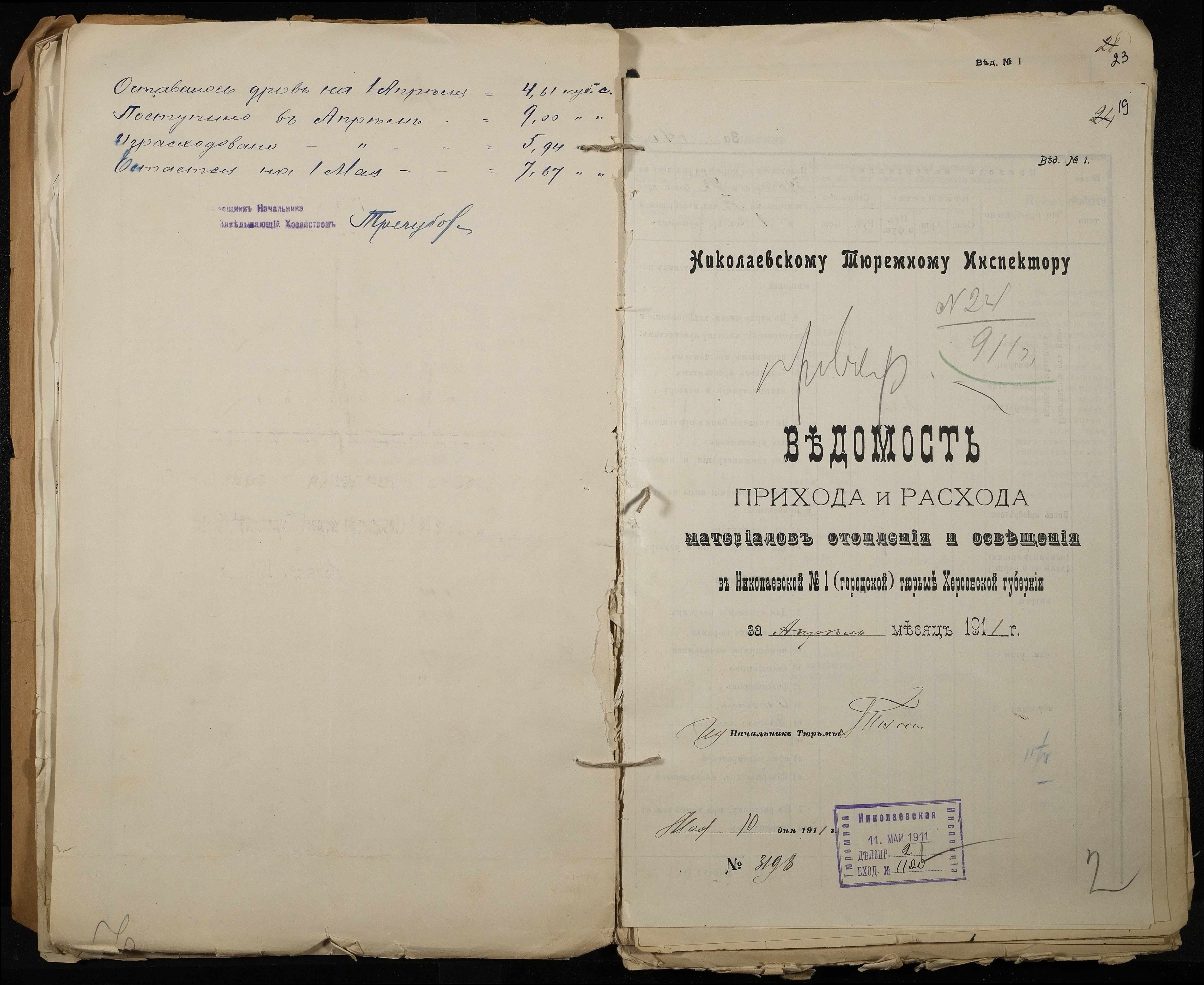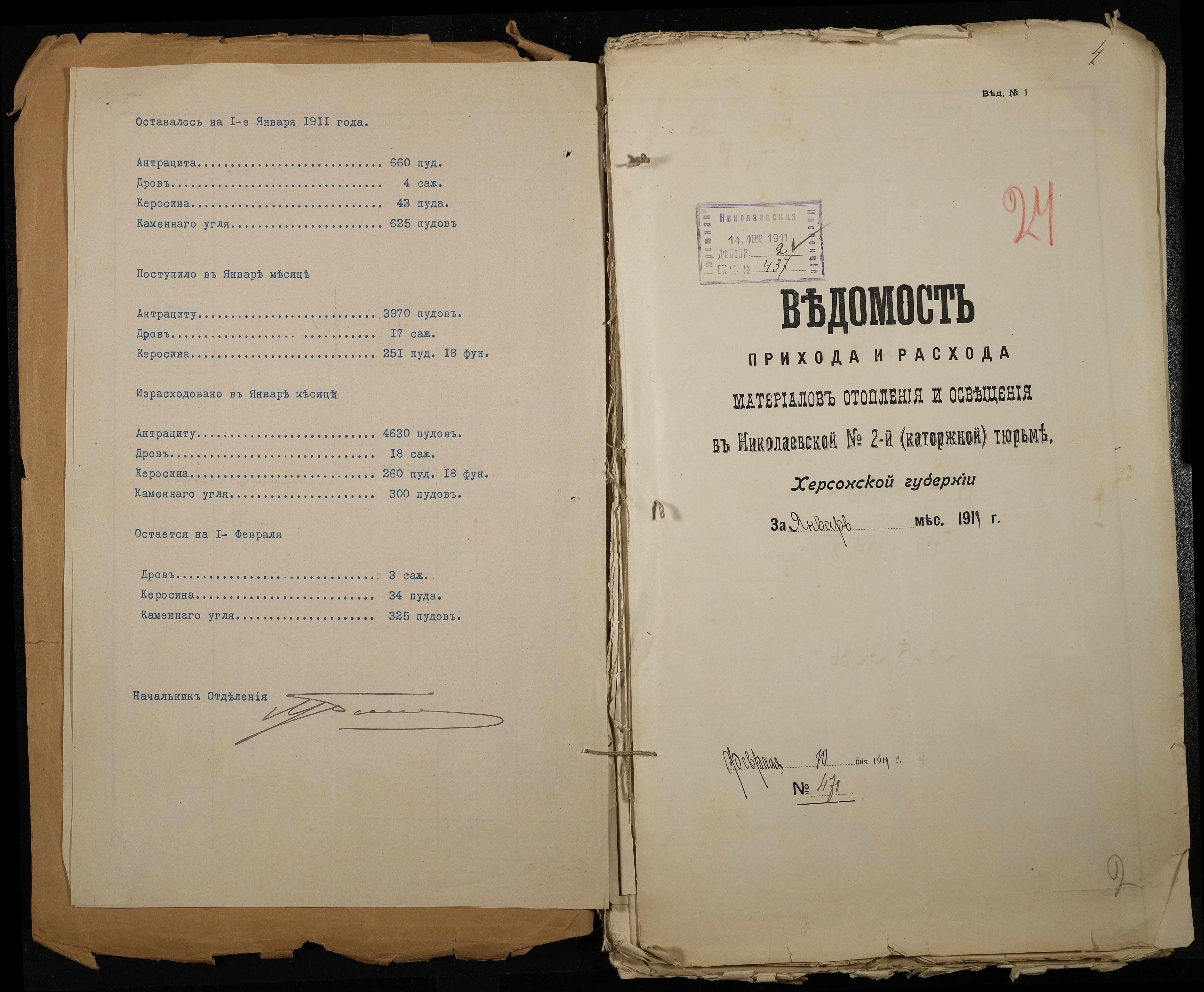 • • • • Справа № 73 Прибутково-видаткові відомості матеріалів для опалення і освітлення в миколаївських виправних установах