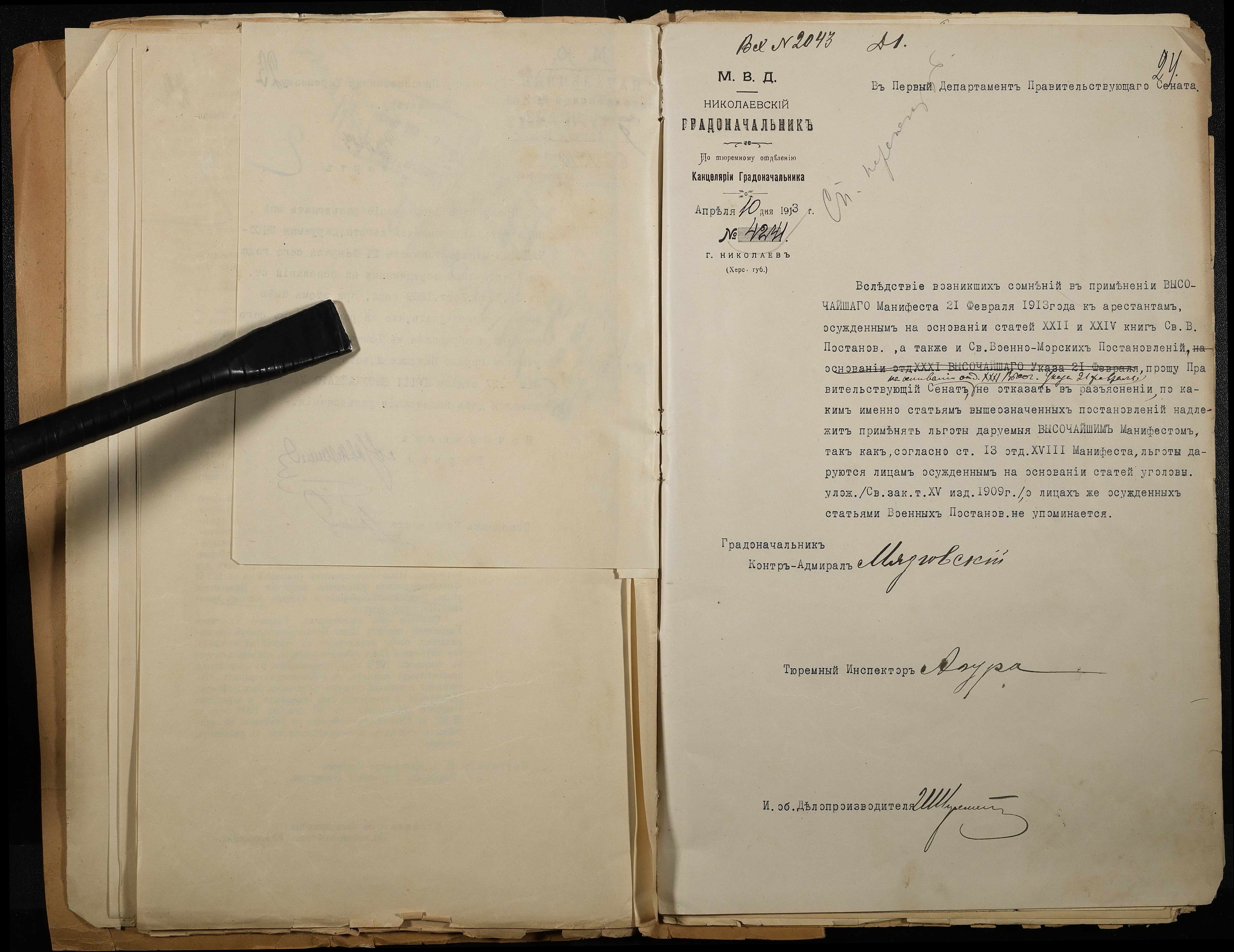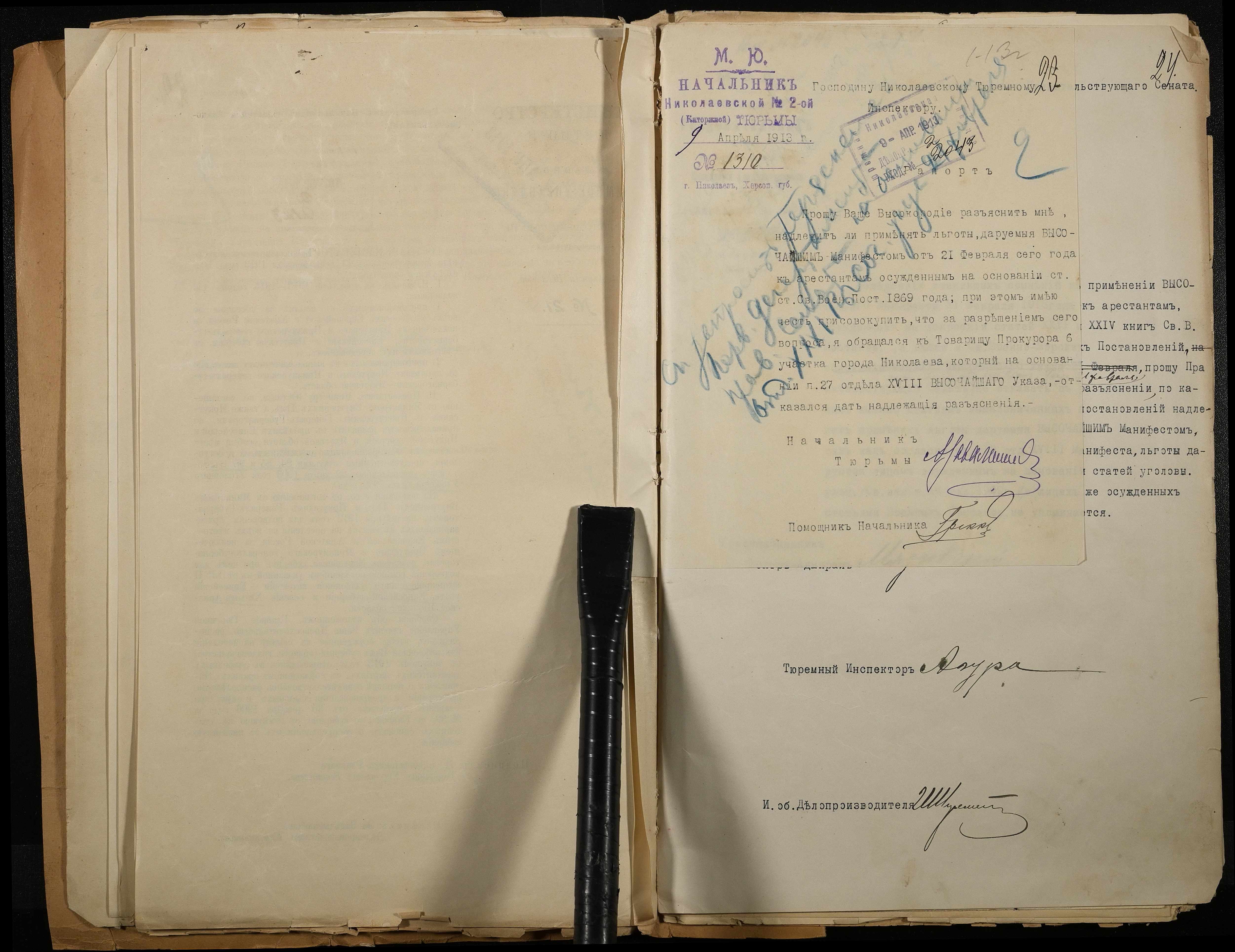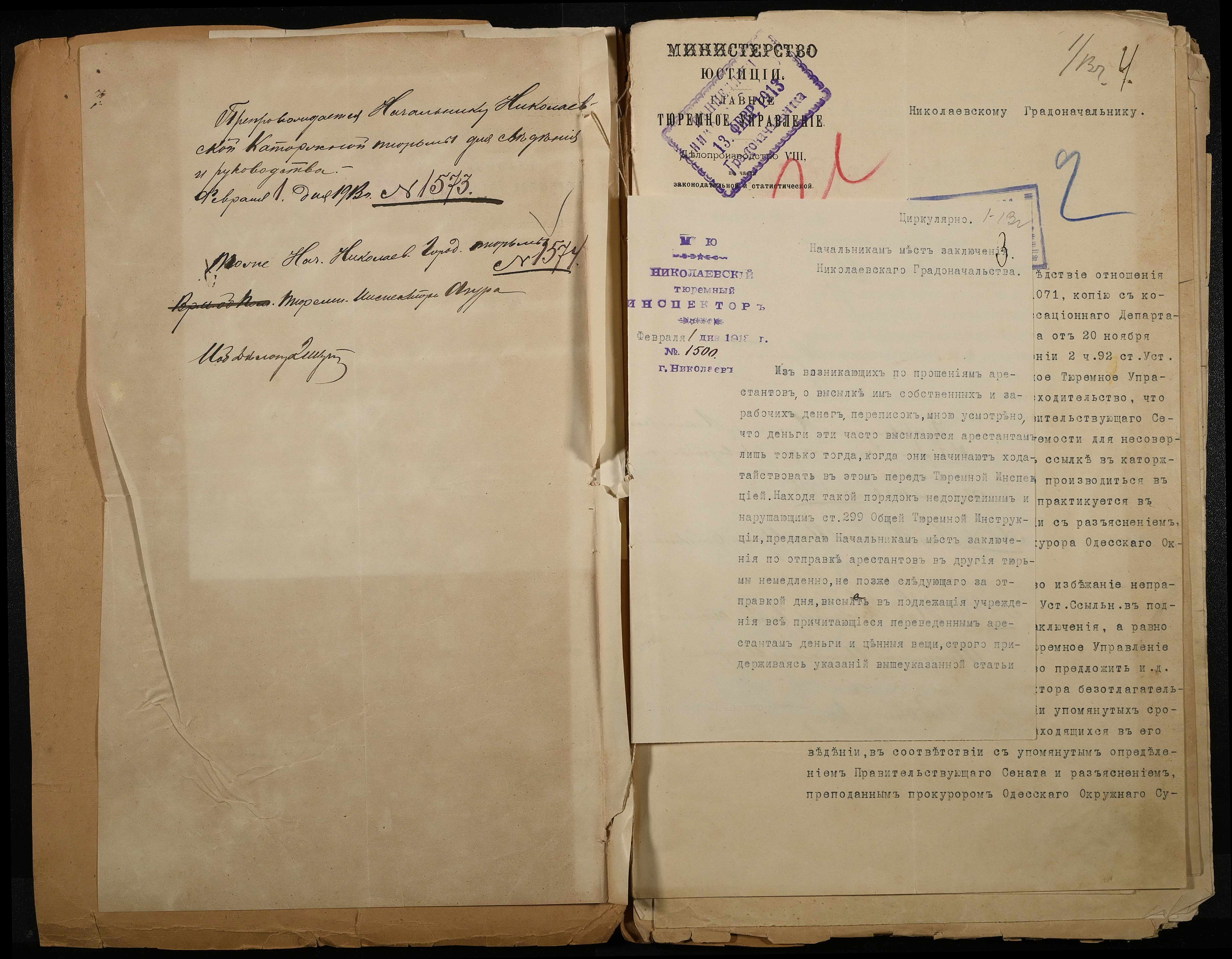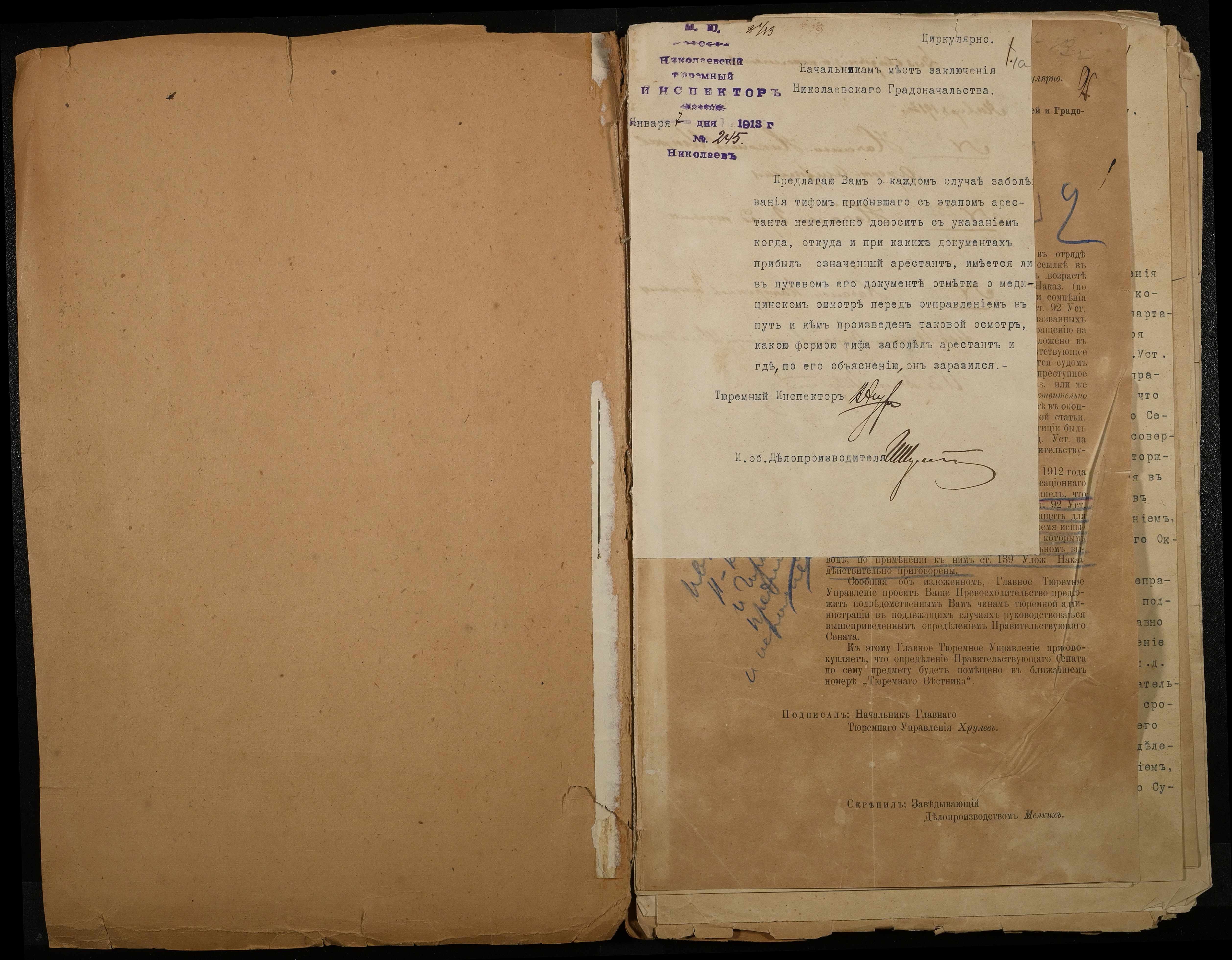• • • • Справа № 93 Обіжники Головного тюремного управління та листування з ним, начальниками місць ув’язнення м. Миколаїв про скорочення строків відбування покарання для неповнолітніх арештантів, надання пільг, прощення або скорочення строків ув’язнення арештантам та висланцям відповідно до Маніфесту 21-го лютого 1913 року; порядок надання відомостей про рух арештантів та ін.