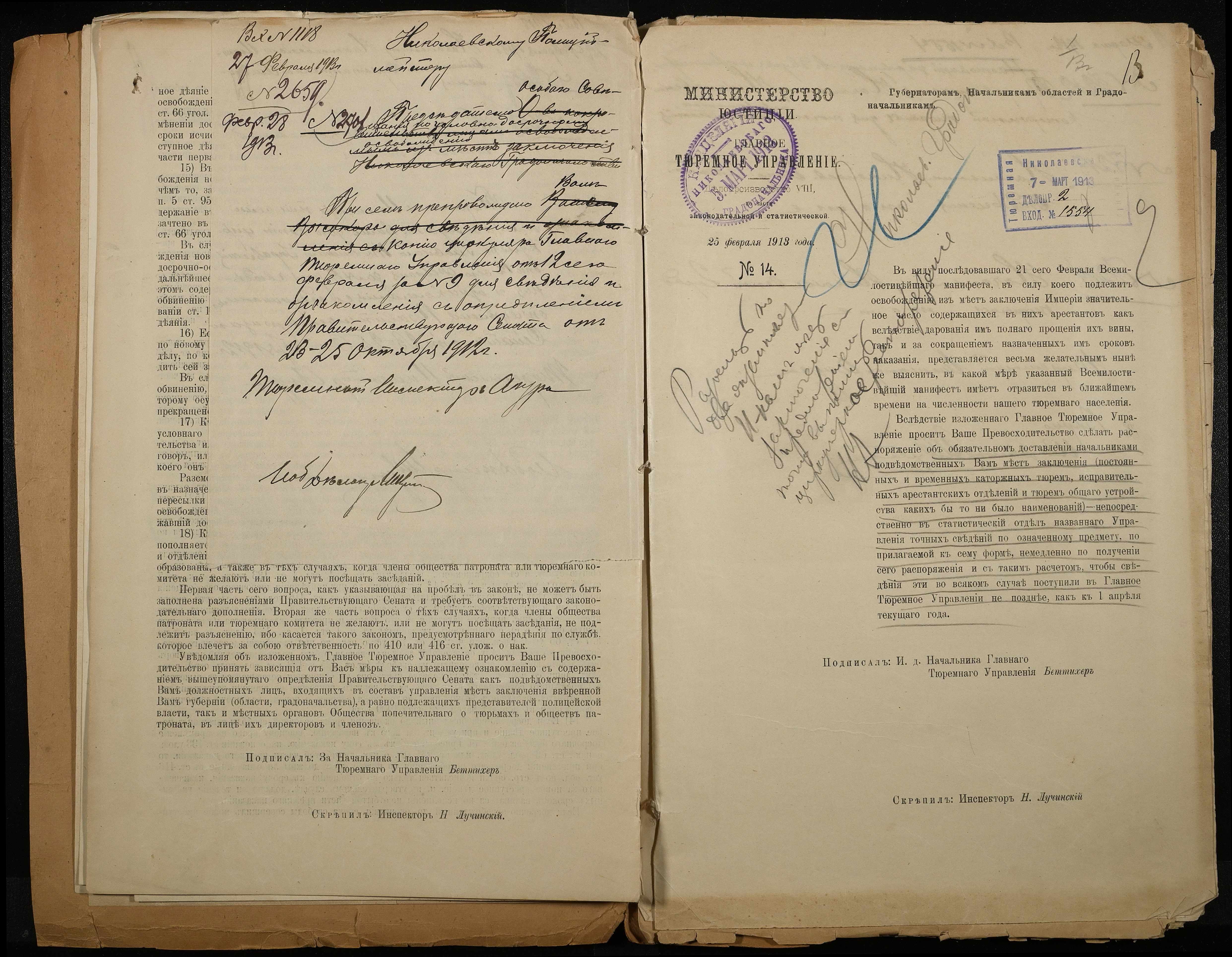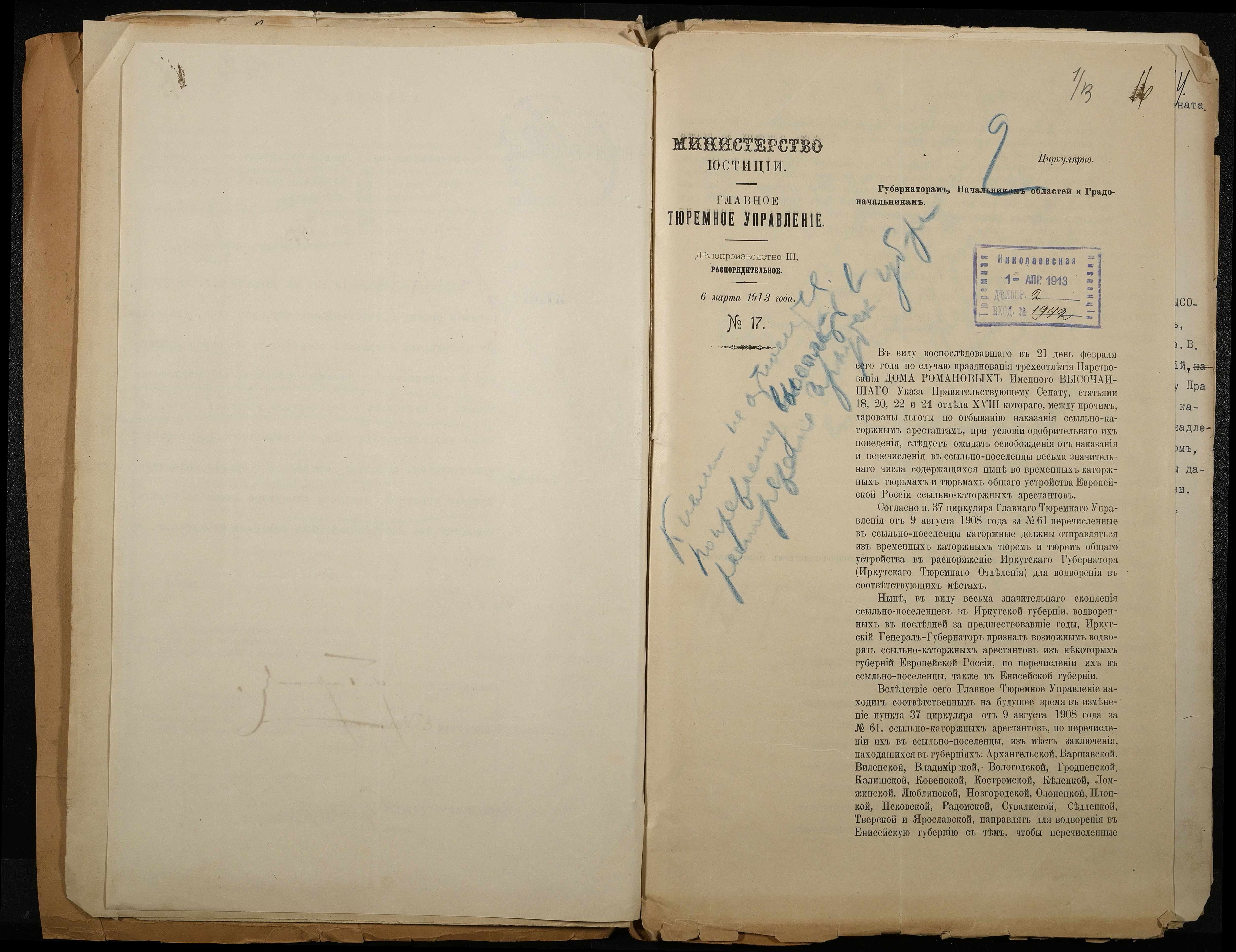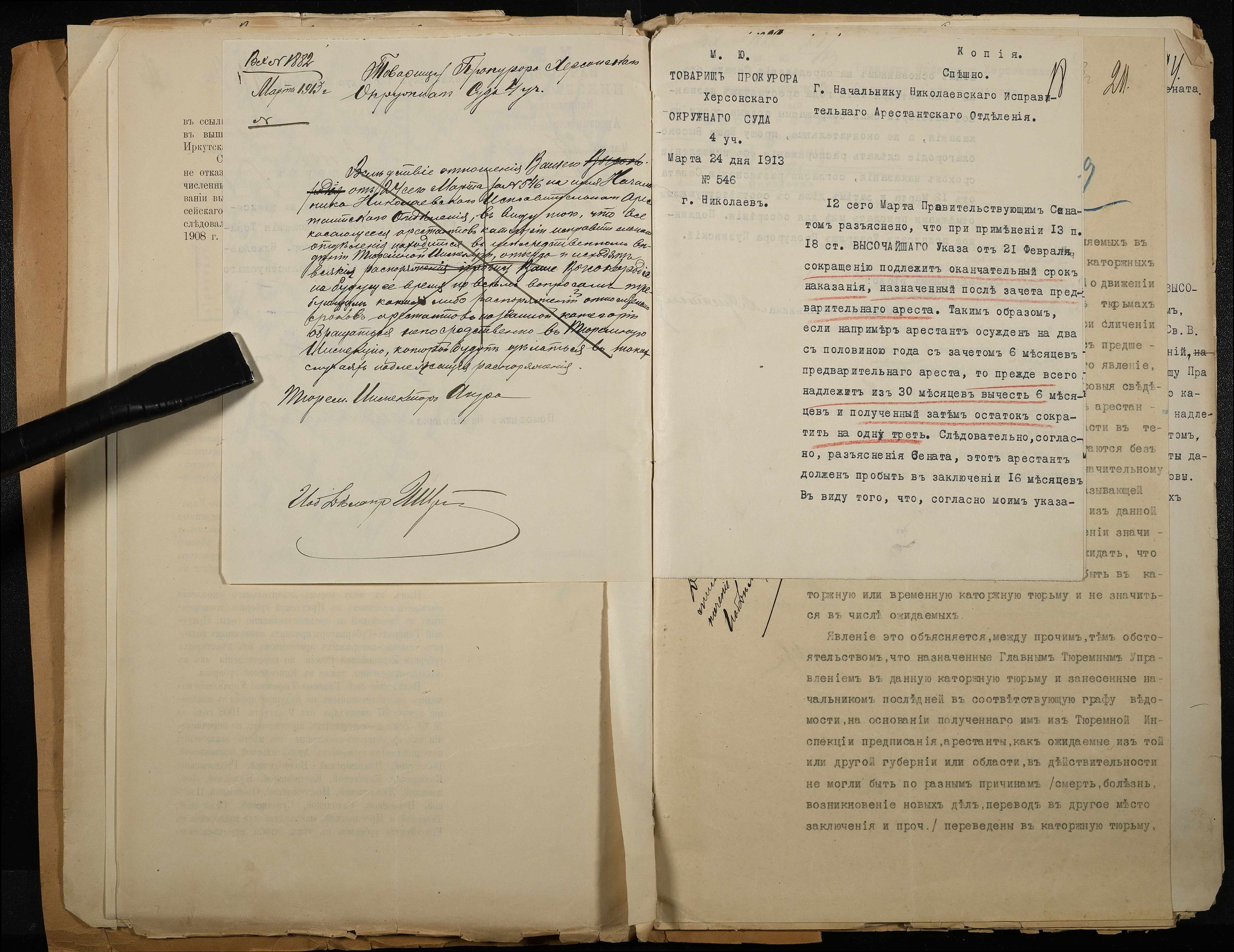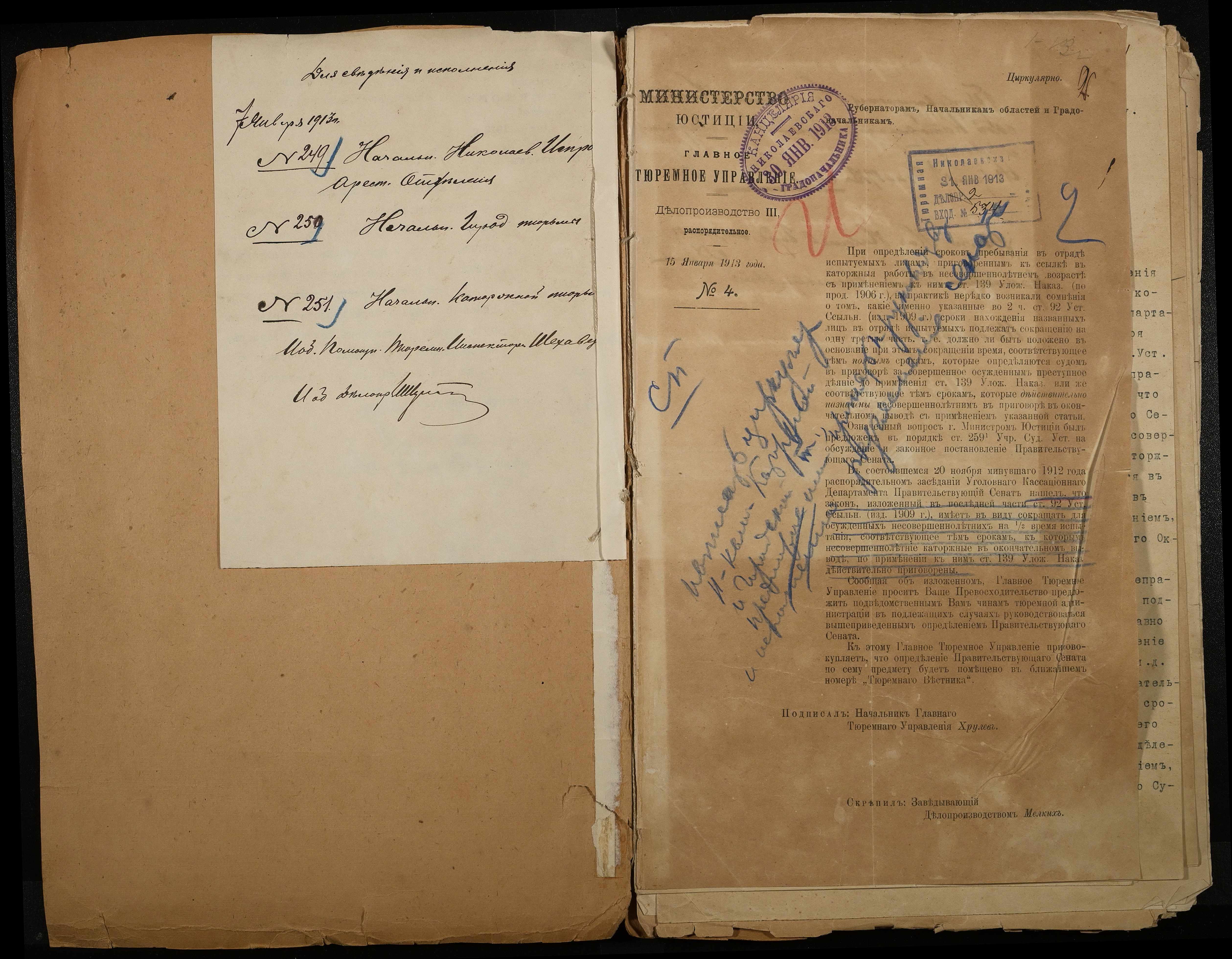 • • • • Справа № 93 Обіжники Головного тюремного управління та листування з ним, начальниками місць ув’язнення м. Миколаїв про скорочення строків відбування покарання для неповнолітніх арештантів, надання пільг, прощення або скорочення строків ув’язнення арештантам та висланцям відповідно до Маніфесту 21-го лютого 1913 року; порядок надання відомостей про рух арештантів та ін.