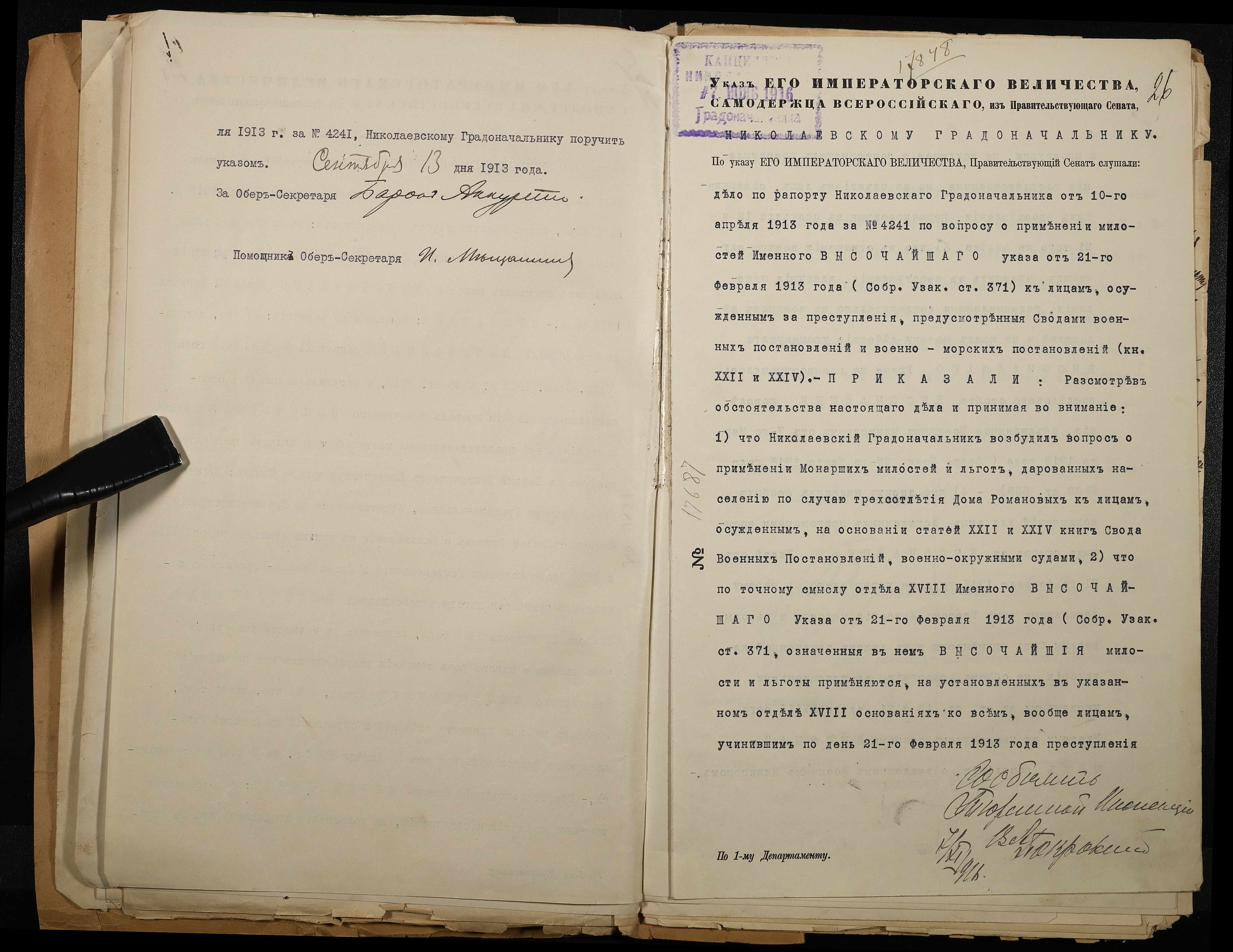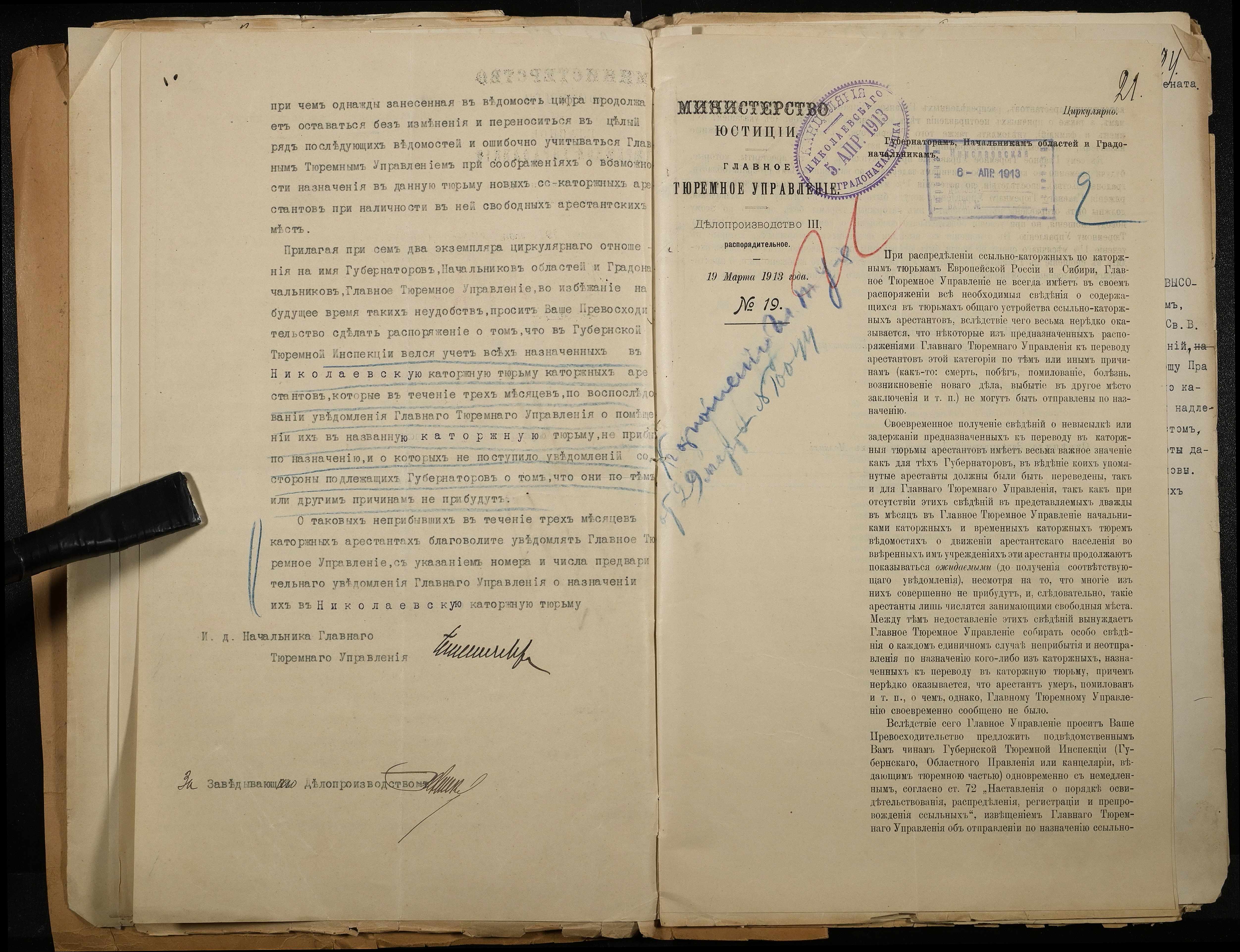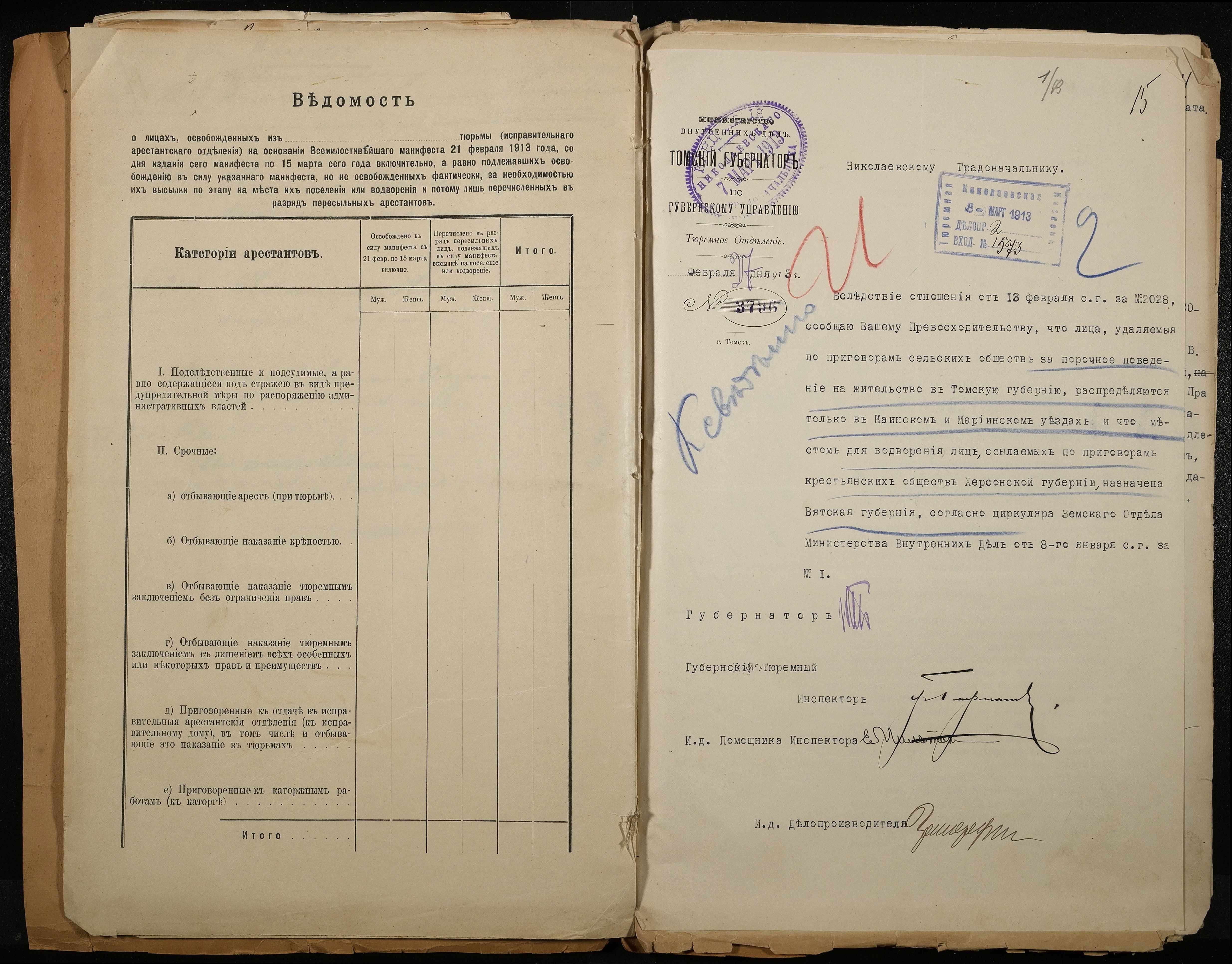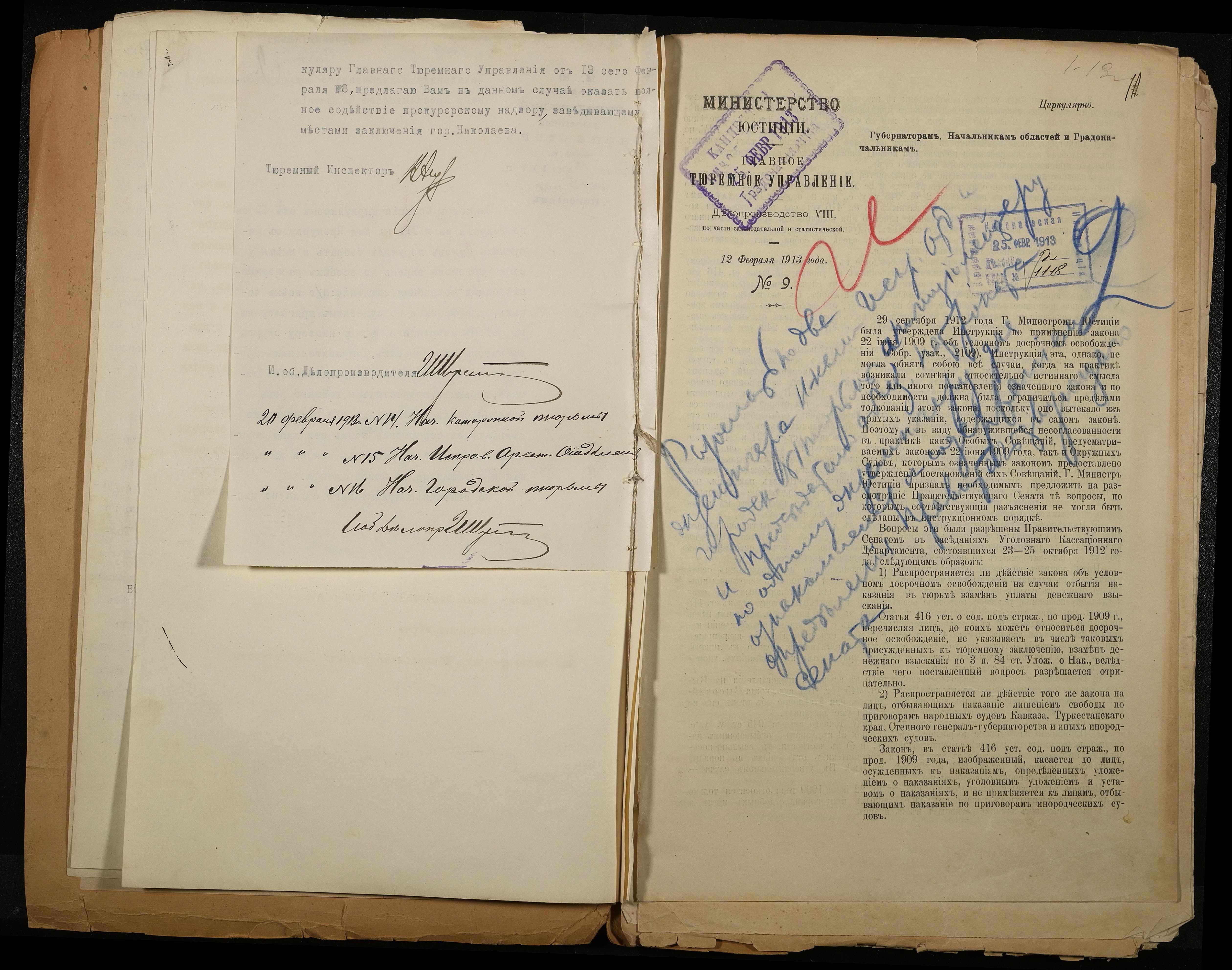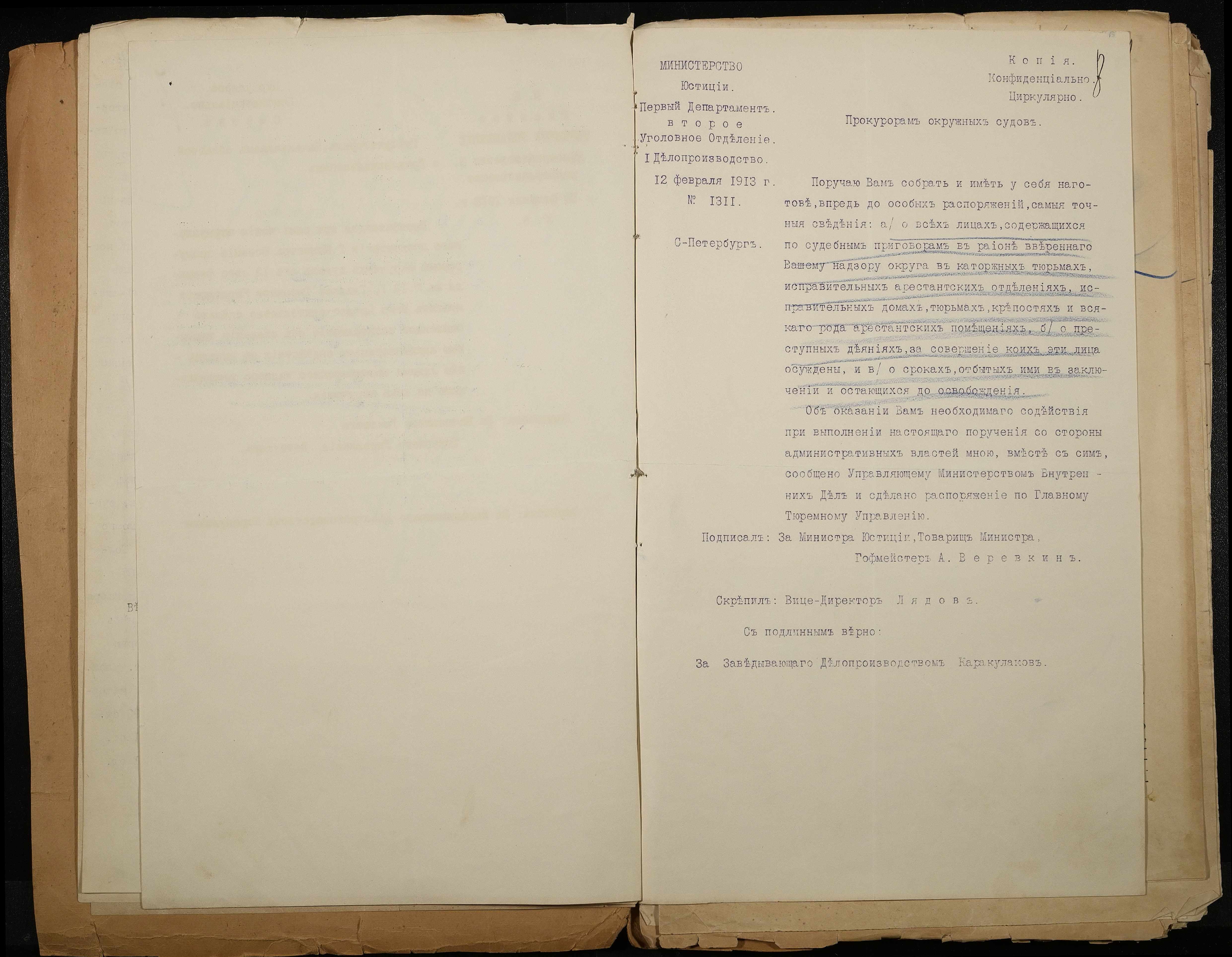 • • • • Справа № 93 Обіжники Головного тюремного управління та листування з ним, начальниками місць ув’язнення м. Миколаїв про скорочення строків відбування покарання для неповнолітніх арештантів, надання пільг, прощення або скорочення строків ув’язнення арештантам та висланцям відповідно до Маніфесту 21-го лютого 1913 року; порядок надання відомостей про рух арештантів та ін.