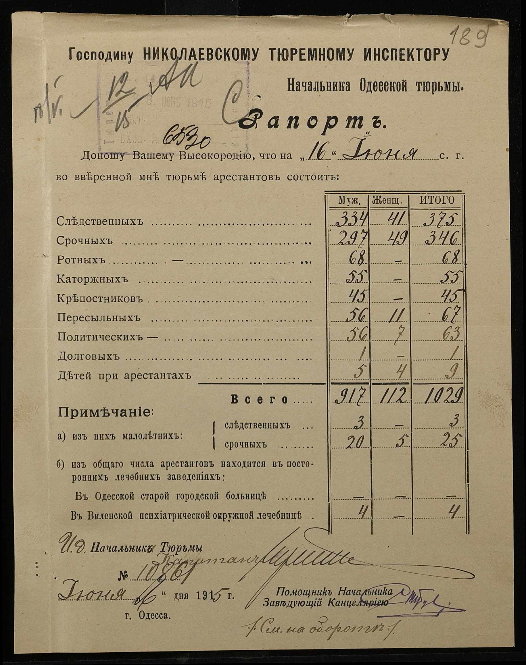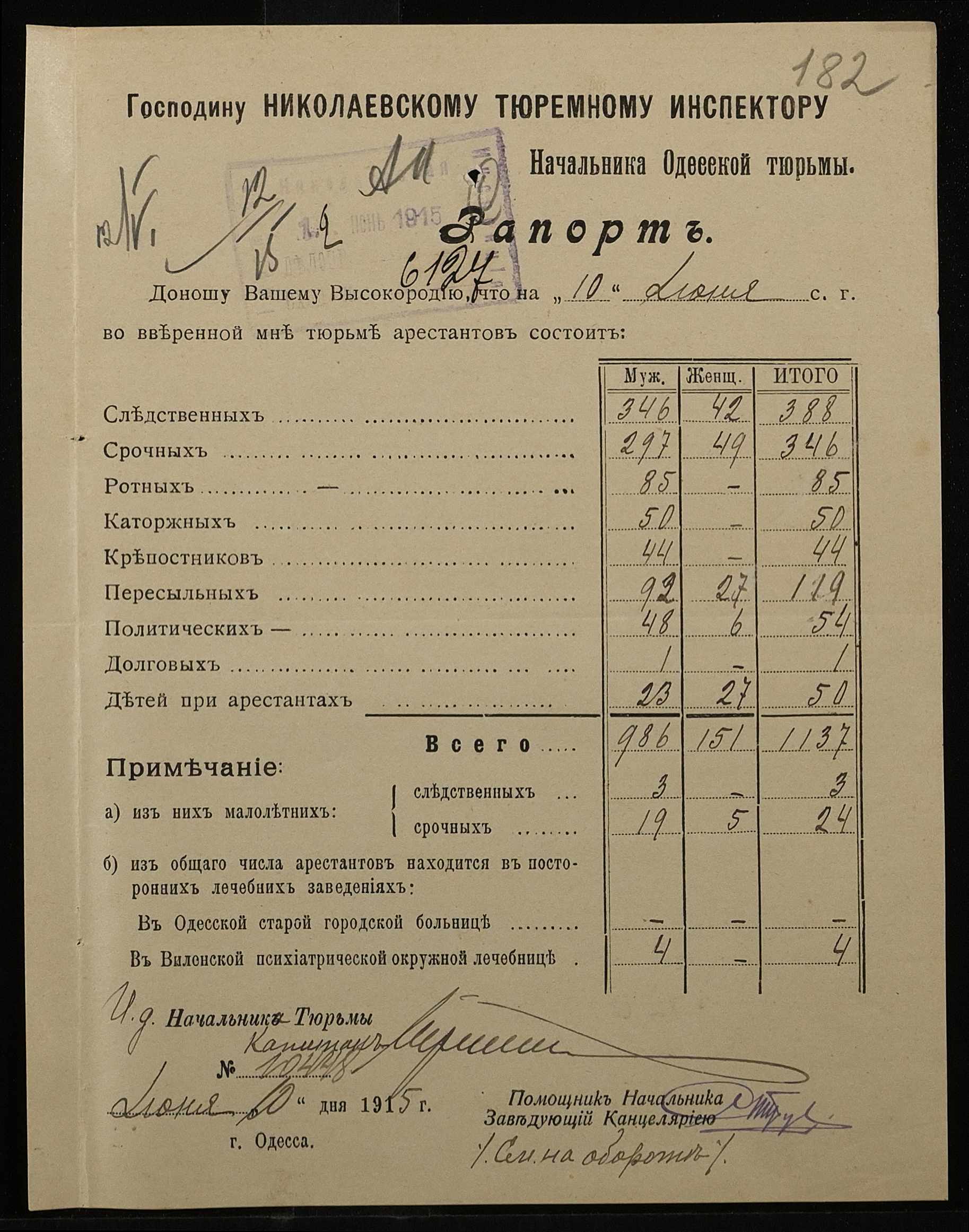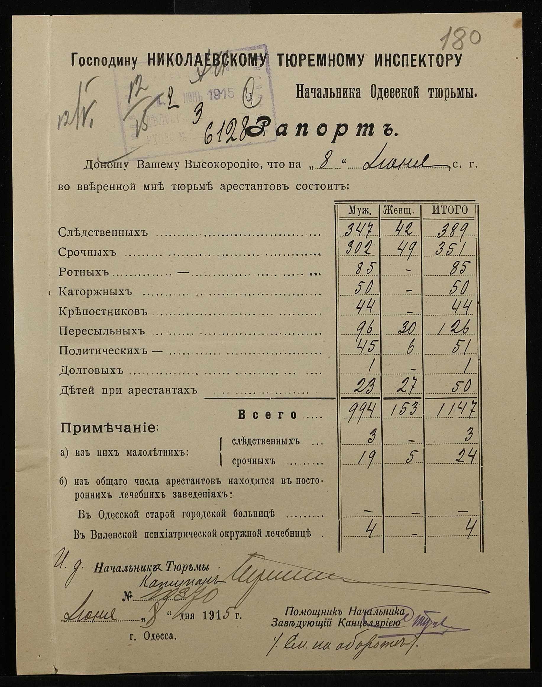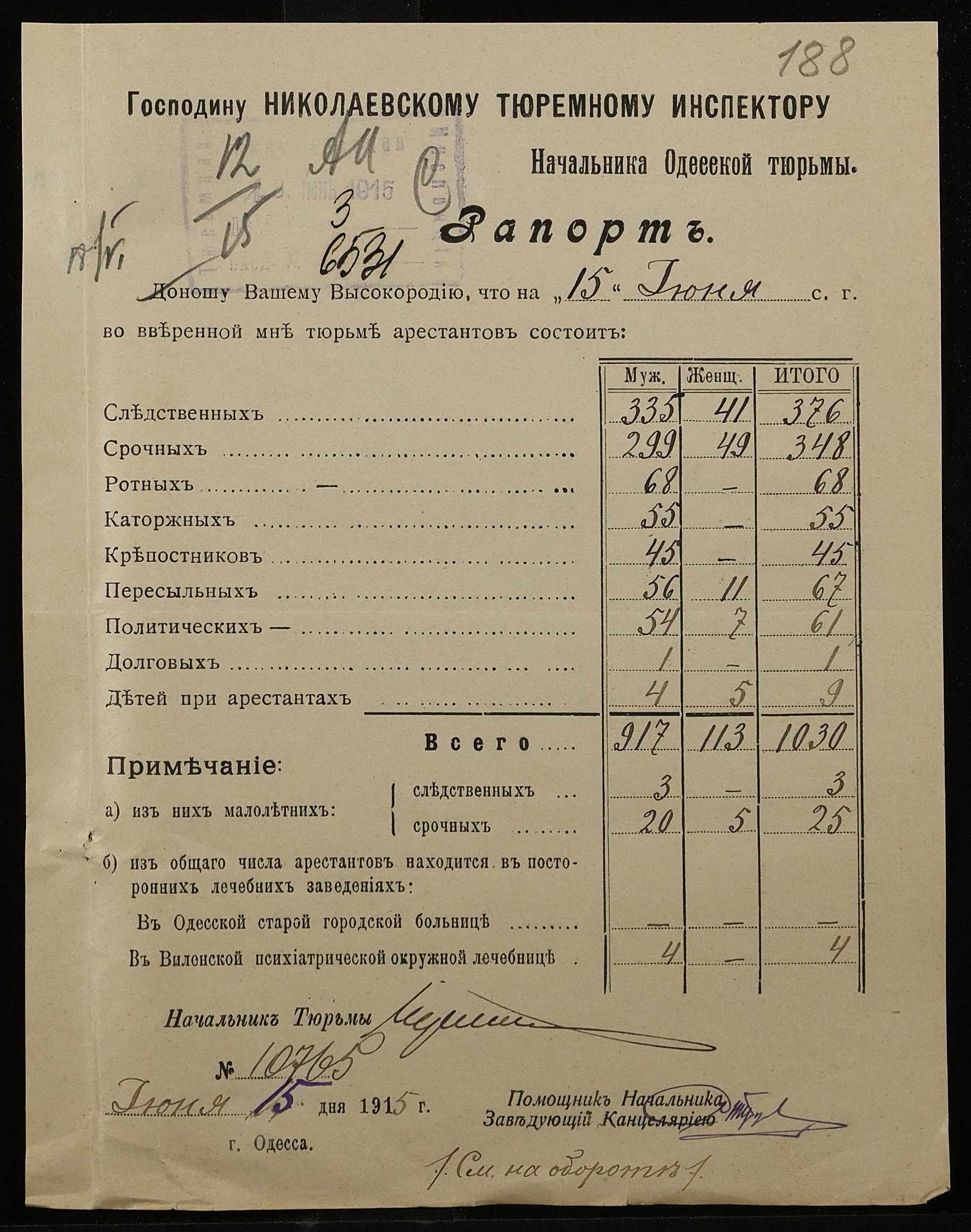 • • • • Справа № 114 Рапорти начальника Одеської тюрми миколаївському тюремному інспектору про склад арештантів