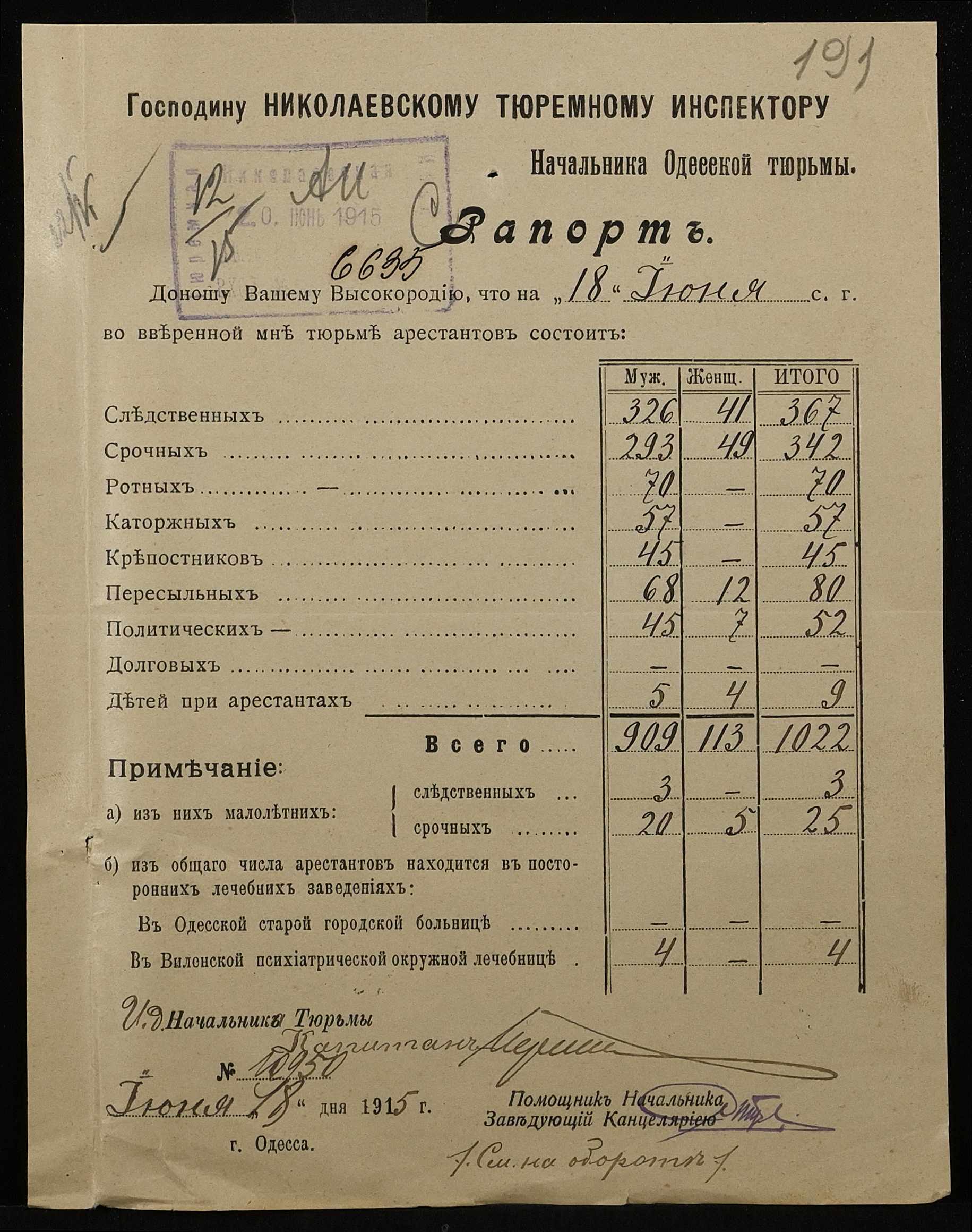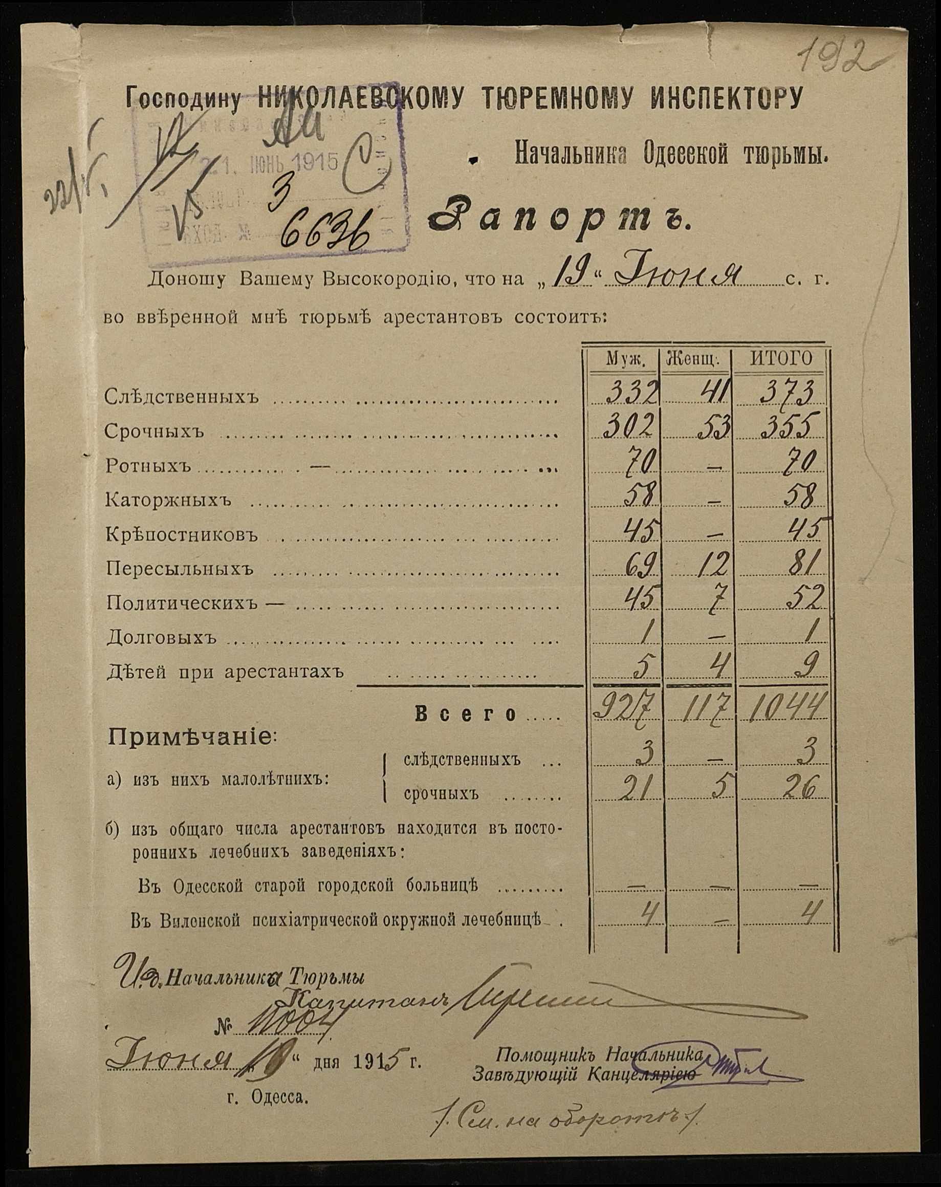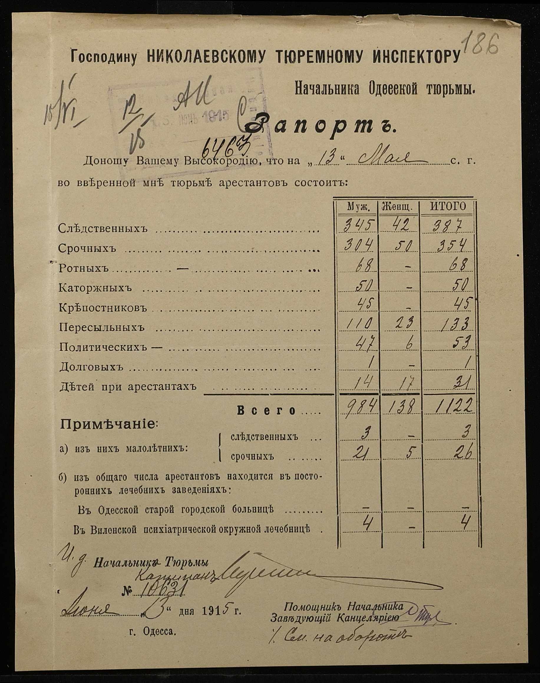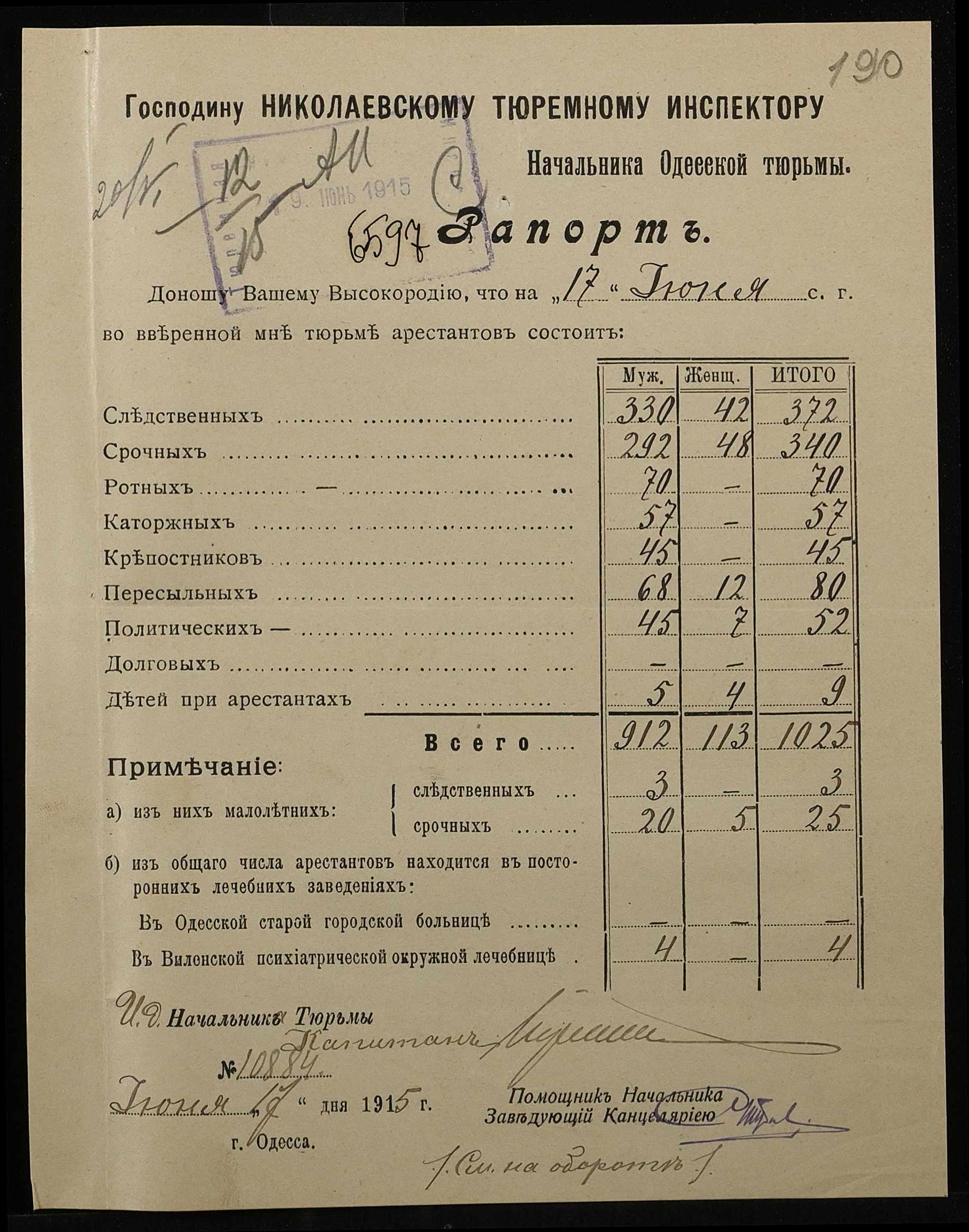 • • • • Справа № 114 Рапорти начальника Одеської тюрми миколаївському тюремному інспектору про склад арештантів
