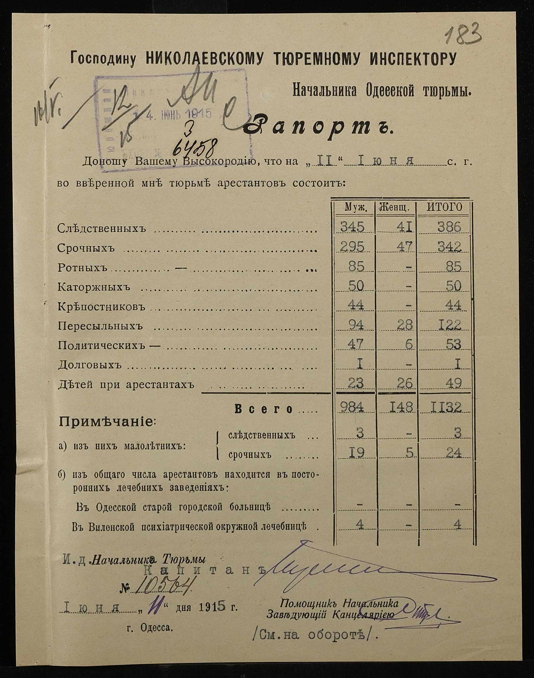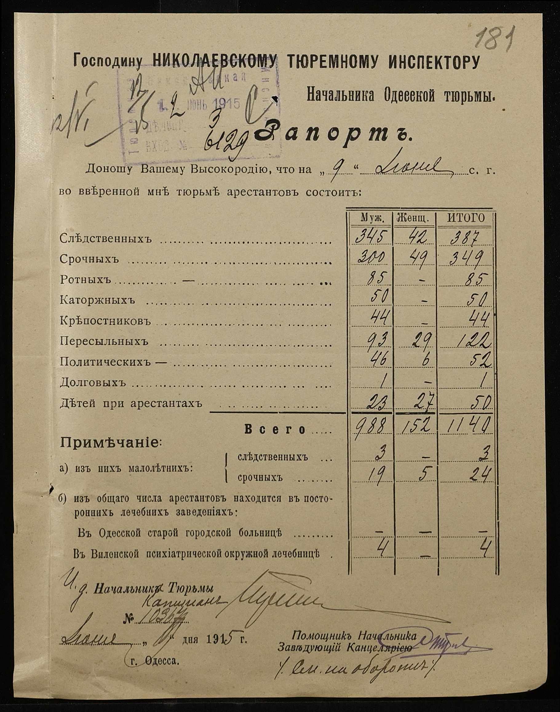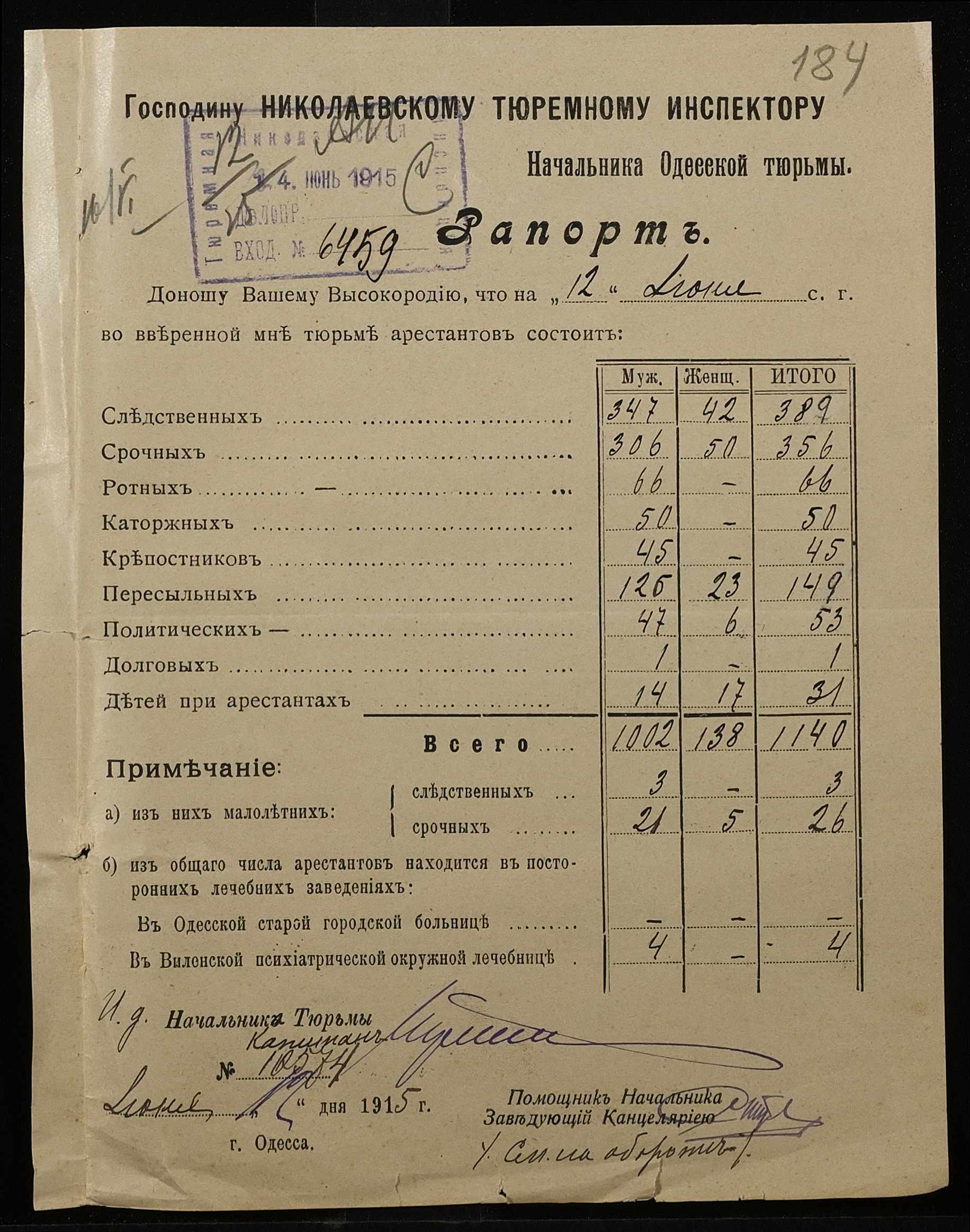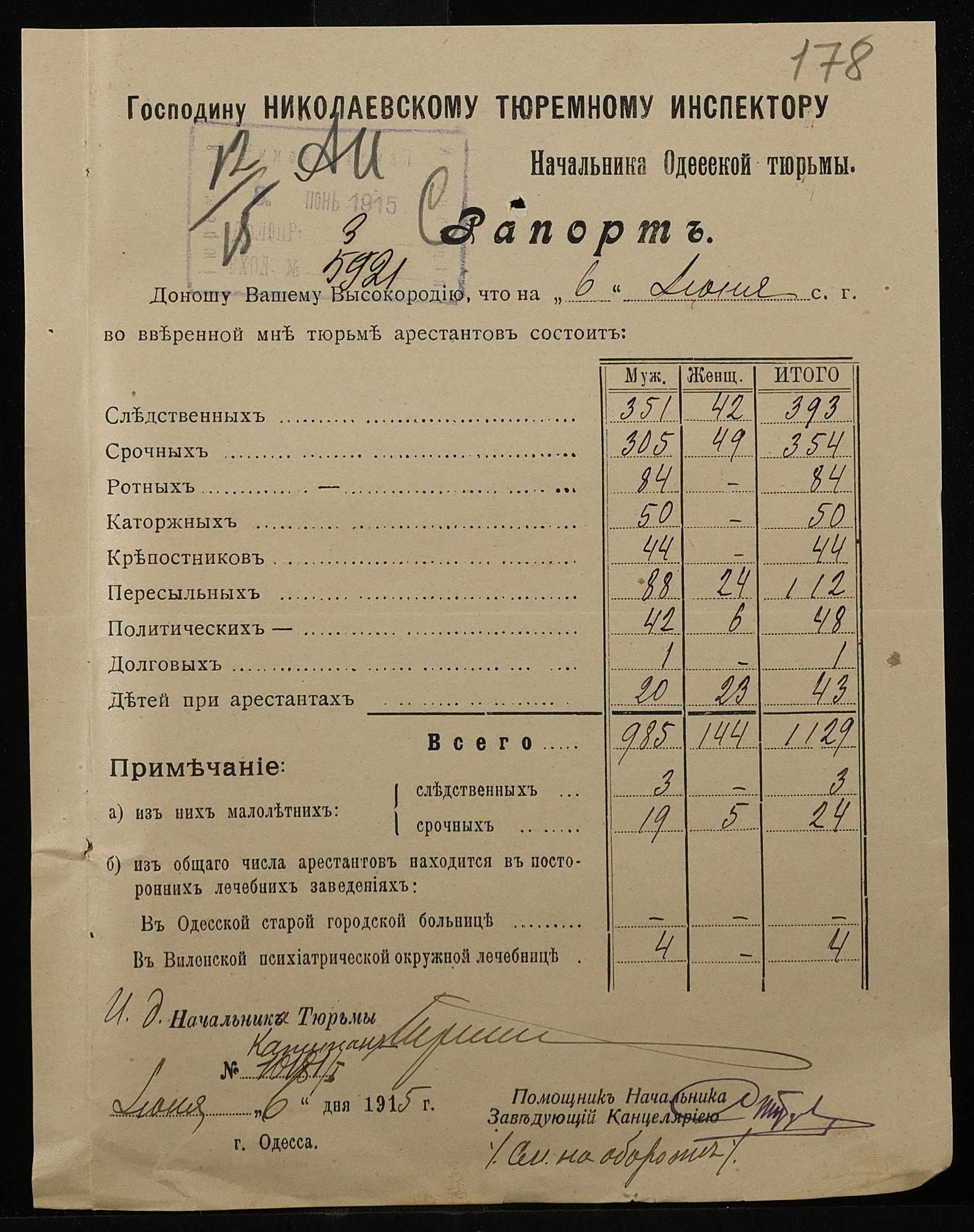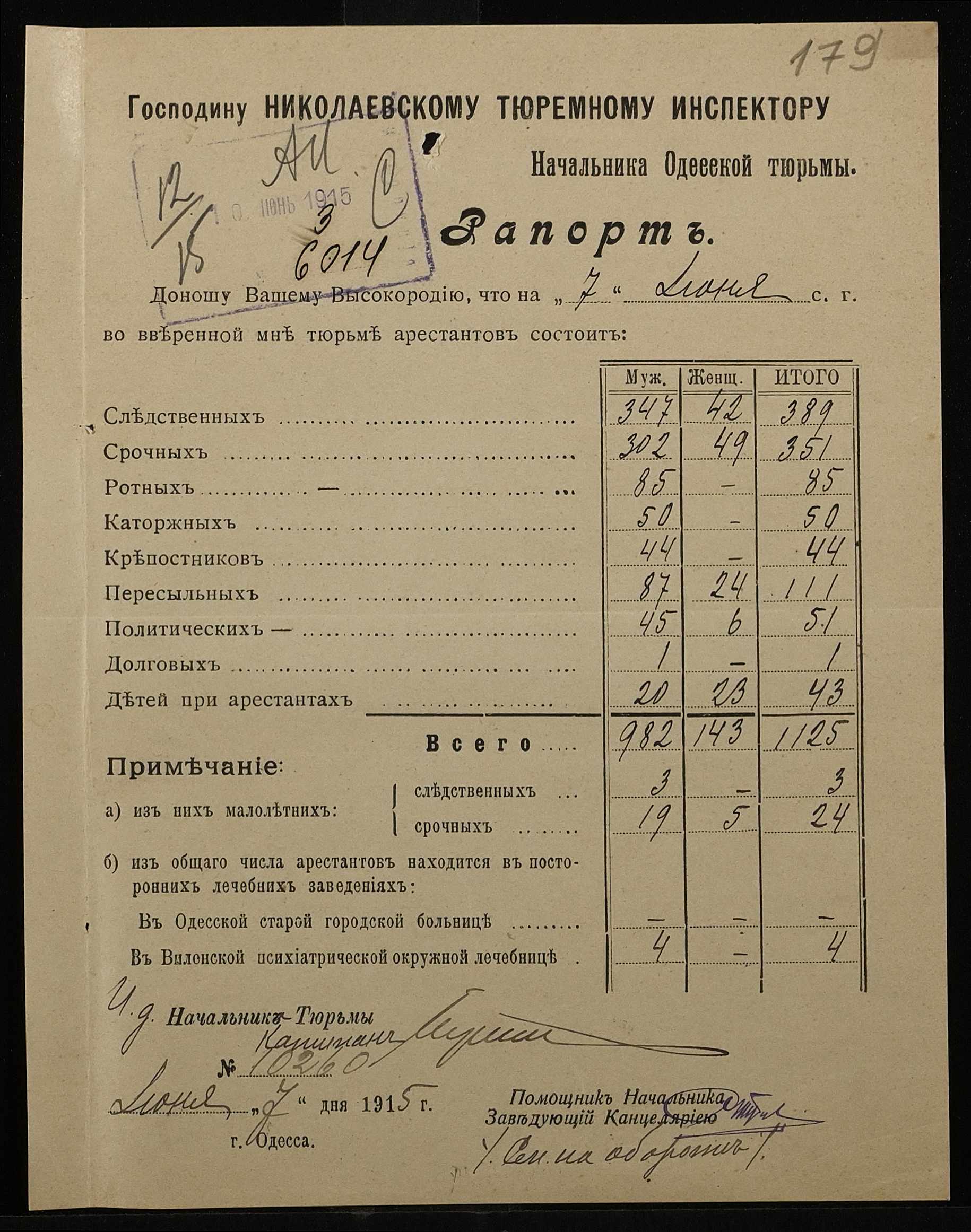 • • • • Справа № 114 Рапорти начальника Одеської тюрми миколаївському тюремному інспектору про склад арештантів