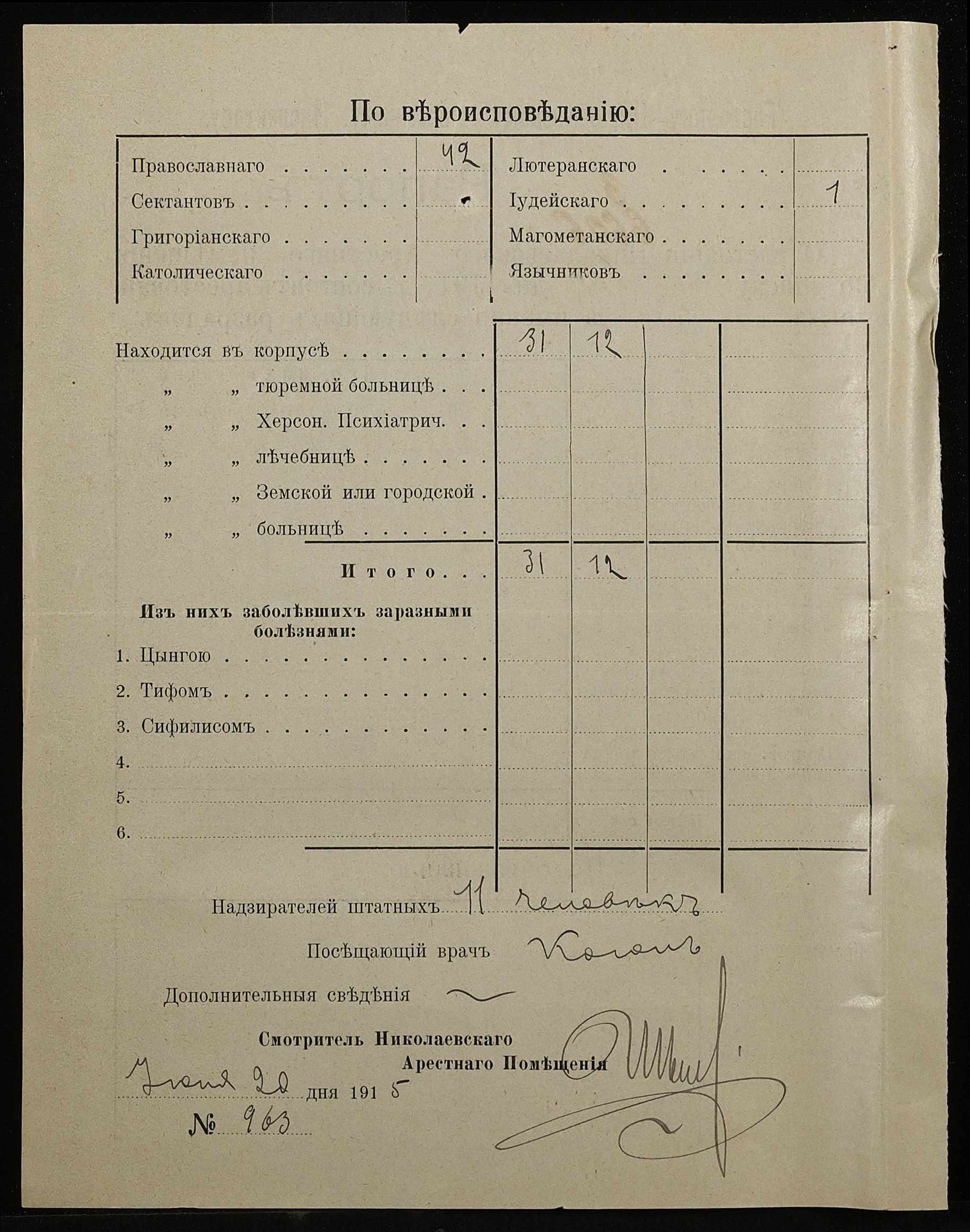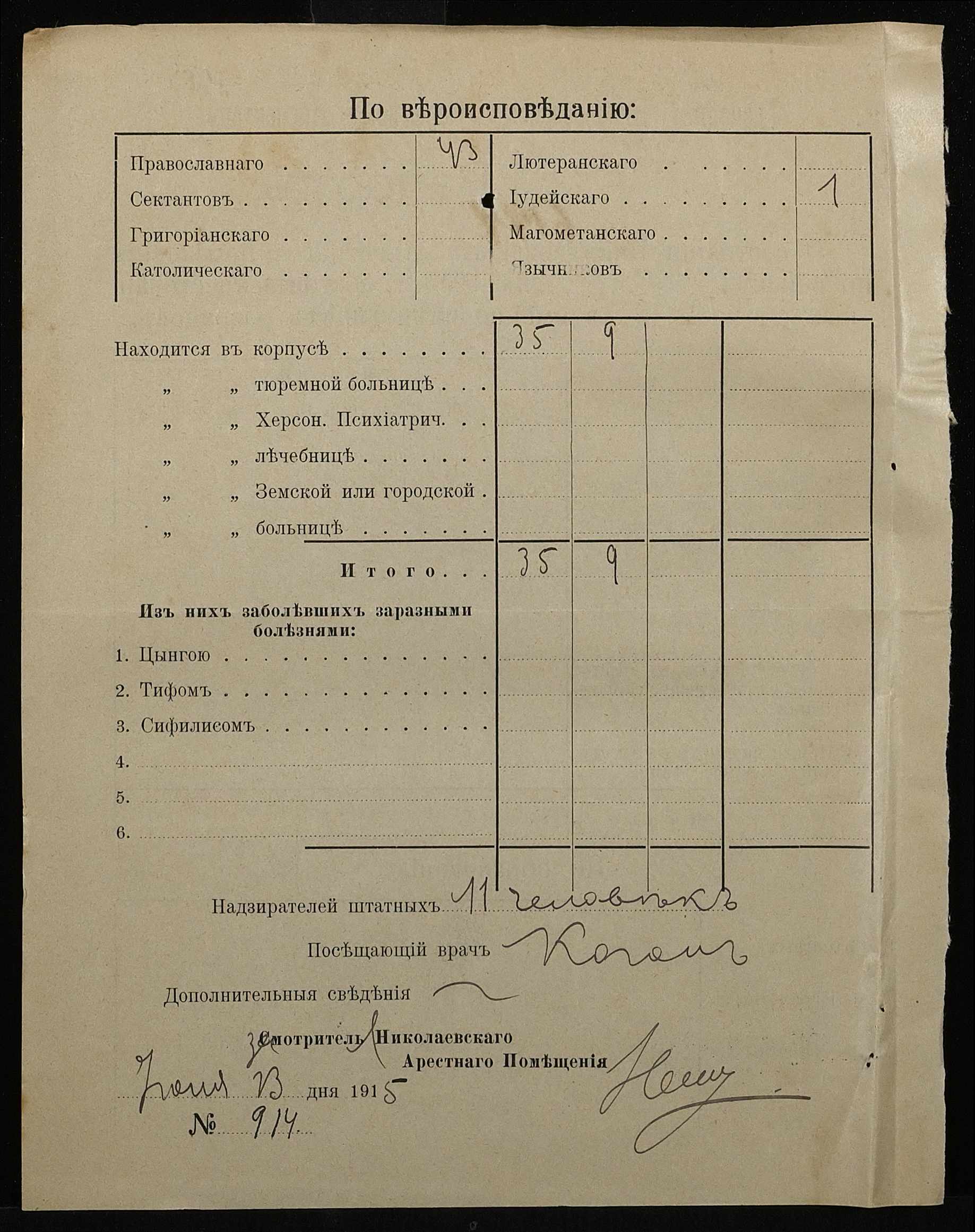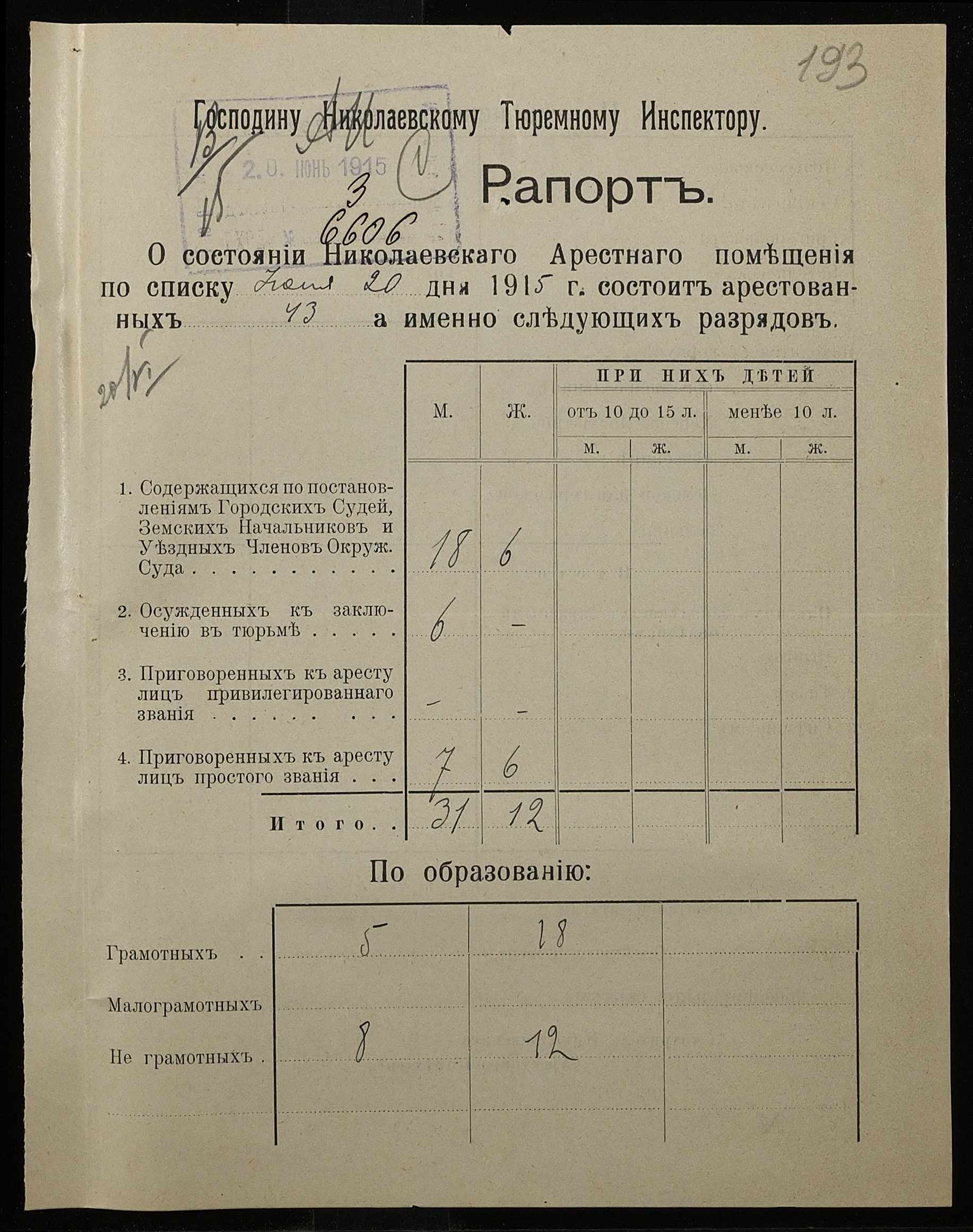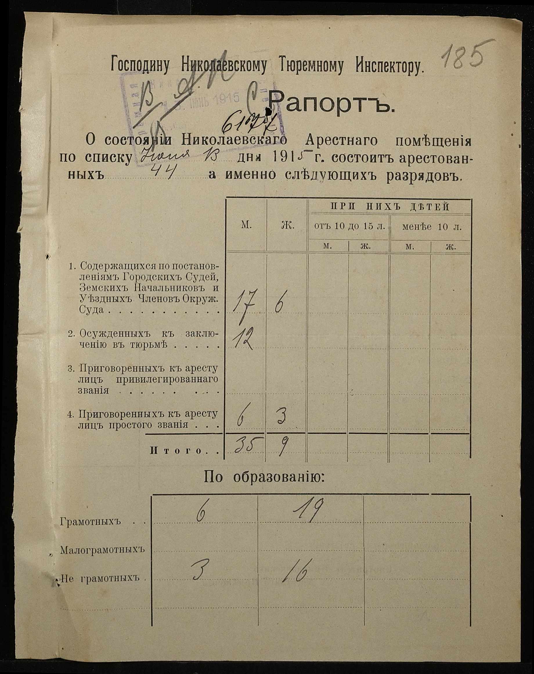 • • • • Справа № 114 Рапорти начальника Одеської тюрми миколаївському тюремному інспектору про склад арештантів
