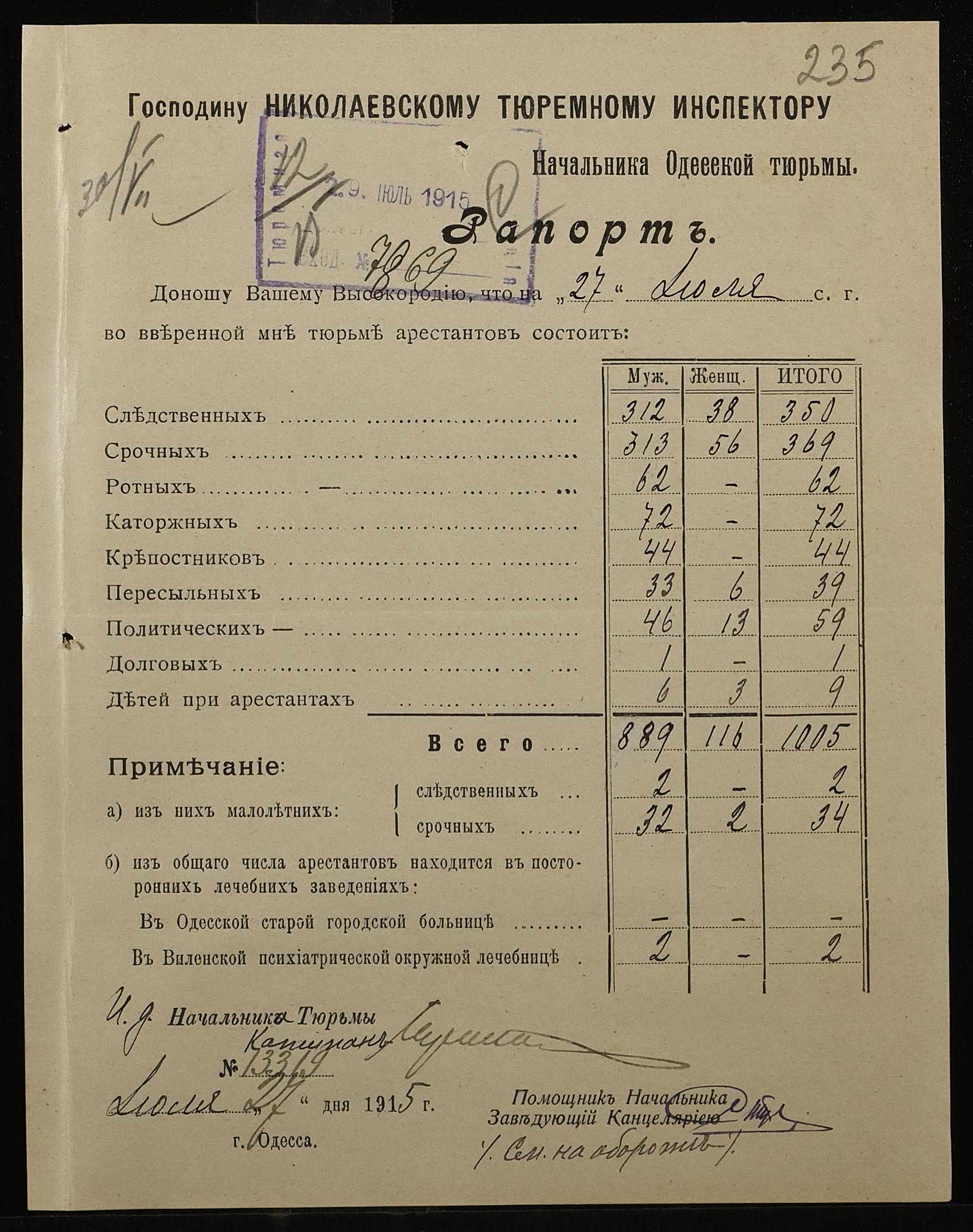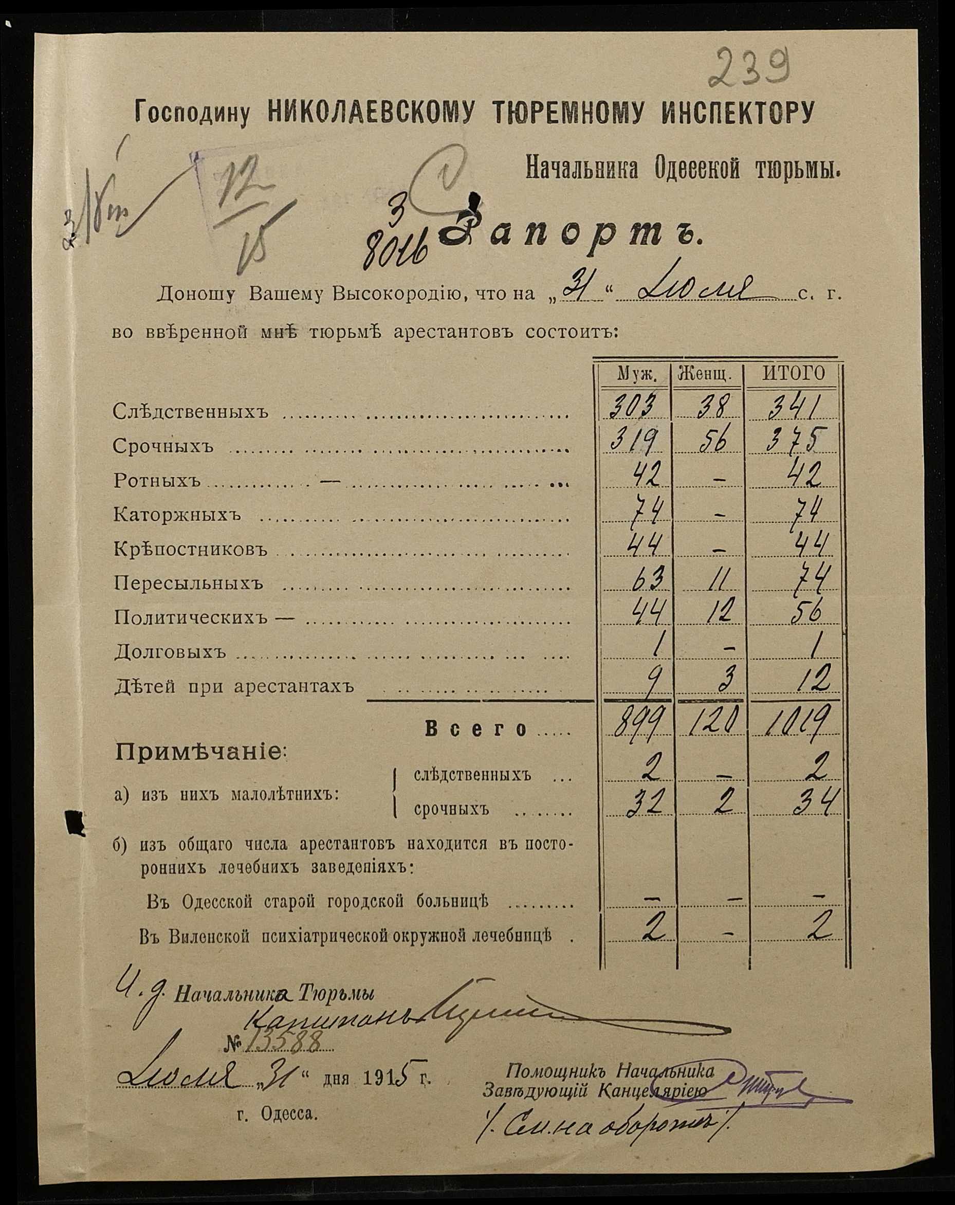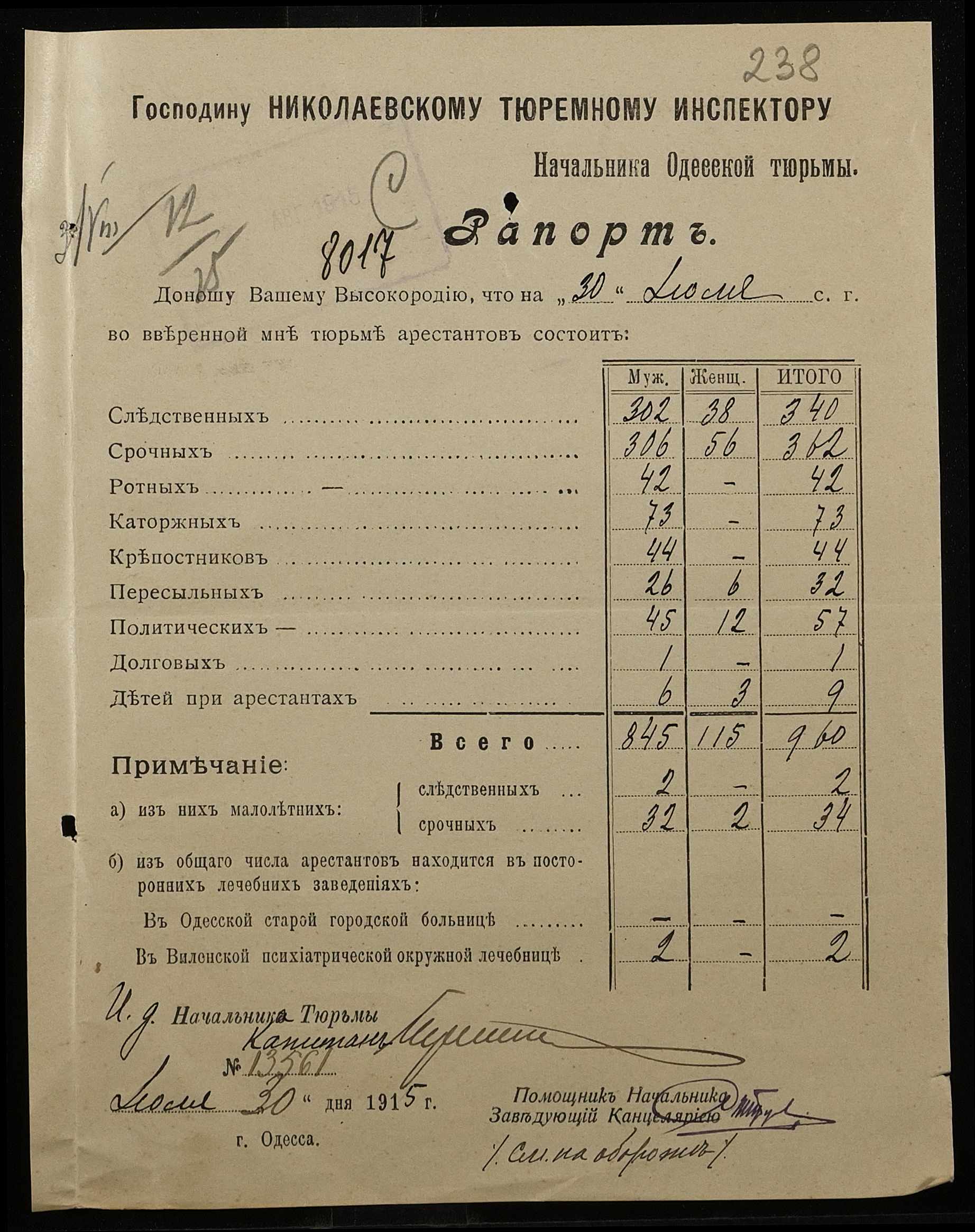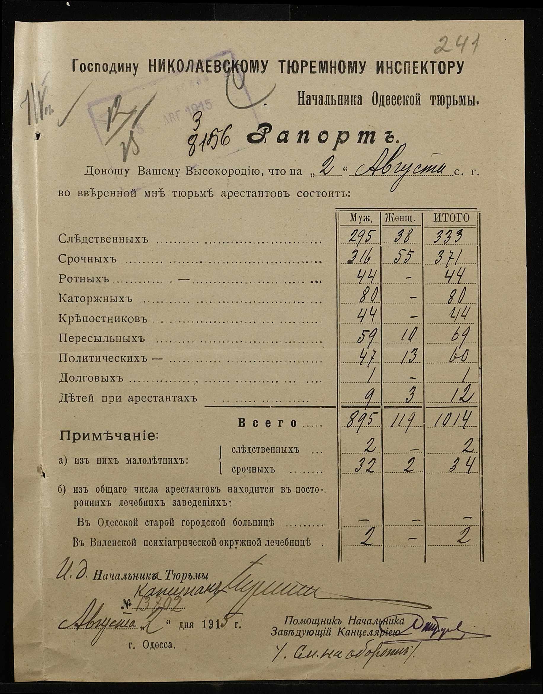 • • • • Справа № 114 Рапорти начальника Одеської тюрми миколаївському тюремному інспектору про склад арештантів