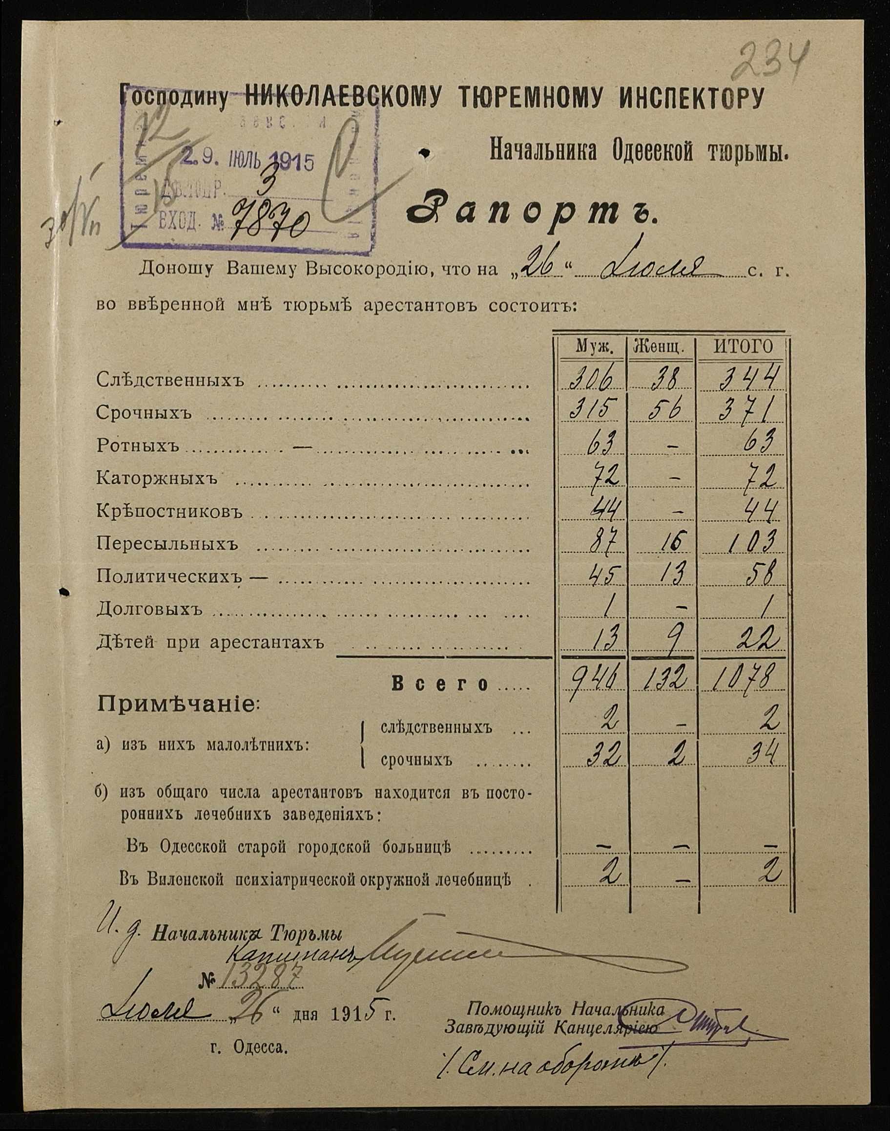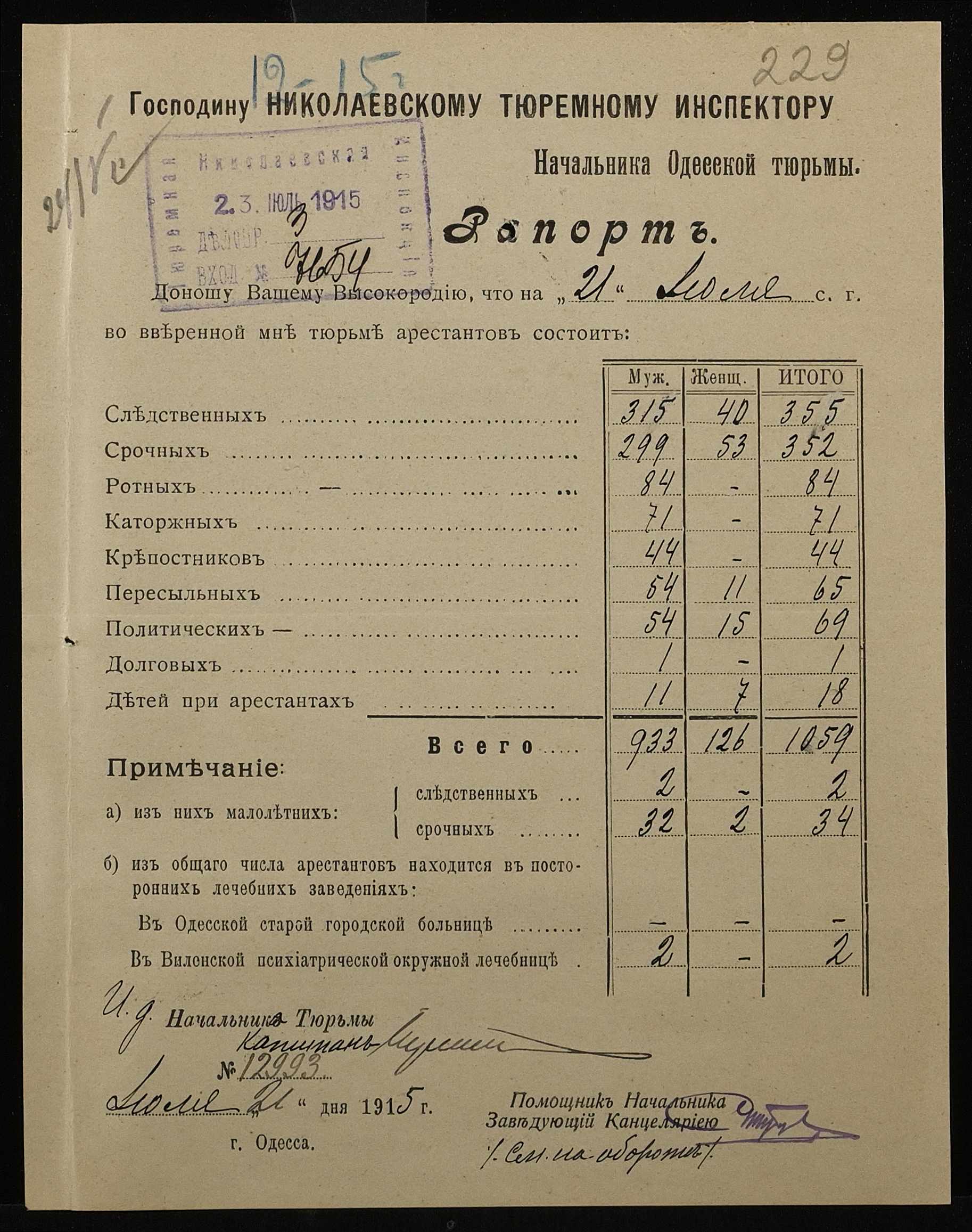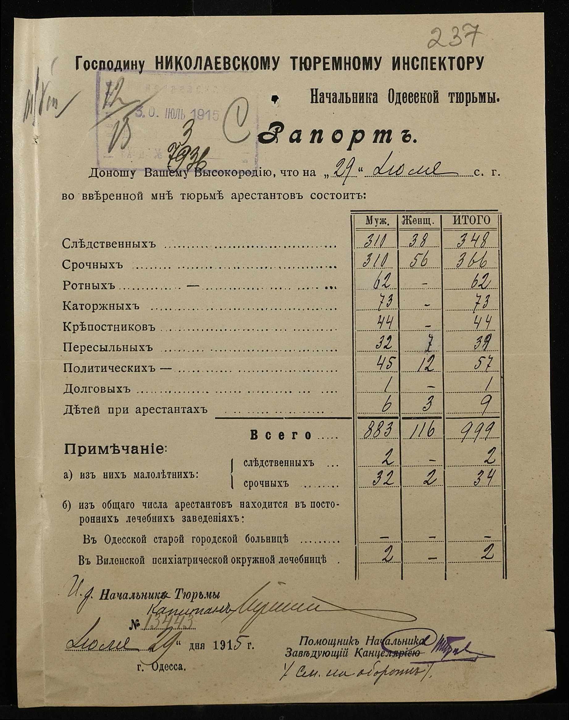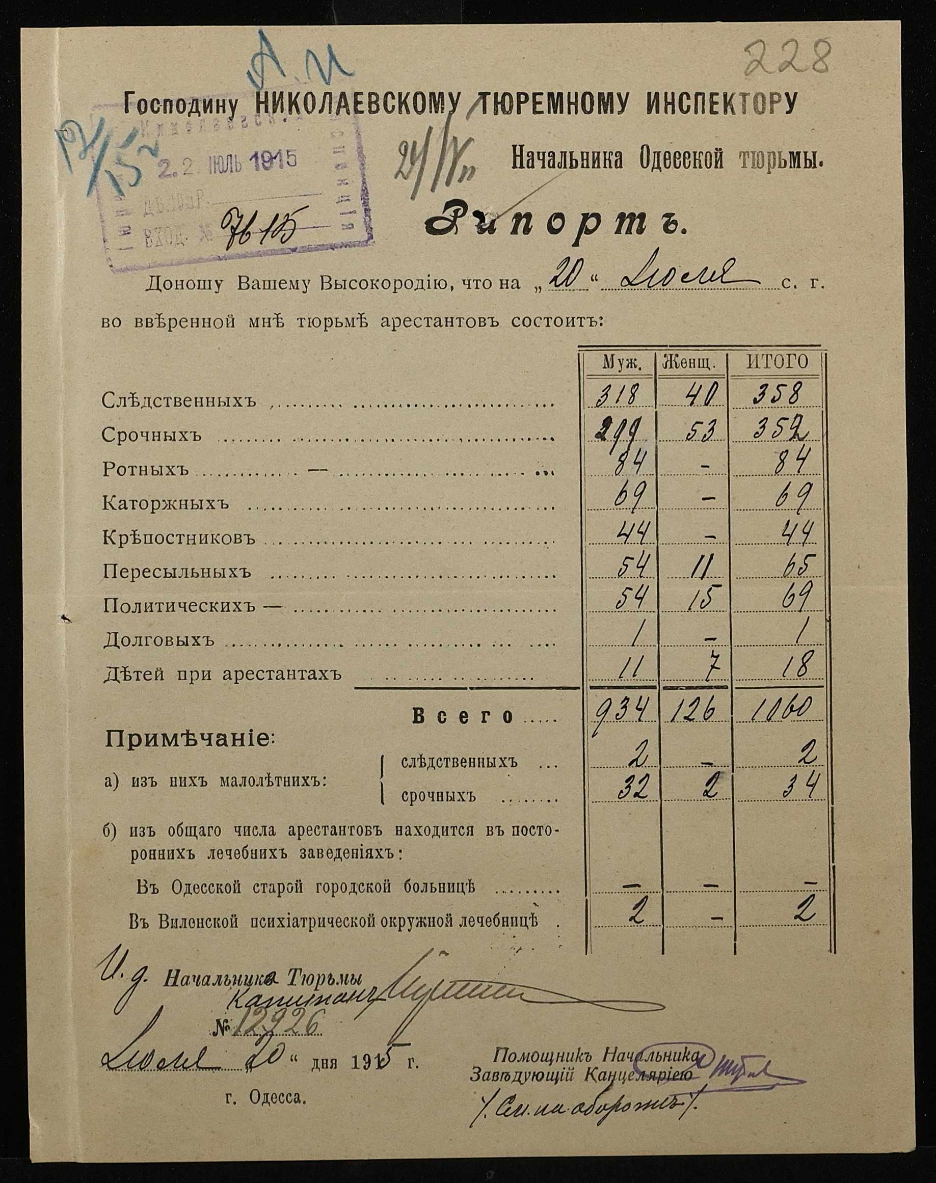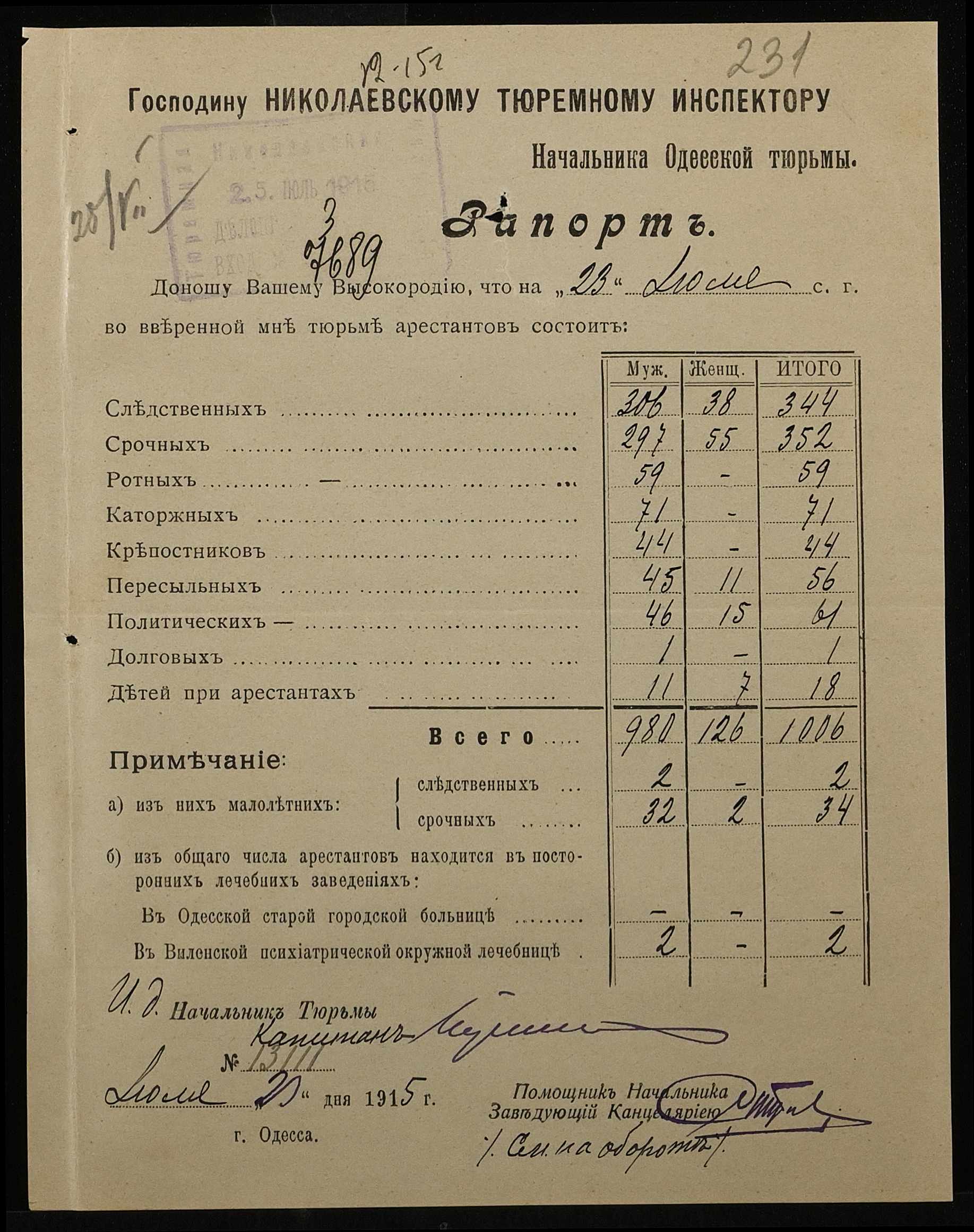 • • • • Справа № 114 Рапорти начальника Одеської тюрми миколаївському тюремному інспектору про склад арештантів
