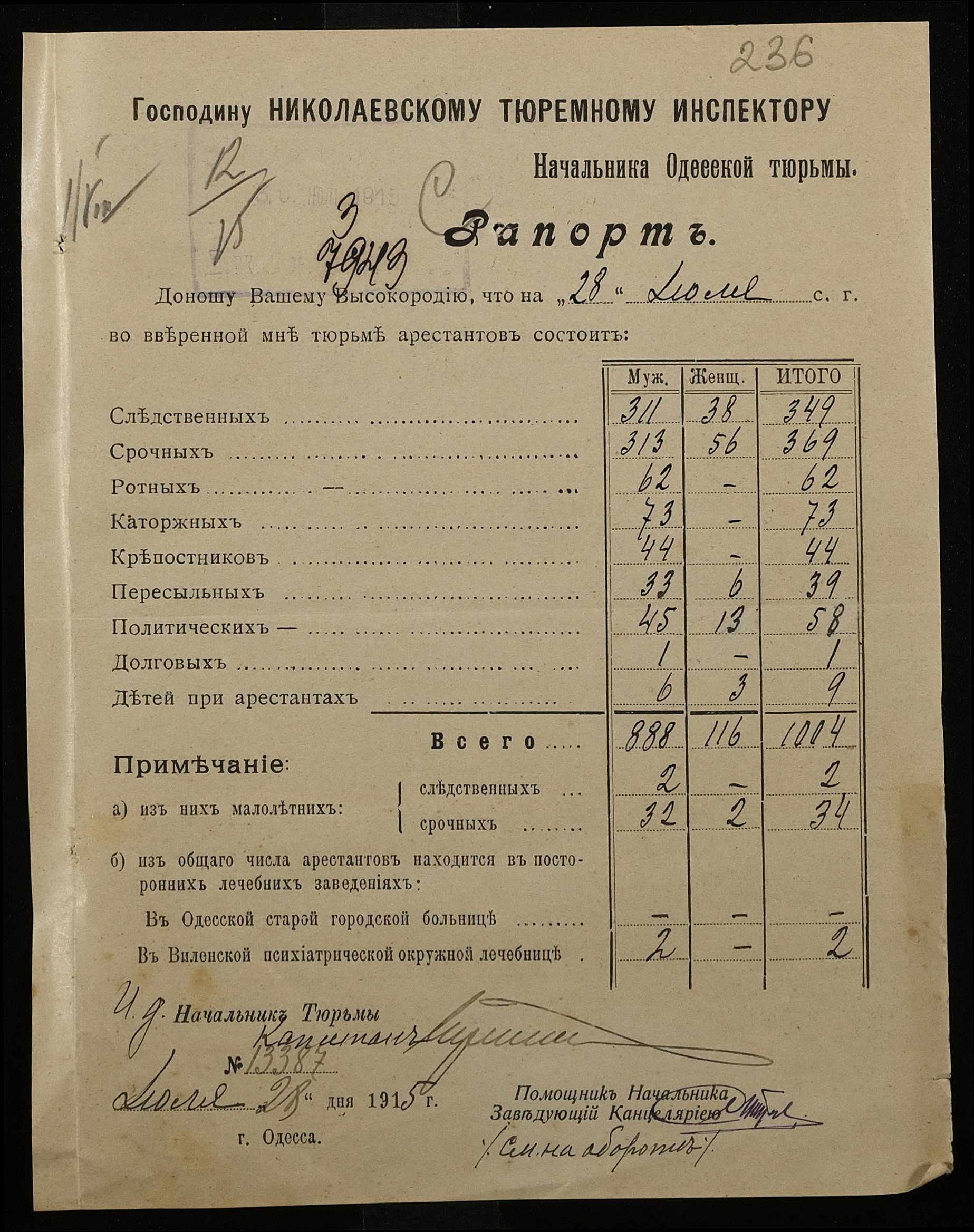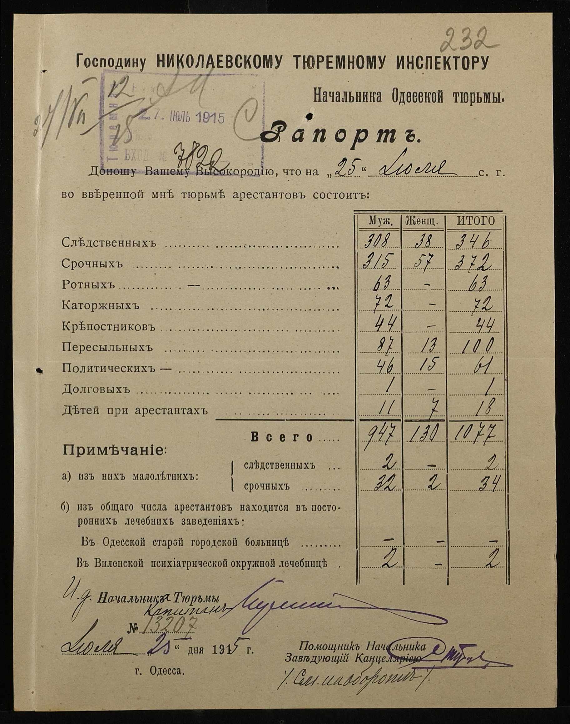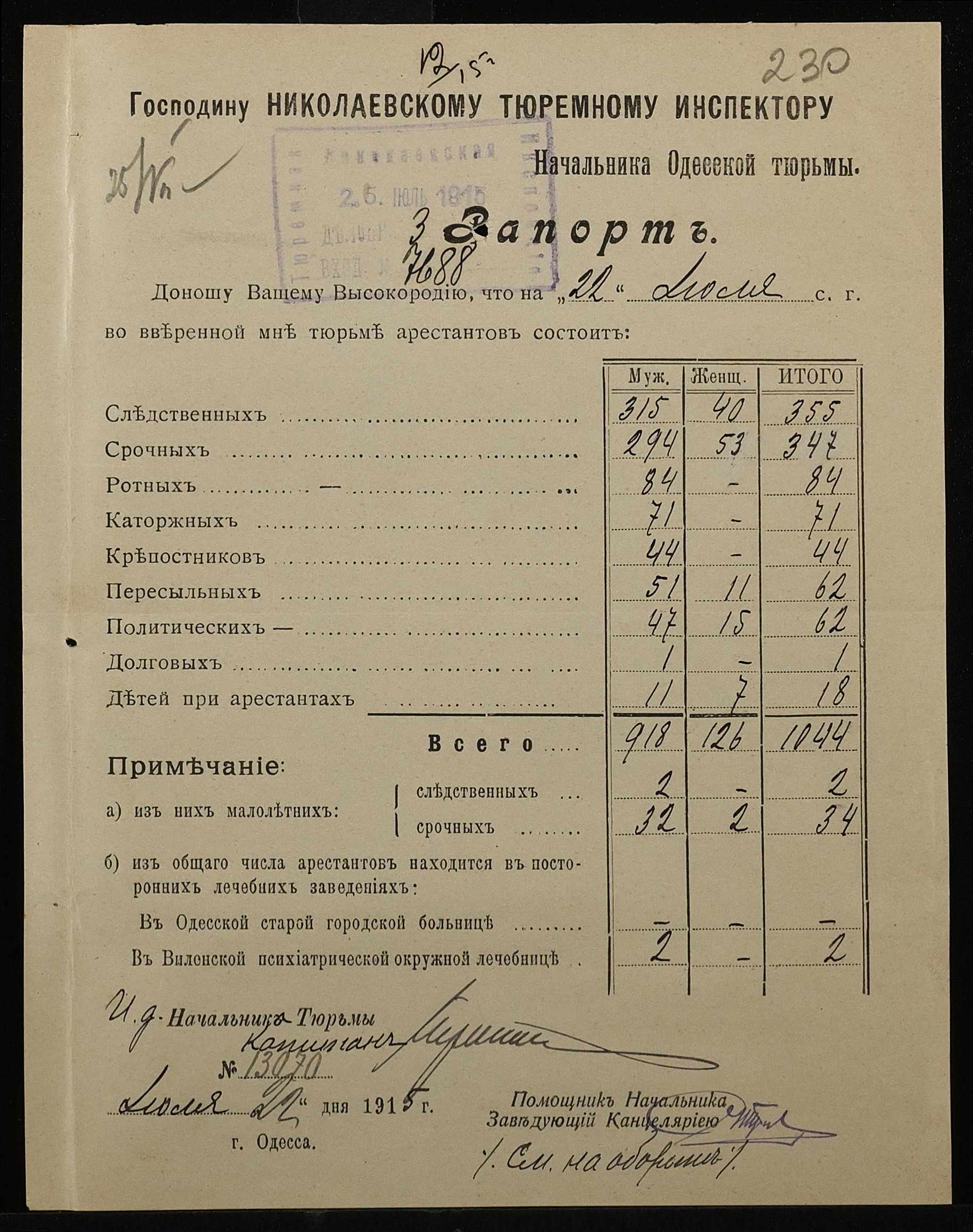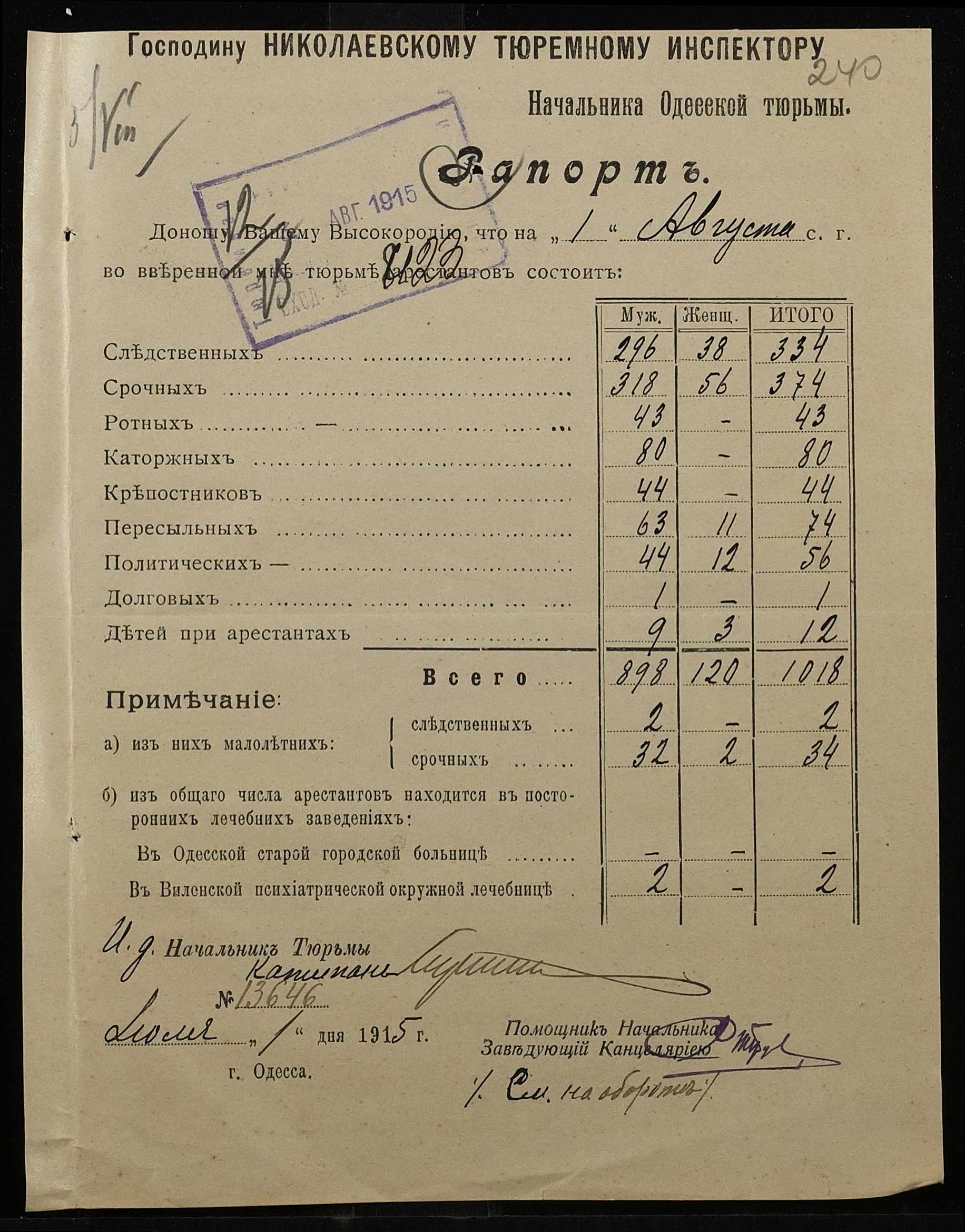 • • • • Справа № 114 Рапорти начальника Одеської тюрми миколаївському тюремному інспектору про склад арештантів