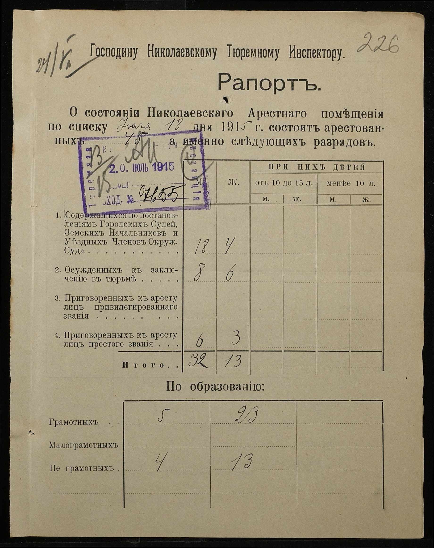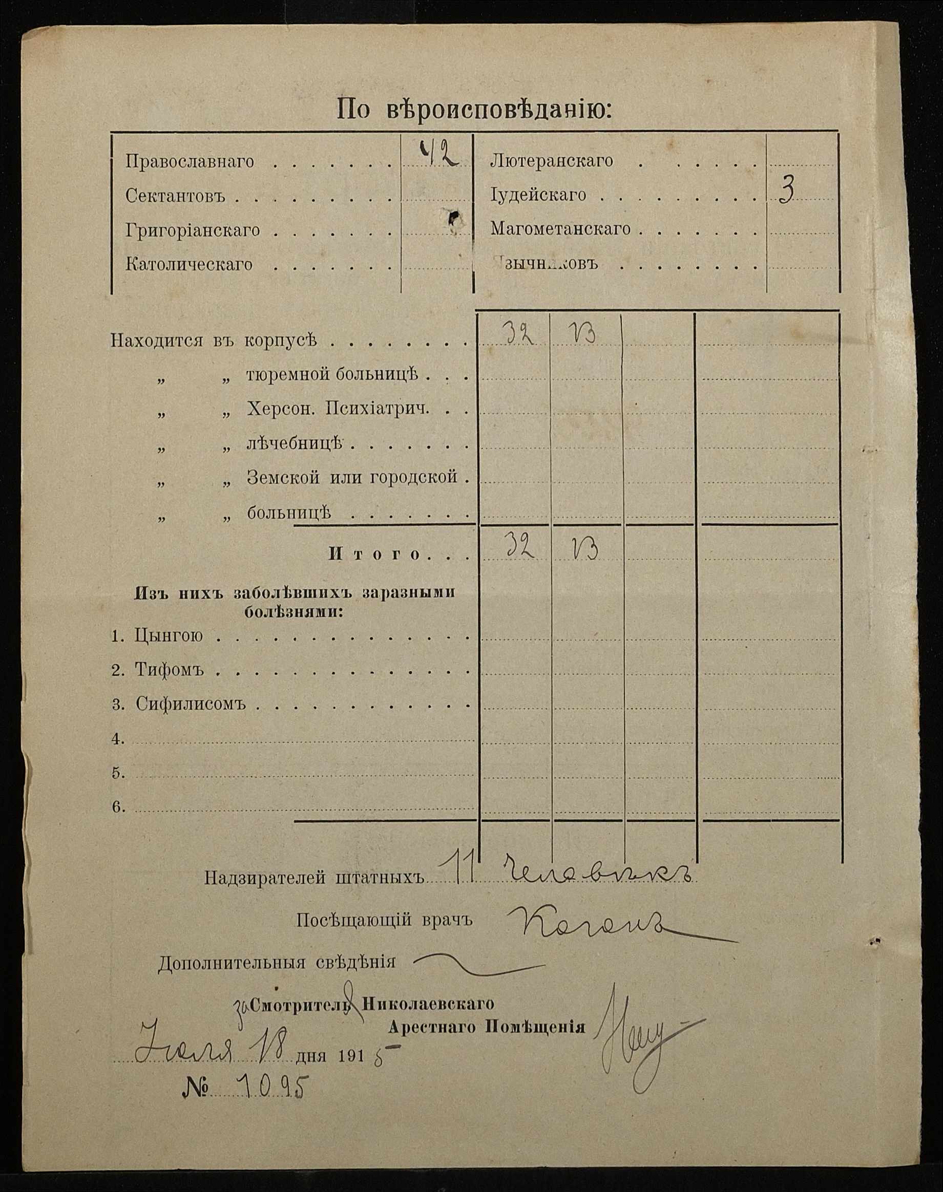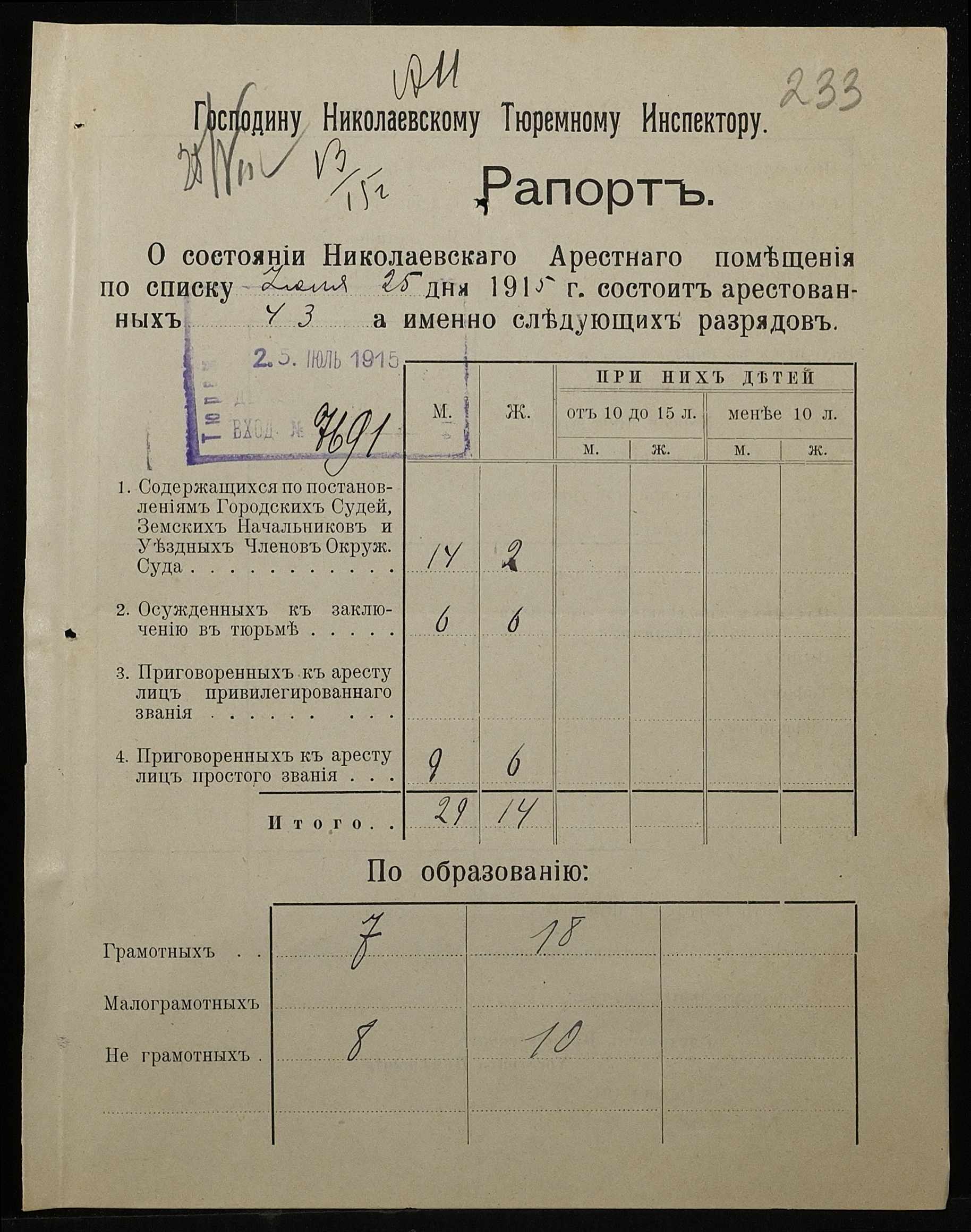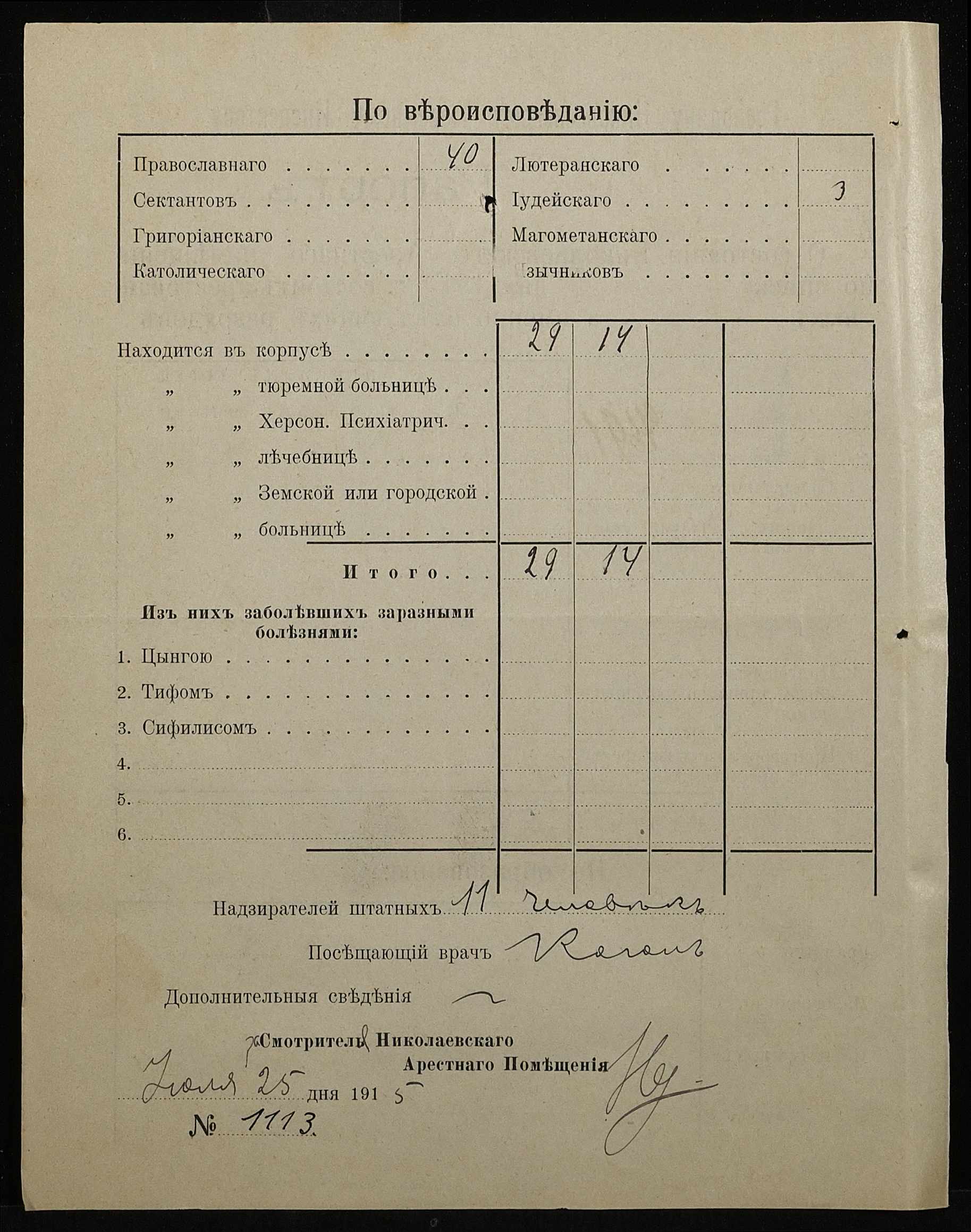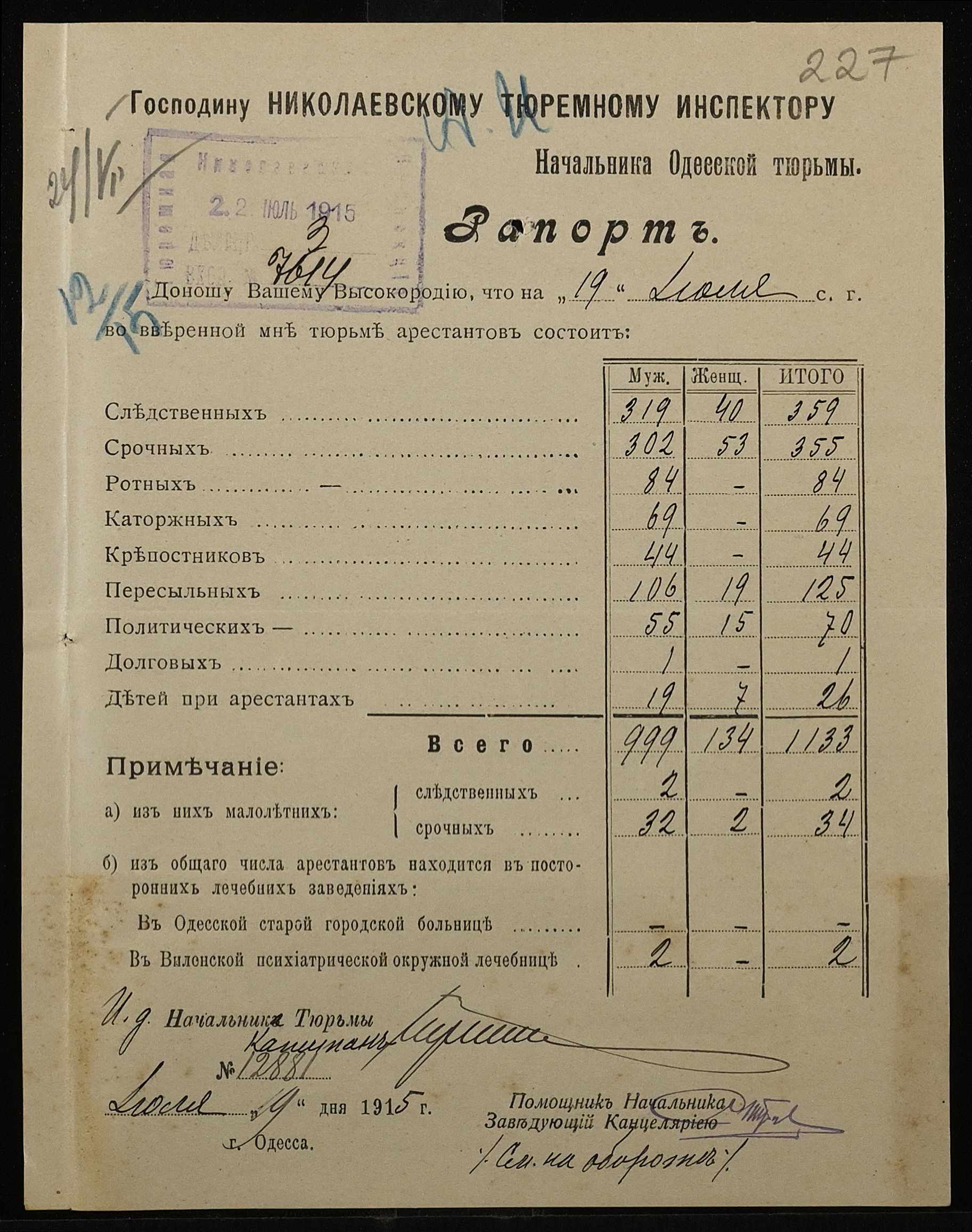 • • • • Справа № 114 Рапорти начальника Одеської тюрми миколаївському тюремному інспектору про склад арештантів