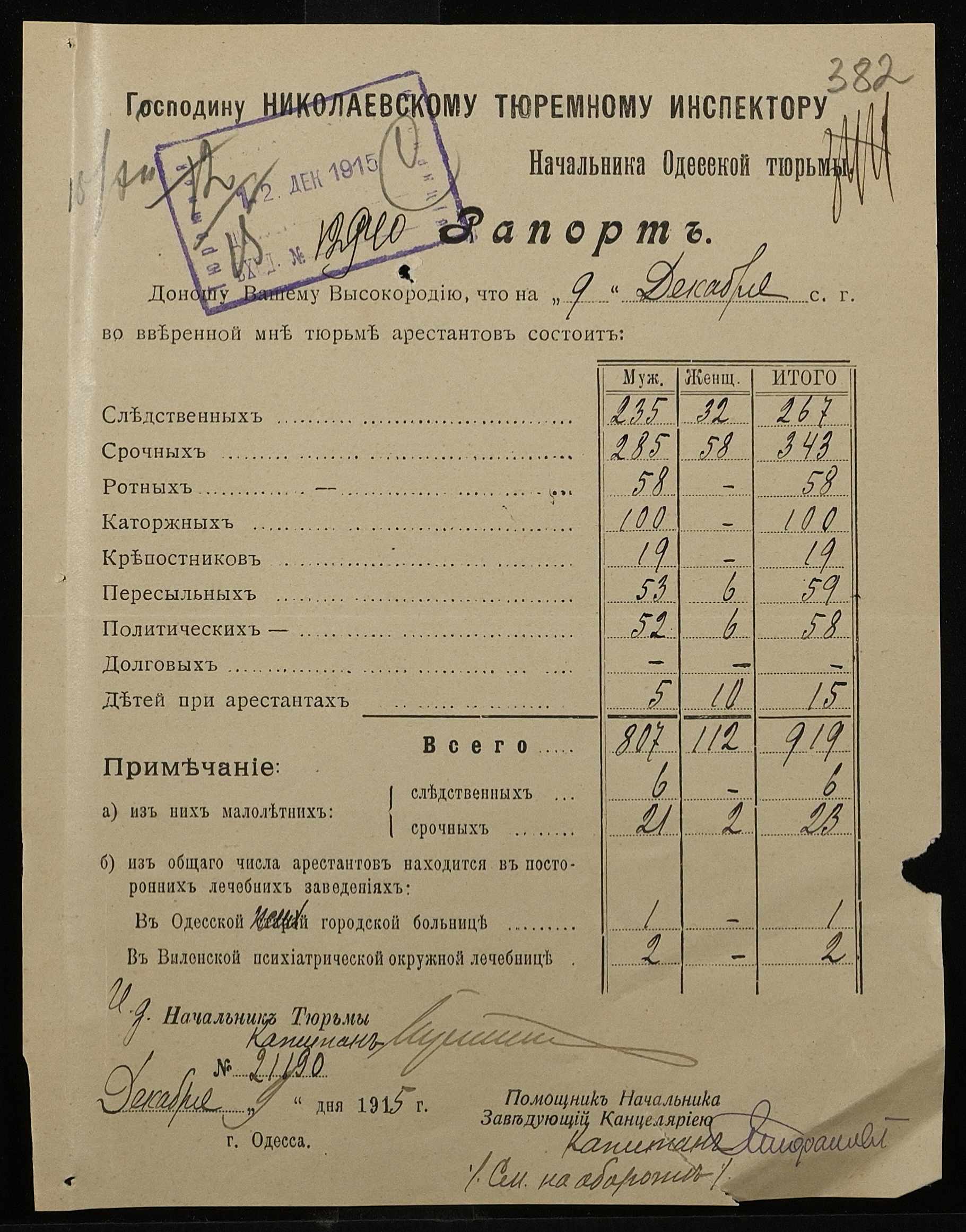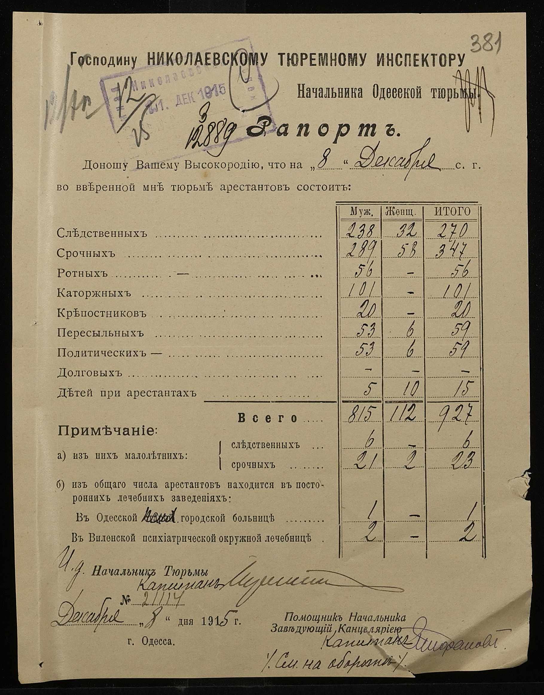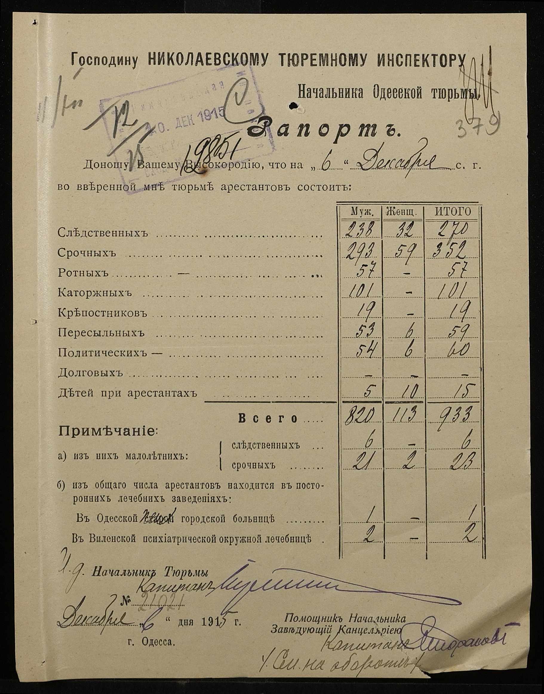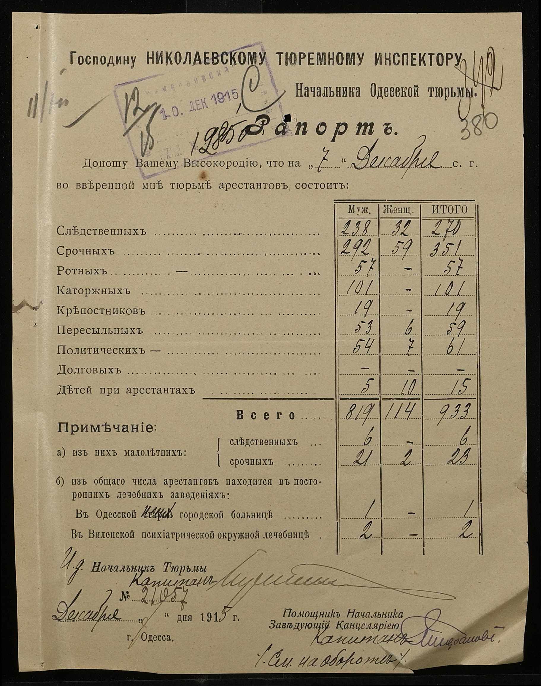 • • • • Справа № 114 Рапорти начальника Одеської тюрми миколаївському тюремному інспектору про склад арештантів