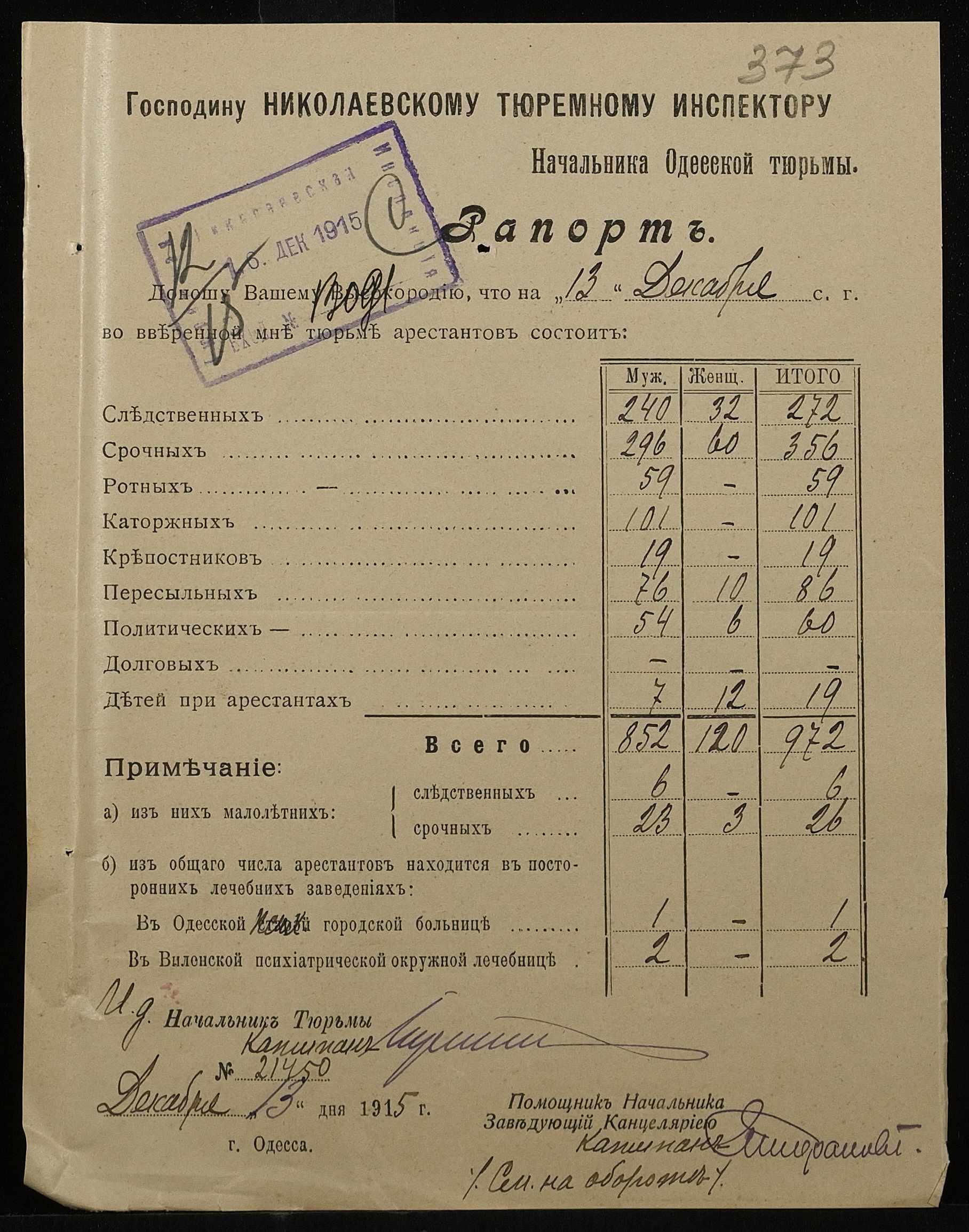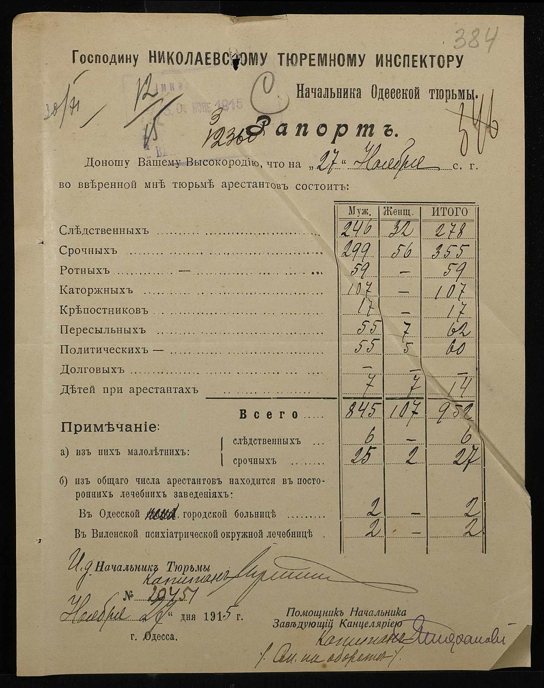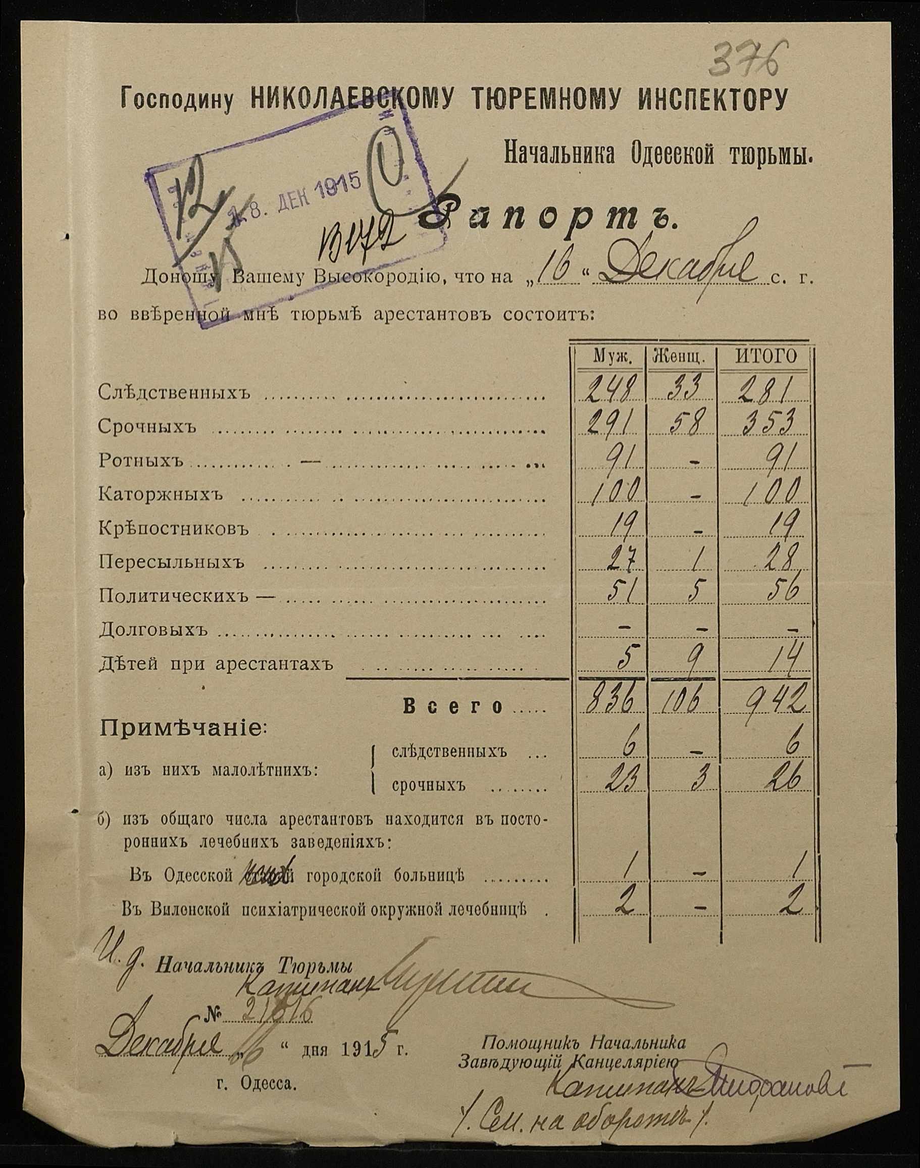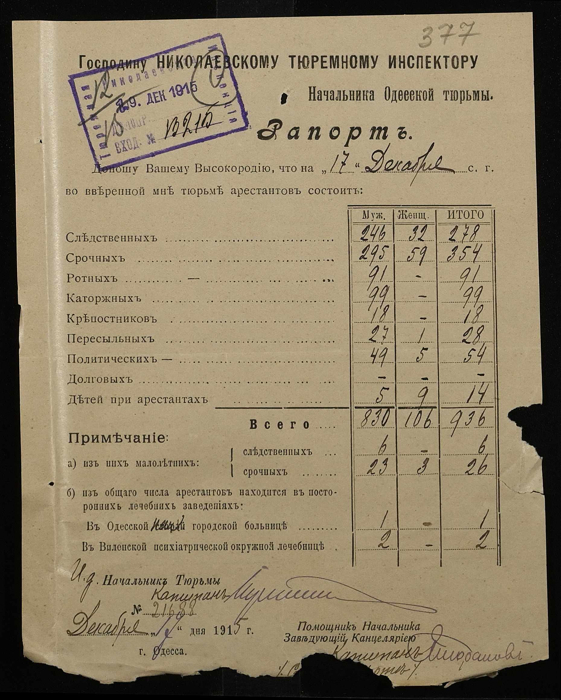 • • • • Справа № 114 Рапорти начальника Одеської тюрми миколаївському тюремному інспектору про склад арештантів