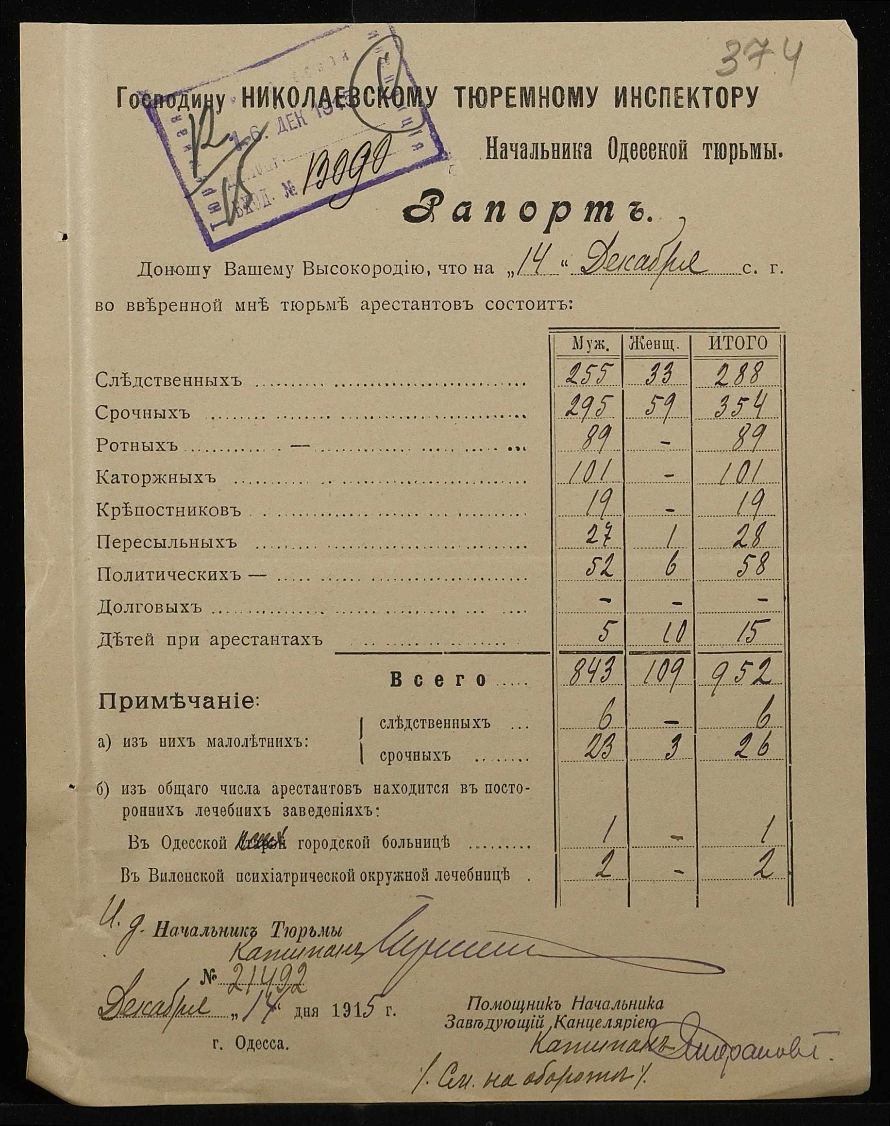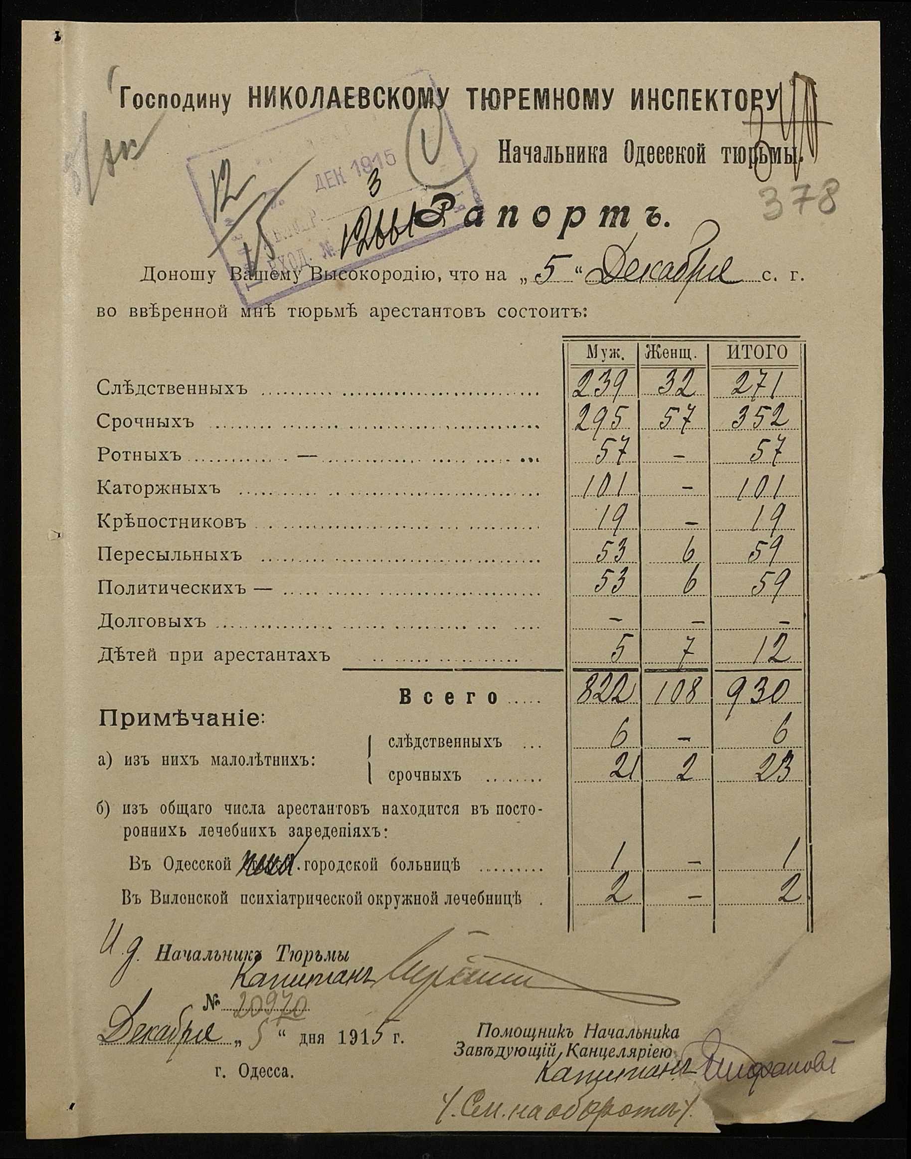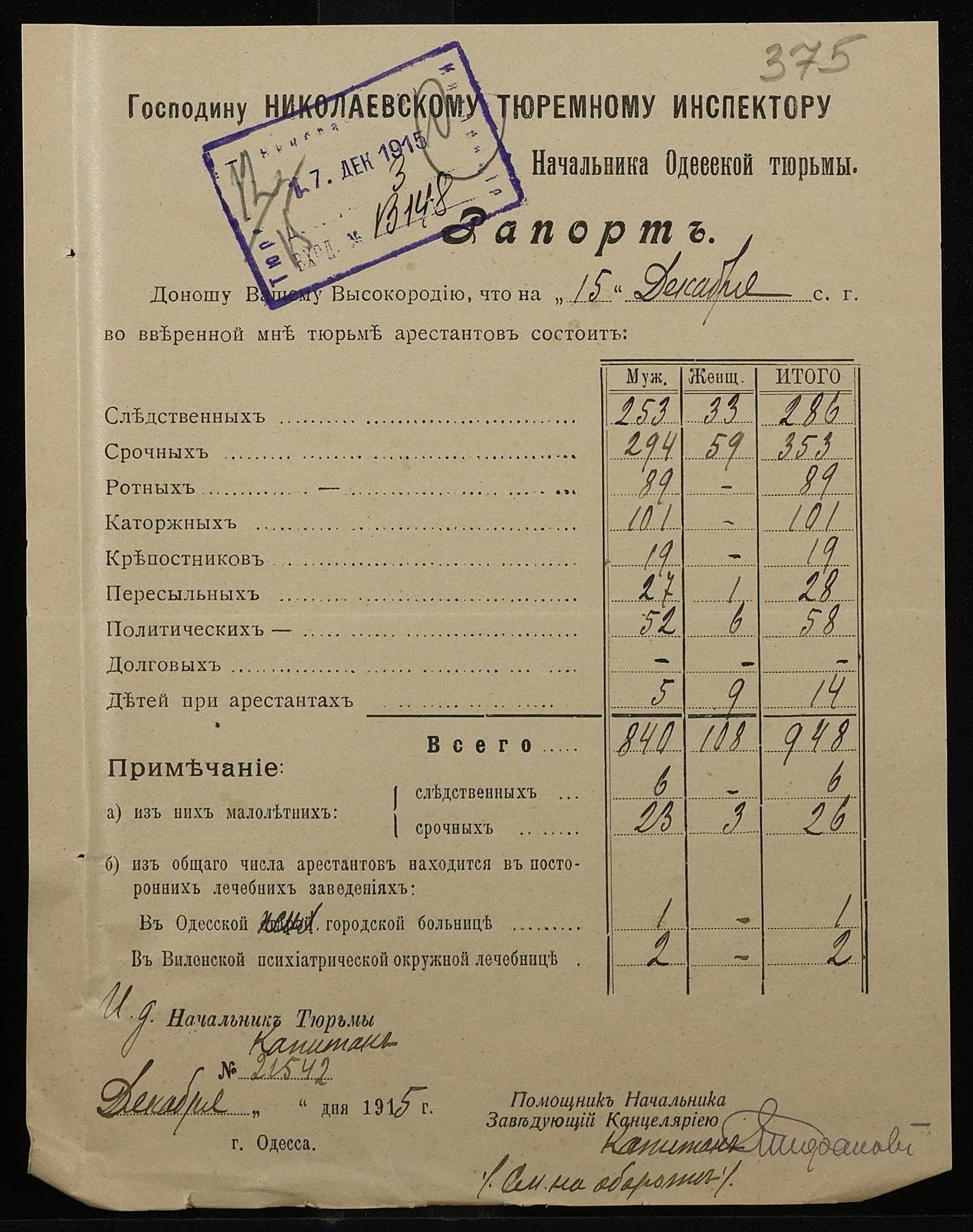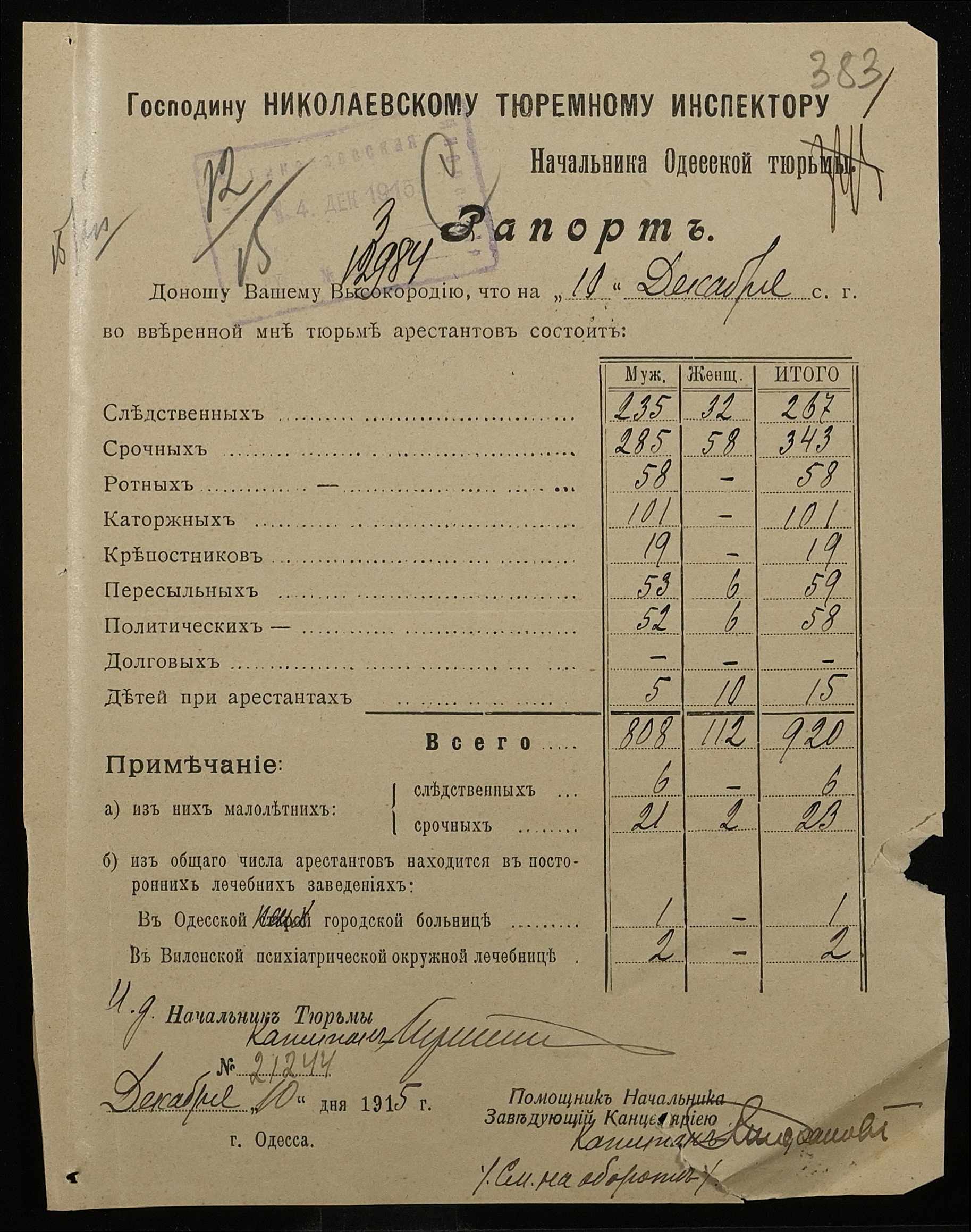 • • • • Справа № 114 Рапорти начальника Одеської тюрми миколаївському тюремному інспектору про склад арештантів