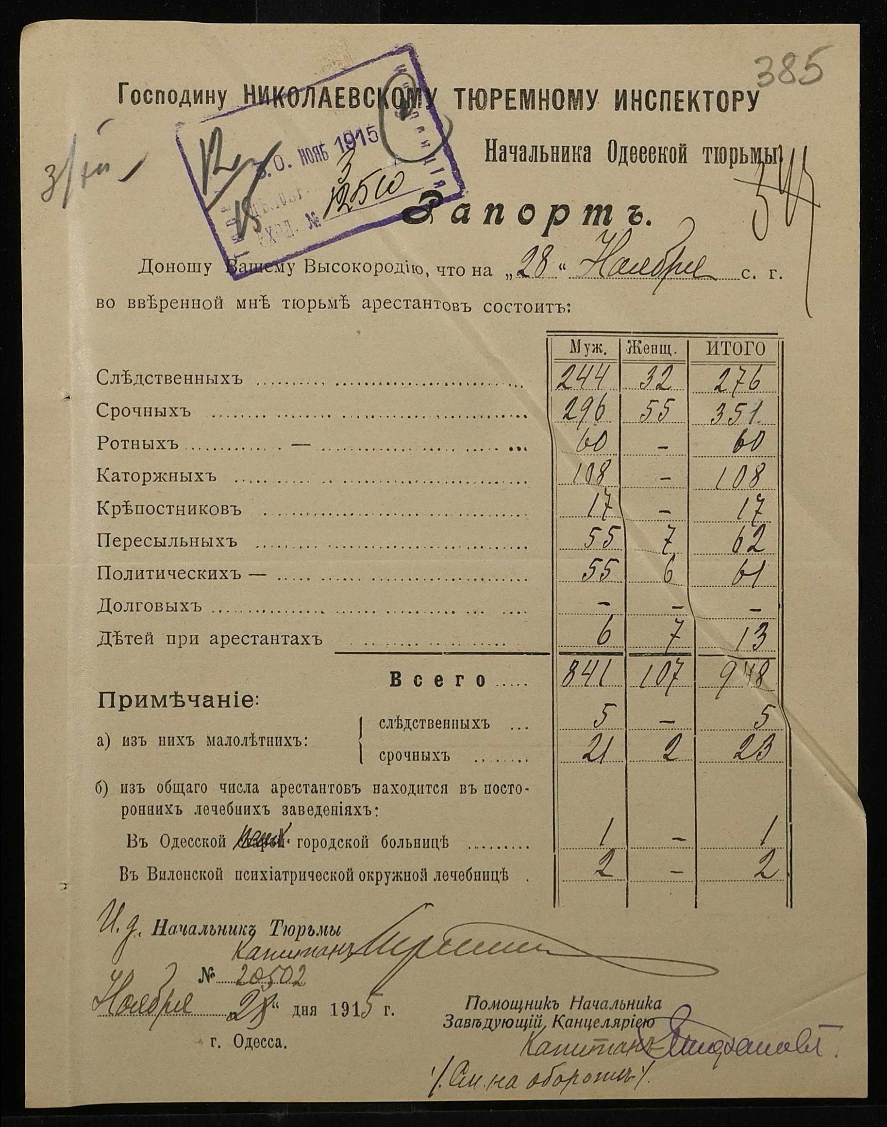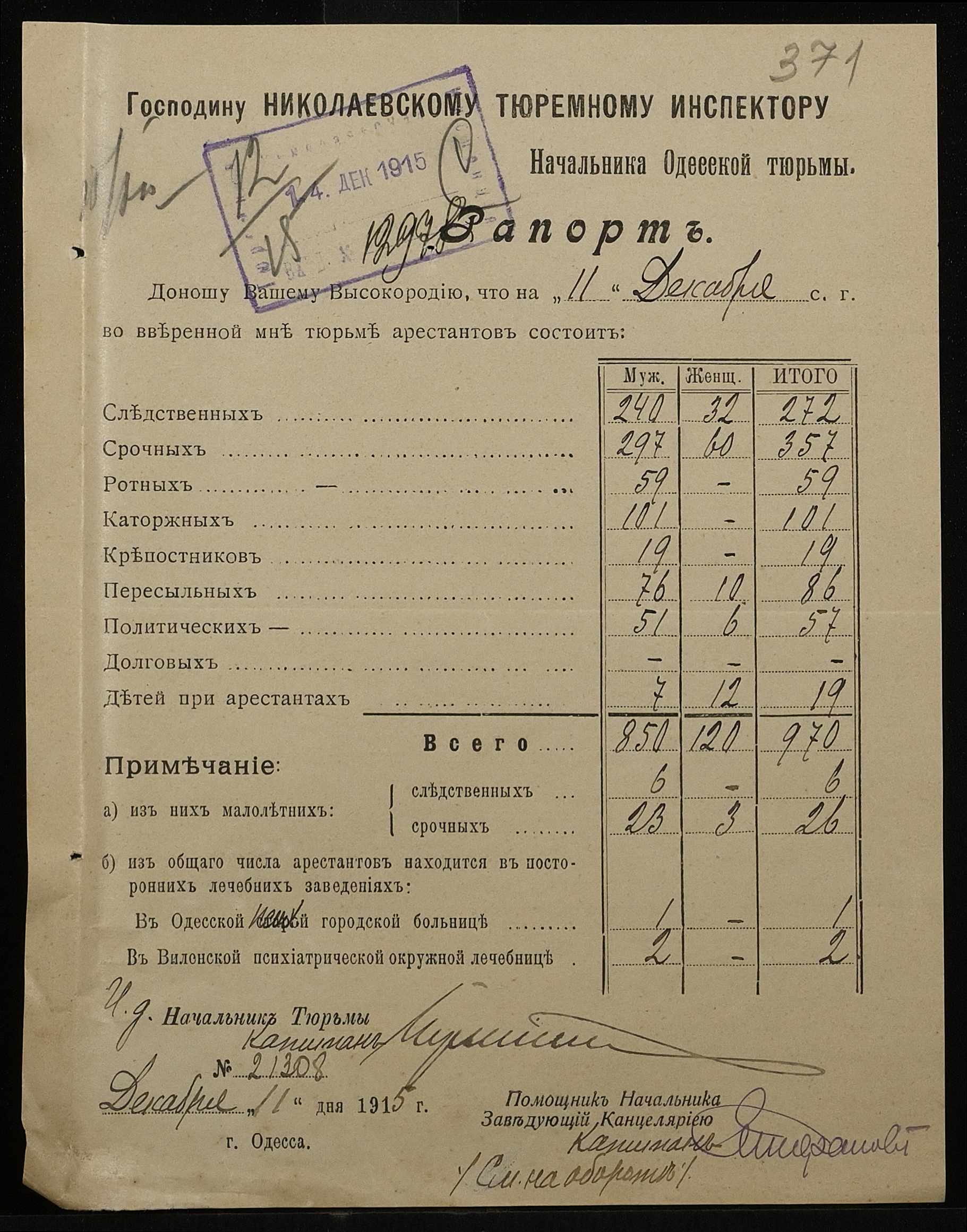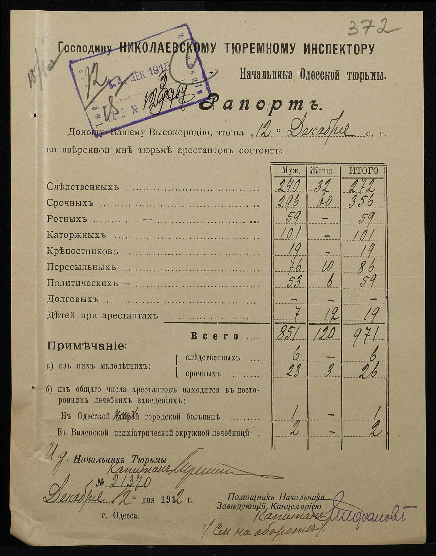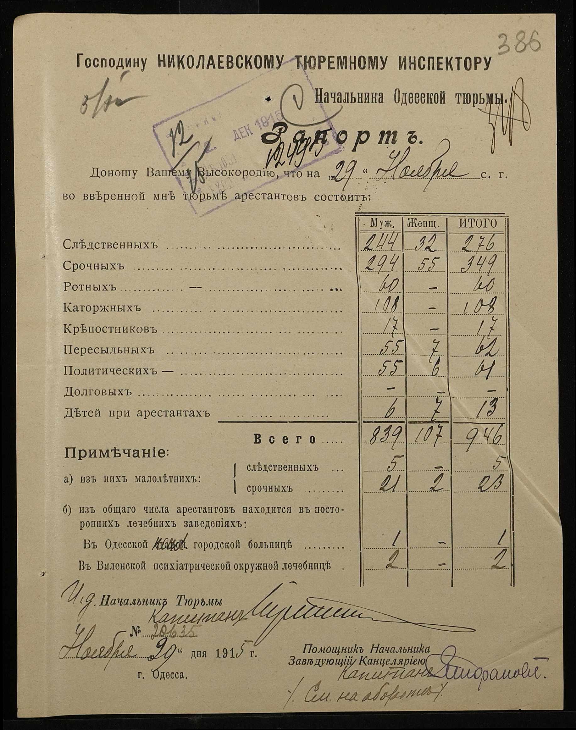 • • • • Справа № 114 Рапорти начальника Одеської тюрми миколаївському тюремному інспектору про склад арештантів