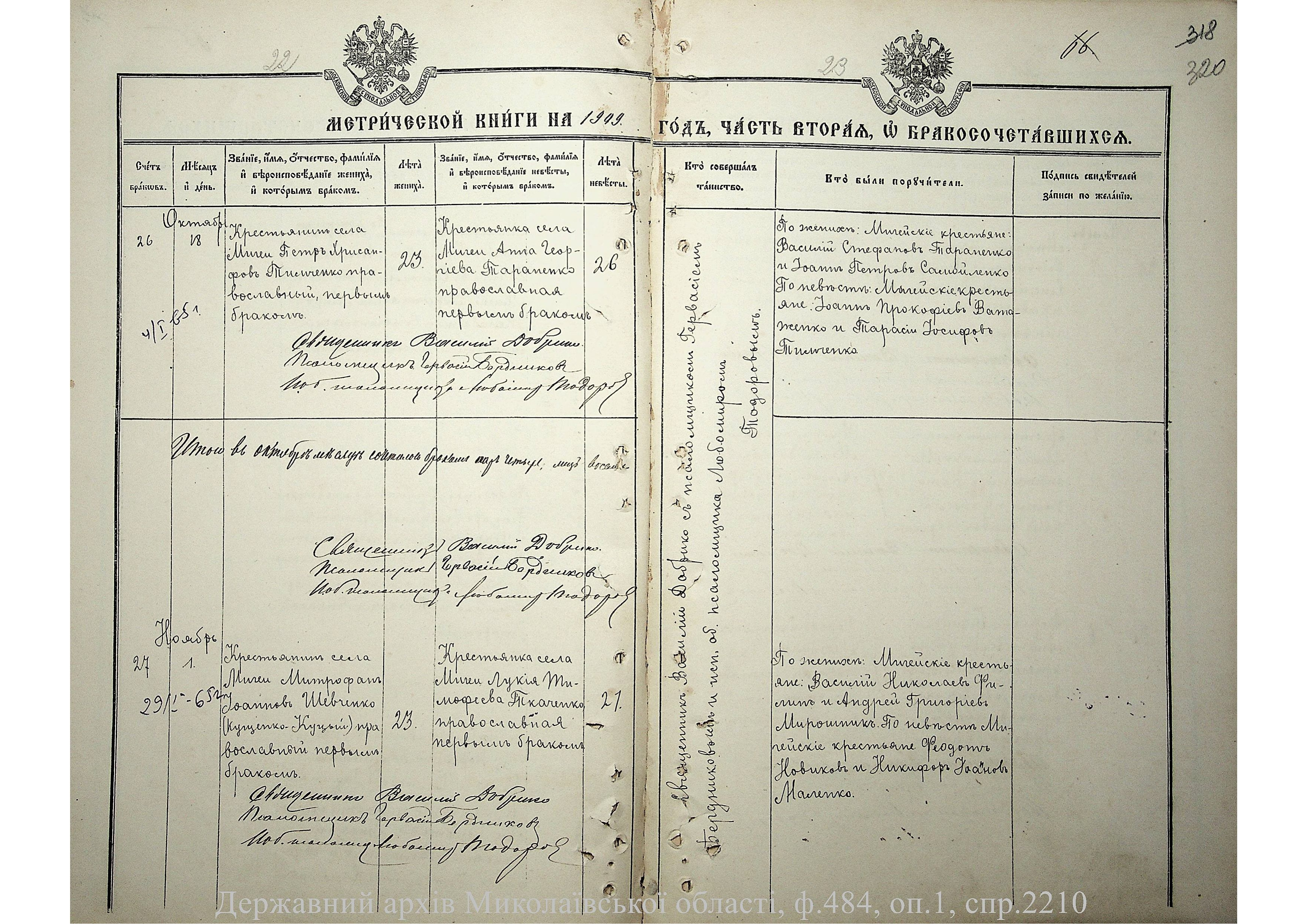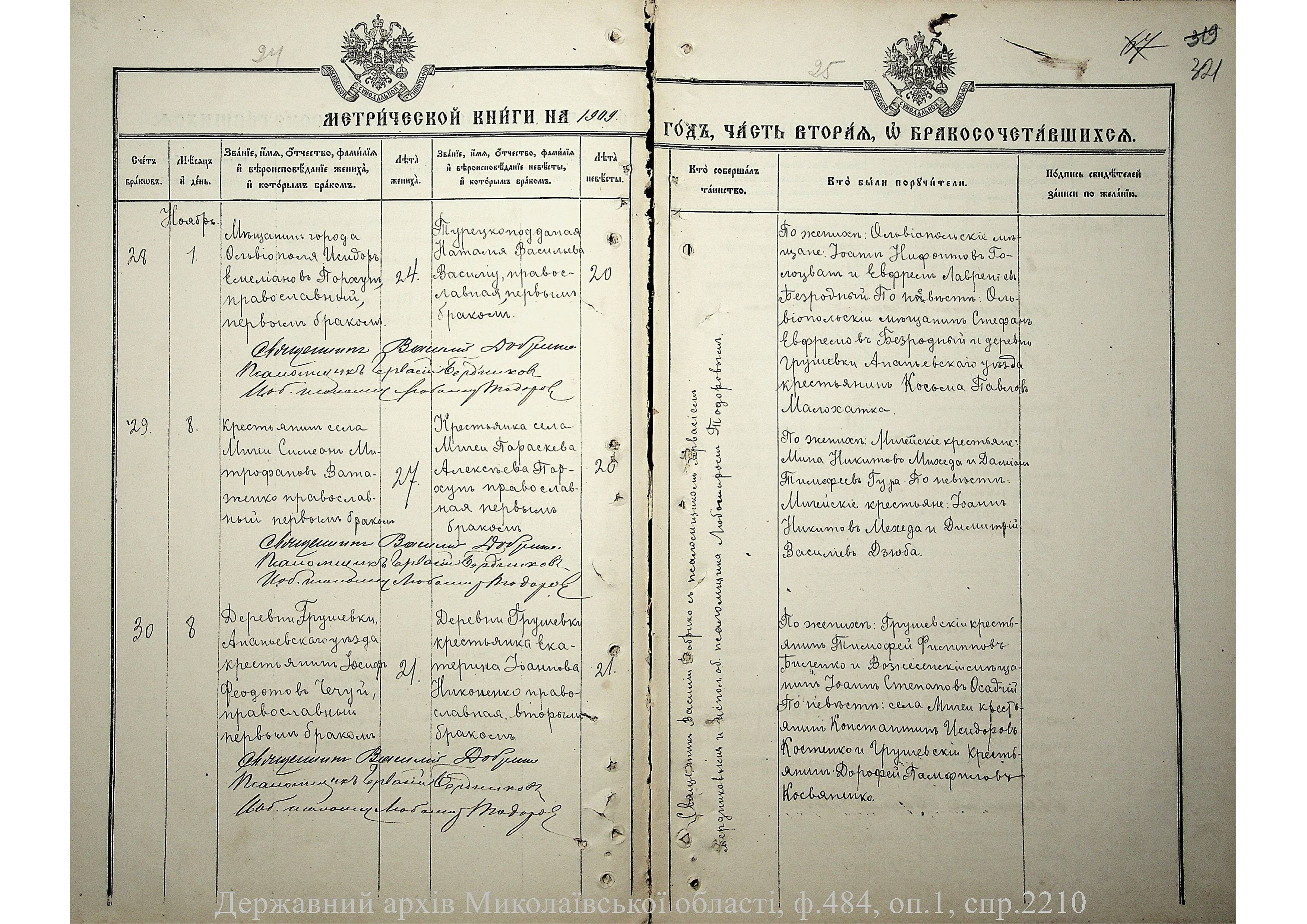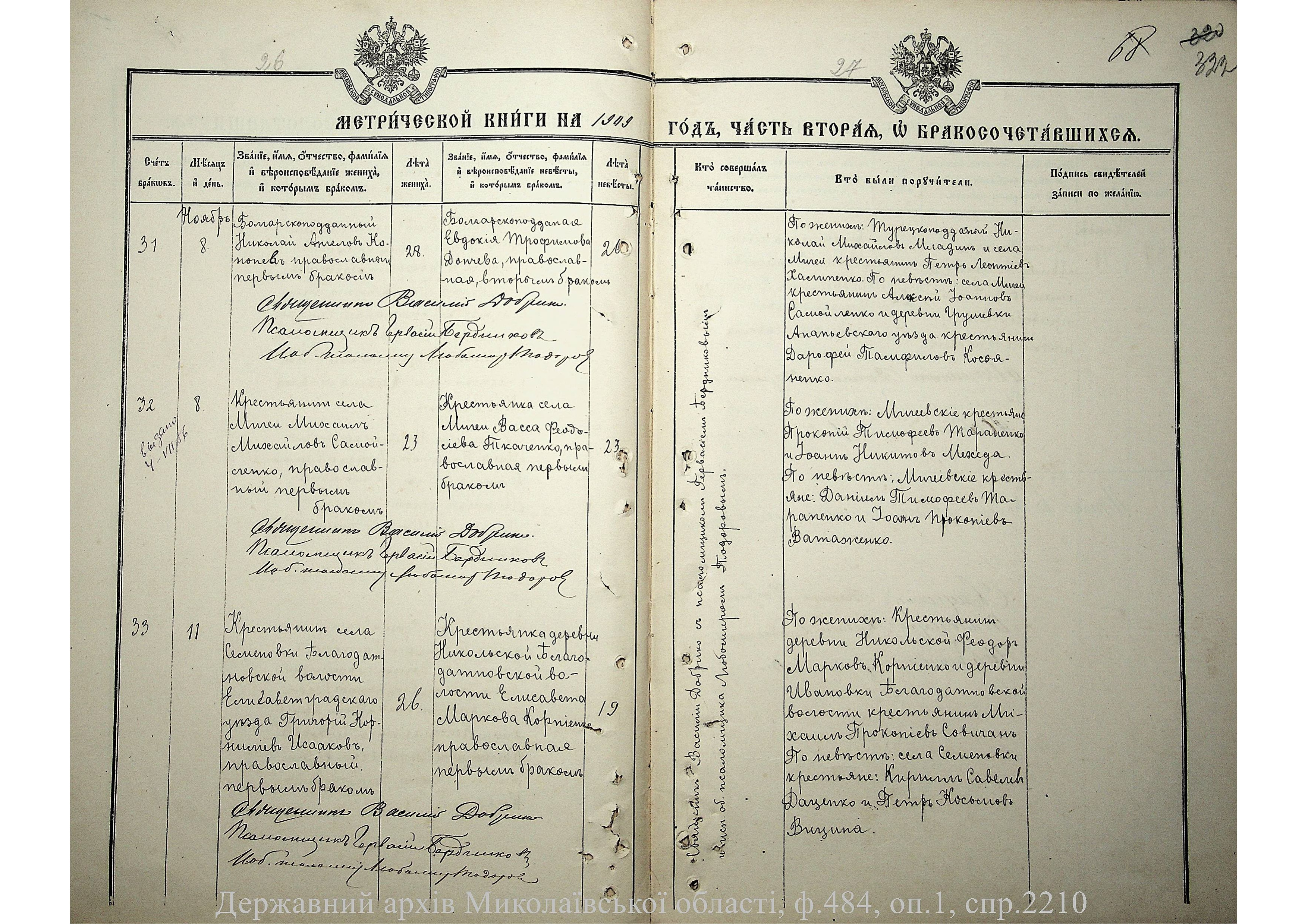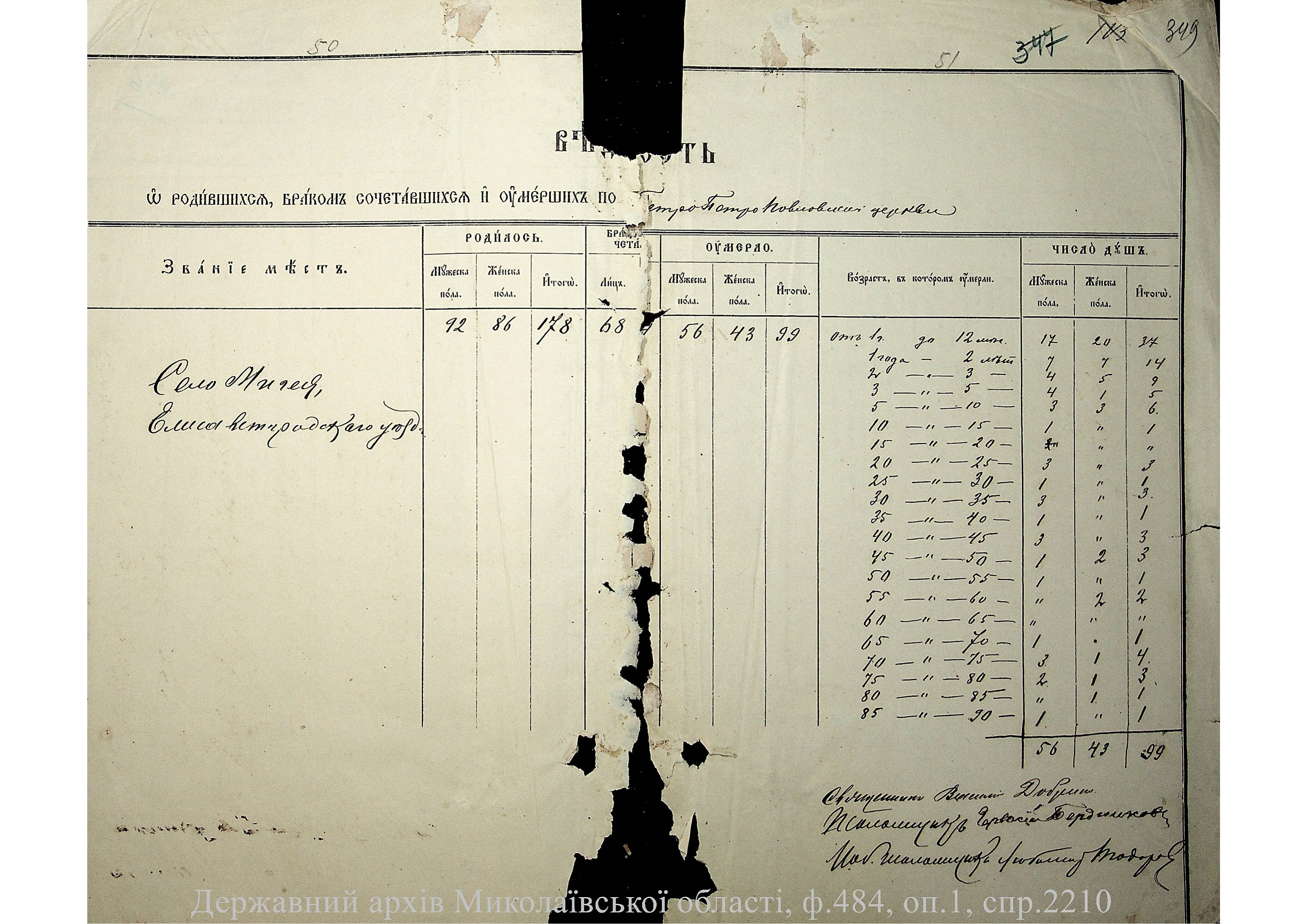 • • • • Справа № 2210 “Метрична книга: Церква Святих Петра і Павла, с. Мигія, Єлисаветградський повіт, Херсонська губернія: про народжених, одружених та померлих”