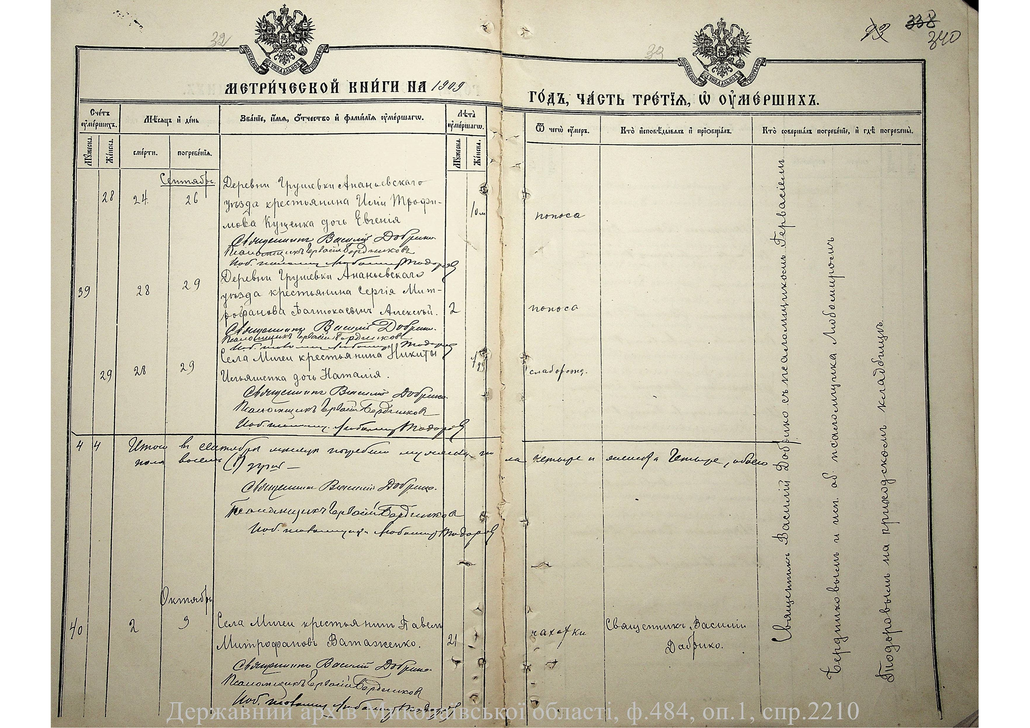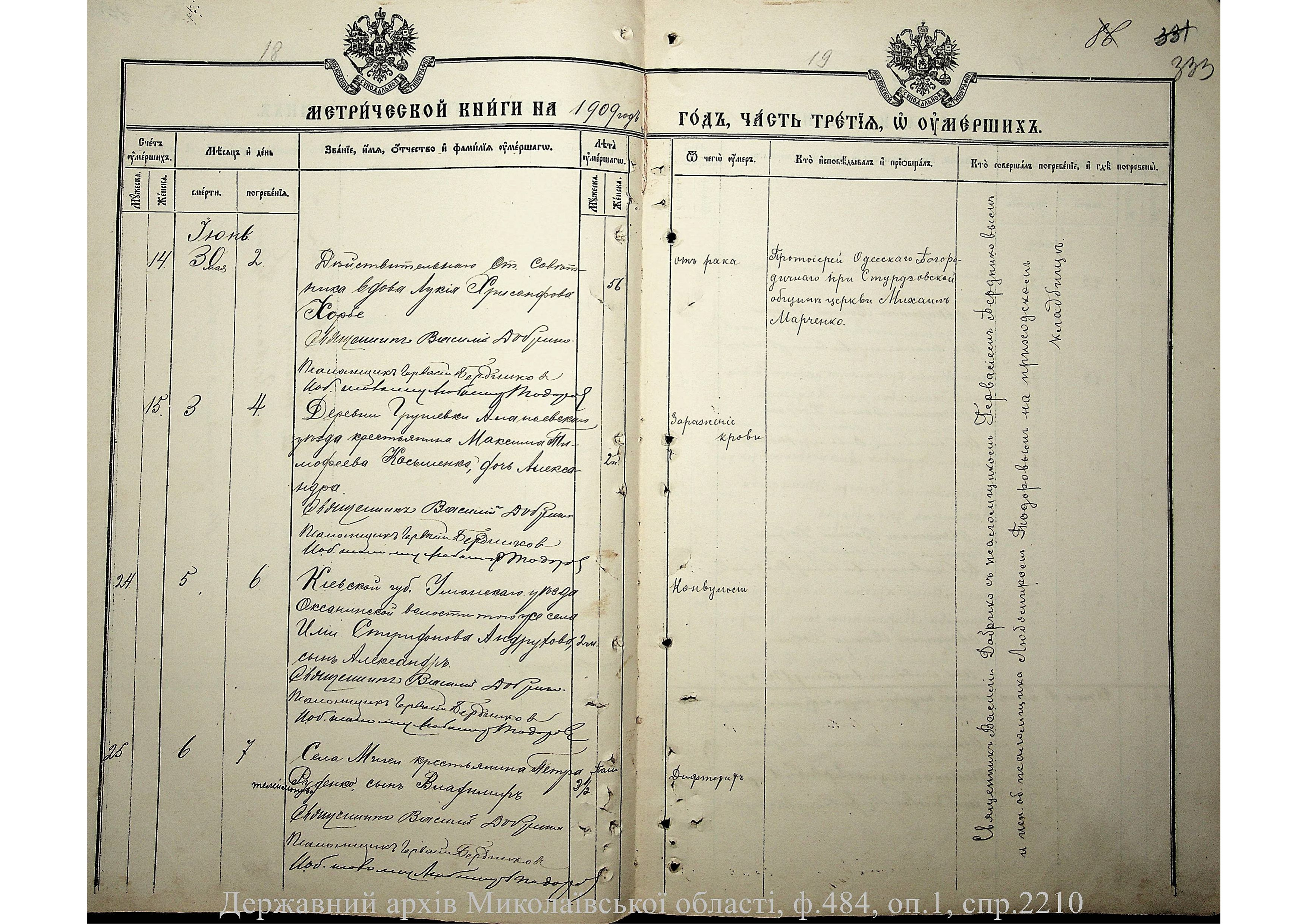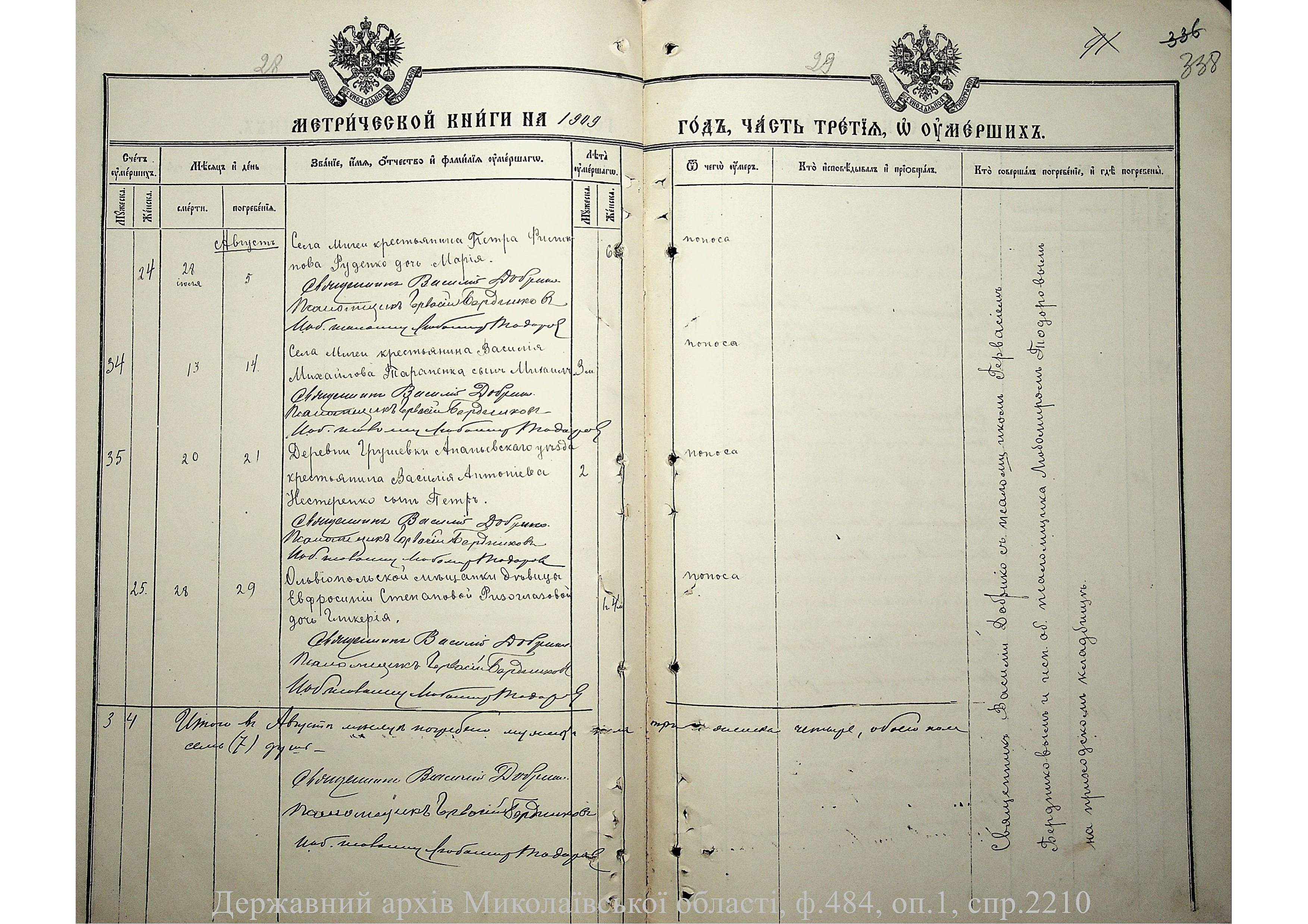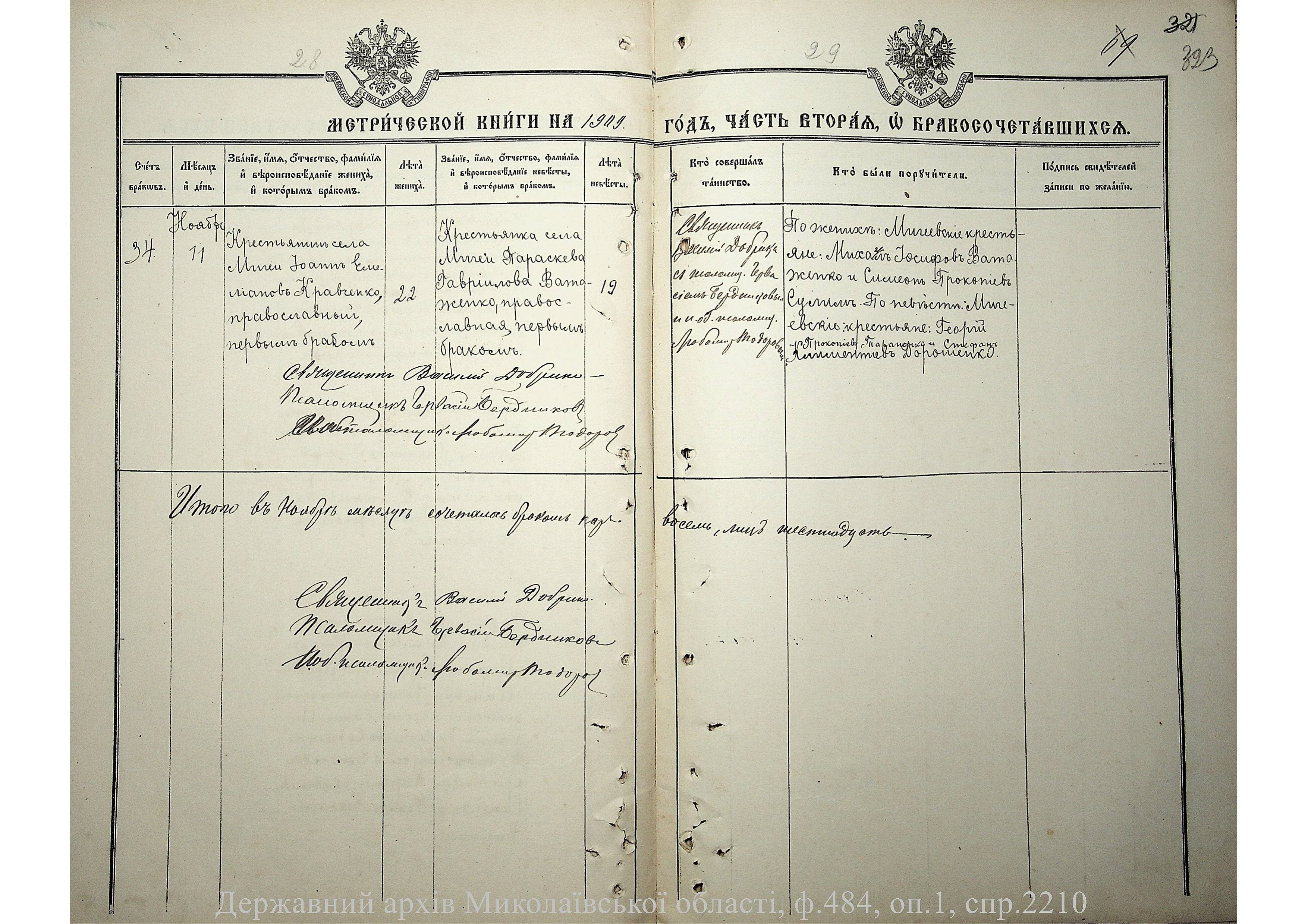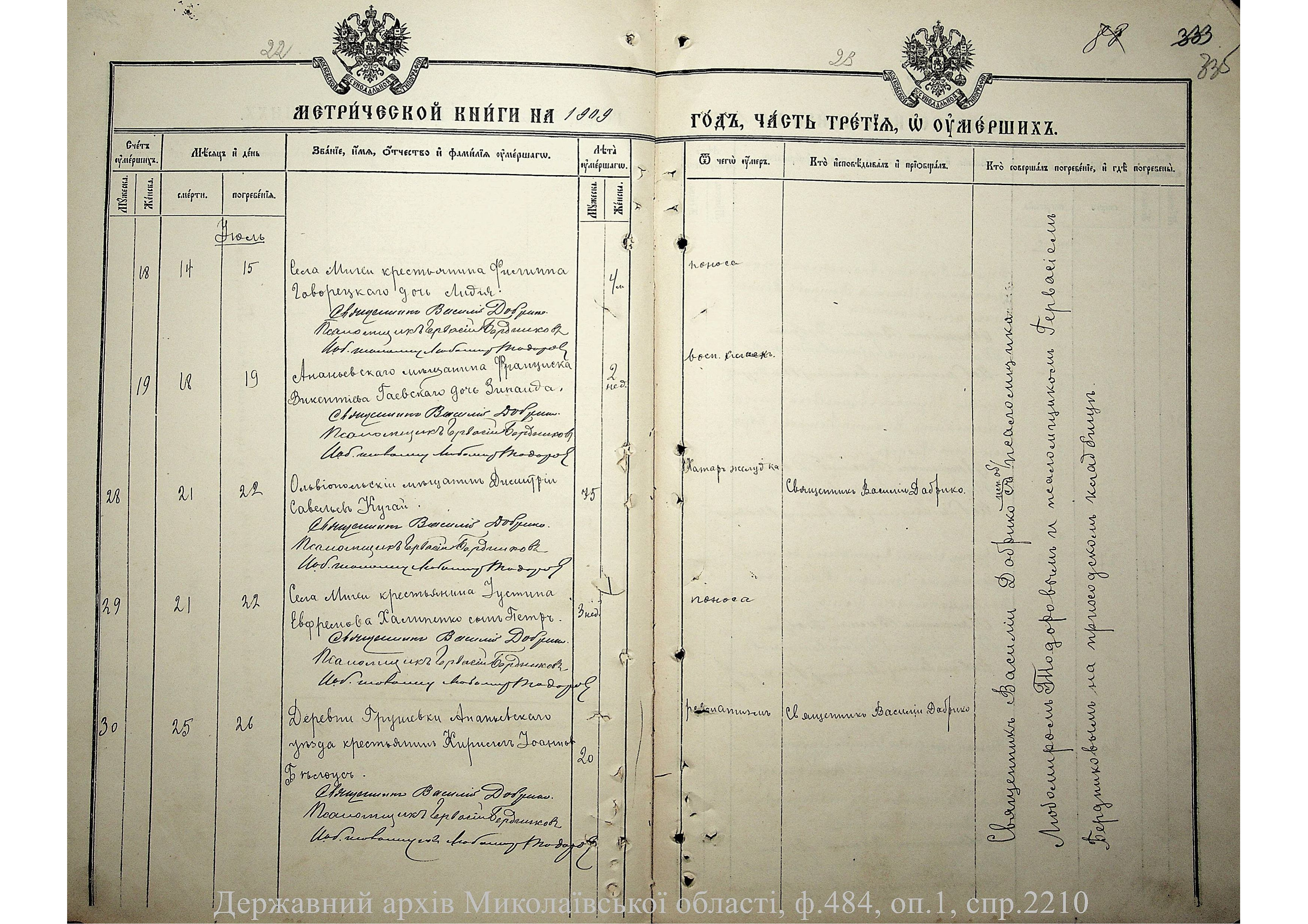 • • • • Справа № 2210 “Метрична книга: Церква Святих Петра і Павла, с. Мигія, Єлисаветградський повіт, Херсонська губернія: про народжених, одружених та померлих”