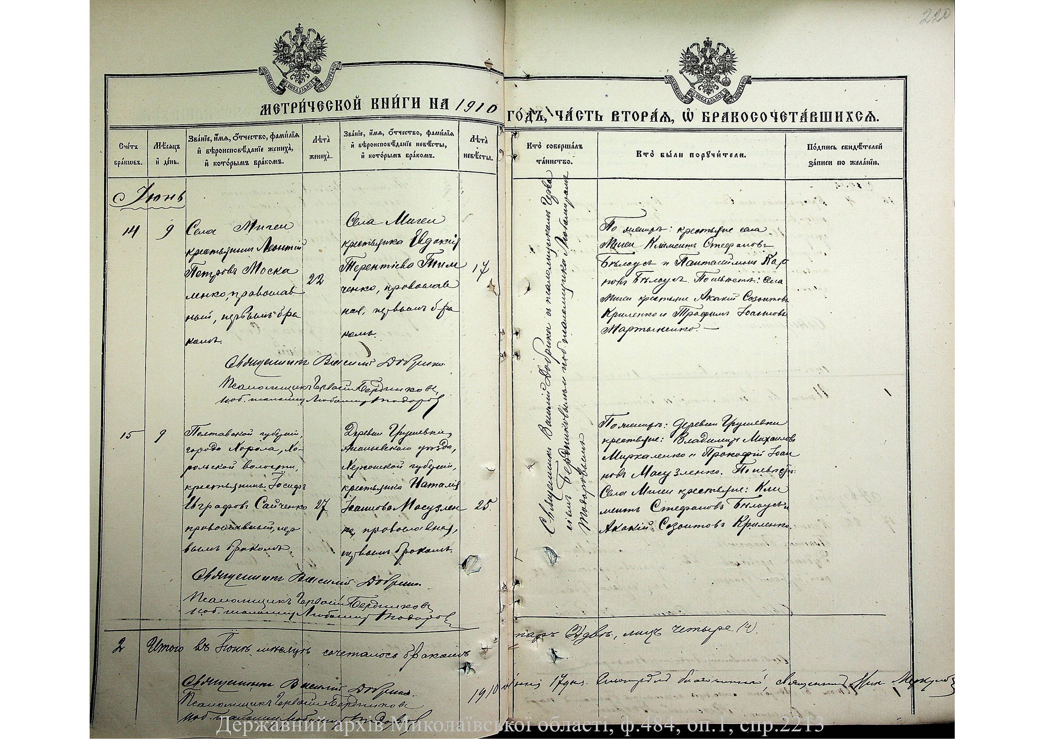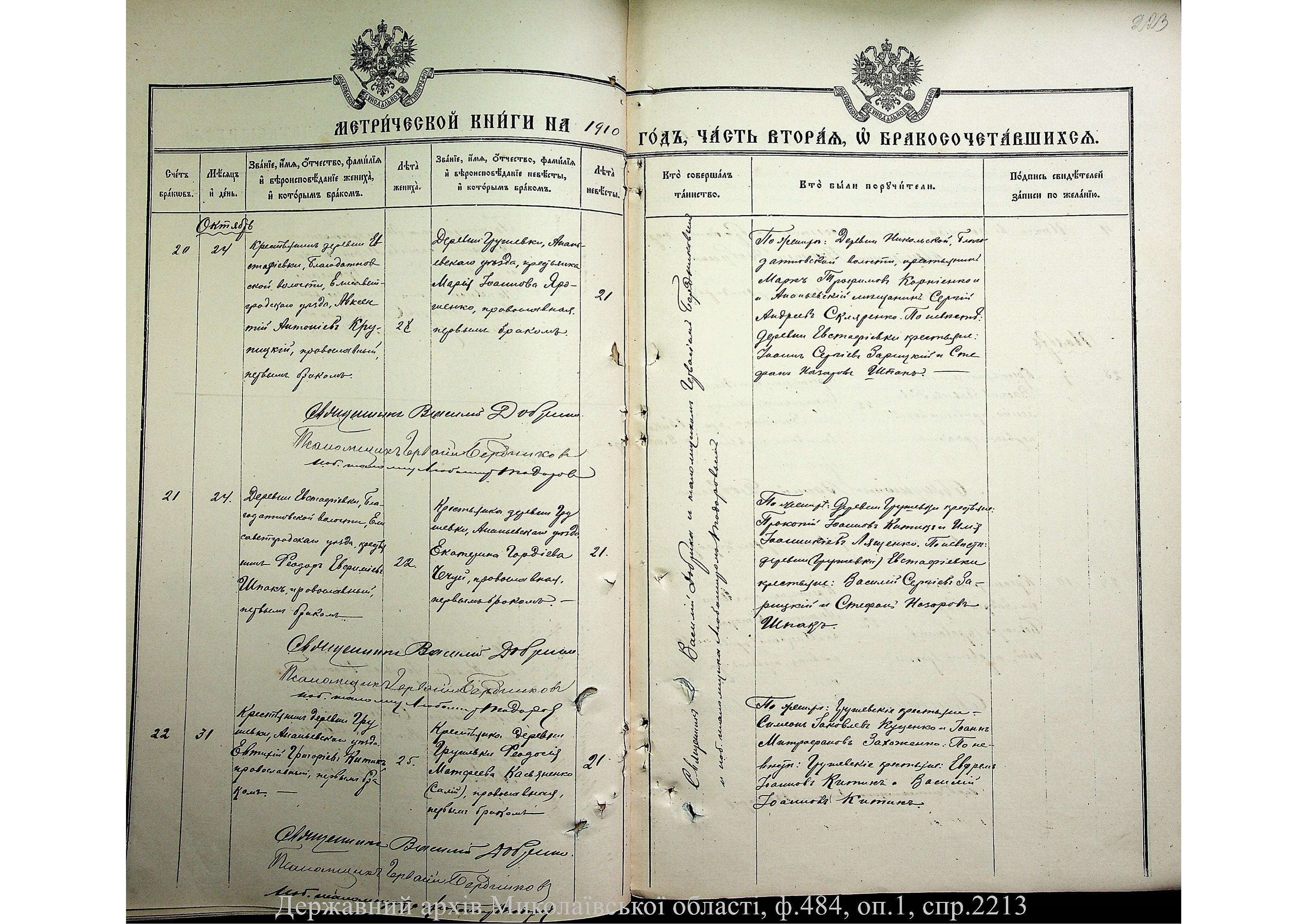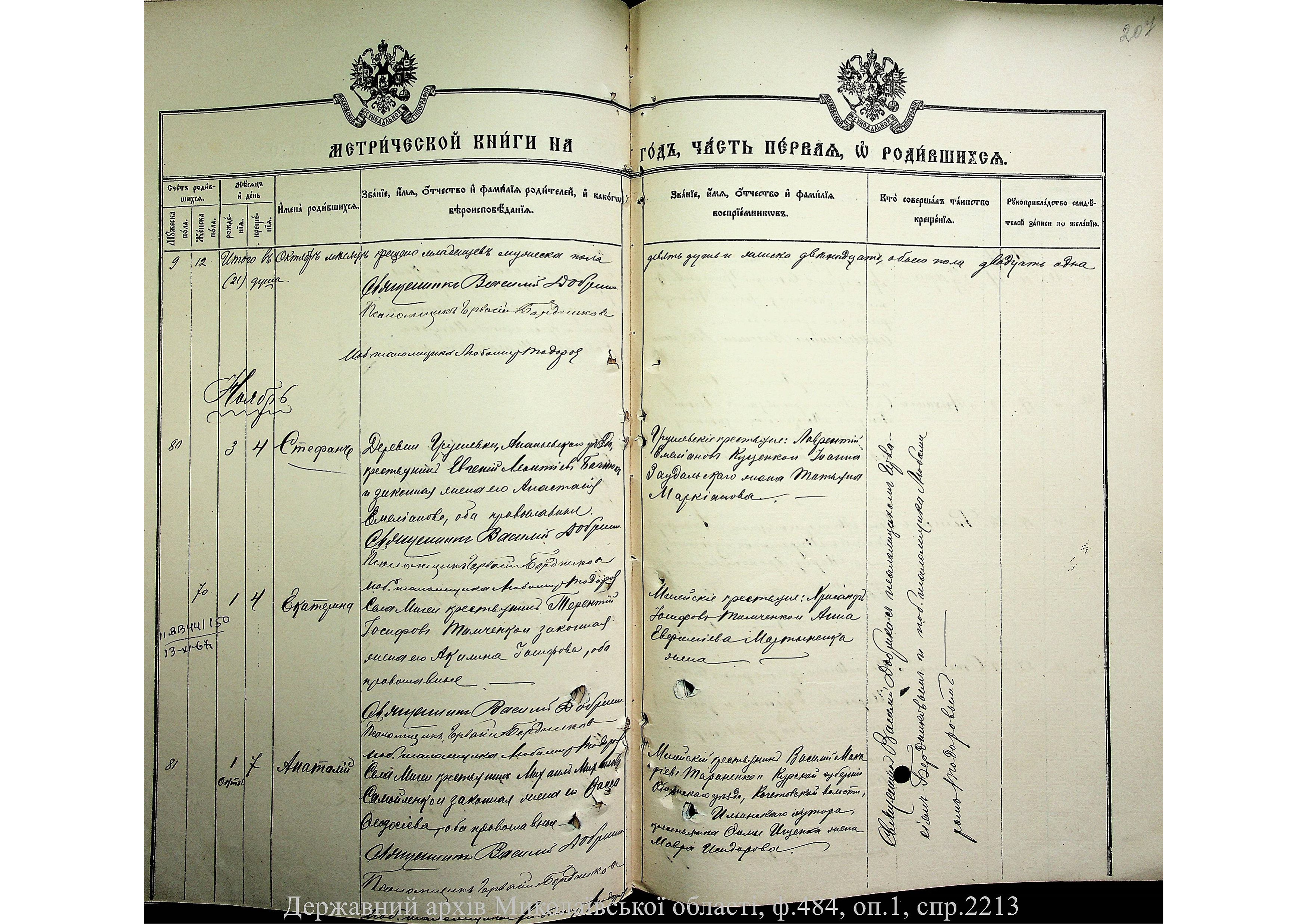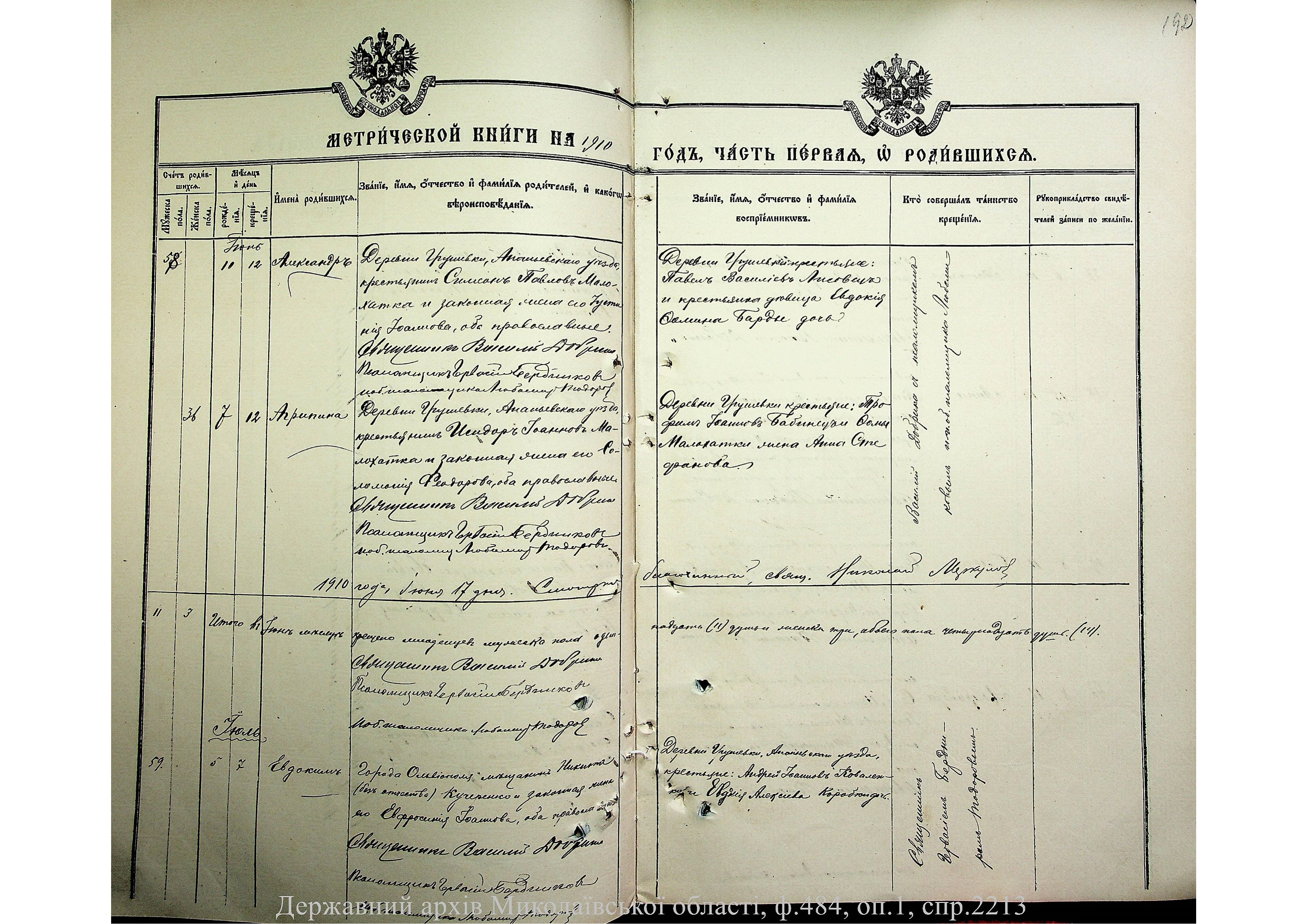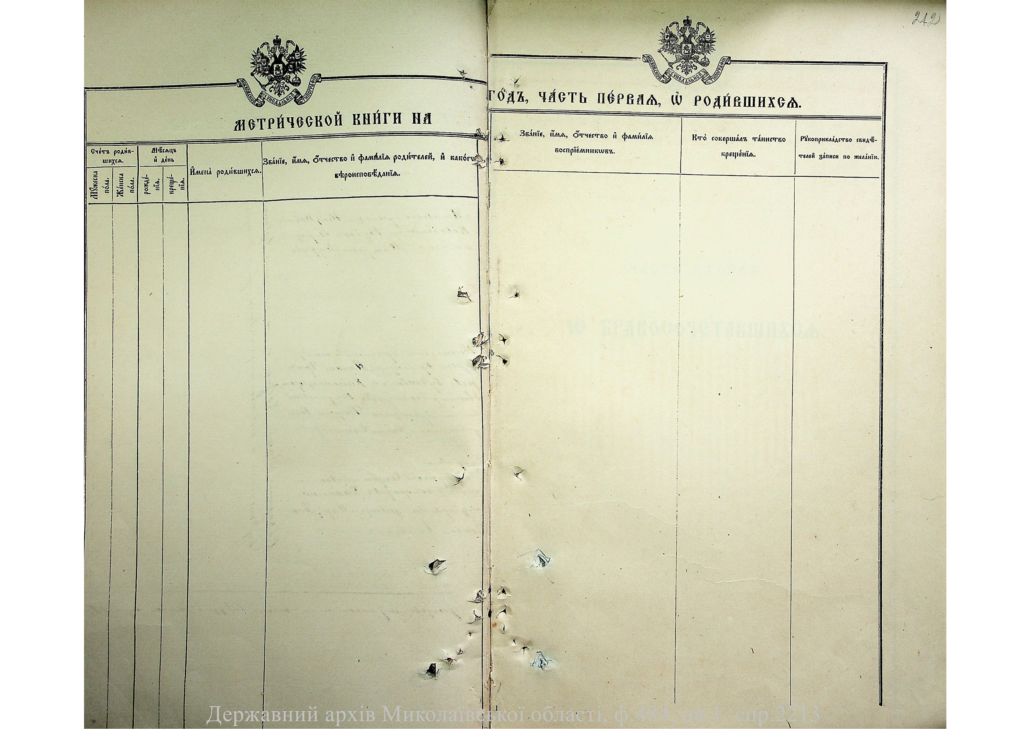 • • • • Справа № 2213 “Метрична книга: Церква Святих Петра і Павла, с. Мигія, Єлисаветградський повіт, Херсонська губернія: про народжених, одружених та померлих”
