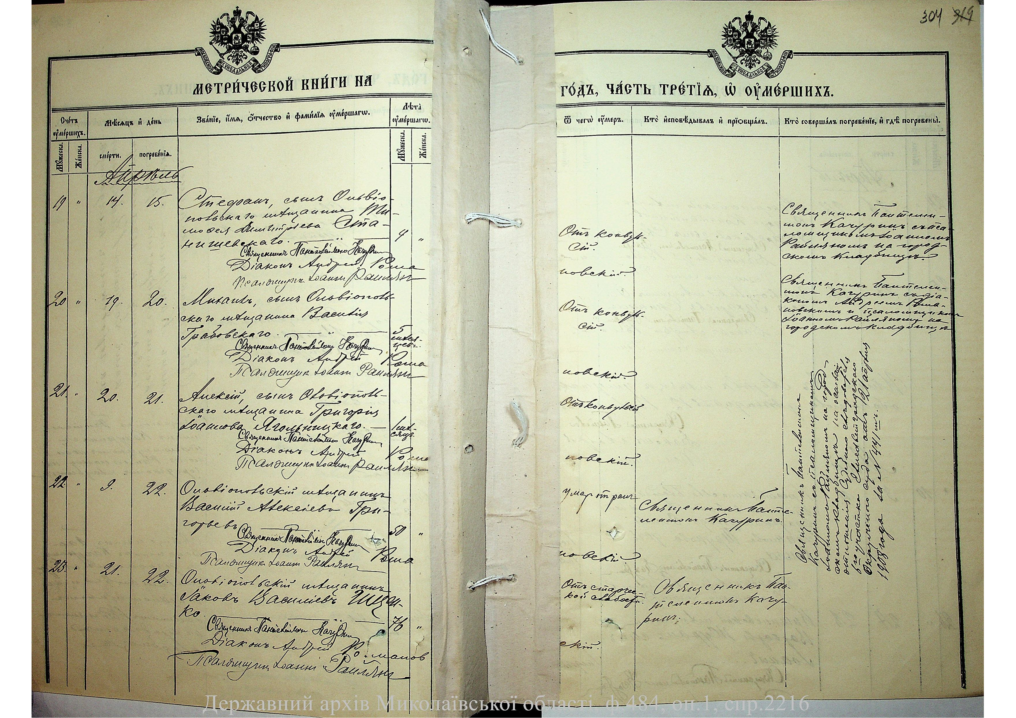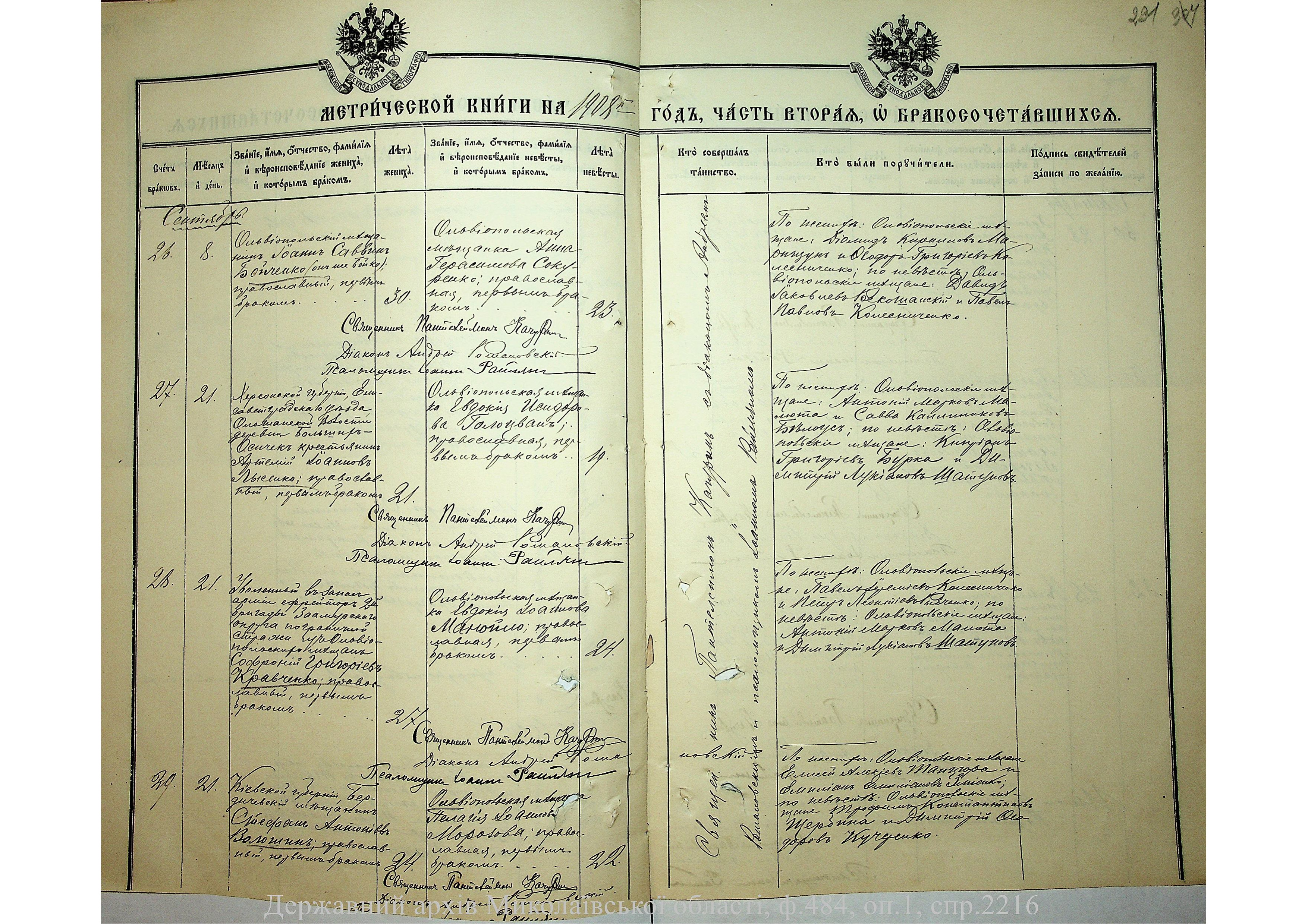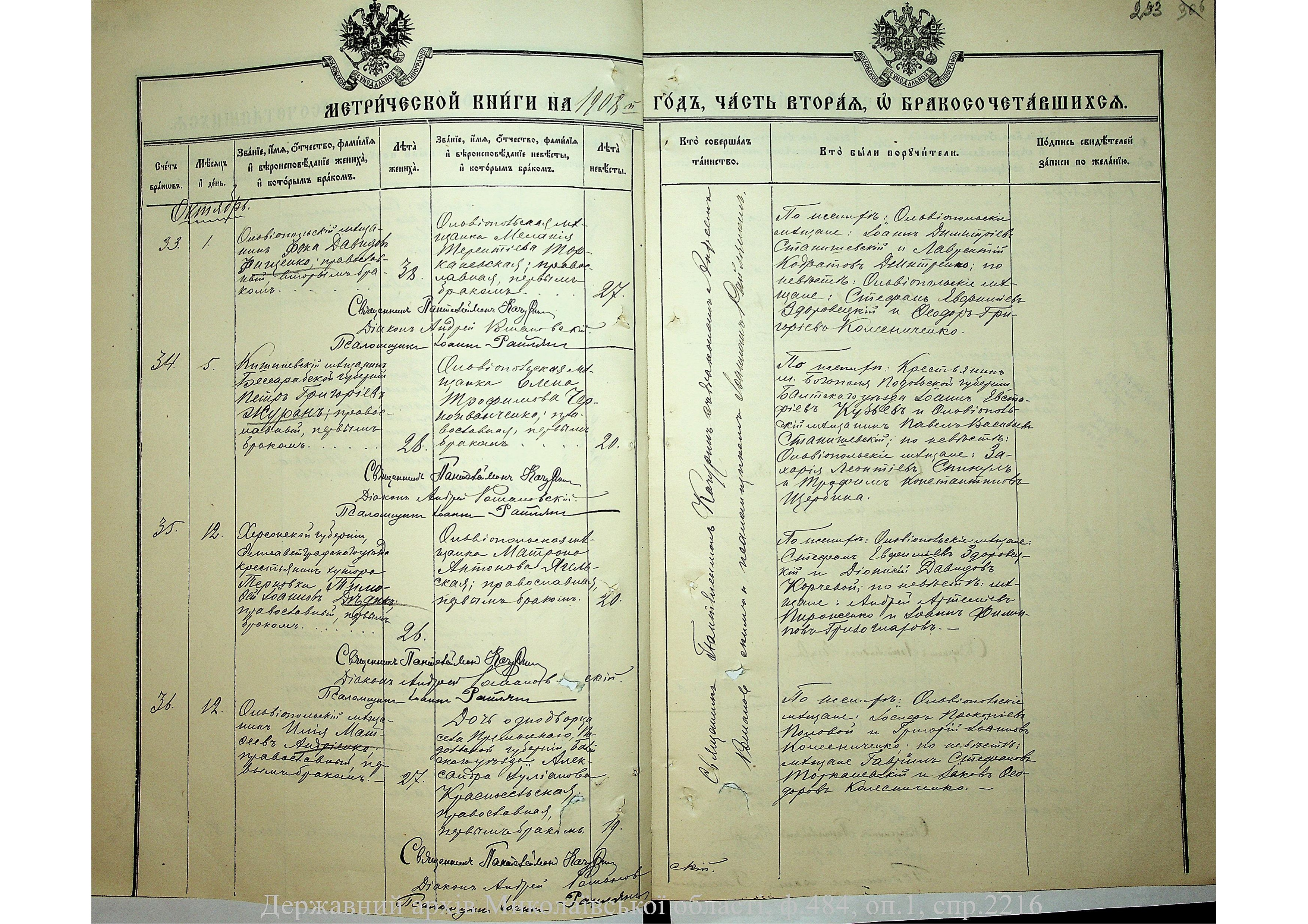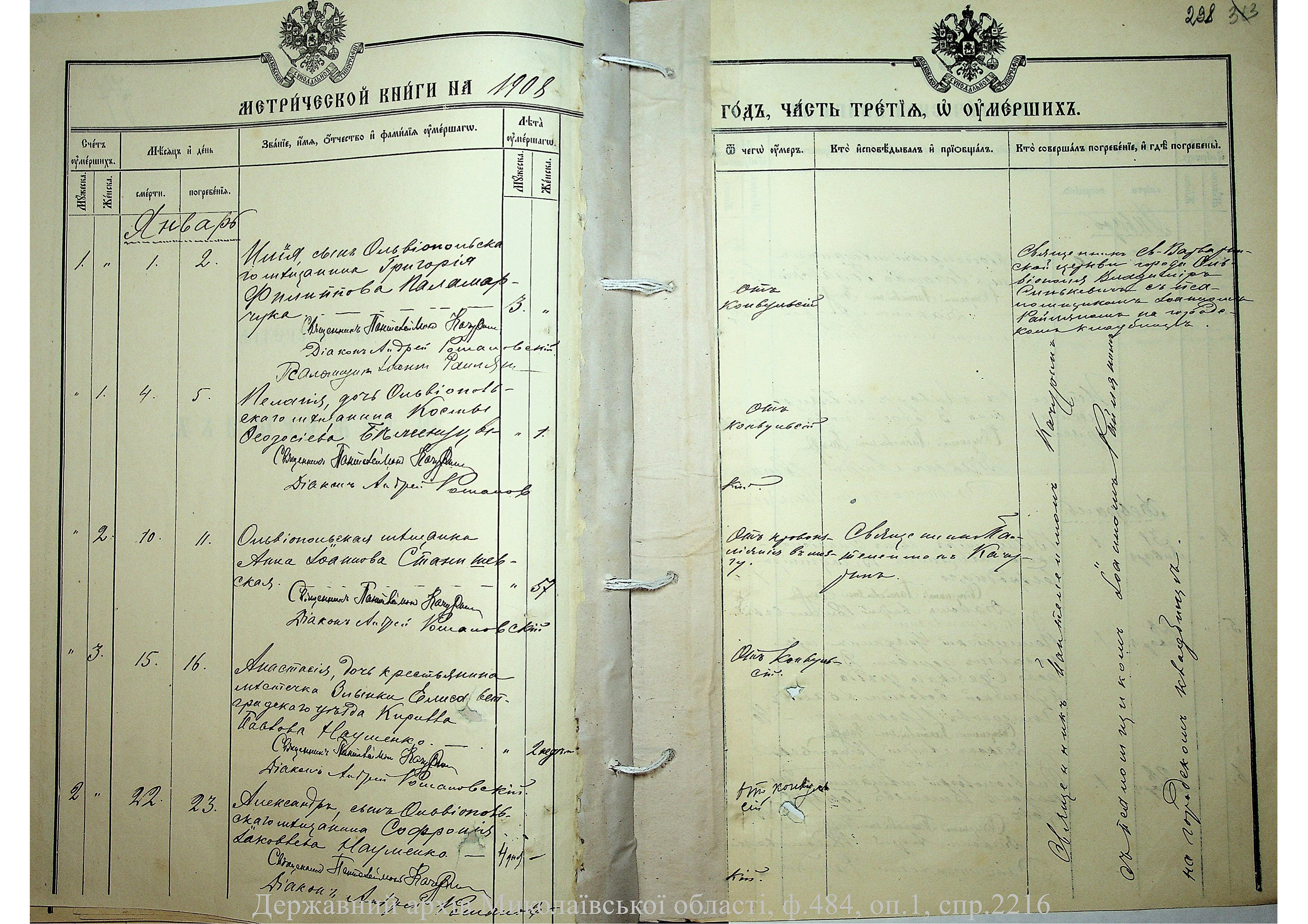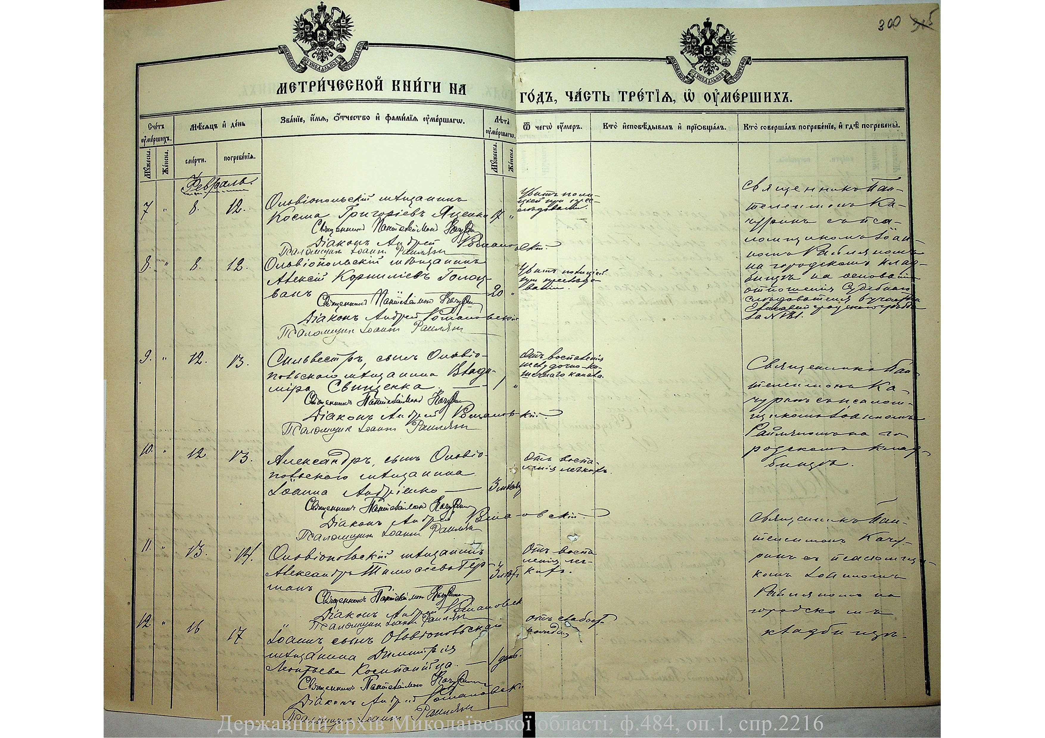• • • • Справа № 2216 “Метрична книга: Свято-Варваринська церква, с. Ольвіополь, Єлисаветградський повіт, Херсонська губернія: про народжених, одружених та померлих”