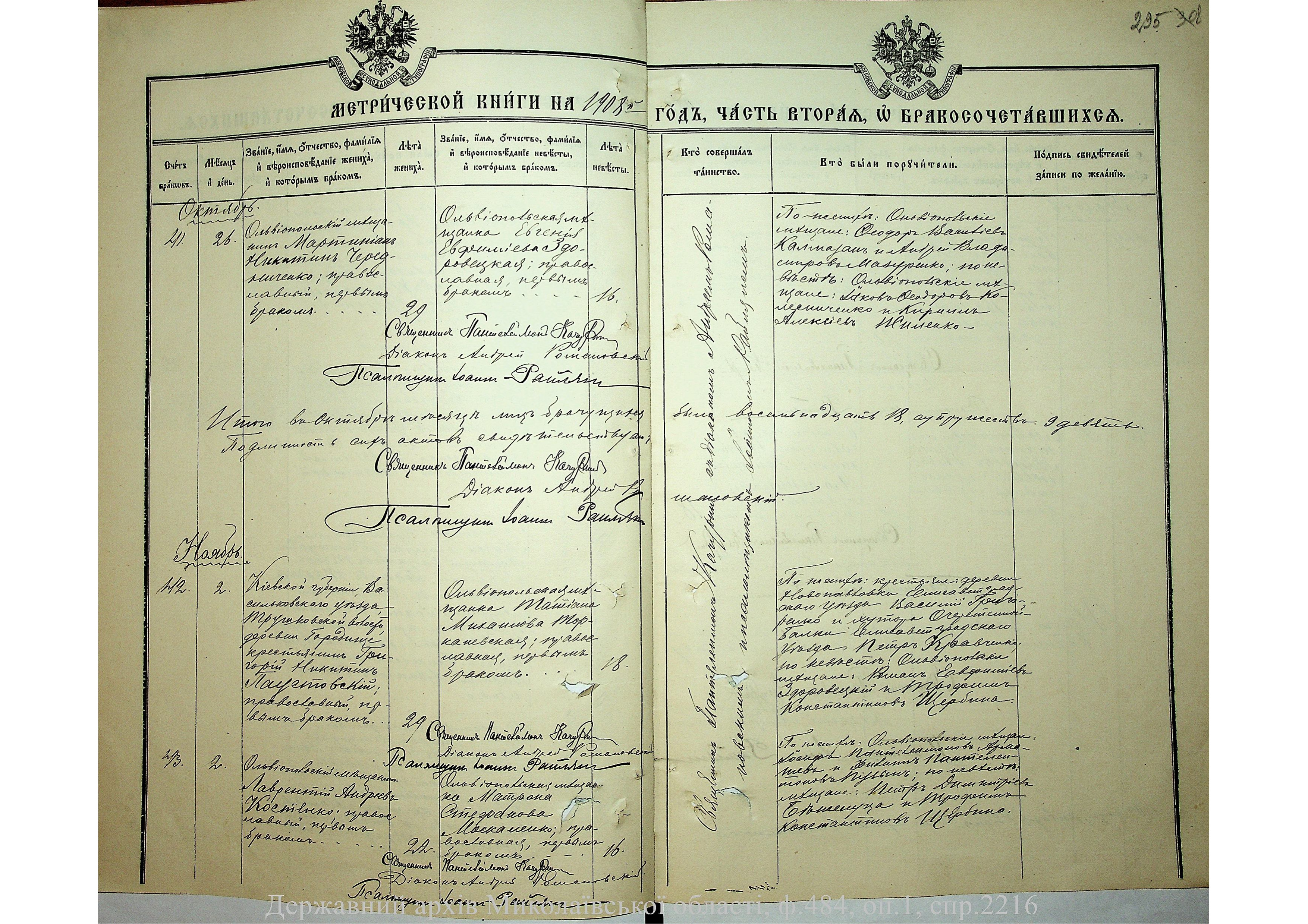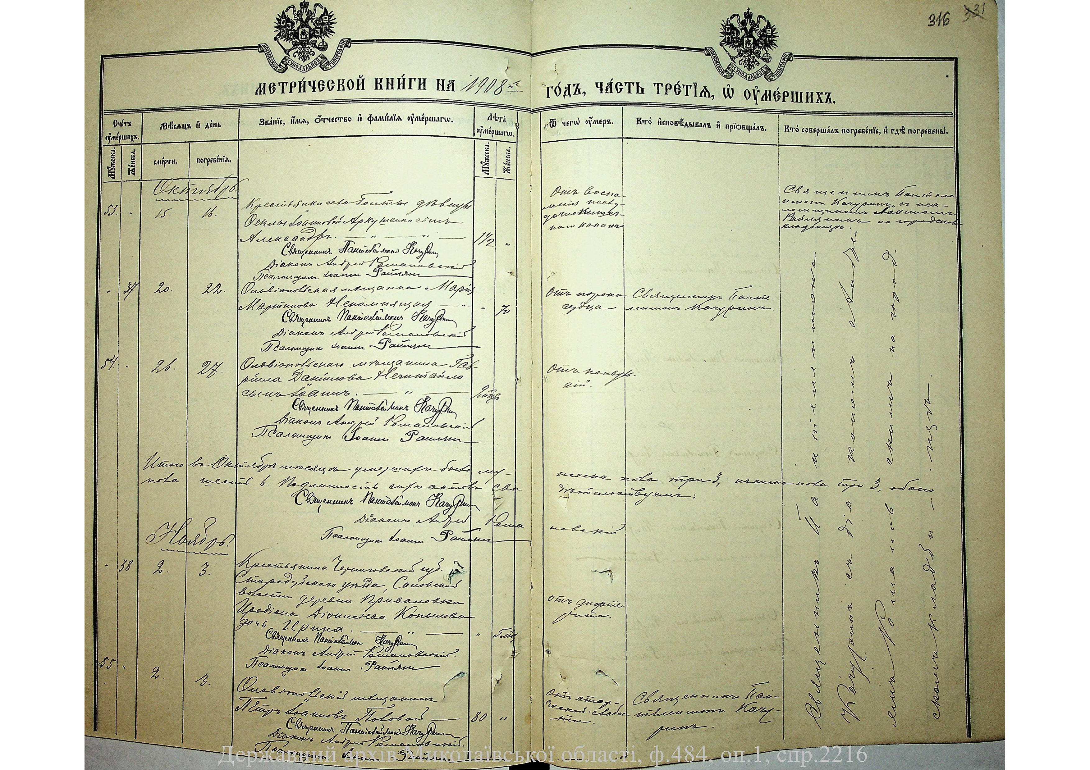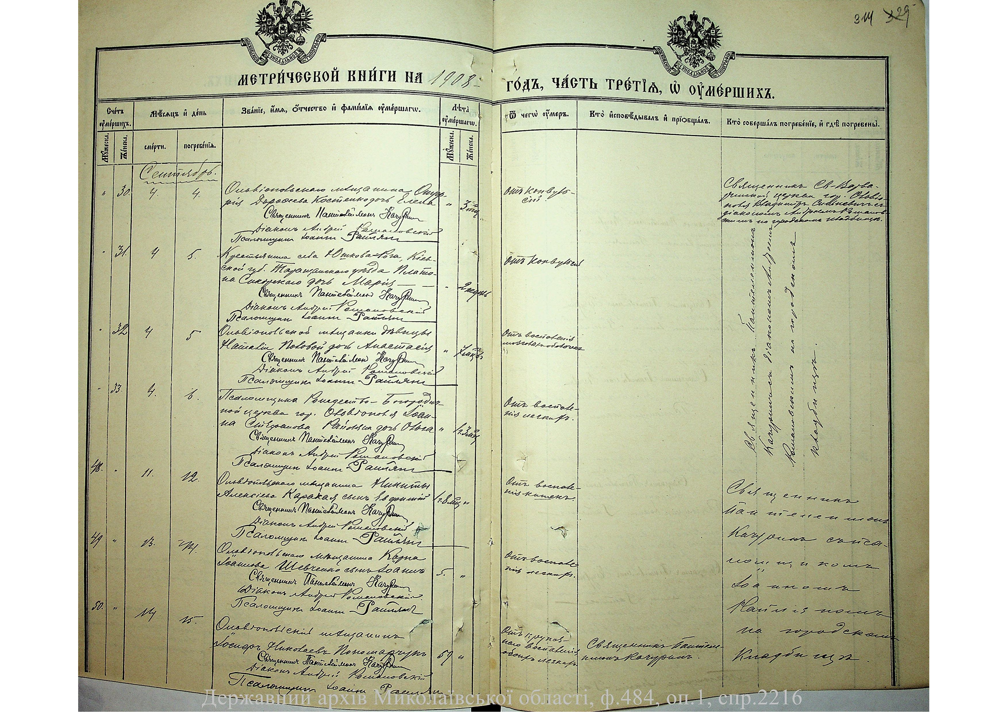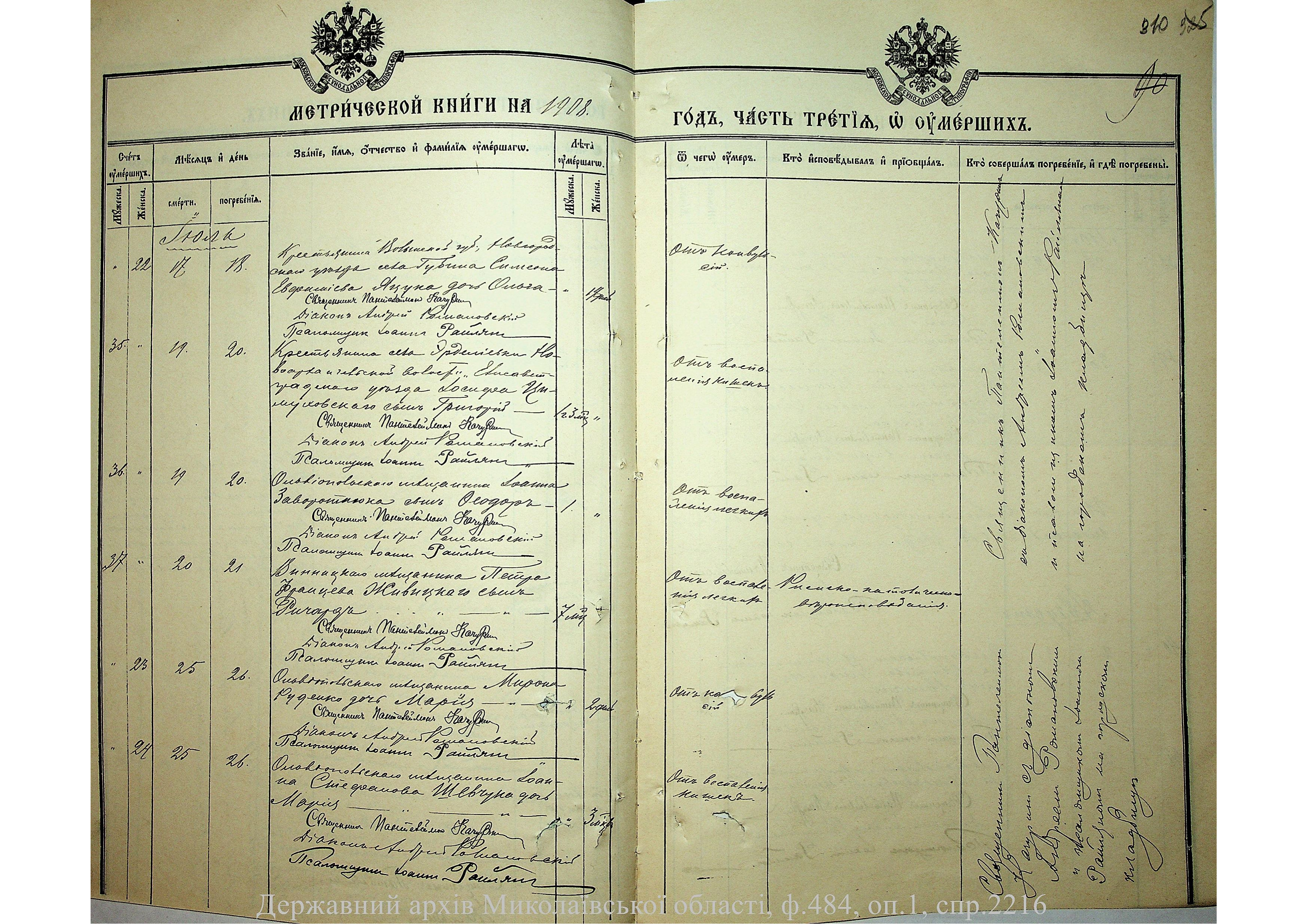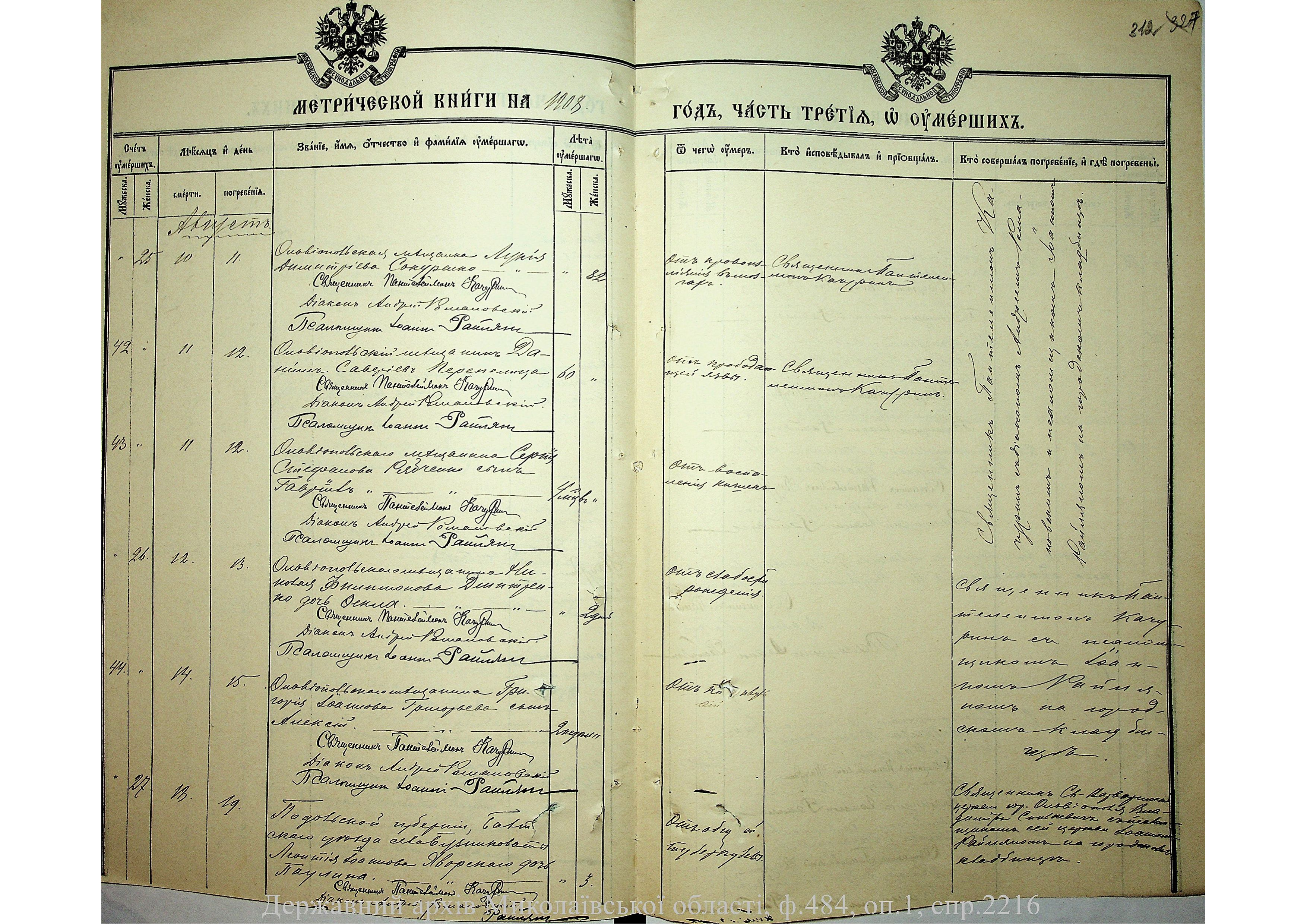 • • • • Справа № 2216 “Метрична книга: Свято-Варваринська церква, с. Ольвіополь, Єлисаветградський повіт, Херсонська губернія: про народжених, одружених та померлих”