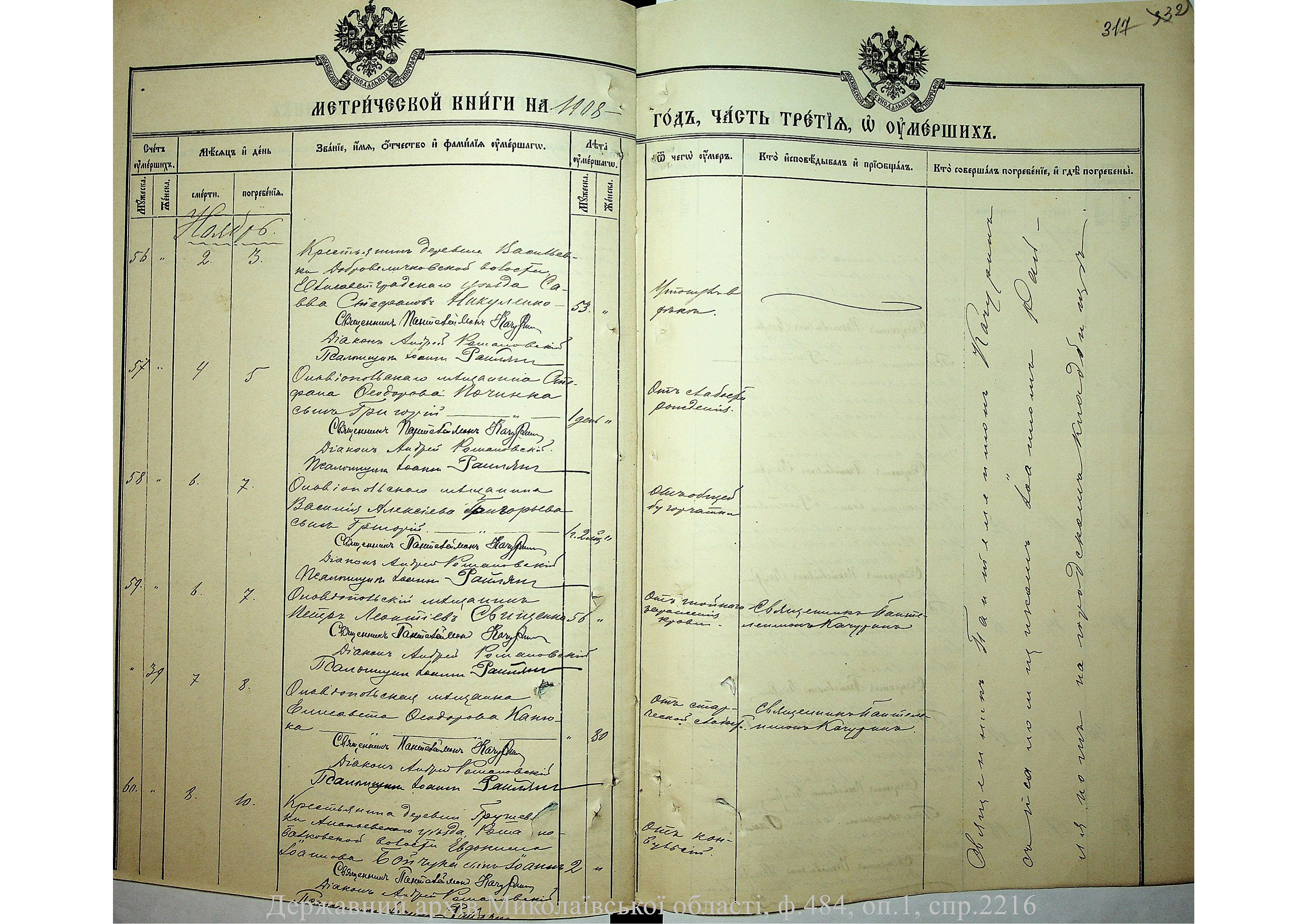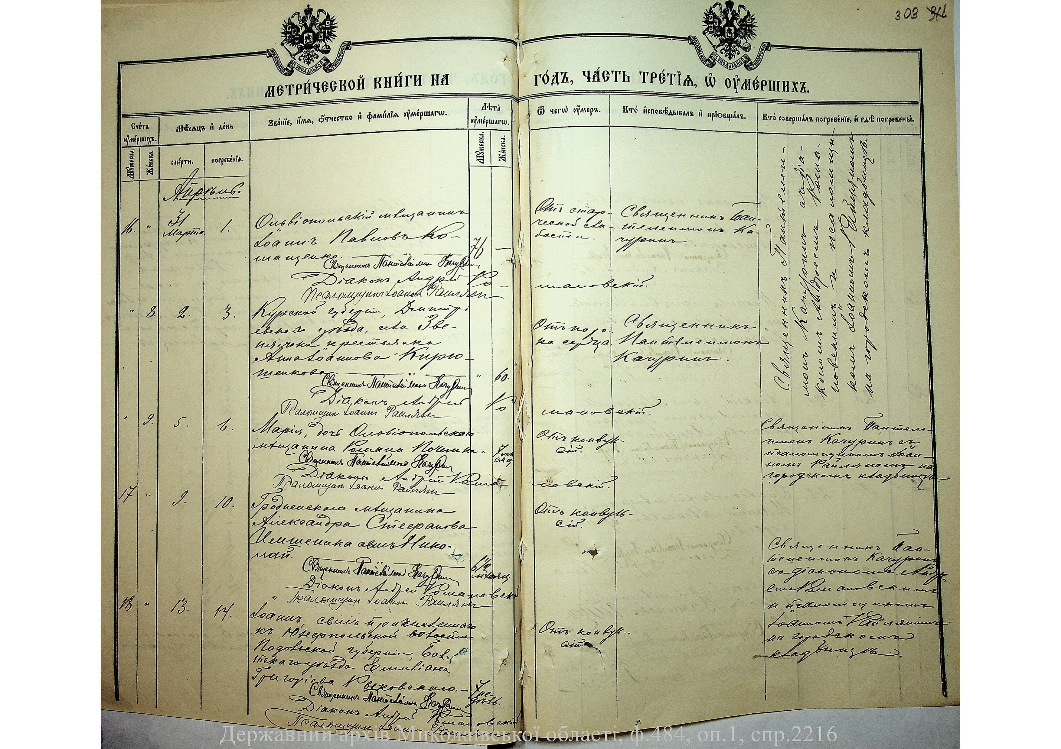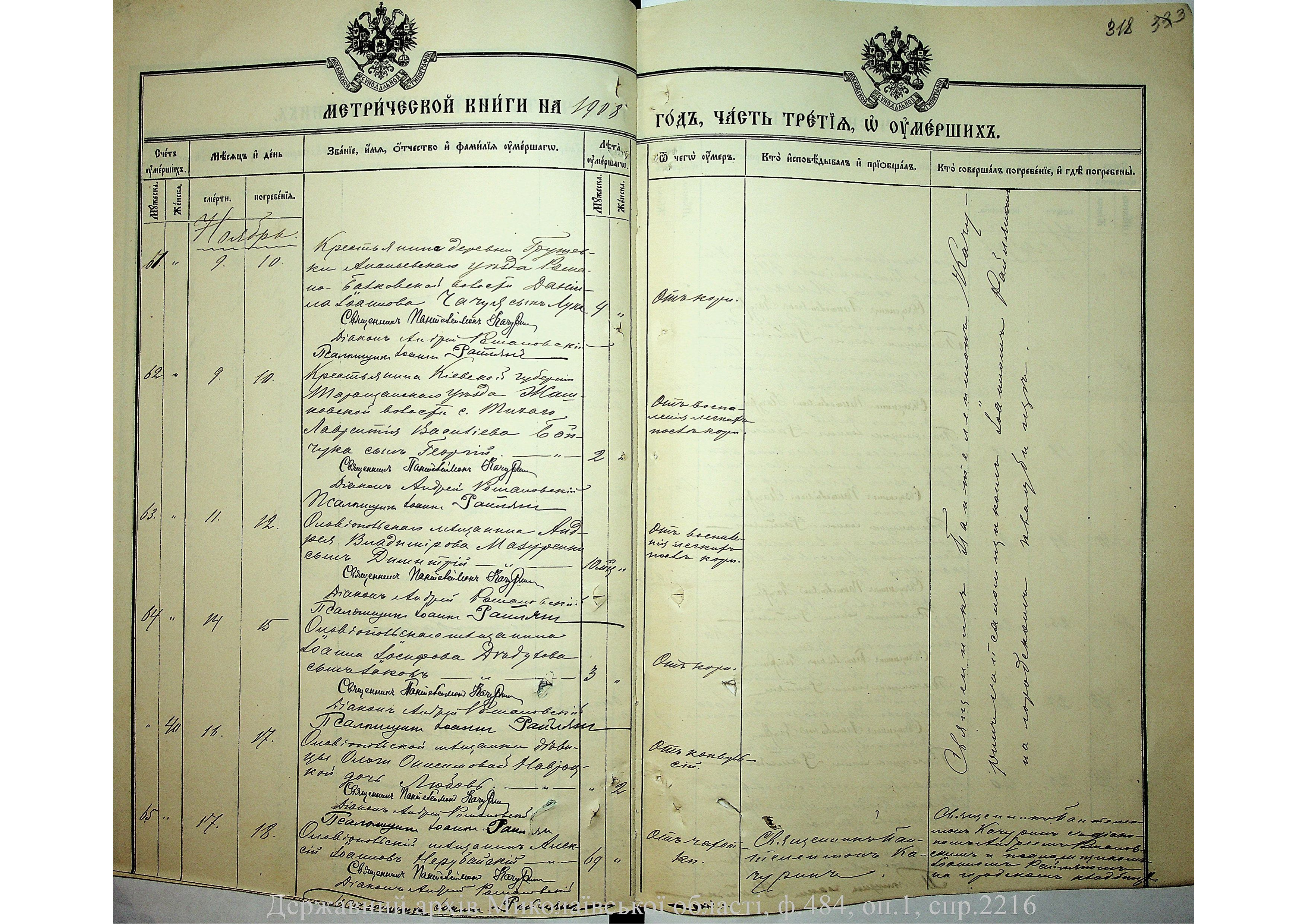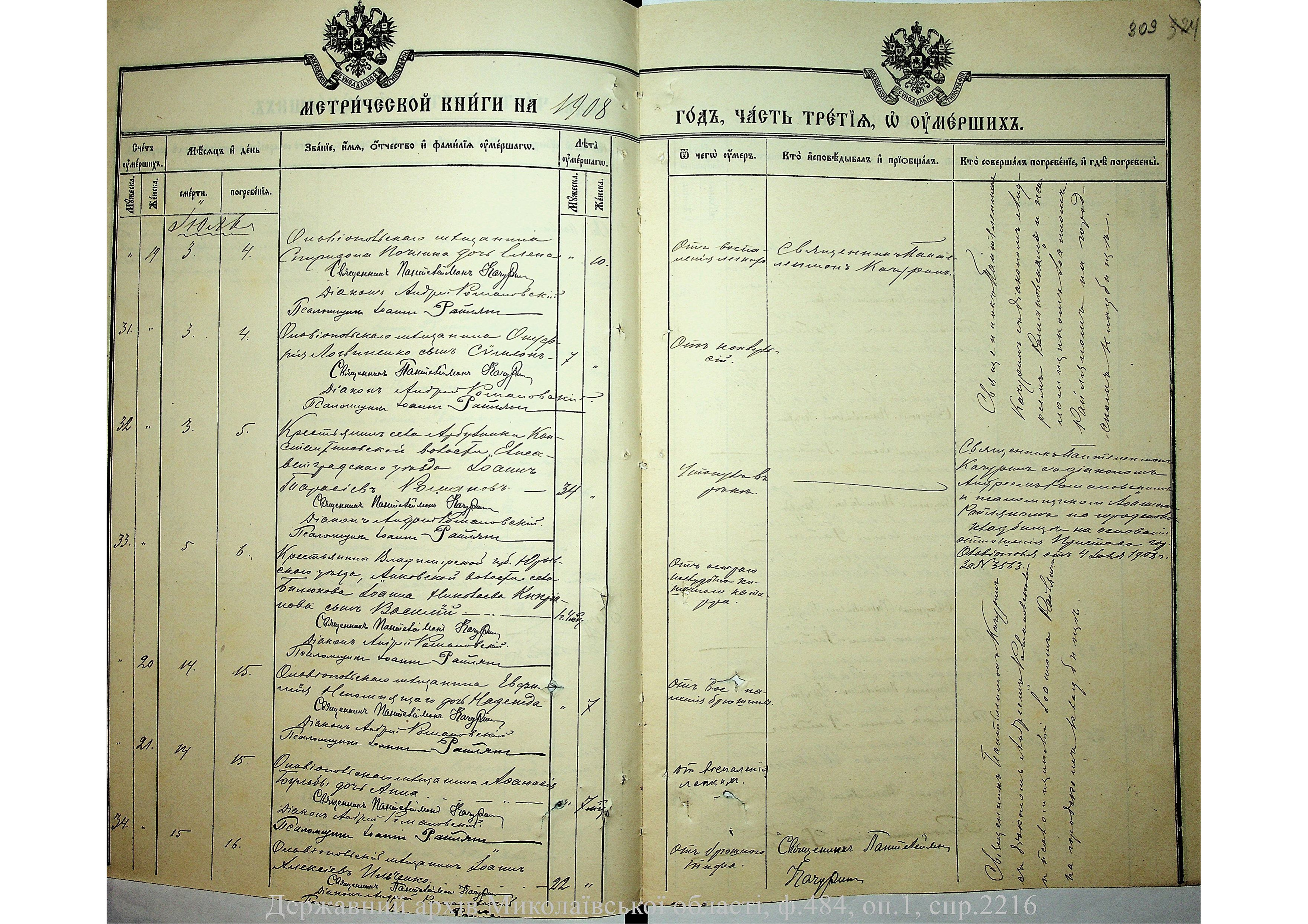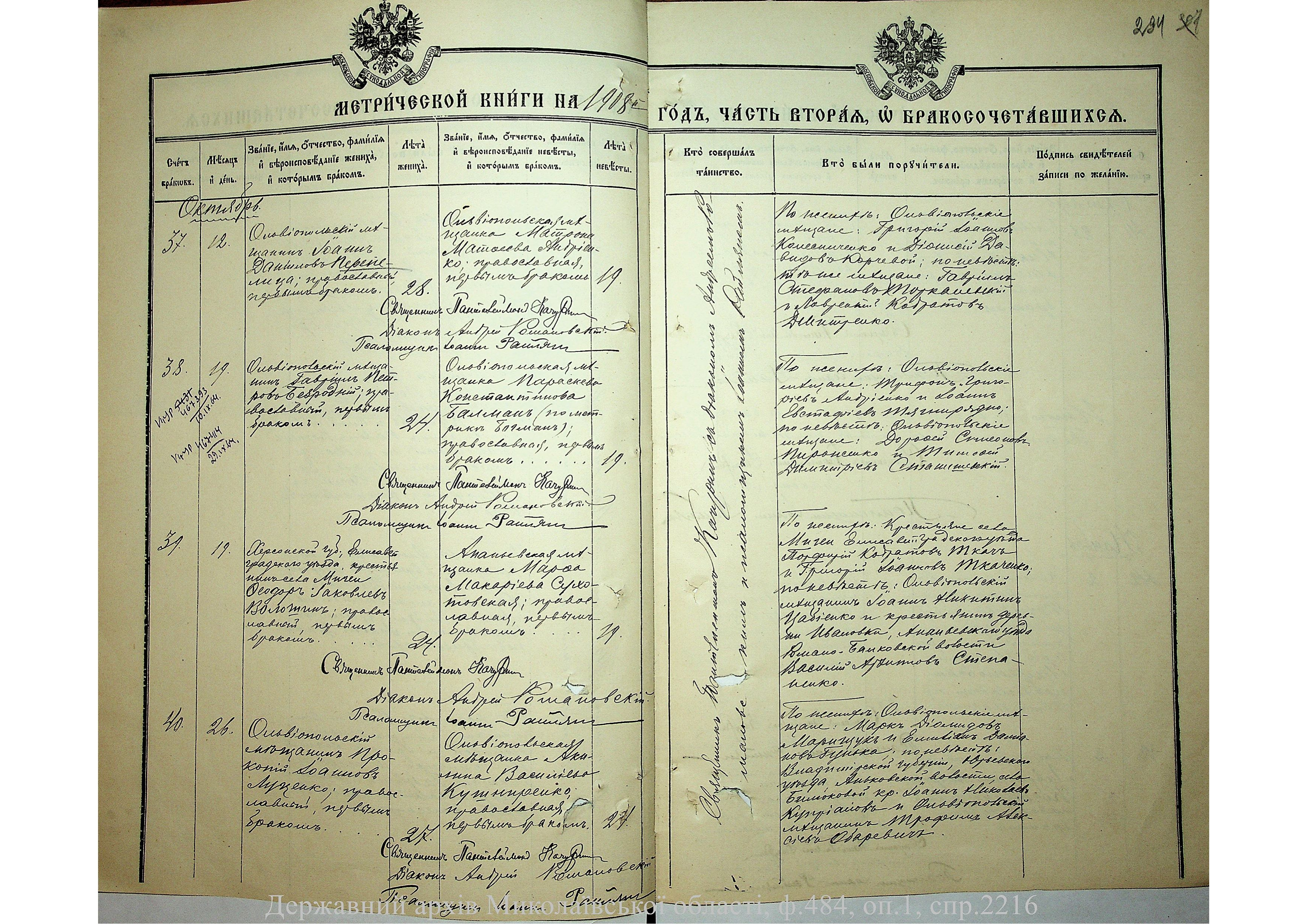 • • • • Справа № 2216 “Метрична книга: Свято-Варваринська церква, с. Ольвіополь, Єлисаветградський повіт, Херсонська губернія: про народжених, одружених та померлих”